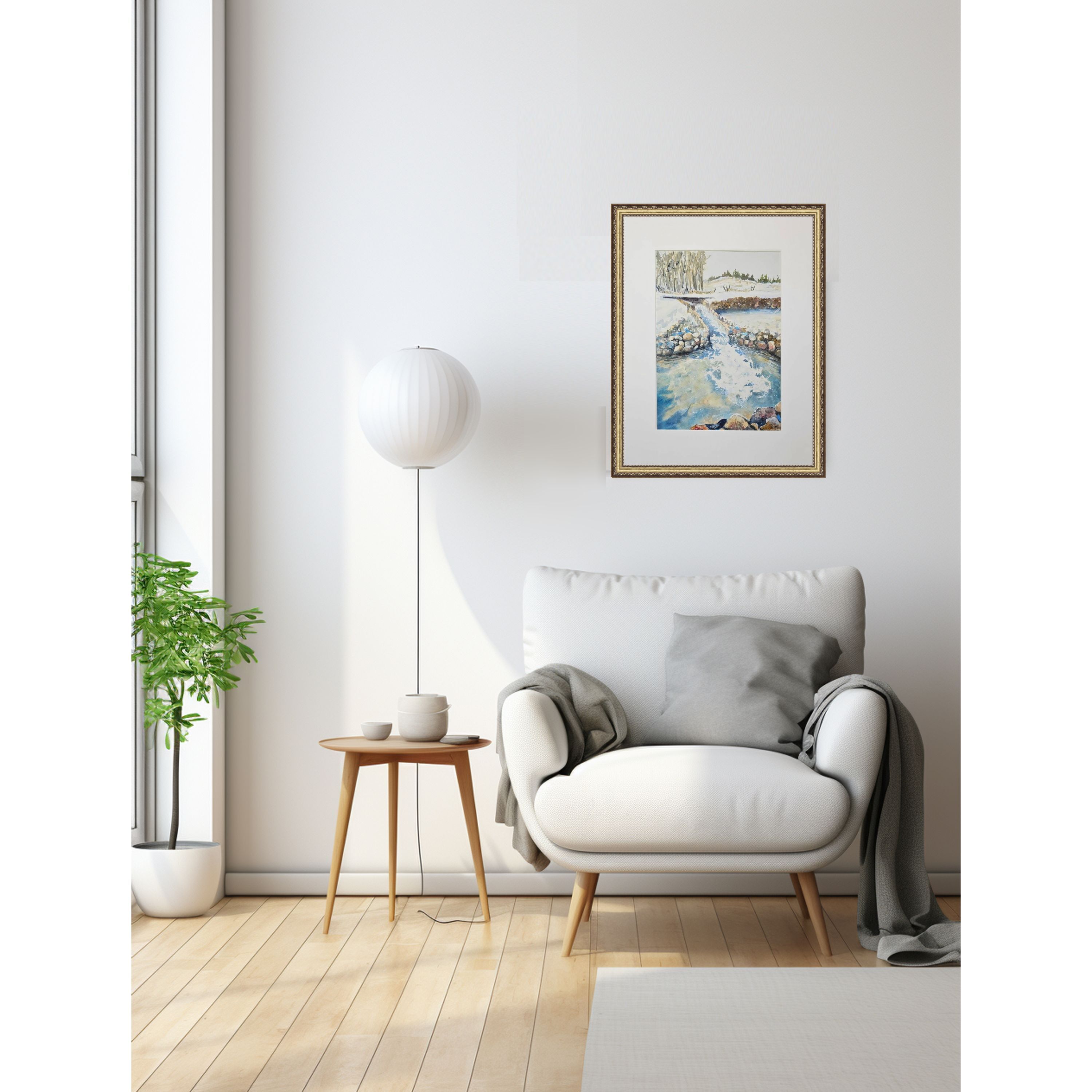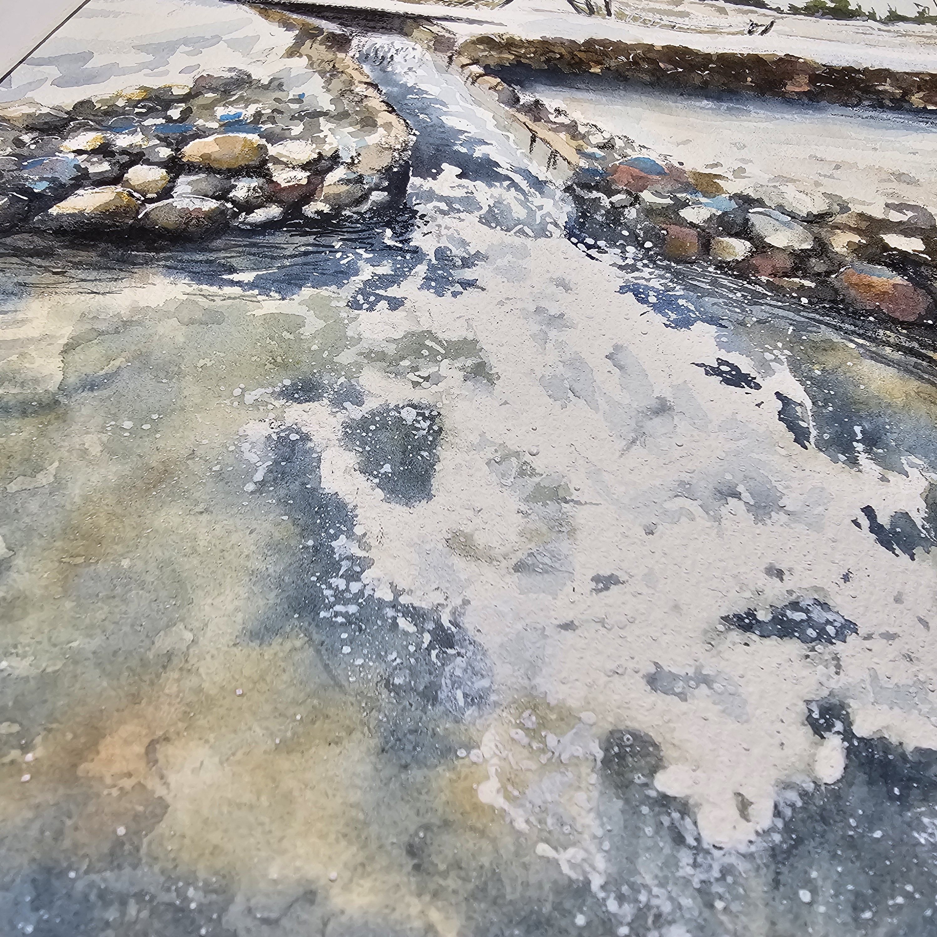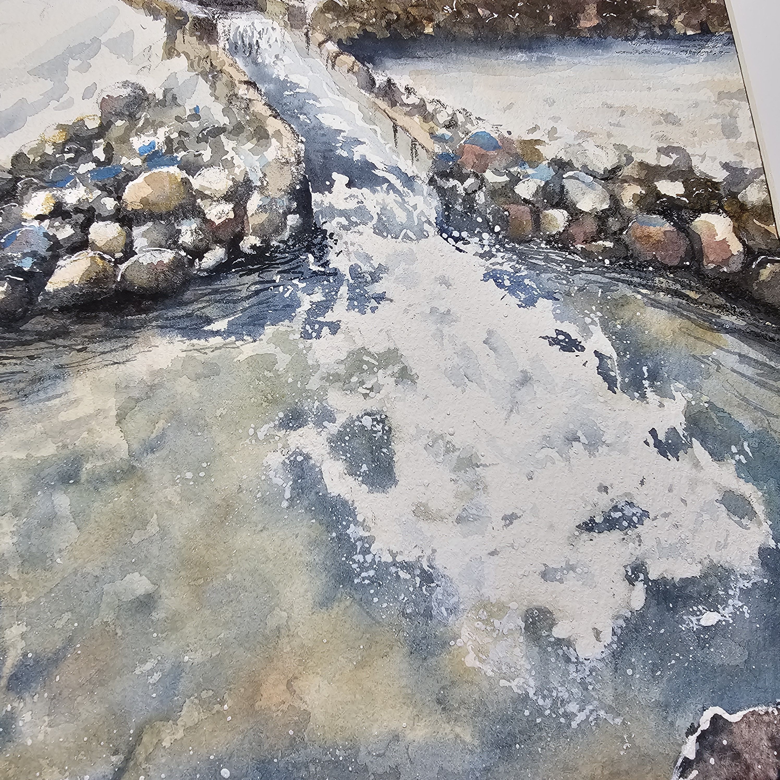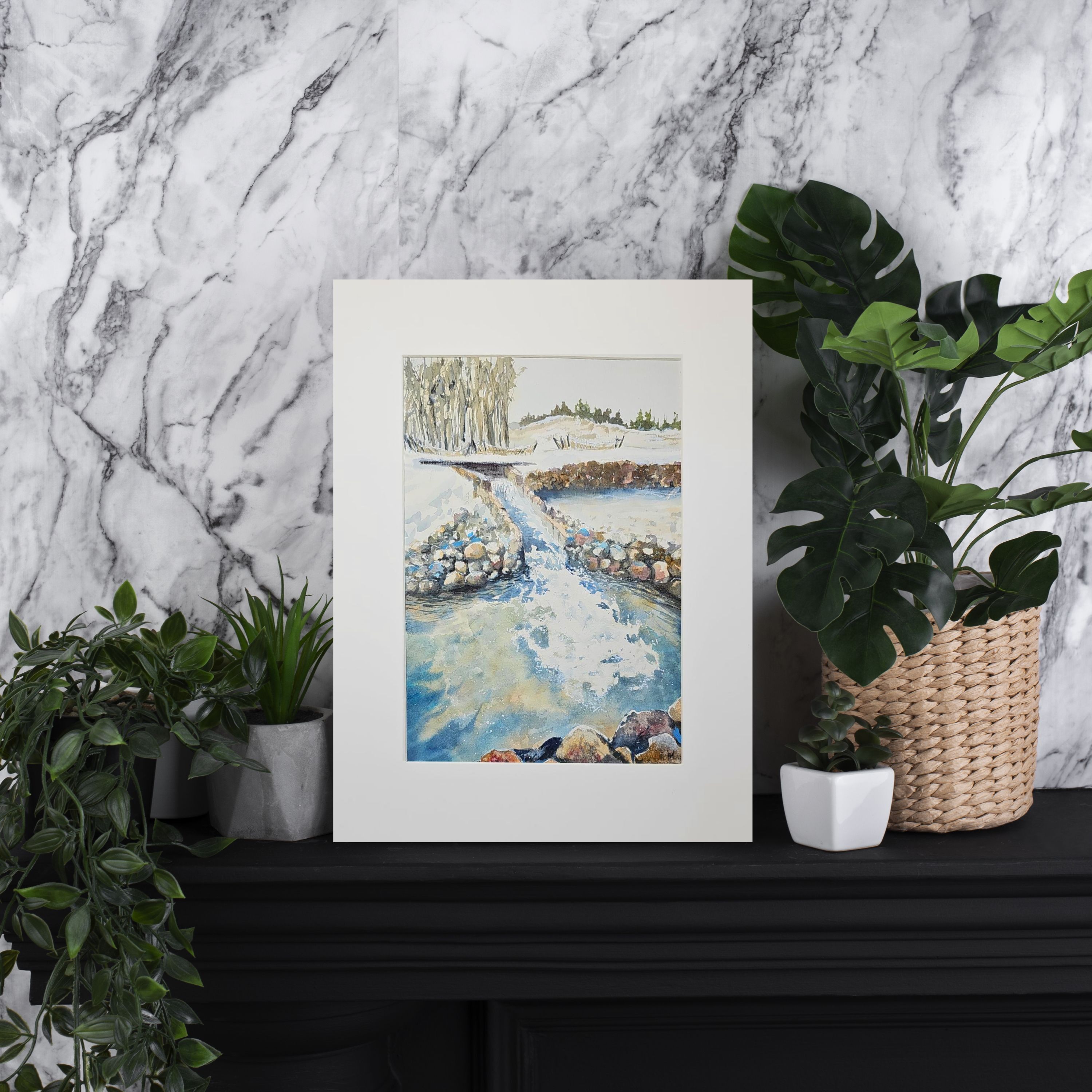 Перед нами акварельная картина, изображающая зимний пейзаж. На переднем плане небольшой водопад и запруда окруженная камнями. Вода течет плавно, отражая свет и создавая красивый узор с небольшими брызгами. В верхней части картины ряд деревьев, лишенных листвы, а справа виднеется небольшой холм, покрытый снегом. Картина выполнена в светлых, холодных тонах, что подчеркивает зимнюю атмосферу.