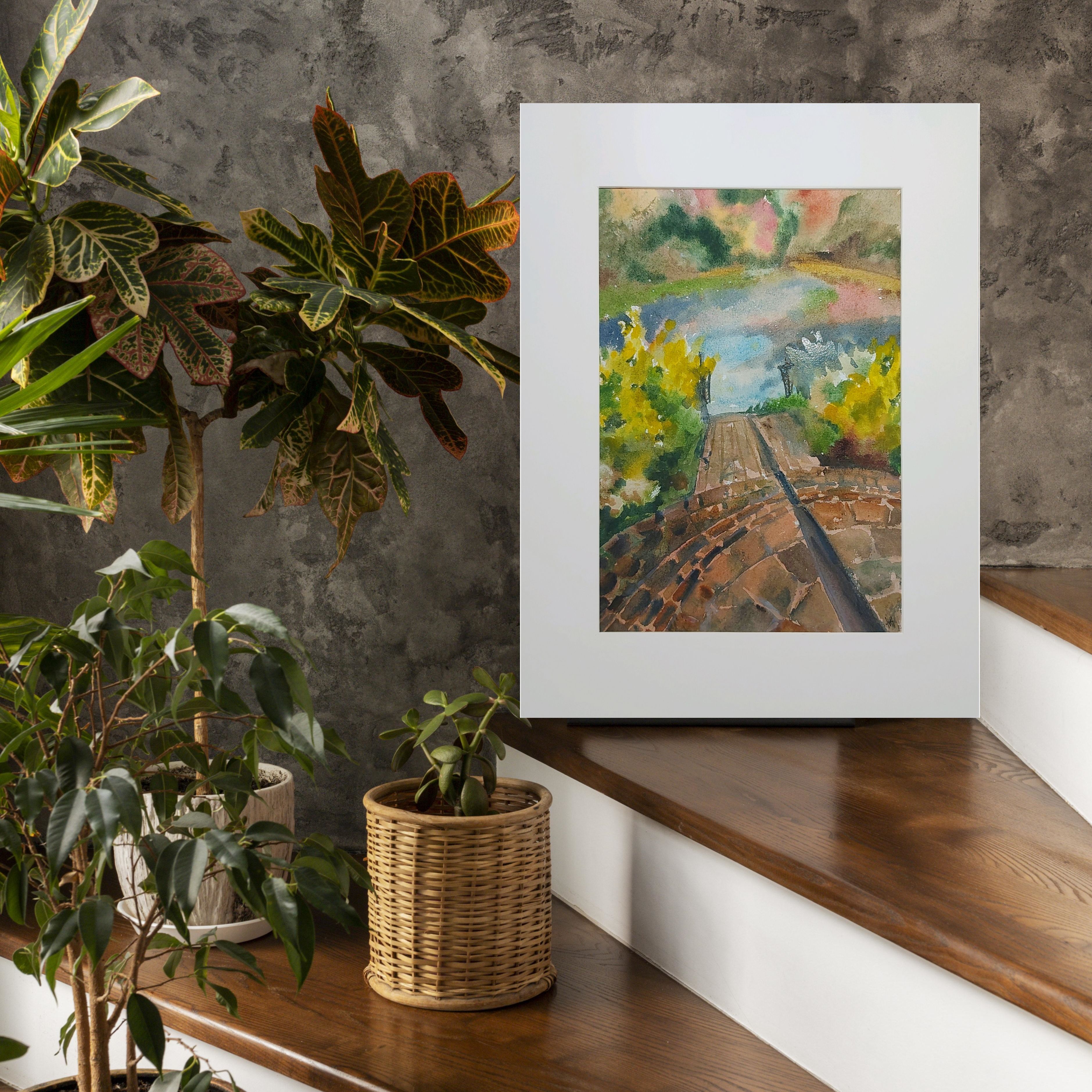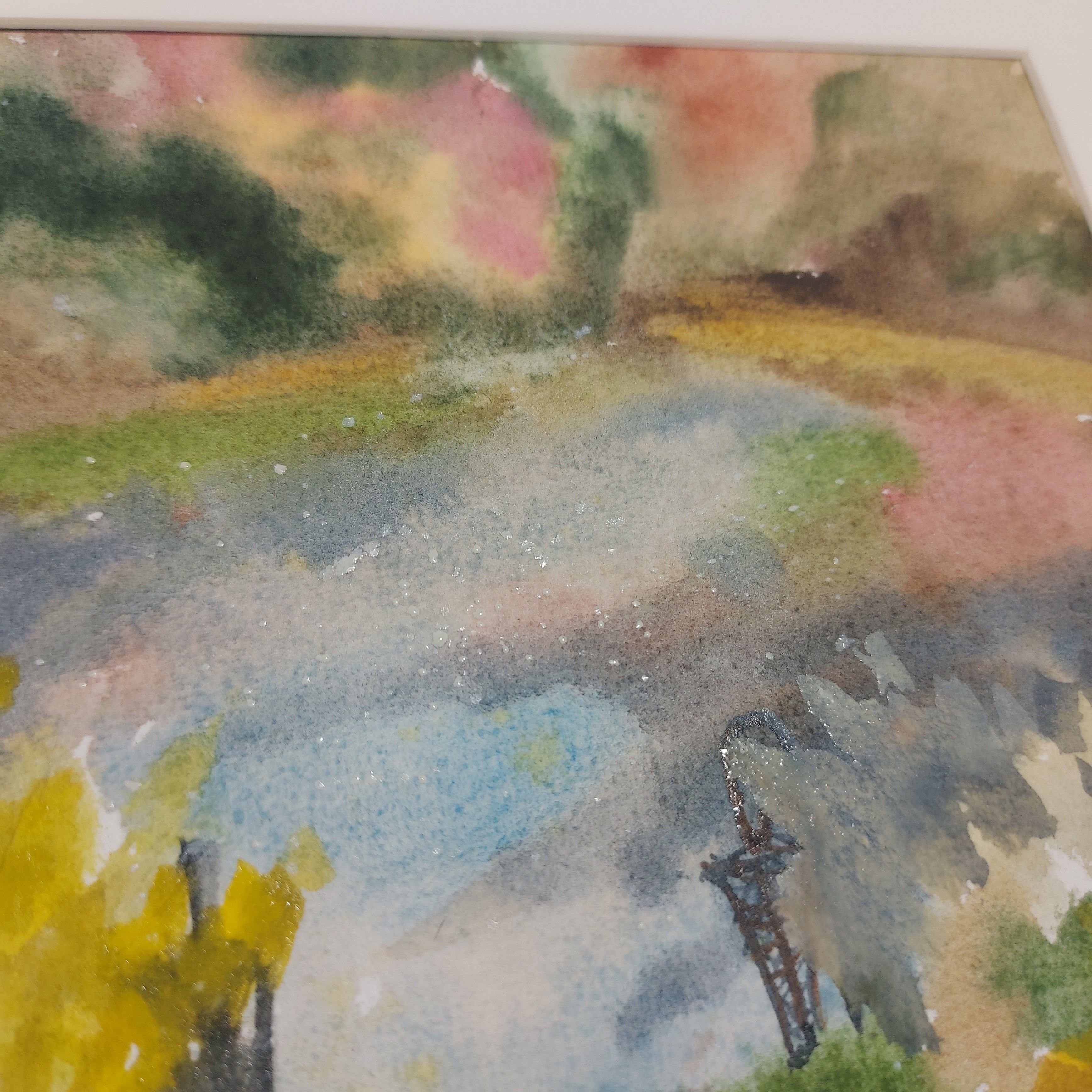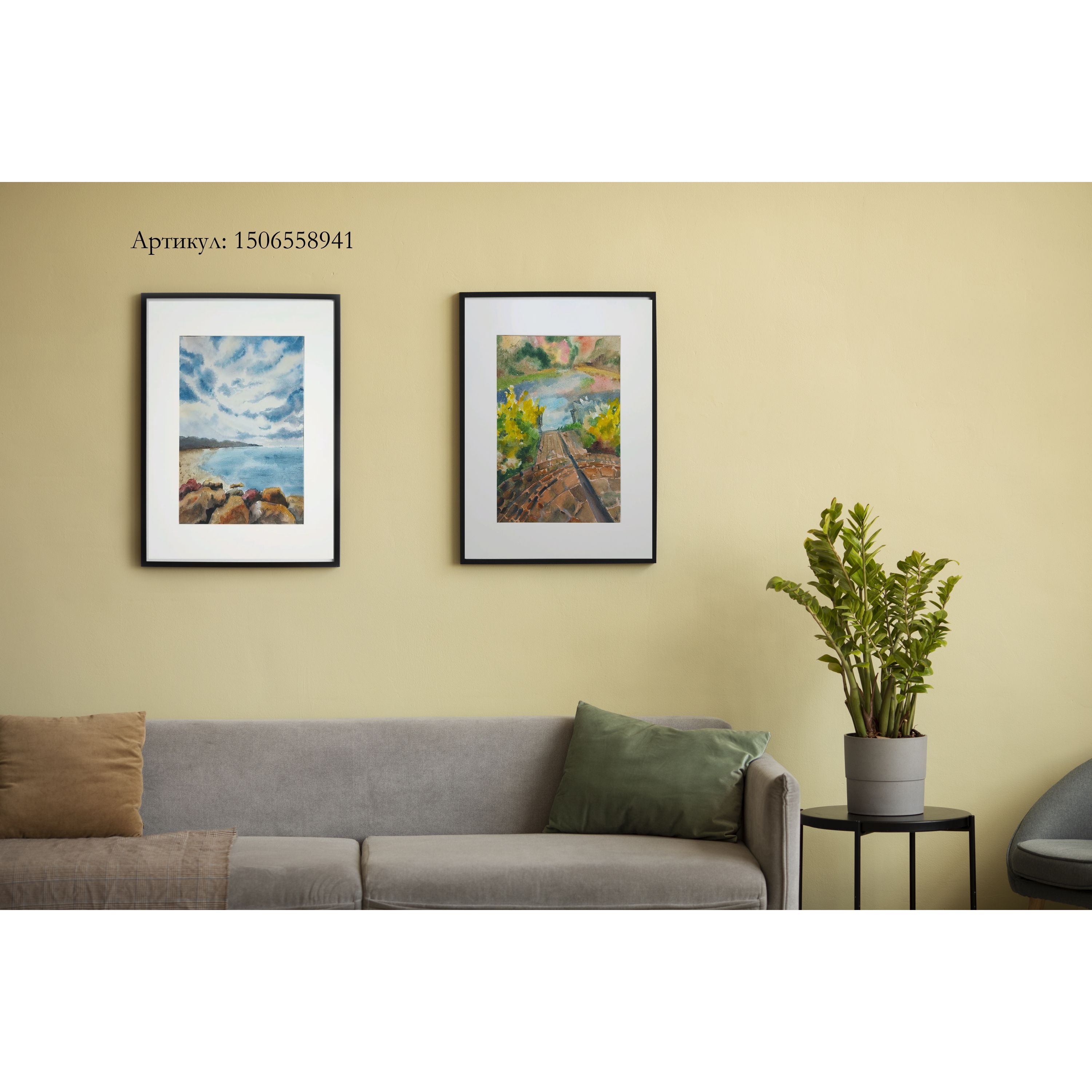 Дальний план картины демонстрирует водоём с водорослями, отражающий небо и окружающую природу. Небо в картине имеет смесь различных оттенков: розового, зеленого и синего. Общий стиль выполнен в пастельных и размытых тонах, характерных для акварельной техники, что придаёт изображению мягкость и живописность. Светлое паспарту позволяет нам подобрать багет практически любого цвета.