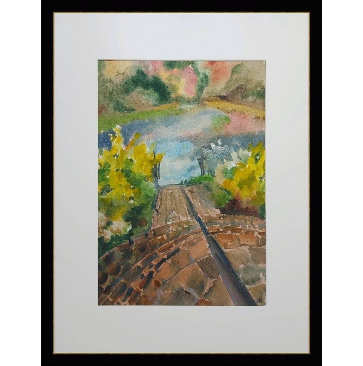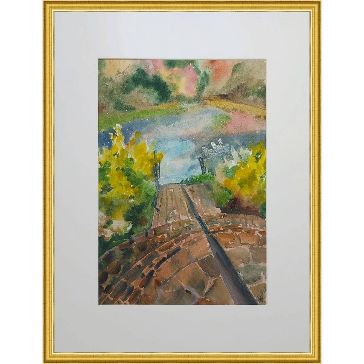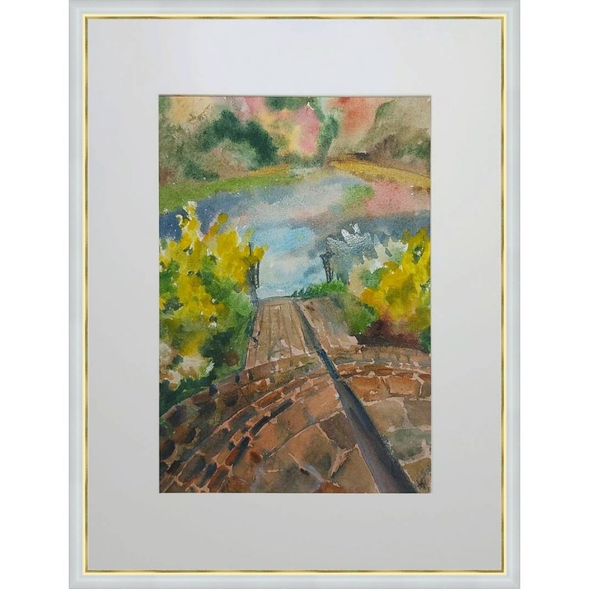 Дальний план картины демонстрирует водоём с водорослями, отражающий небо и окружающую природу. Небо в картине имеет смесь различных оттенков: розового, зеленого и синего. Общий стиль выполнен в пастельных и размытых тонах, характерных для акварельной техники, что придаёт изображению мягкость и живописность. Светлое паспарту позволяет нам подобрать багет практически любого цвета.