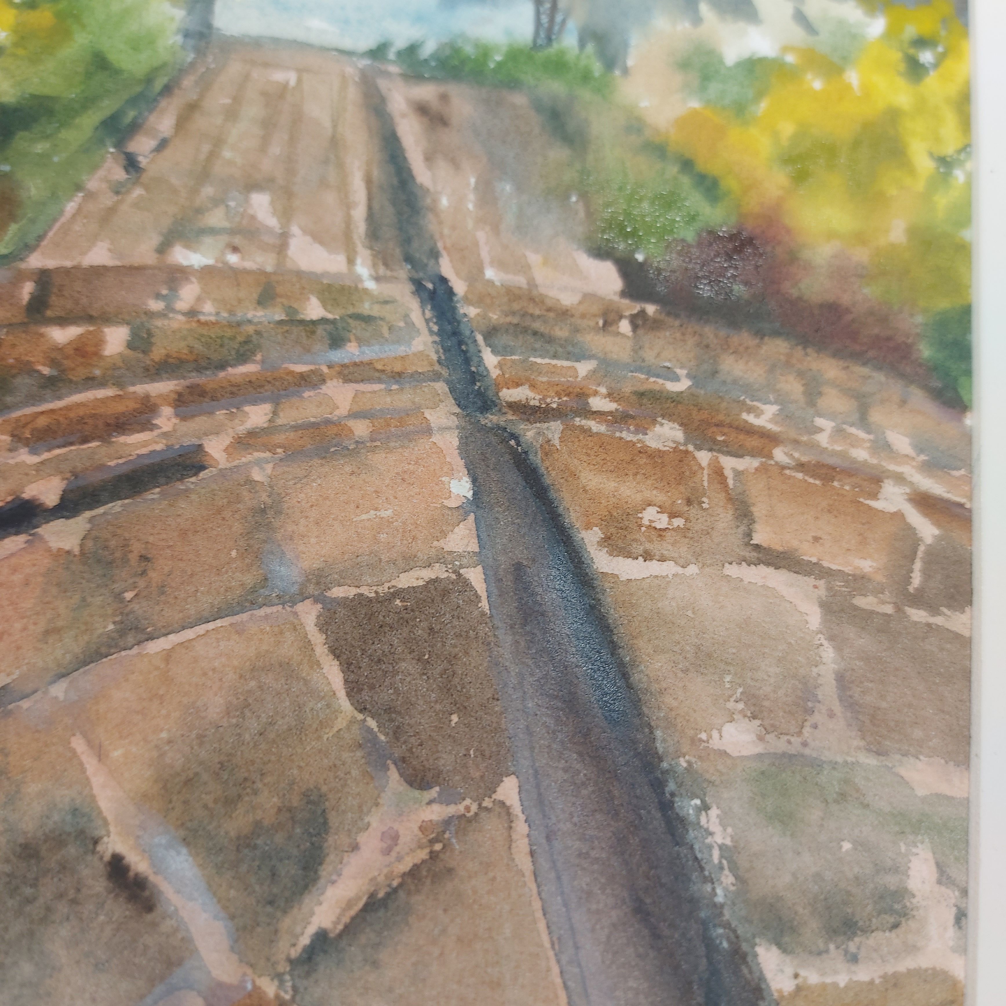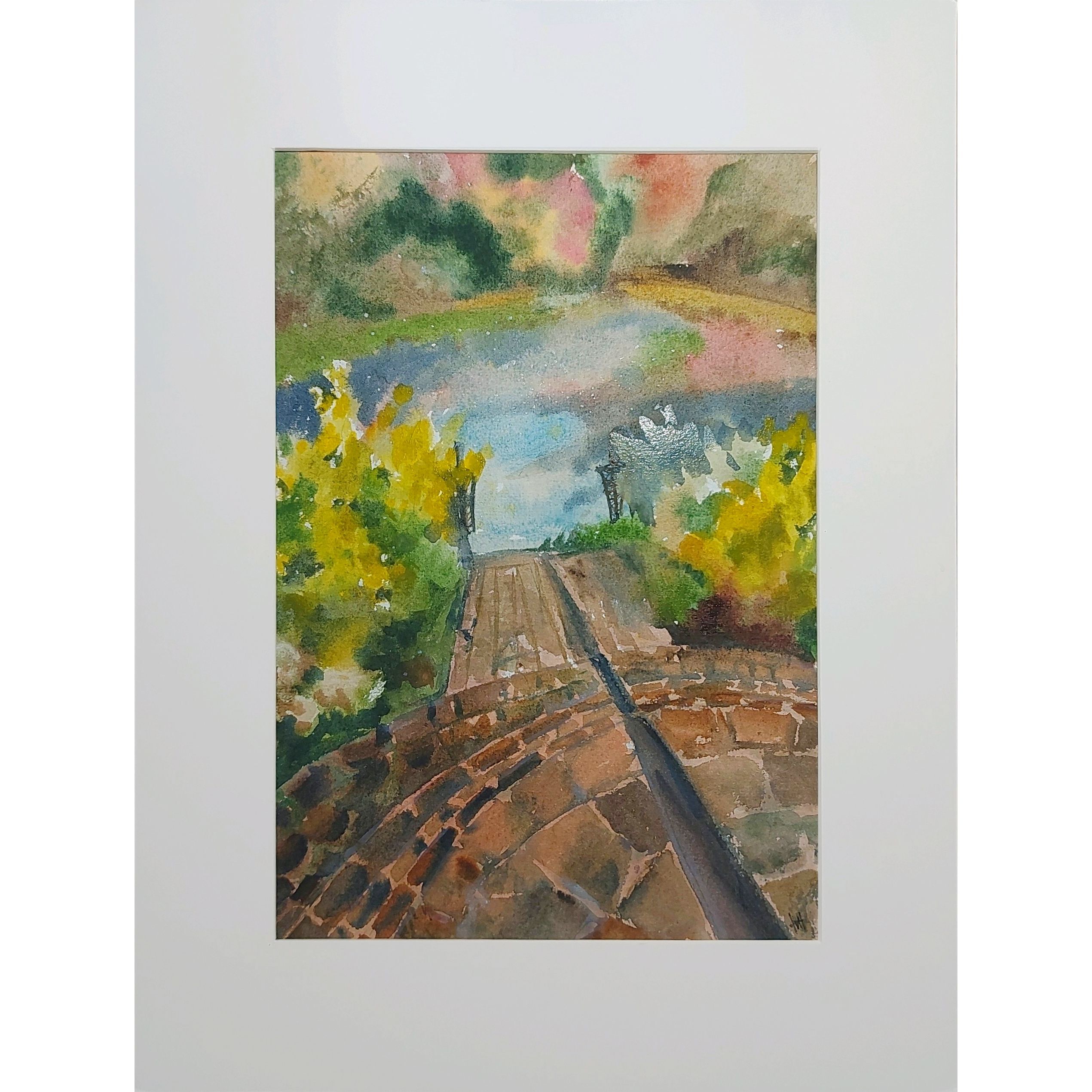 Нам представлена акварельная картина с элементами природы. В центре композиции каменная лестница, ведущая вглубь изображения. На переднем плане видны части каменной кладки полукруглых ступеней. По бокам платформы расположены зеленые кусты и растения с яркими желтыми и зелеными оттенками, светлые гортензии.