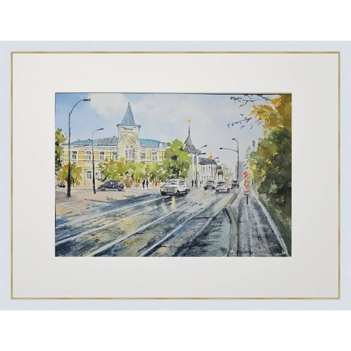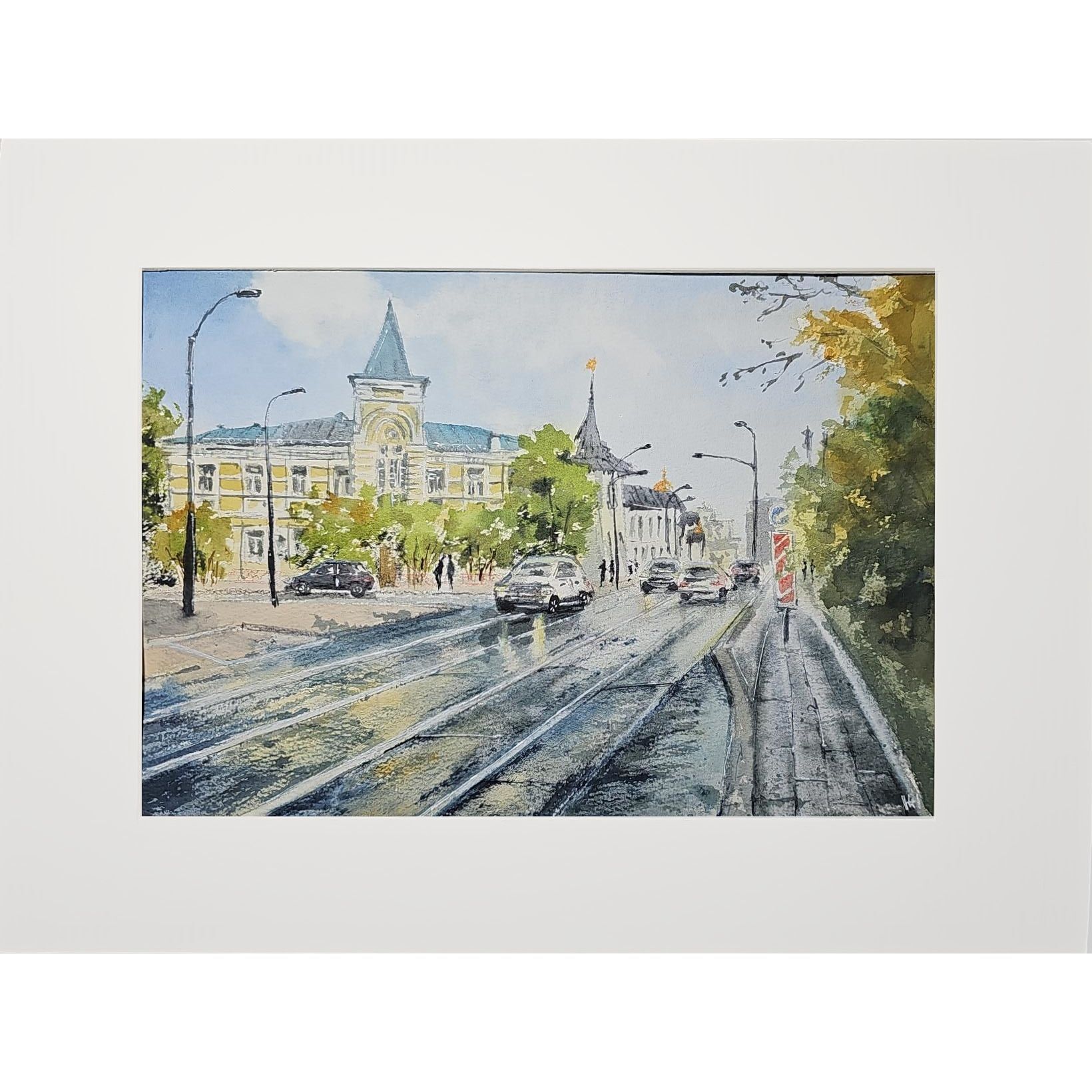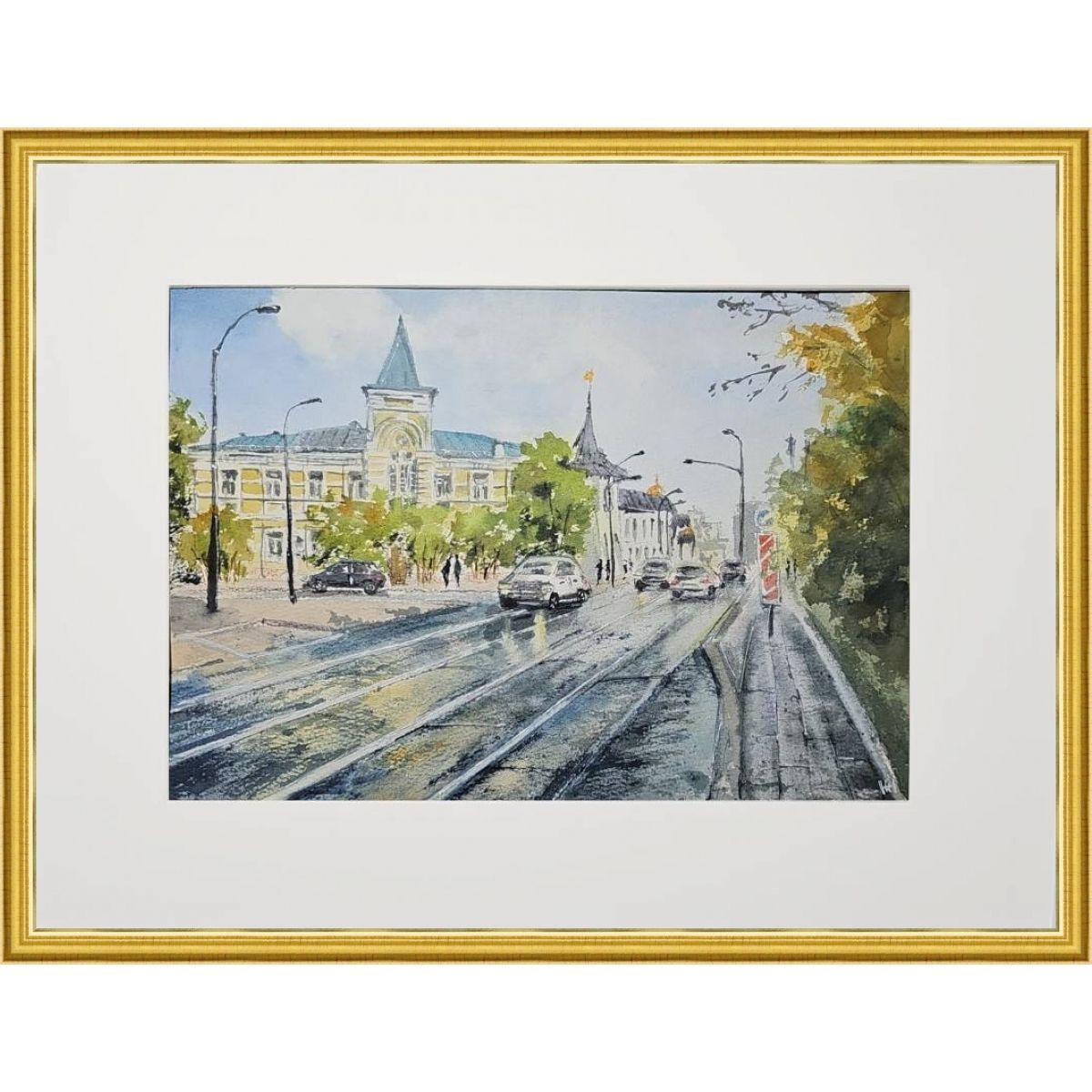 Нам представлена акварельная картина с улице после дождя. Это Даниловский вал в Москве Дорога мокрая от недавнего дождя, на асфальте отражается свет движущихся по улице автомобилей. В правой части картины трамвайный путь. По обеим сторонам дороги растут деревья, создавая зелёную аллею. На заднем плане видны здания с характерной архитектурой. Атмосфера изображения спокойная и отражает типичную городскую сцену.