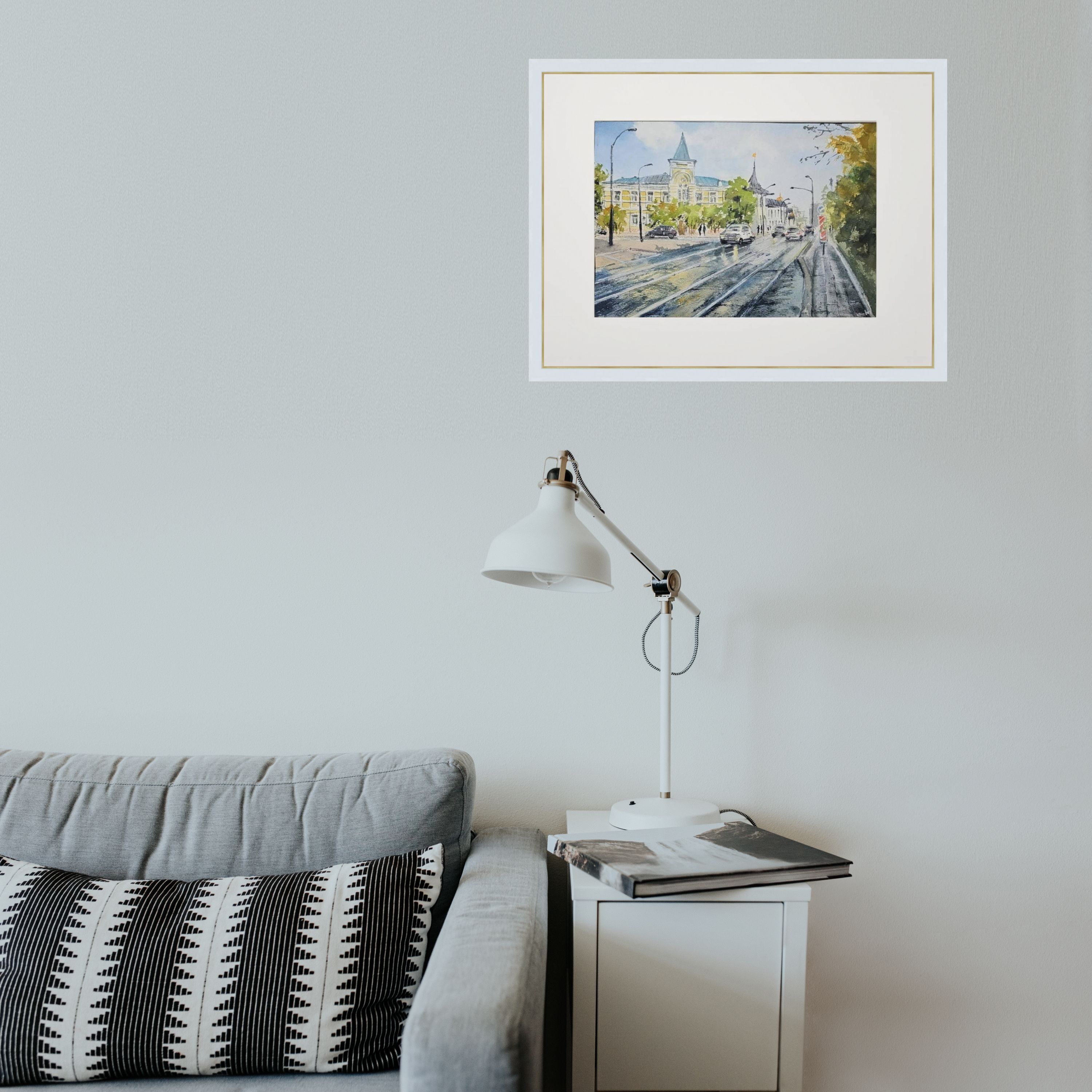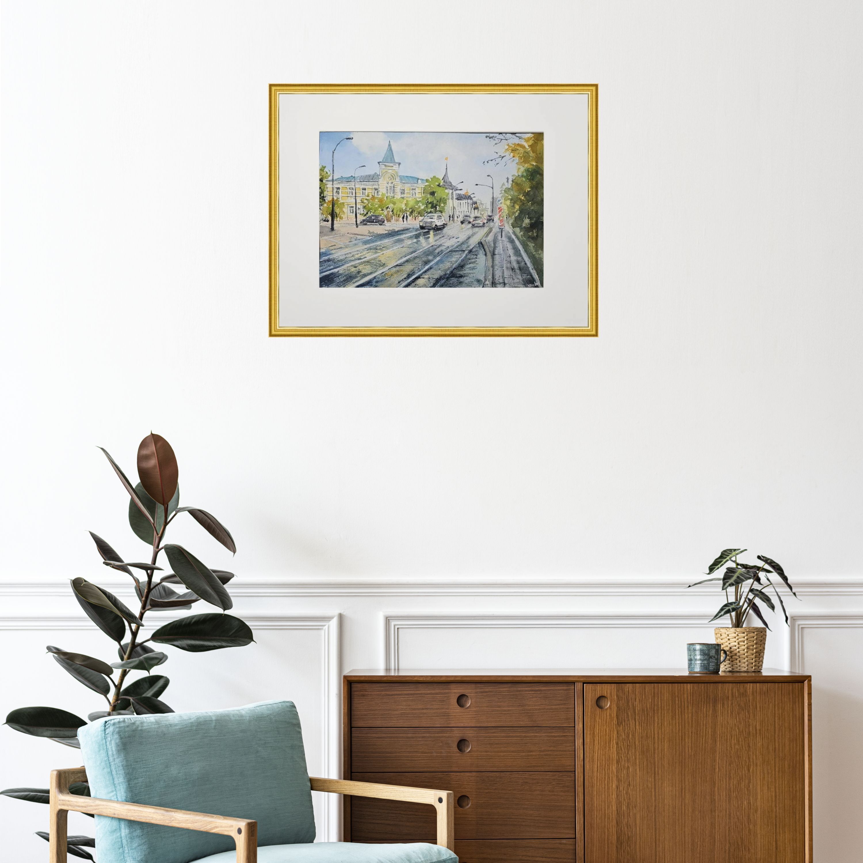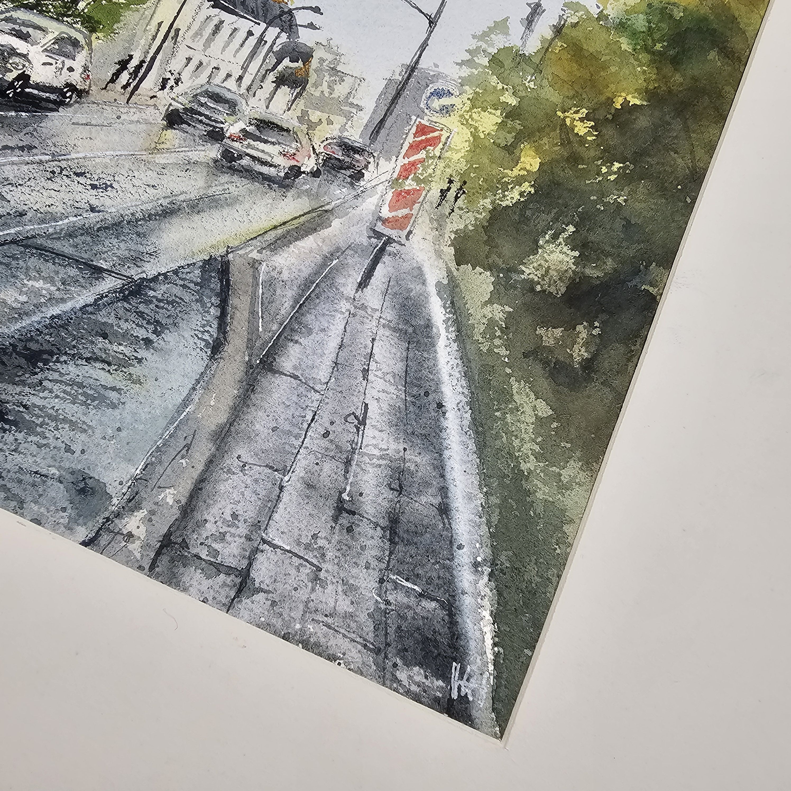 Нам представлена акварельная картина с улице после дождя. Это Даниловский вал в Москве Дорога мокрая от недавнего дождя, на асфальте отражается свет движущихся по улице автомобилей. В правой части картины трамвайный путь. По обеим сторонам дороги растут деревья, создавая зелёную аллею. На заднем плане видны здания с характерной архитектурой. Атмосфера изображения спокойная и отражает типичную городскую сцену.