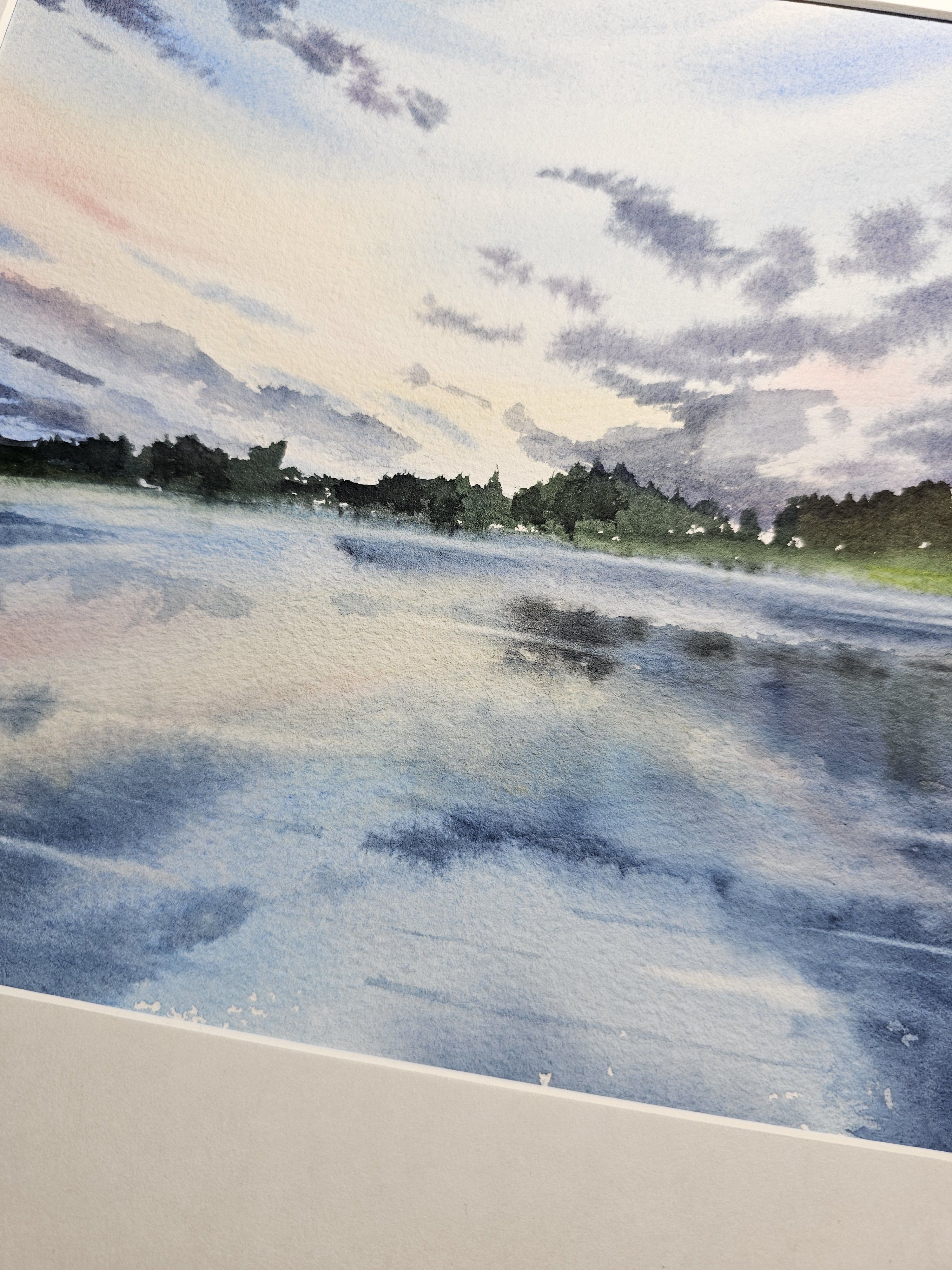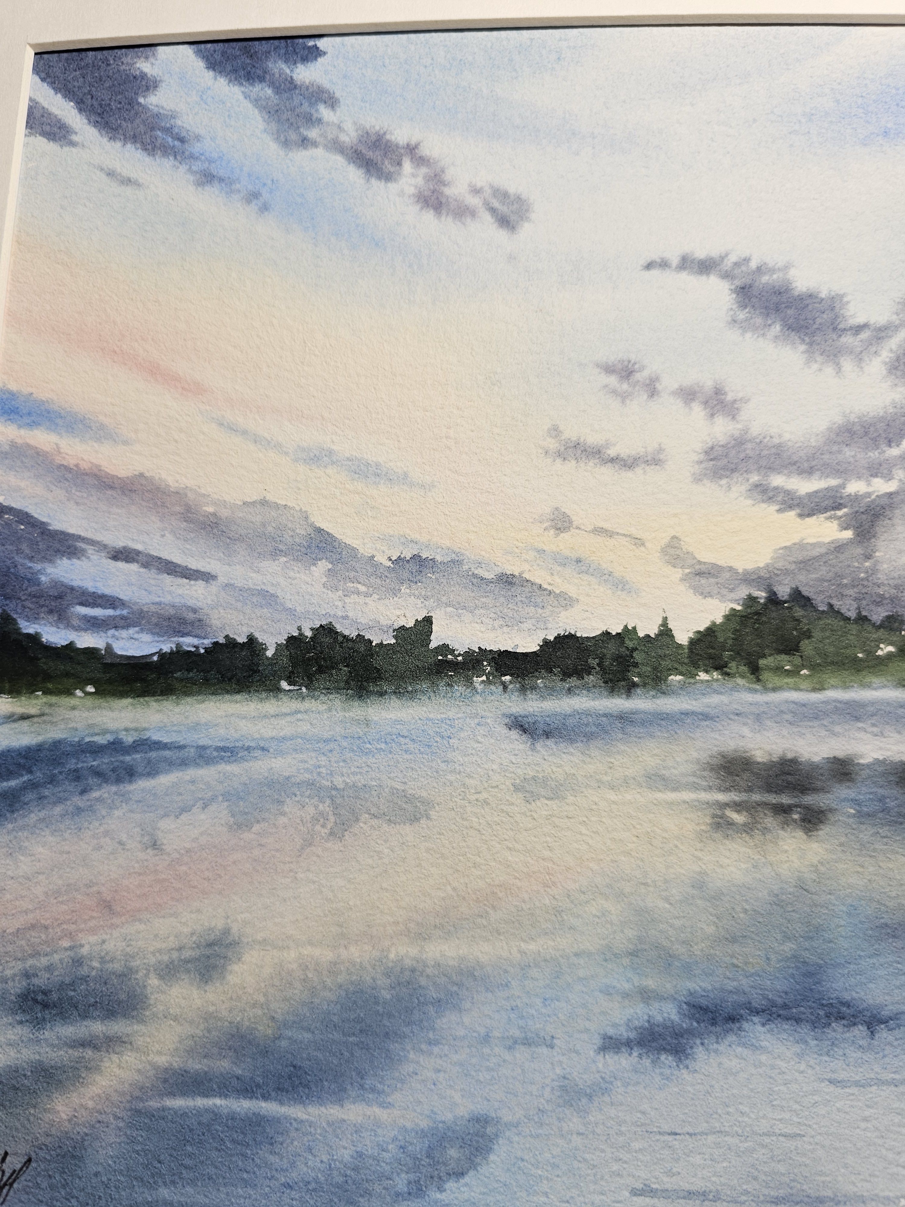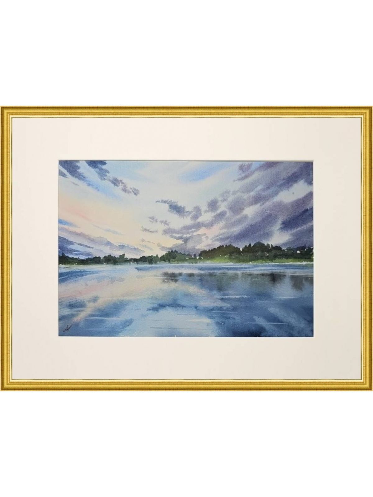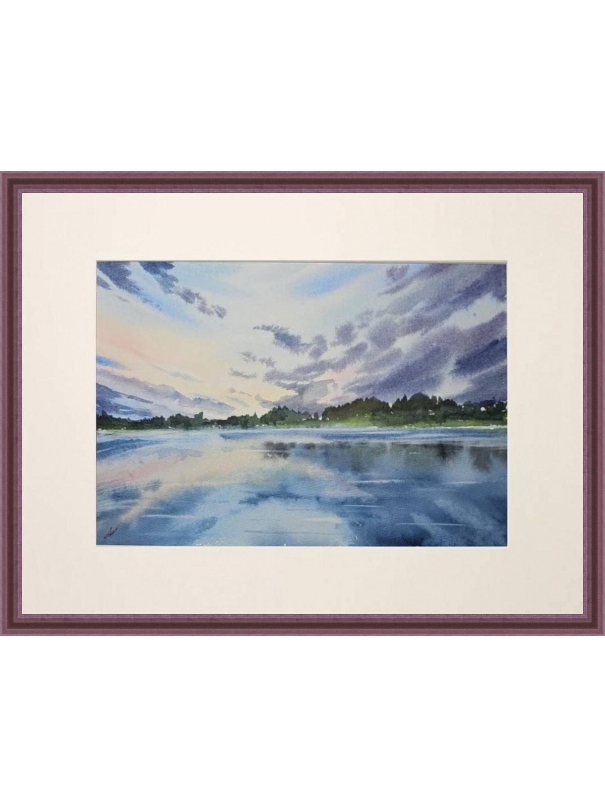 Нам представлена акварельная картина, изображающая пейзаж. В центре находится водная поверхность, отражающая небо. Небо на картине окрашено в пастельные тона — голубые, розовые и фиолетовые, с облаками. На заднем плане изображены деревья и береговая линия. Картина выполнена в светлых и нежных оттенках, передающих спокойствие и умиротворение природного вида.