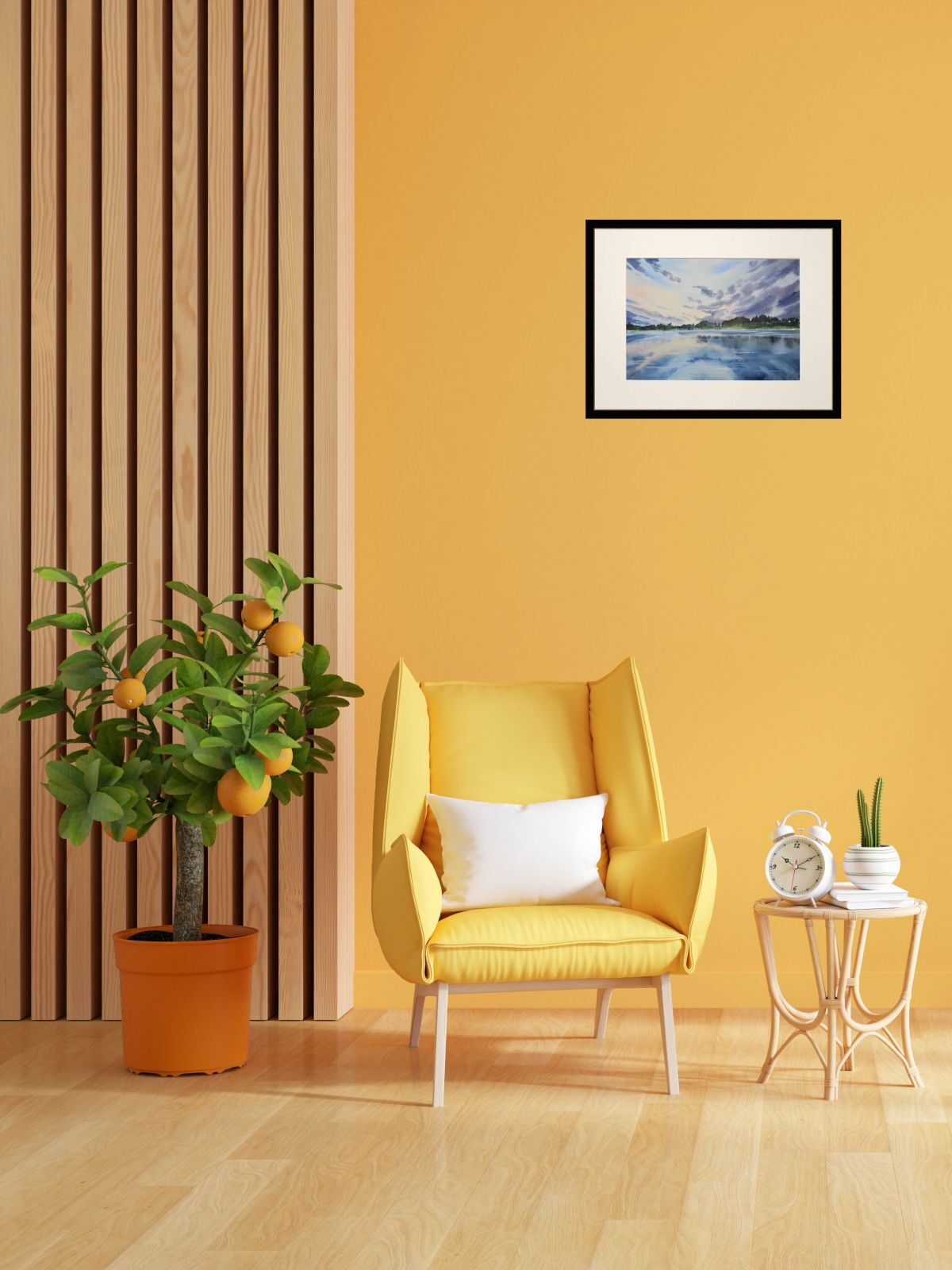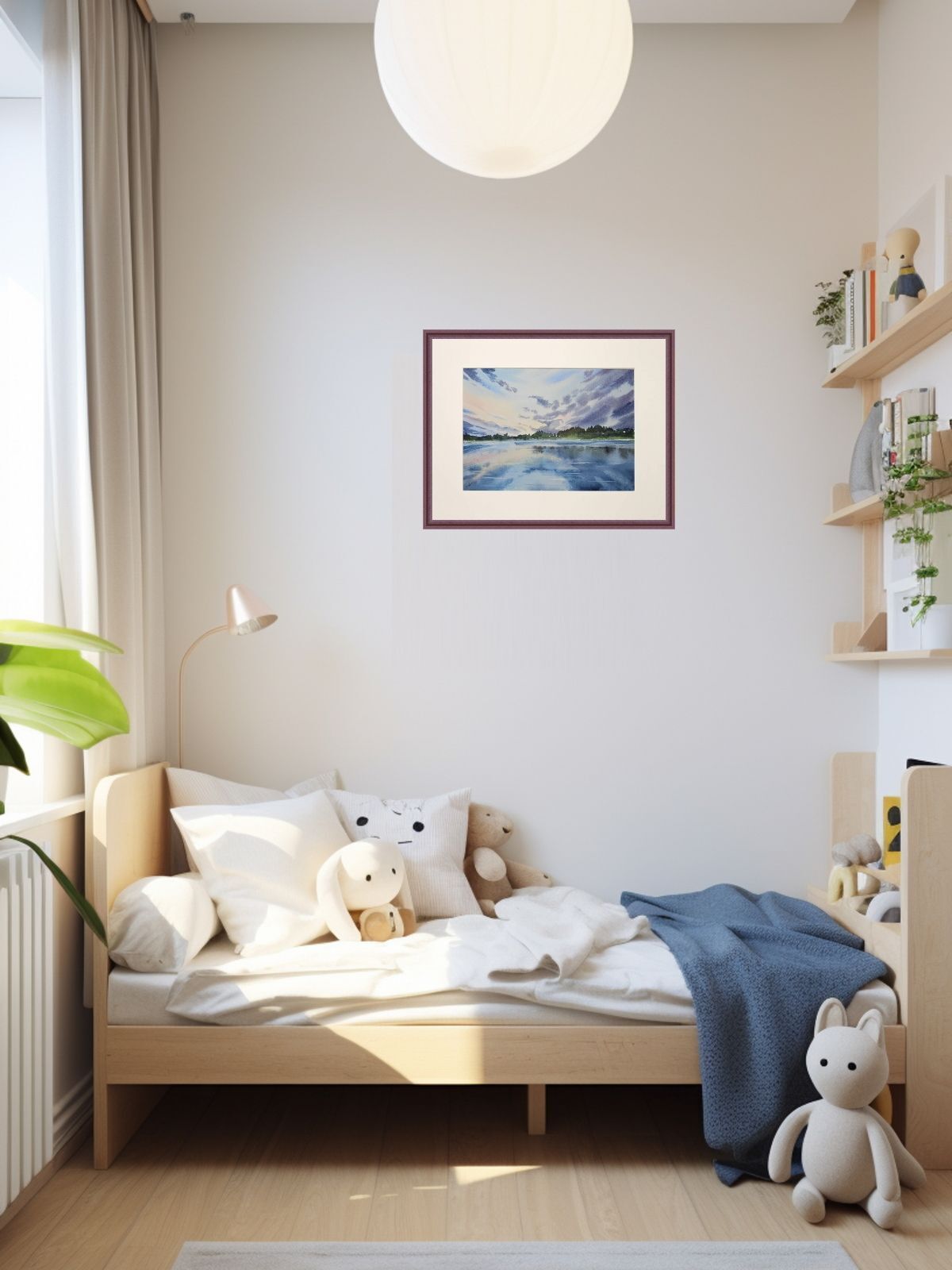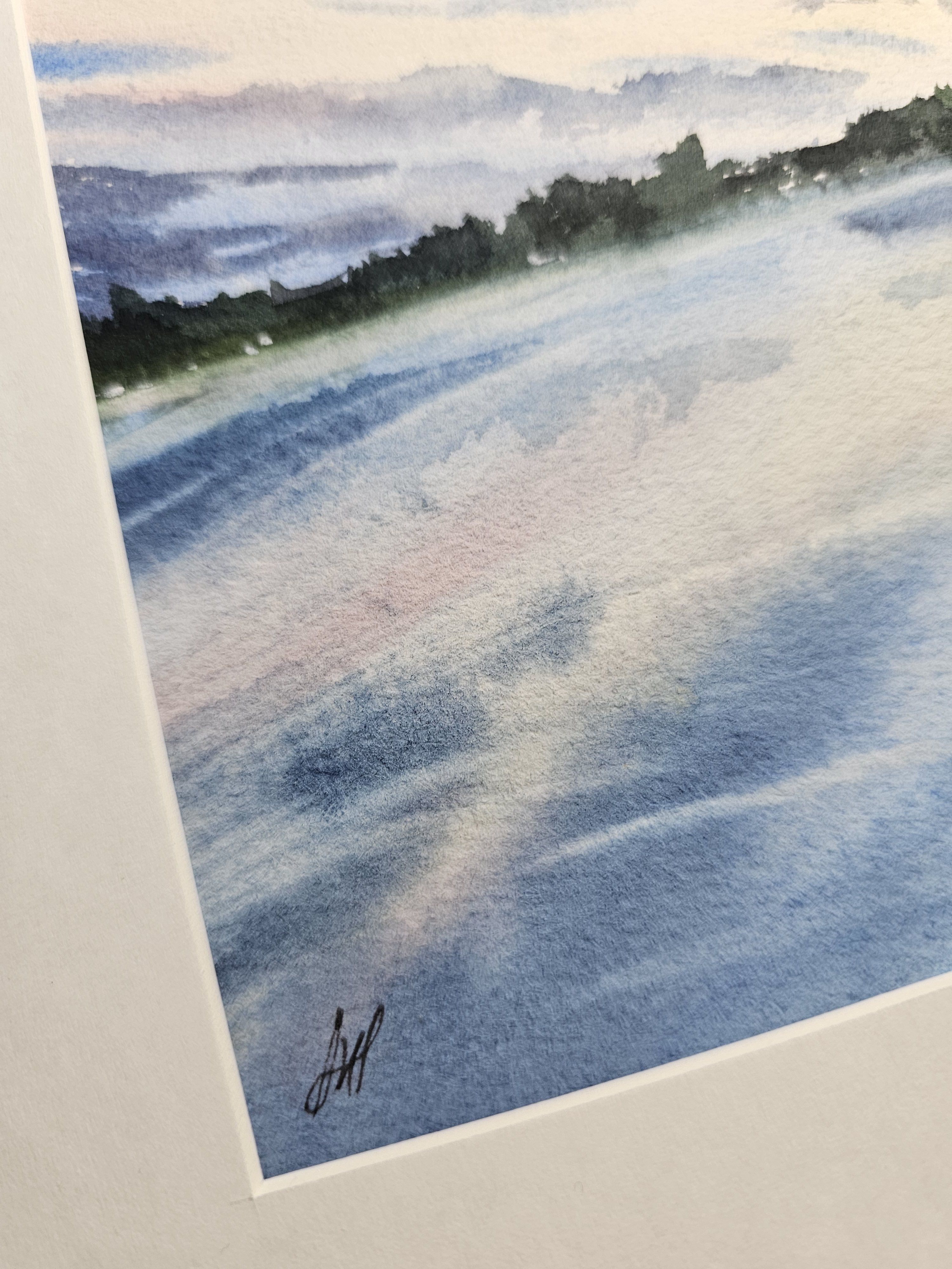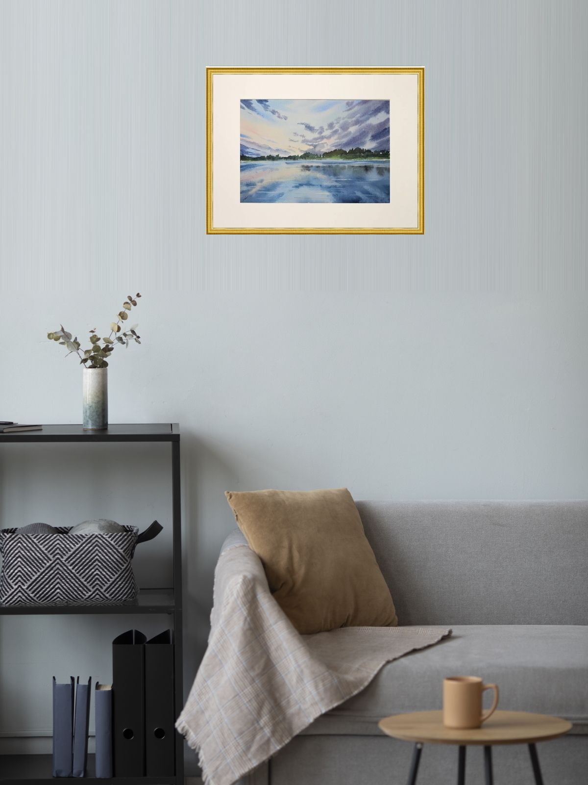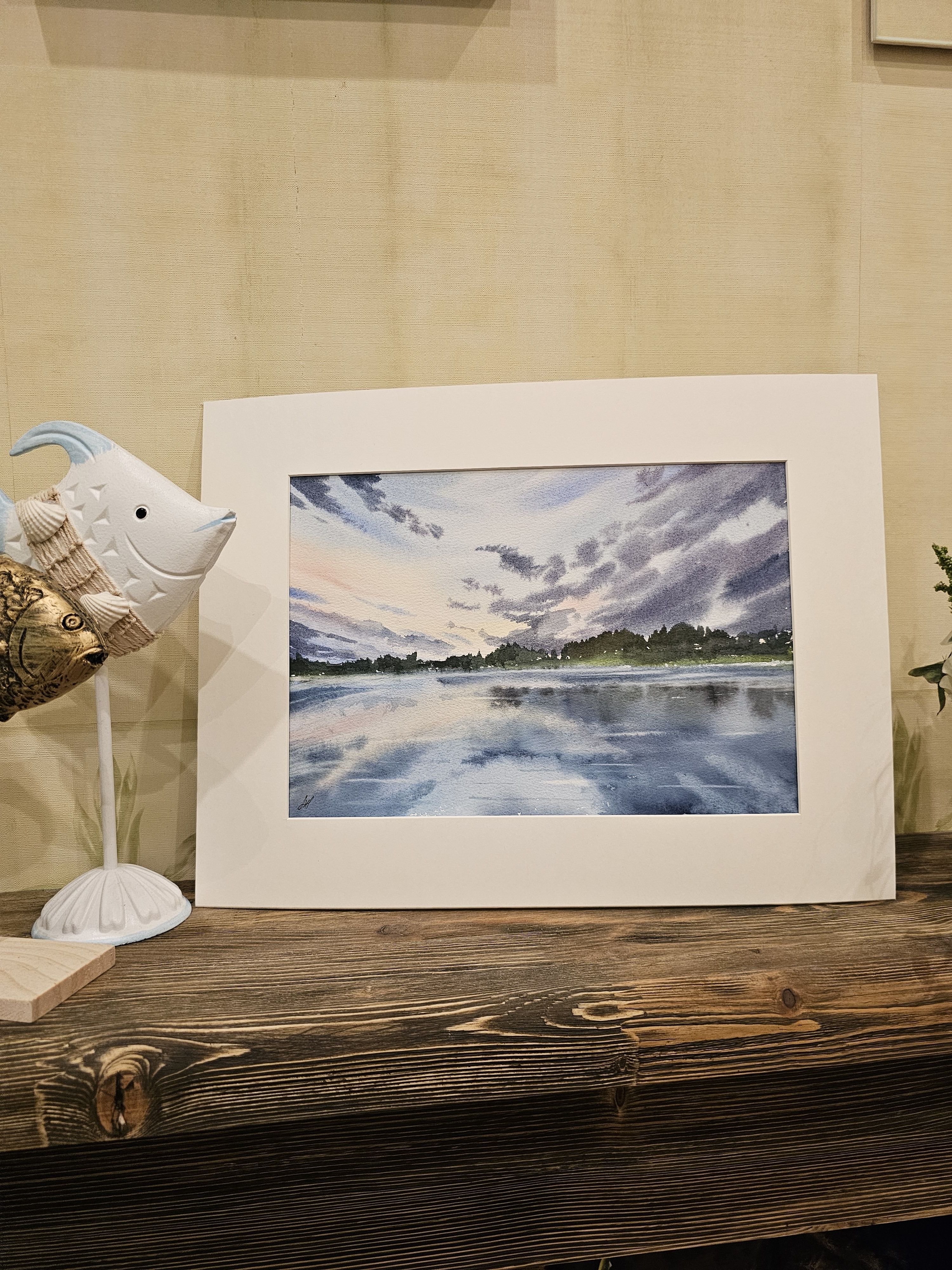 Нам представлена акварельная картина, изображающая пейзаж. В центре находится водная поверхность, отражающая небо. Небо на картине окрашено в пастельные тона — голубые, розовые и фиолетовые, с облаками. На заднем плане изображены деревья и береговая линия. Картина выполнена в светлых и нежных оттенках, передающих спокойствие и умиротворение природного вида.