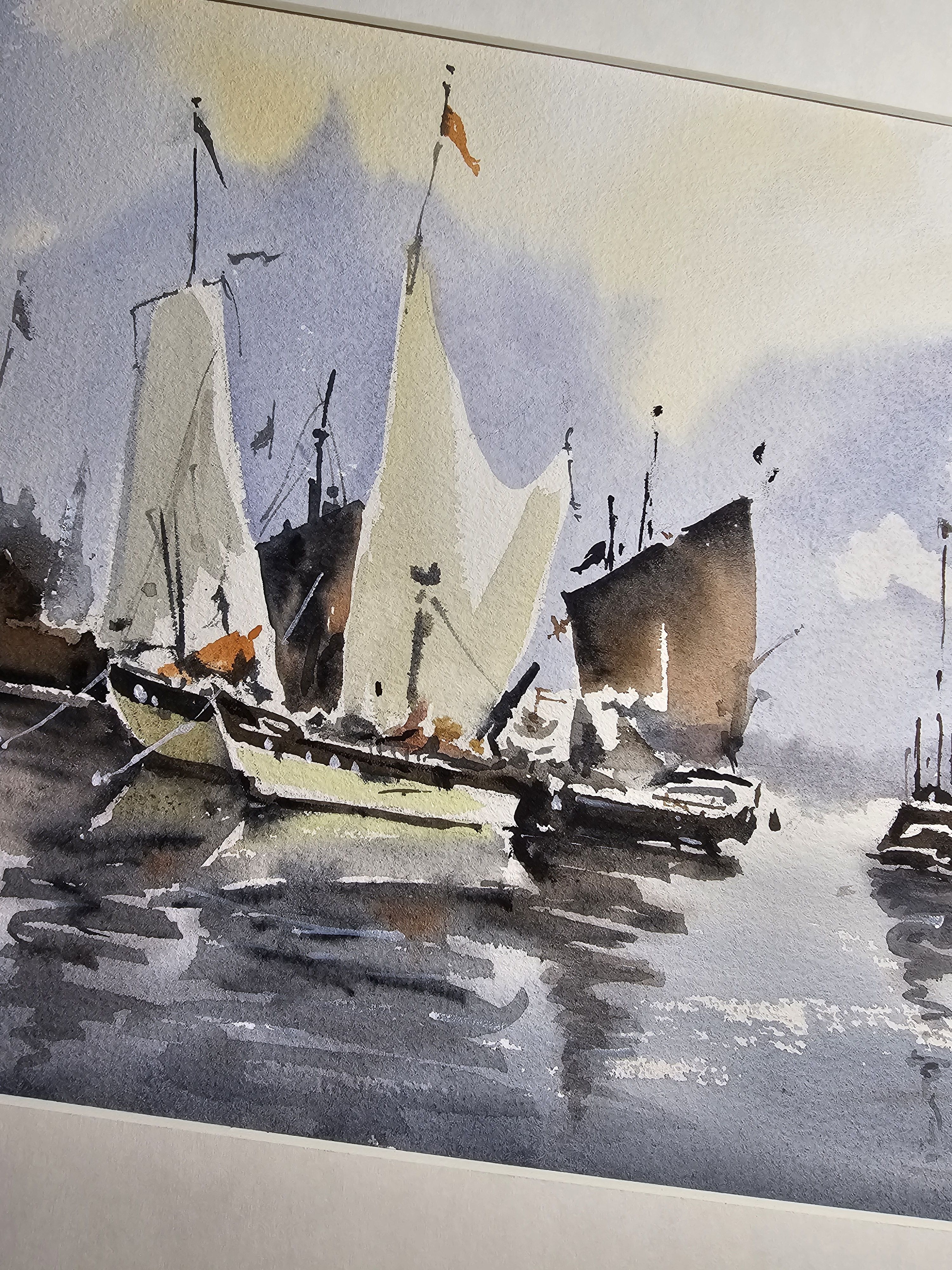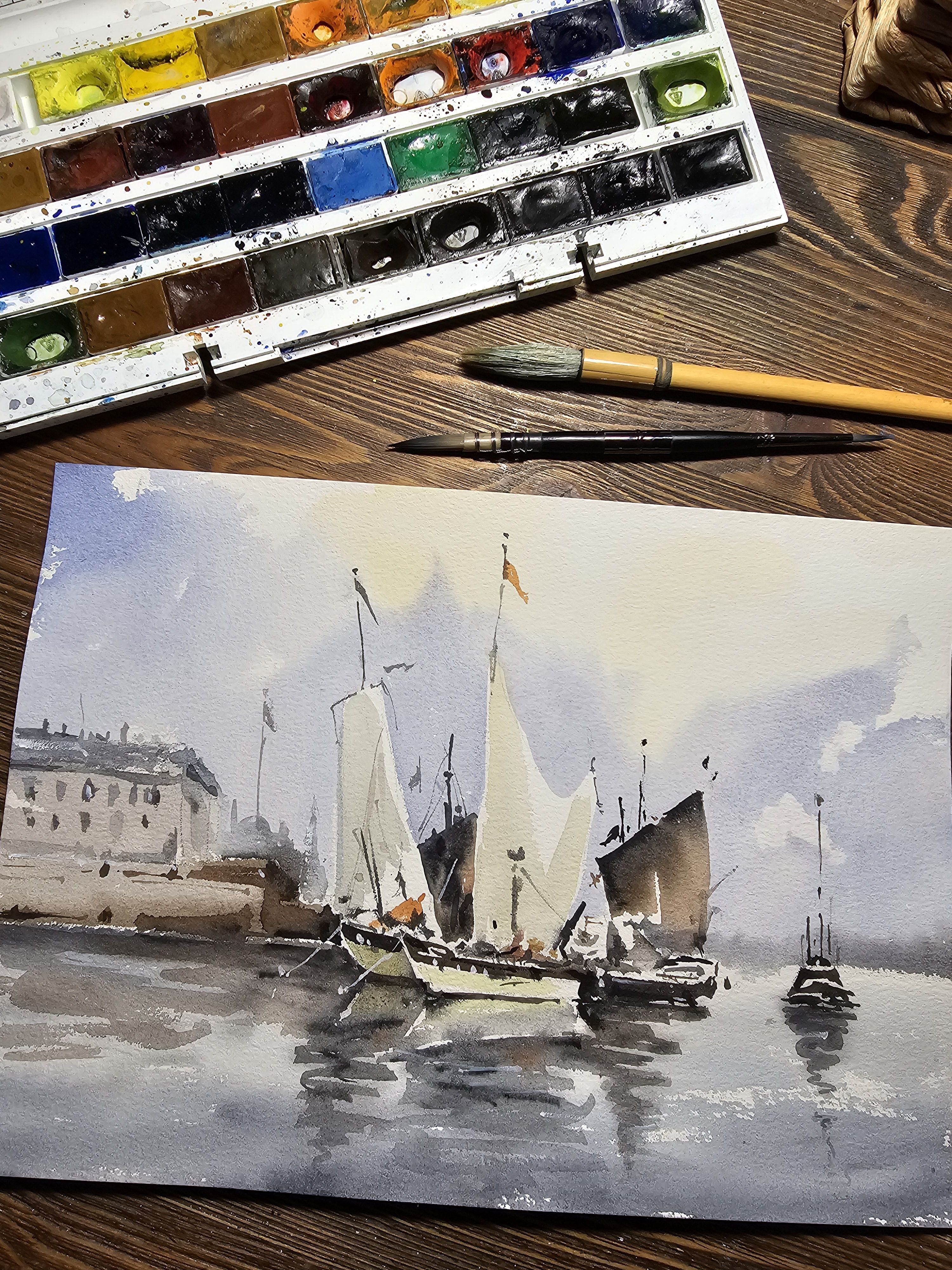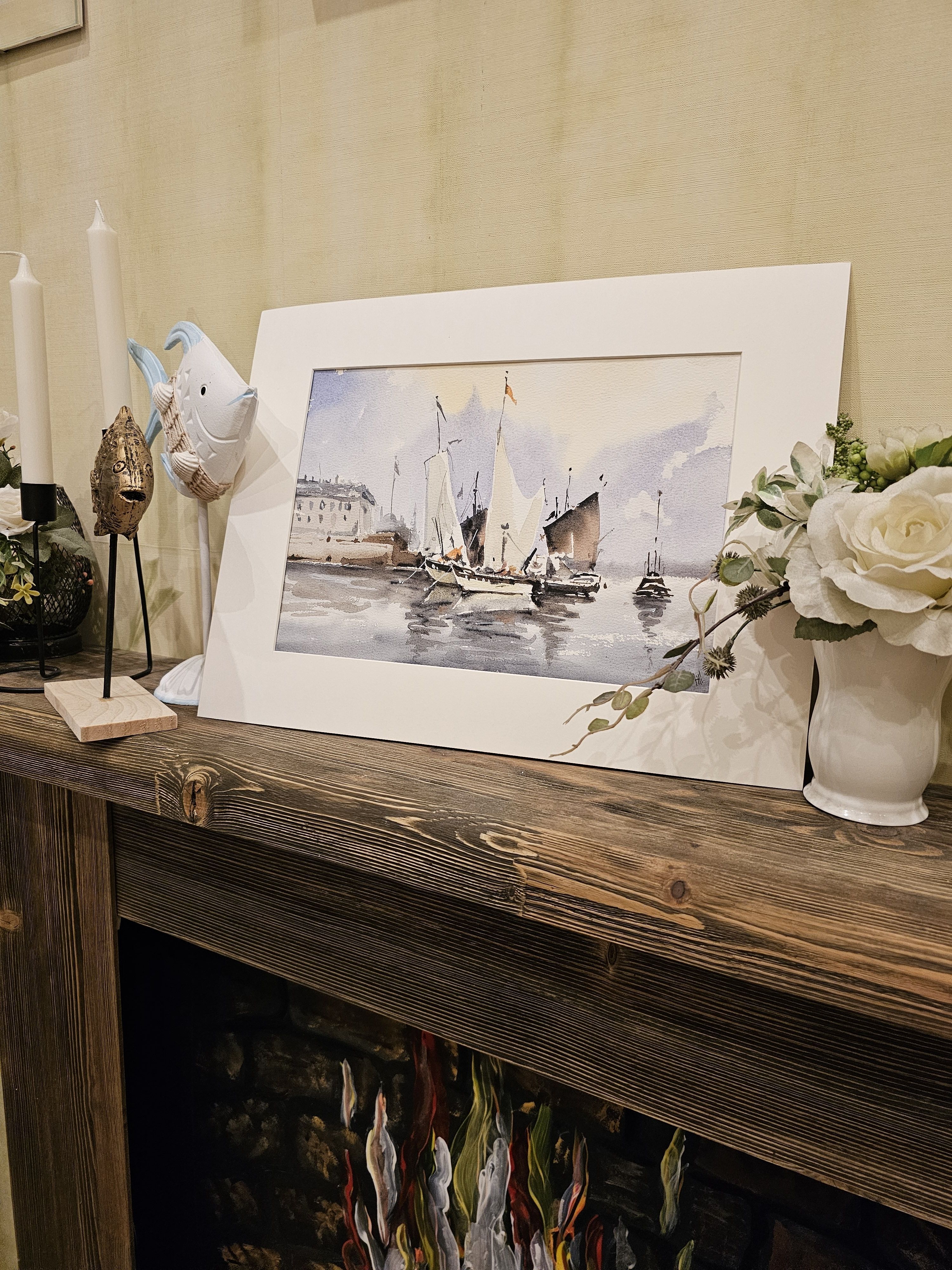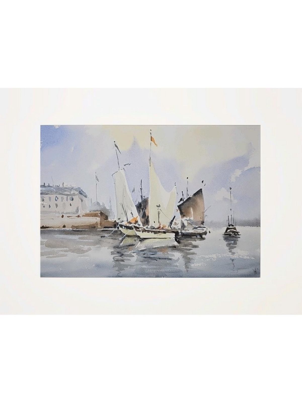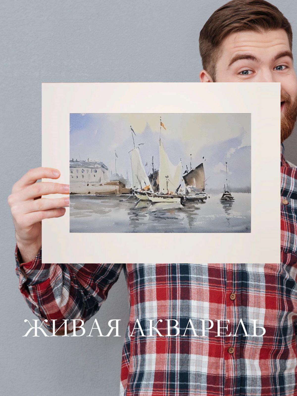 Нам представлена акварельный рисунок, на котором изображена сцена с парусными лодками на воде по мотиву акварели Корнелиу Драган-Тырговиште. В центре видны несколько лодок с развевающимися белыми и бежевыми парусами. На заднем плане справа заметны элементы городской архитектуры, а также здания, вдоль береговой линии. Пейзаж выполнен в мягких оттенках синего и серого, создающих атмосферу спокойствия. Вода отражает лодки и небо, добавляя ощущение глубины и движения. Работа оформлена в светлое паспарту и готова к размещению в стандартной раме 30*40