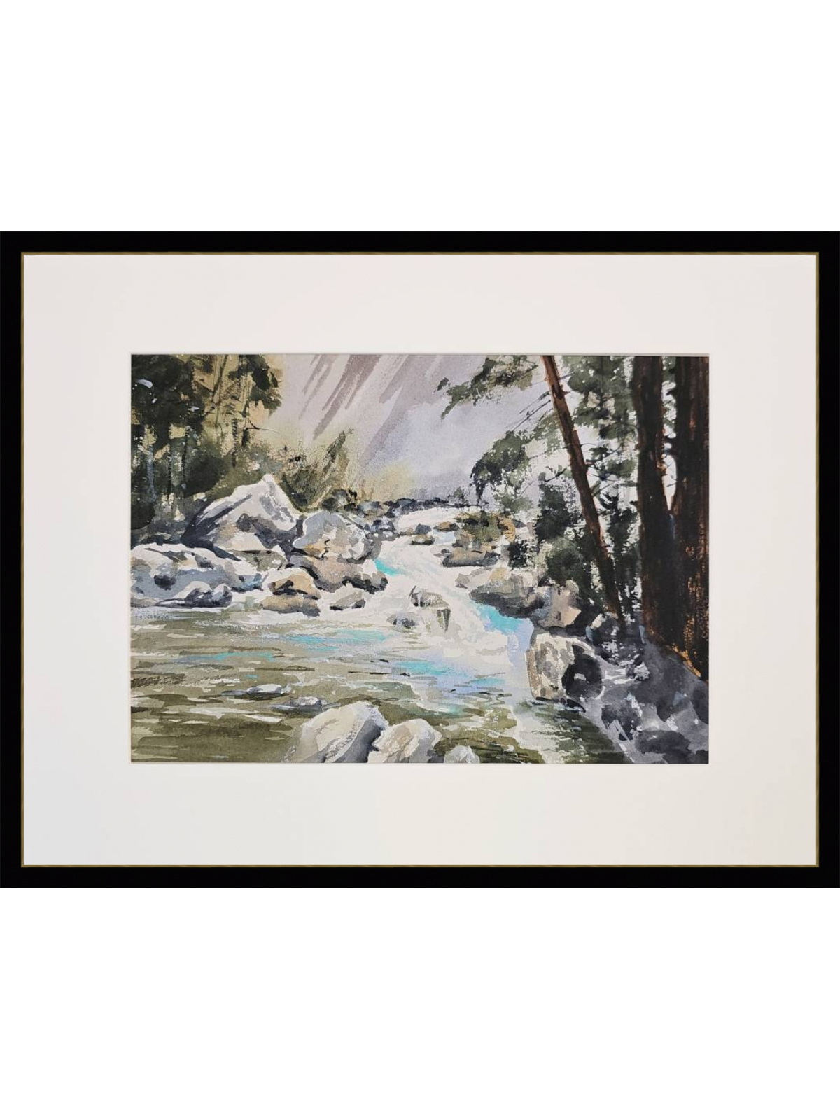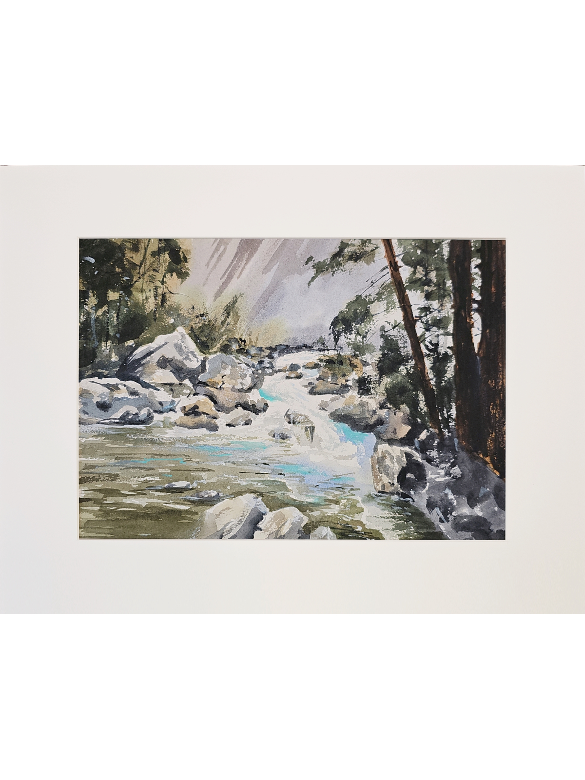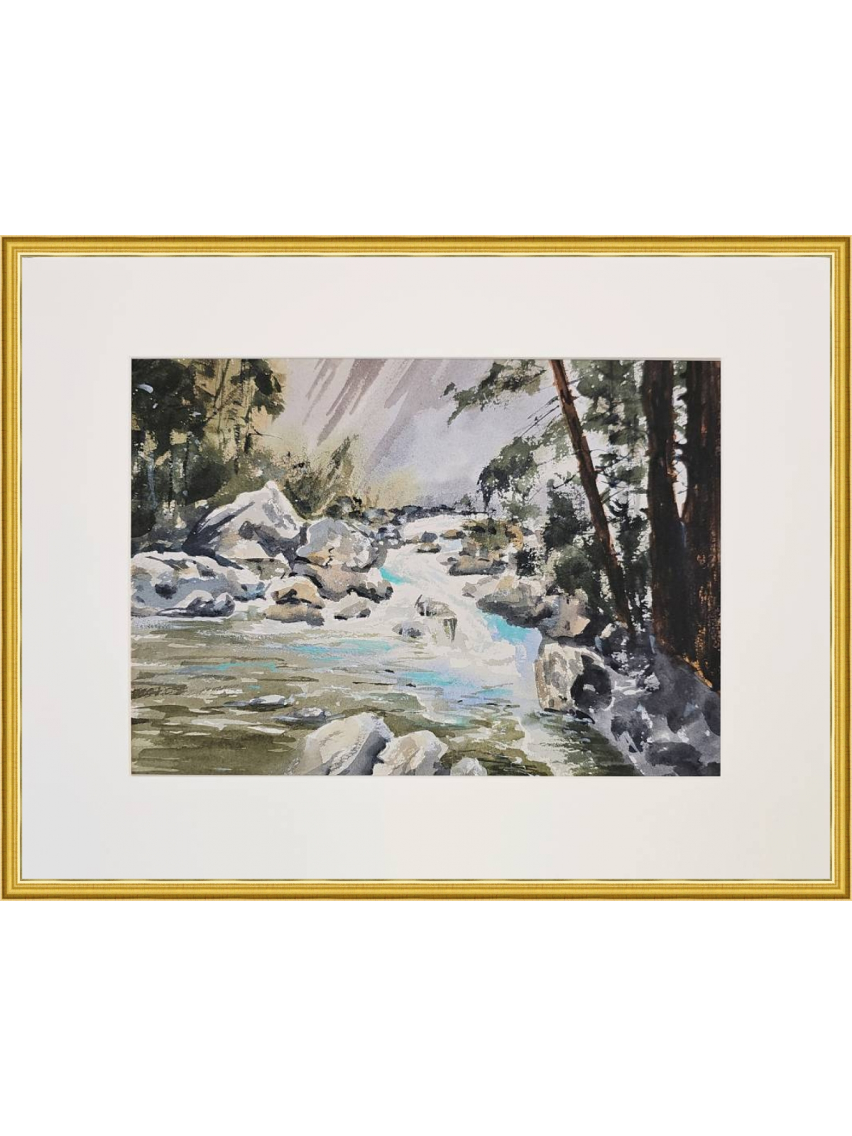 Нам представлена акварельная картина, изображающая природный пейзаж. В центре композиции находится бурная река, текущая среди камней. Вода имеет голубоватый оттенок, что создаёт ощущение свежести и движения. По берегам реки видны деревья и кустарники, которые добавляют зелёные и коричневые оттенки в общую палитру картины. На заднем плане можно заметить более тёмные силуэты деревьев, что создаёт глубину и перспективу. Картина оформлена в светлое паспарту, что подчёркивает её природную тематику. Работа готова к размещению в стандартной раме 30*40 см.