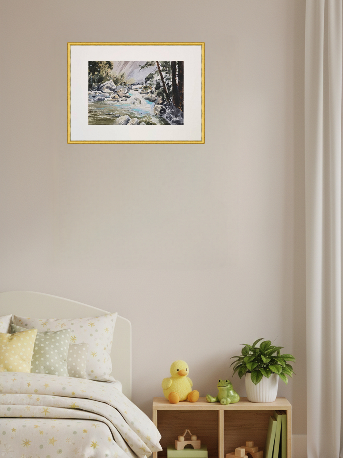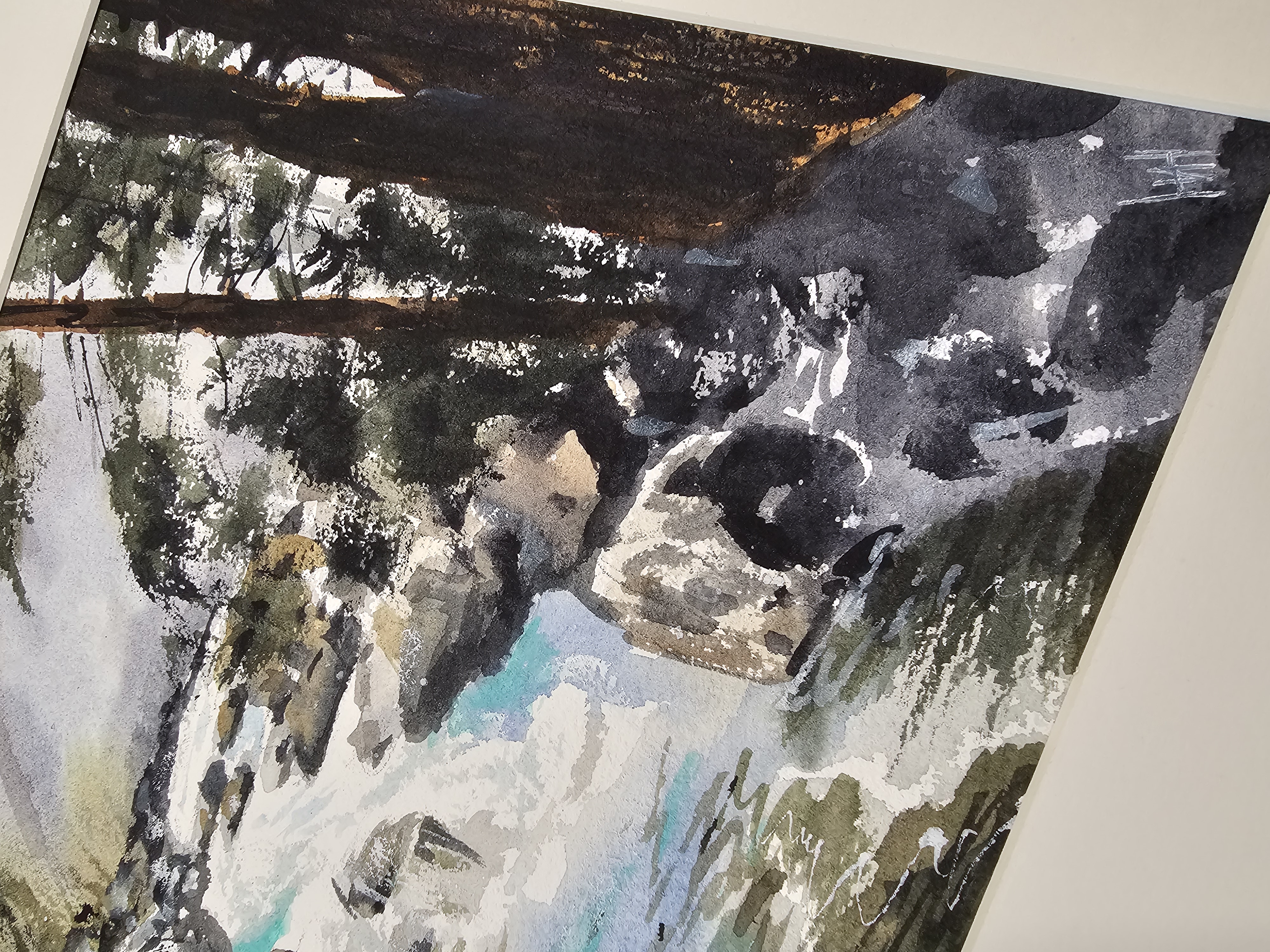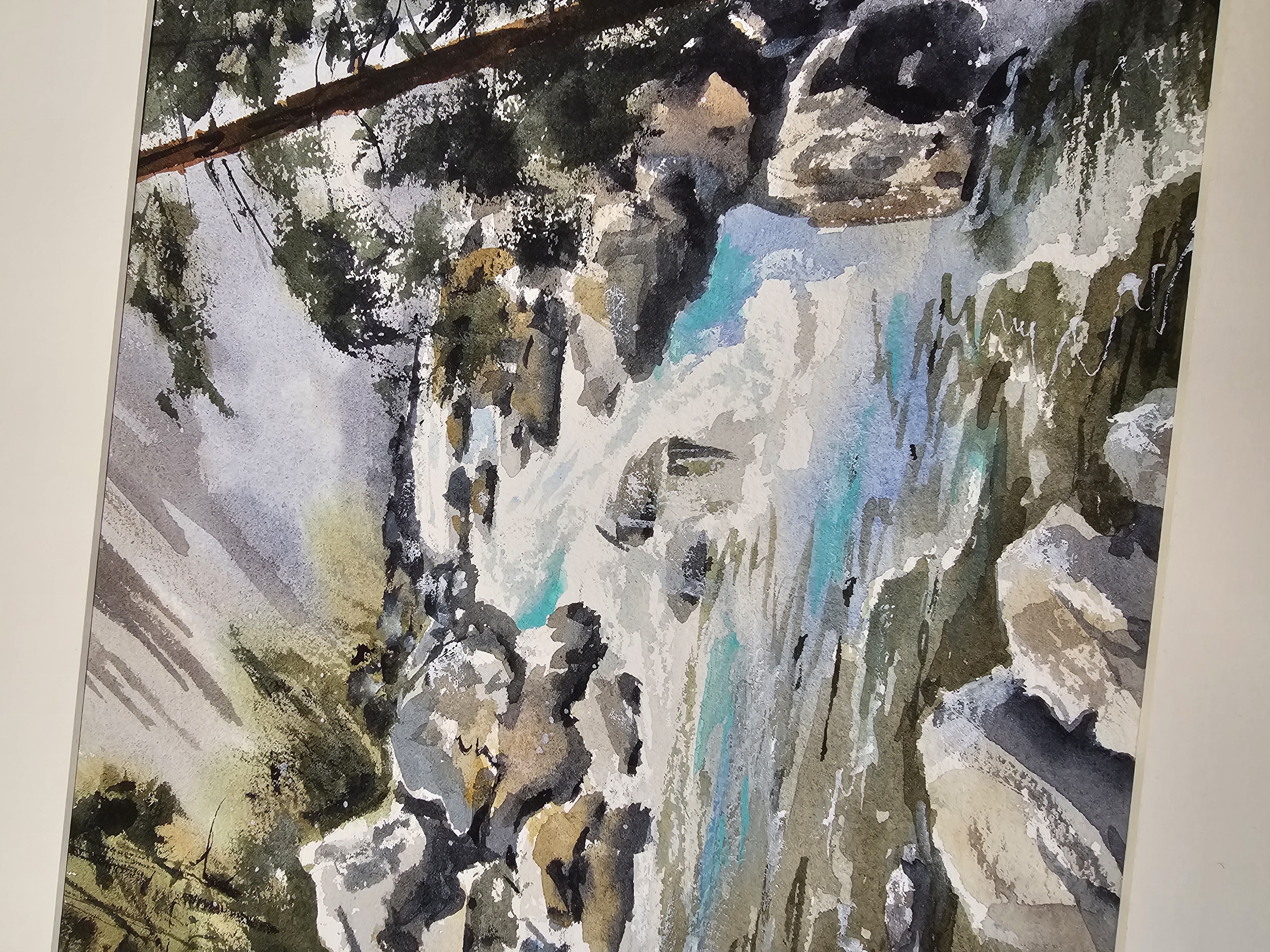 Нам представлена акварельная картина, изображающая природный пейзаж. В центре композиции находится бурная река, текущая среди камней. Вода имеет голубоватый оттенок, что создаёт ощущение свежести и движения. По берегам реки видны деревья и кустарники, которые добавляют зелёные и коричневые оттенки в общую палитру картины. На заднем плане можно заметить более тёмные силуэты деревьев, что создаёт глубину и перспективу. Картина оформлена в светлое паспарту, что подчёркивает её природную тематику. Работа готова к размещению в стандартной раме 30*40 см.