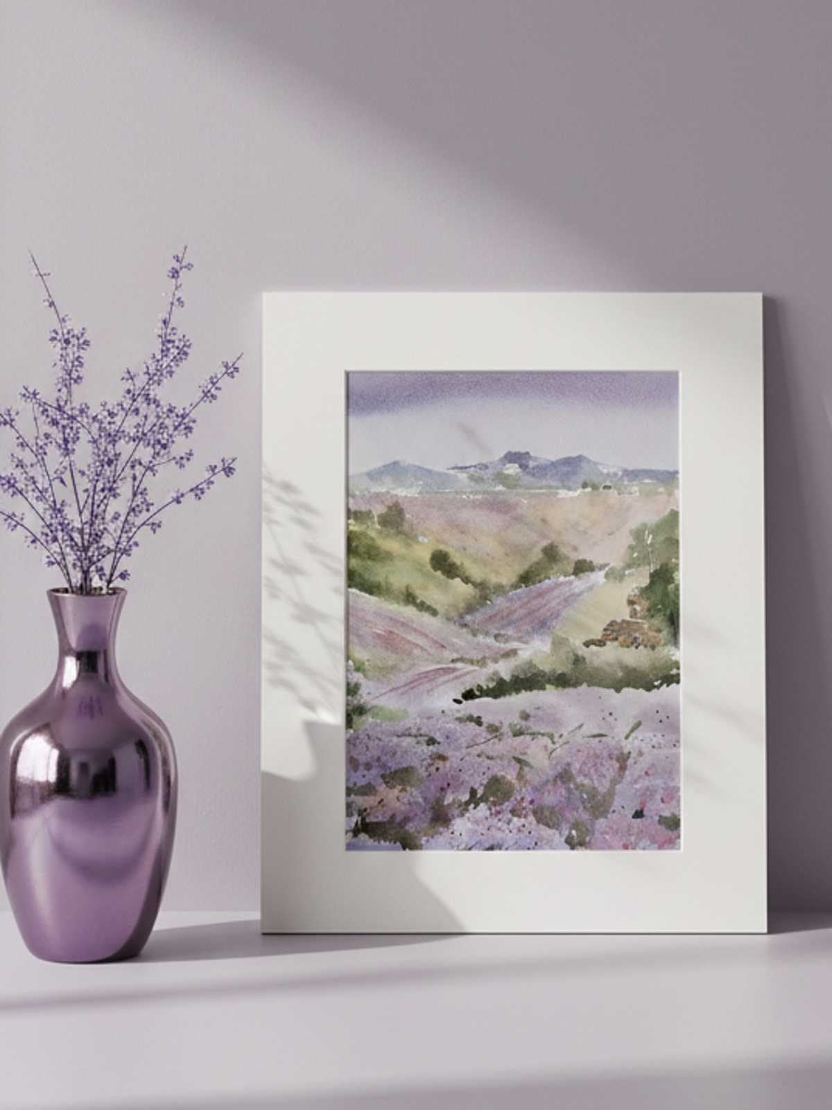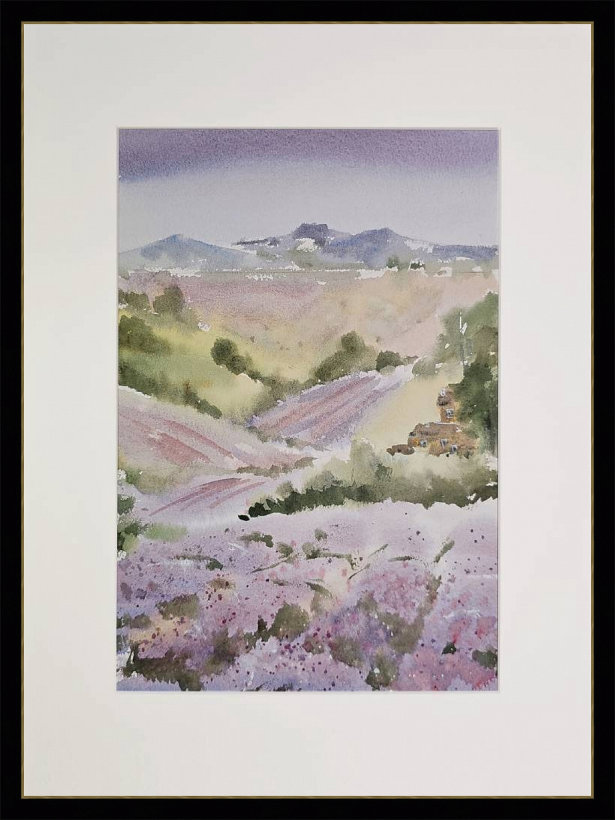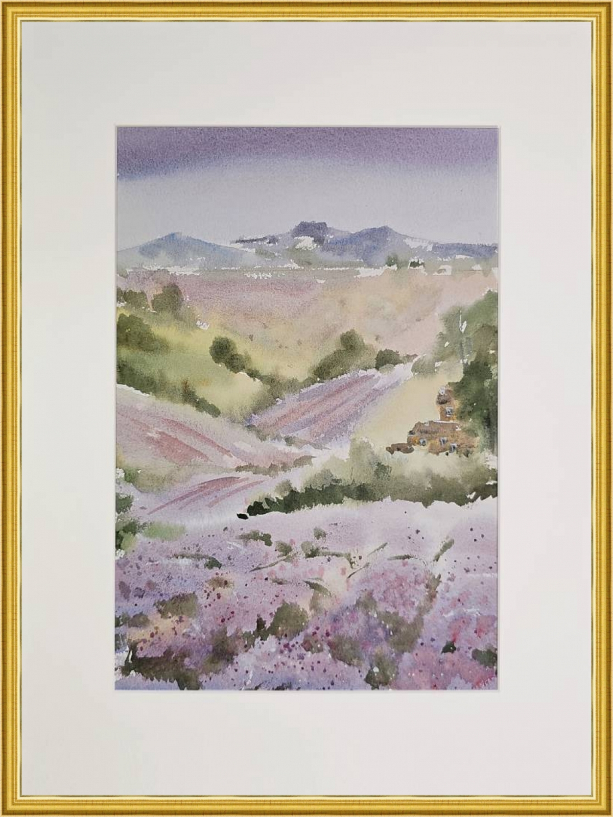 Нам представлена акварельная картина с пейзажем. На переднем плане изображены поля с цветами лаванды, в фиолетовых и розовых тонах. В средней части картины видны зелёные холмы и деревья, создающие ощущение глубины. На заднем плане находятся горы, окрашенные в синие и фиолетовые оттенки, которые плавно переходят в светло-голубое небо. Картина выполнена в мягких пастельных тонах, создавая атмосферу спокойствия и умиротворения. Работа оформлена в светлое паспарту и готова к размещению в стандартной раме 30*40 см.