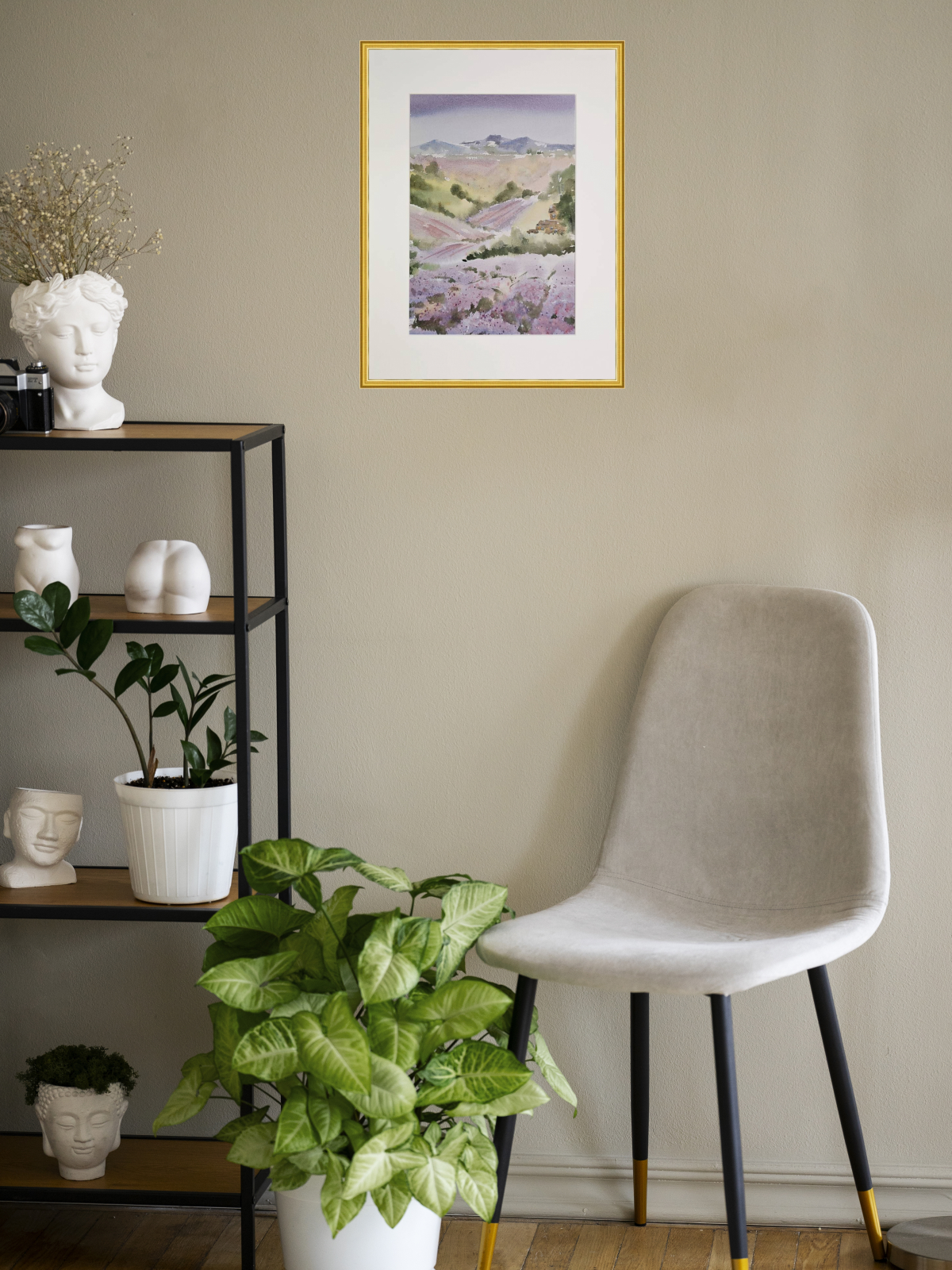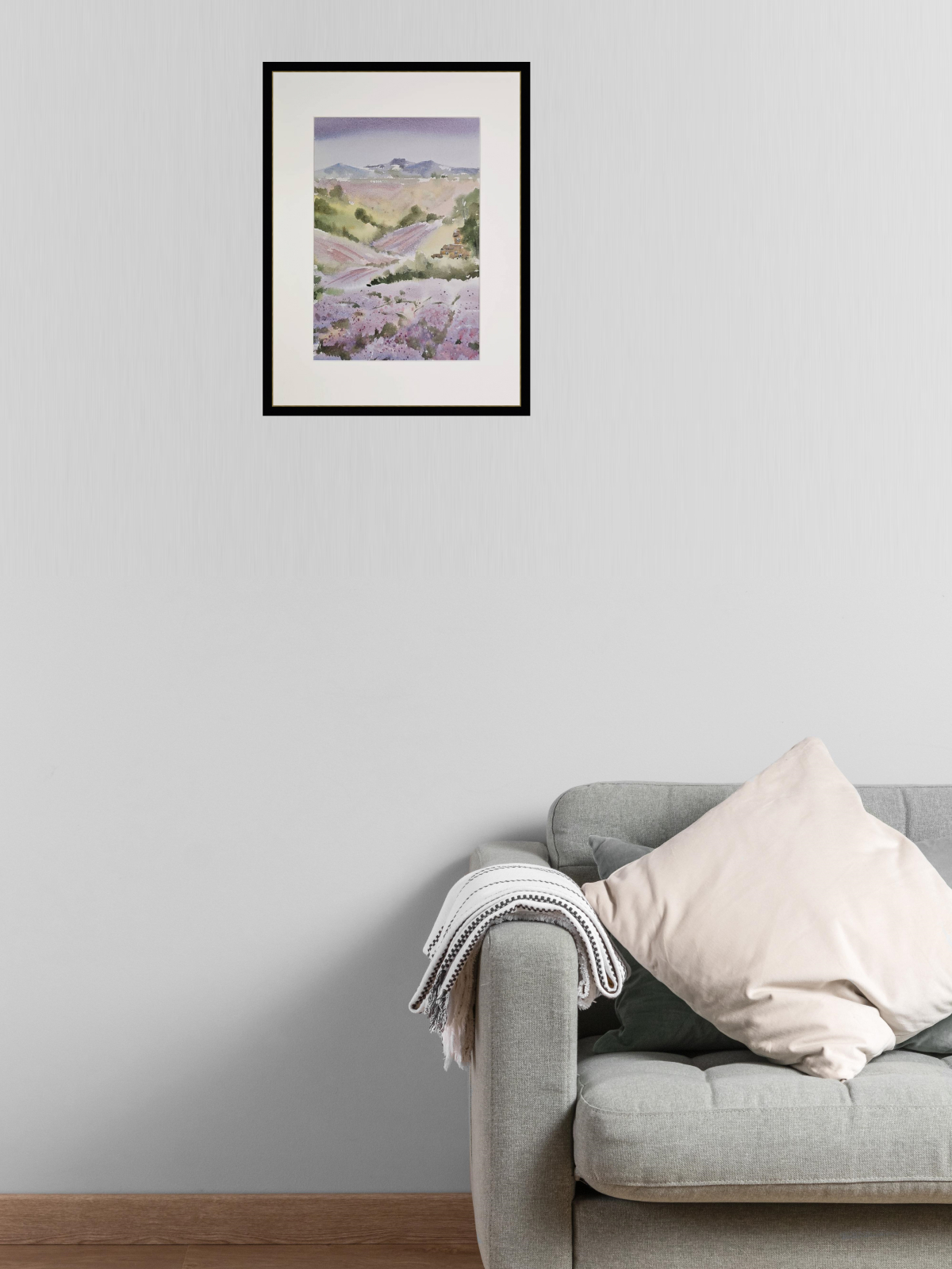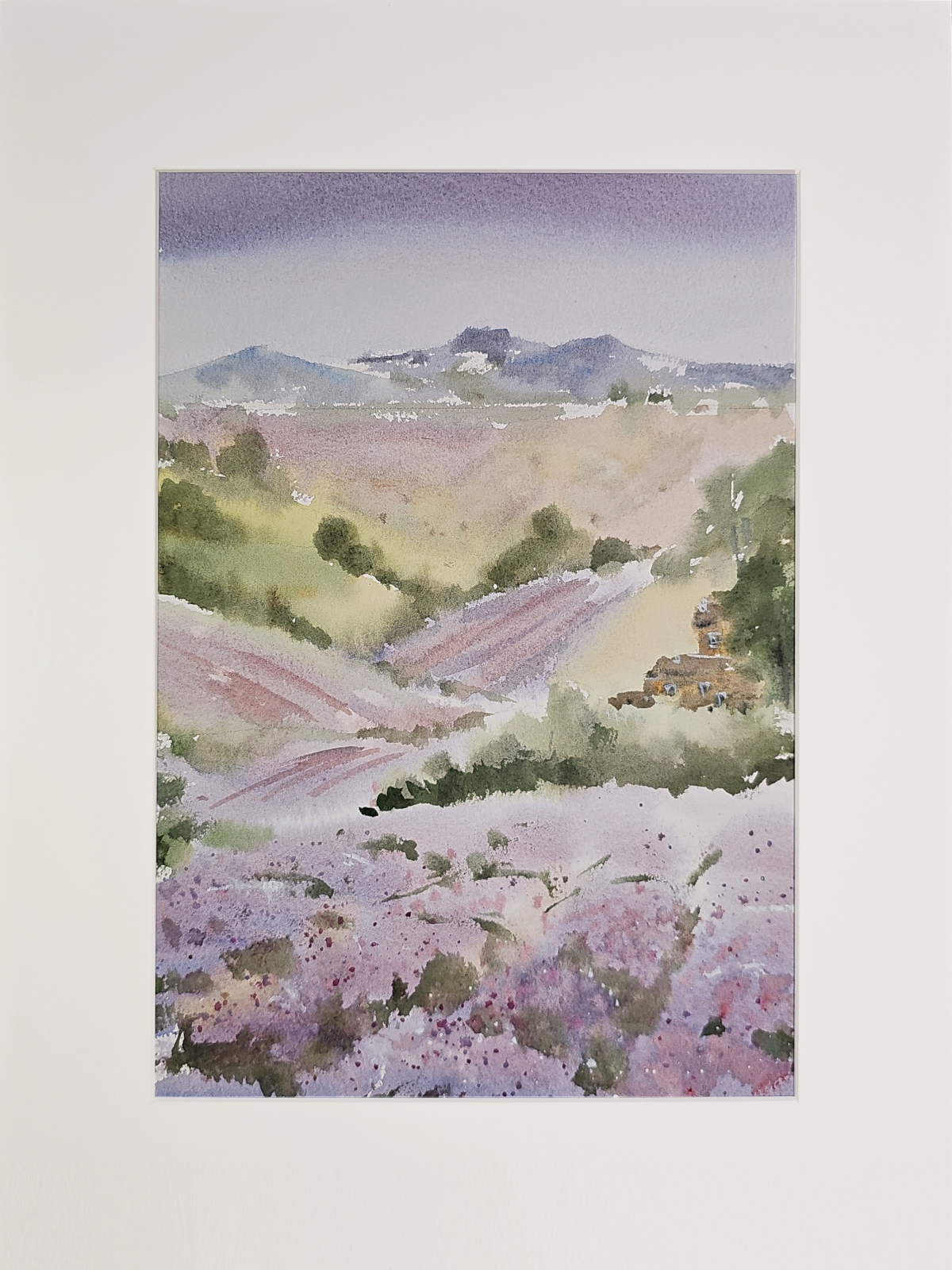 Нам представлена акварельная картина с пейзажем. На переднем плане изображены поля с цветами лаванды, в фиолетовых и розовых тонах. В средней части картины видны зелёные холмы и деревья, создающие ощущение глубины. На заднем плане находятся горы, окрашенные в синие и фиолетовые оттенки, которые плавно переходят в светло-голубое небо. Картина выполнена в мягких пастельных тонах, создавая атмосферу спокойствия и умиротворения. Работа оформлена в светлое паспарту и готова к размещению в стандартной раме 30*40 см.