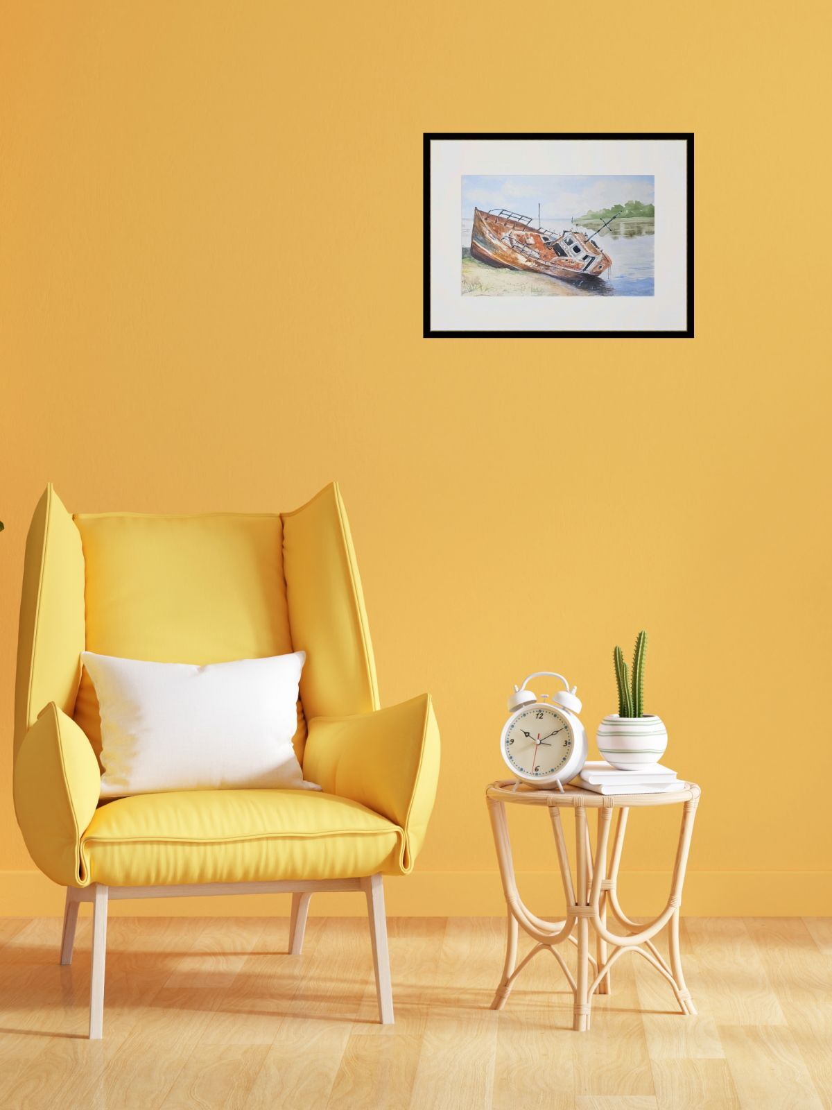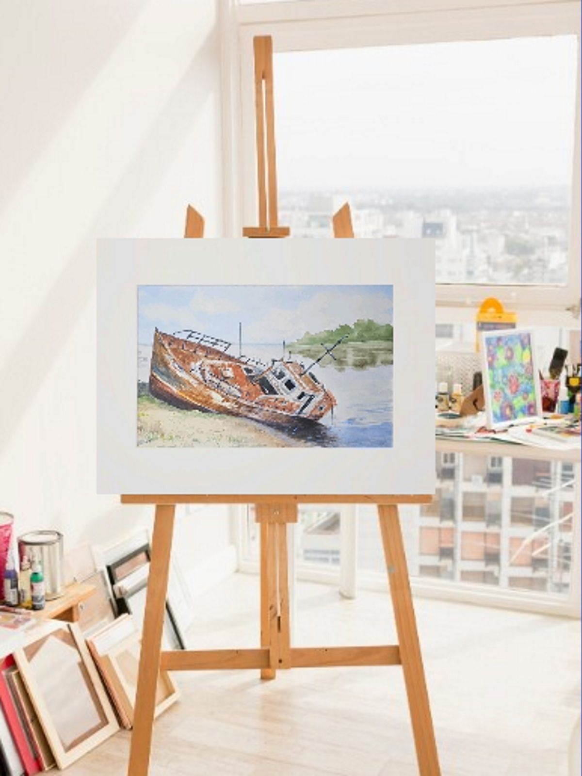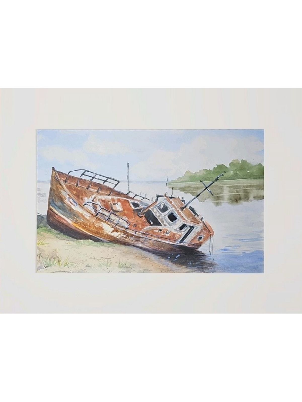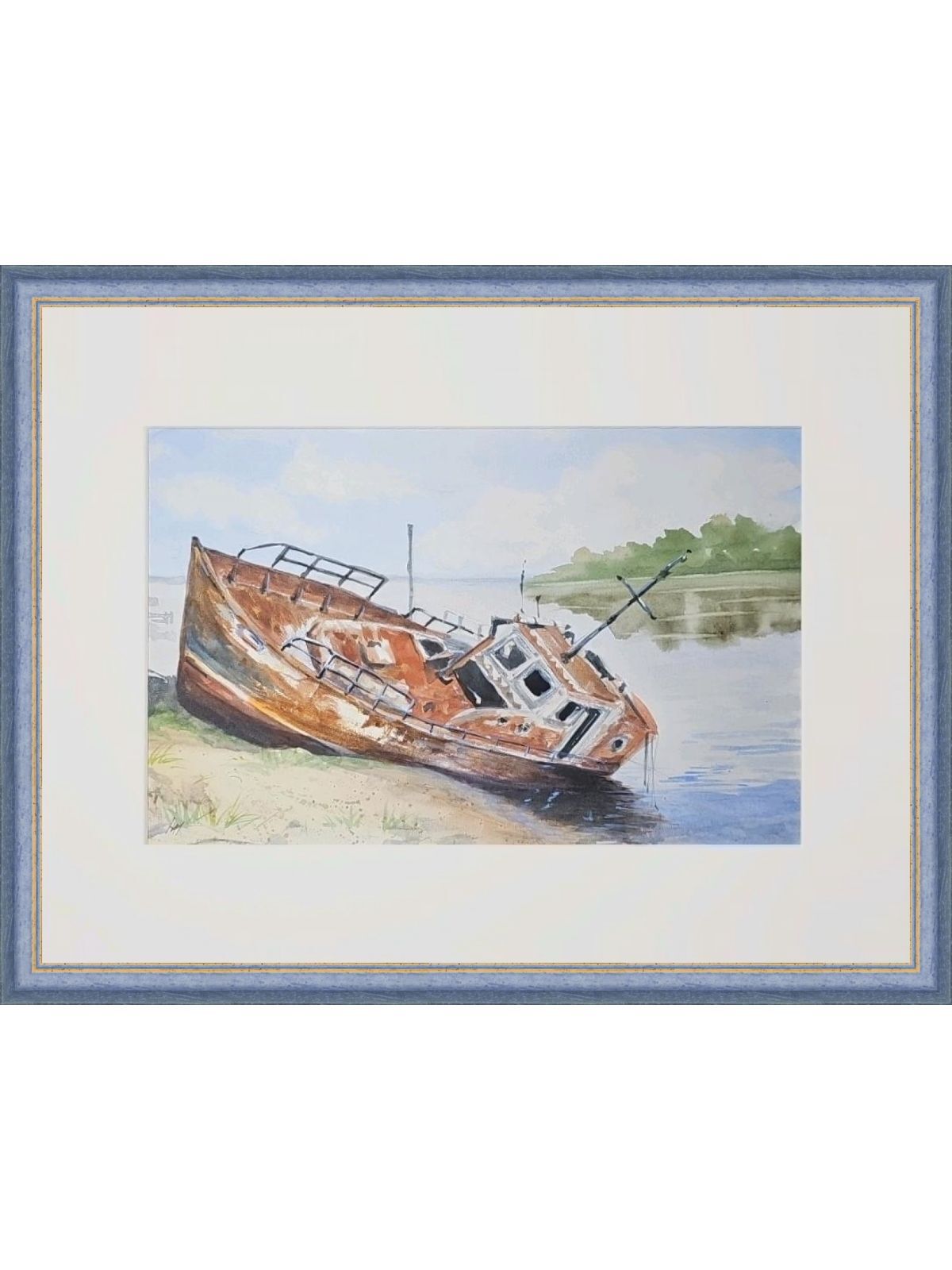 Нам представлена картина, на которой изображена старая ржавая лодка. Лодка находится на берегу водоема, частично погружена в воду. Корпус лодки сильно поврежден, видны следы ржавчины, покраска облупилась, и конструкция выглядит заброшенной. Вода спокойная, а на заднем плане можно увидеть зеленую растительность на противоположном берегу. Небо светлое с облаками, создающими атмосферу уединения и запустения.
