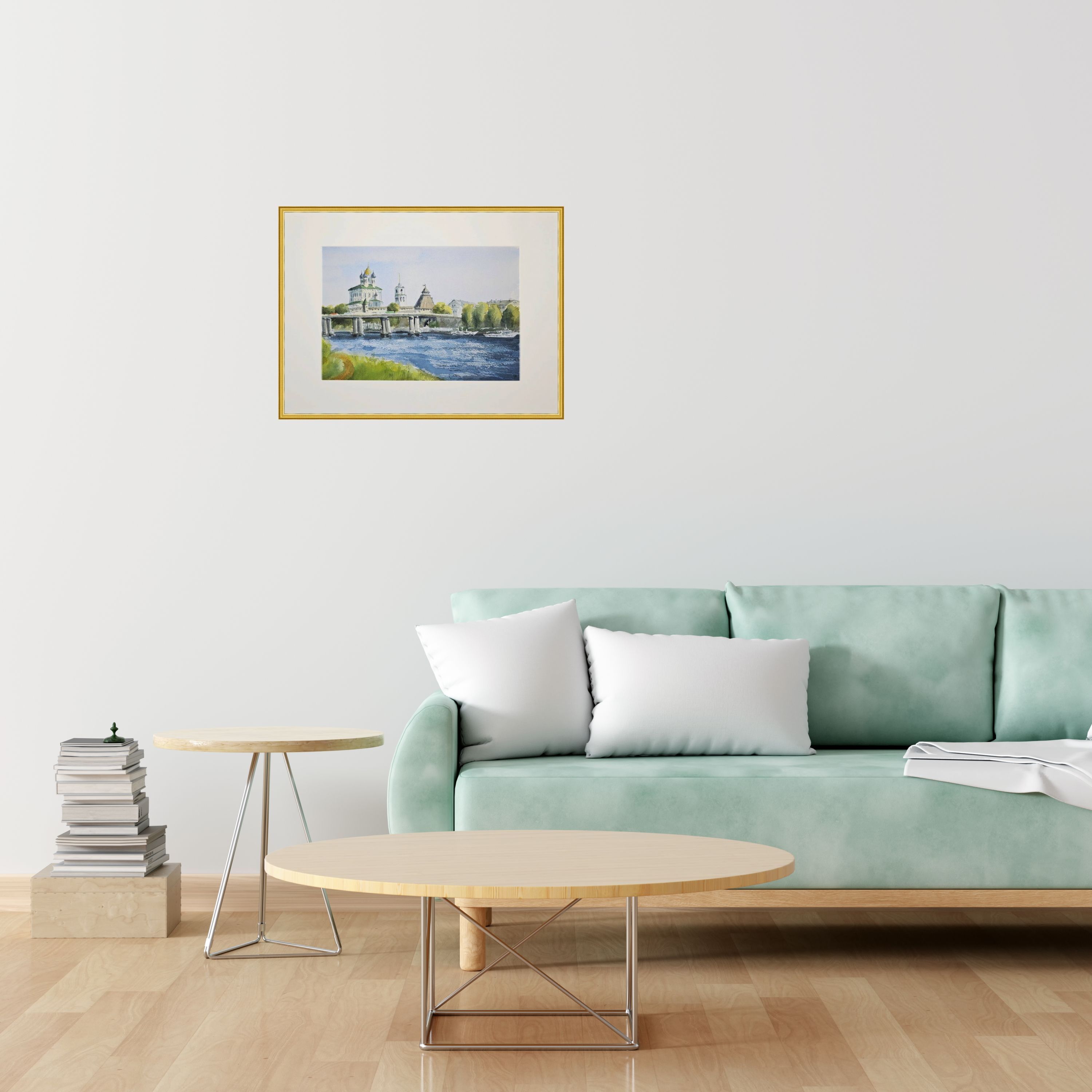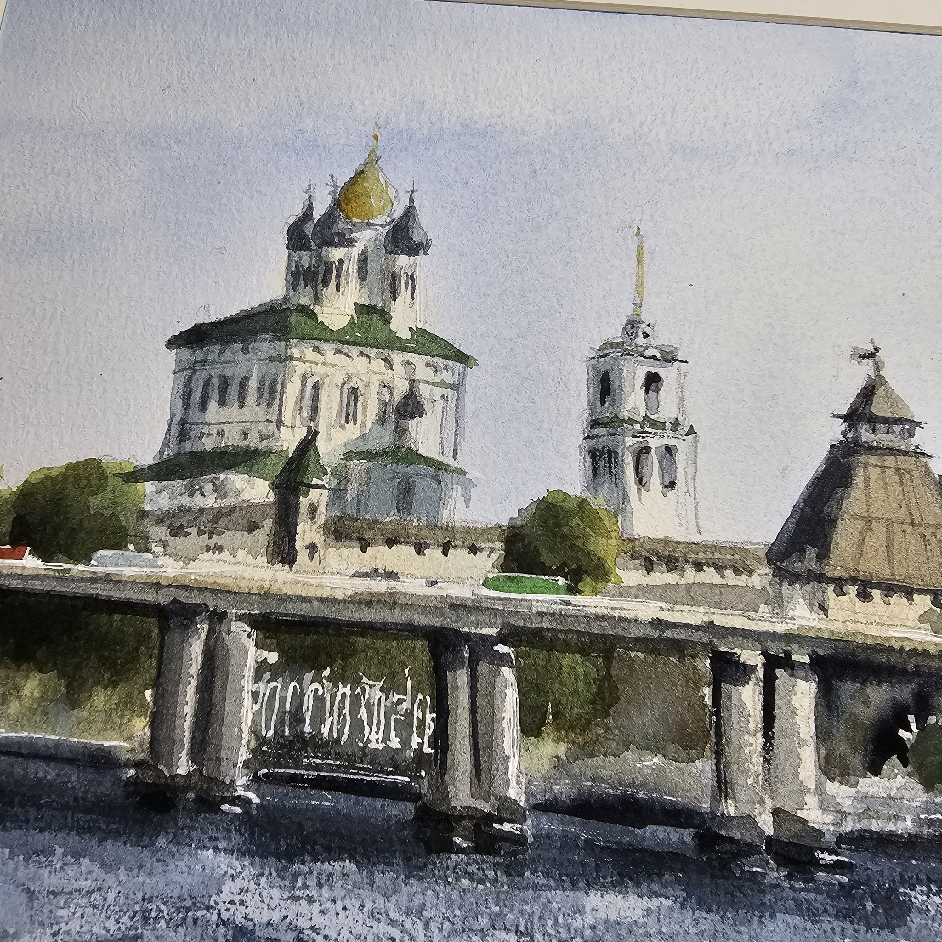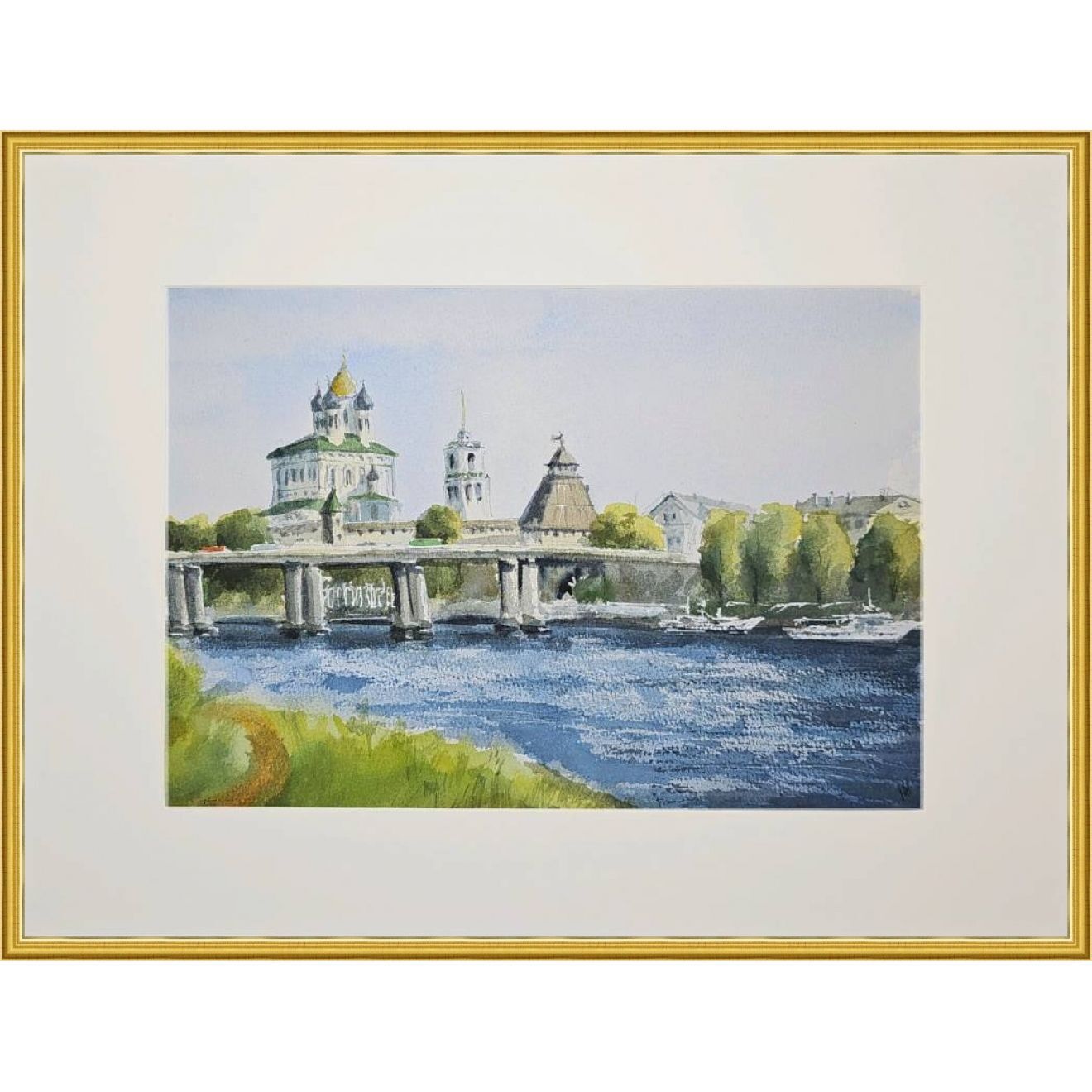 Через реку Великую проходит Ольгинский мост. На заднем плане виднен Псковский Кром в традиционном русском стиле, на фоне стен и башен выделяется Свято-Троицкий собор с золотым куполом и отдельностоящая колокольня с золотым шпилем. Берег реки украшен зелёной растительностью, на причале стоят прогулочные корабли ожидающие своих посетителей. Течение реки спокойное, отражает небо и сооружения.
