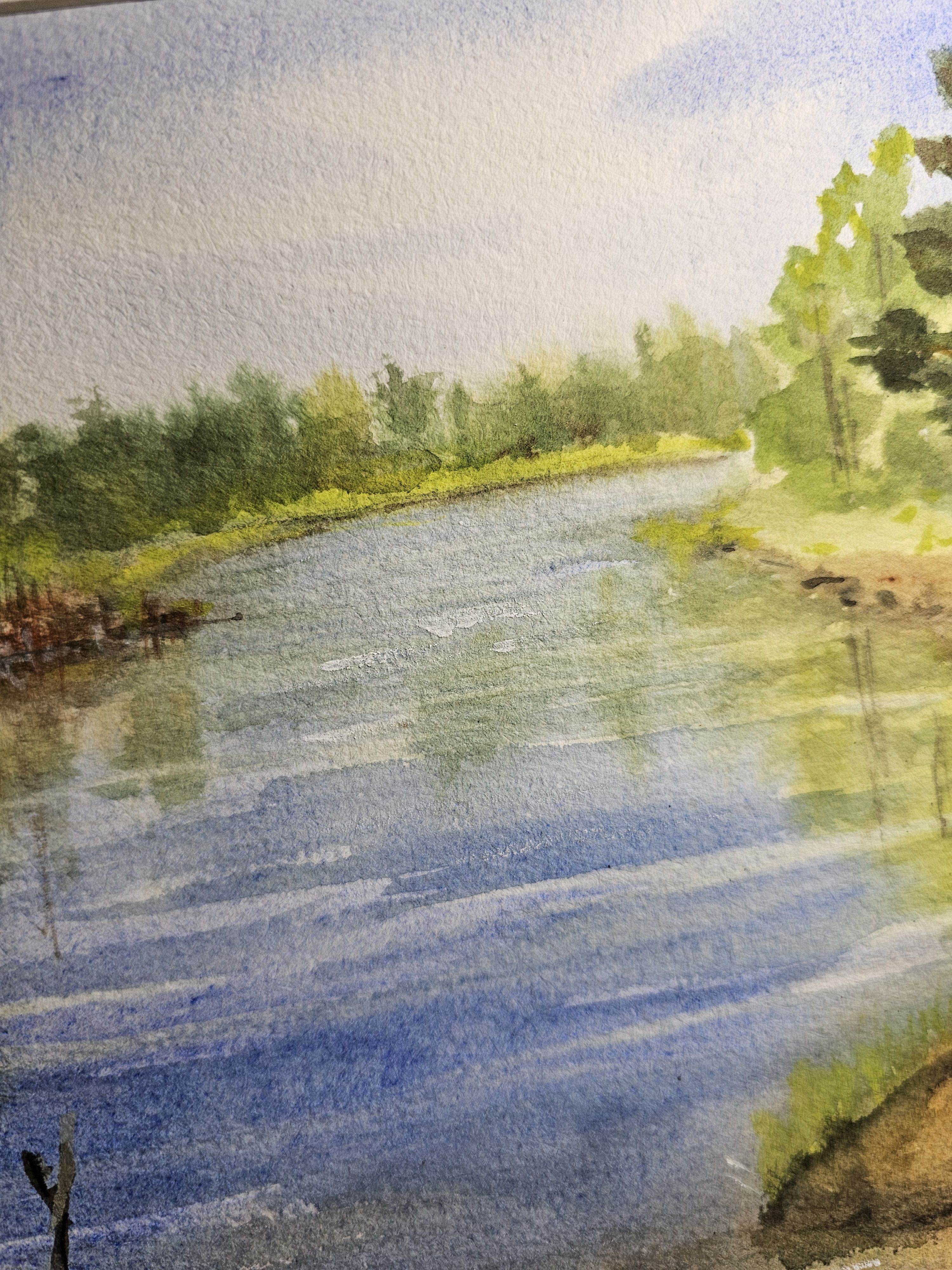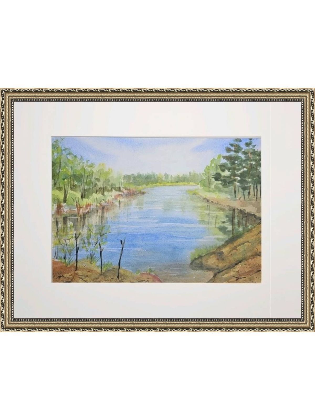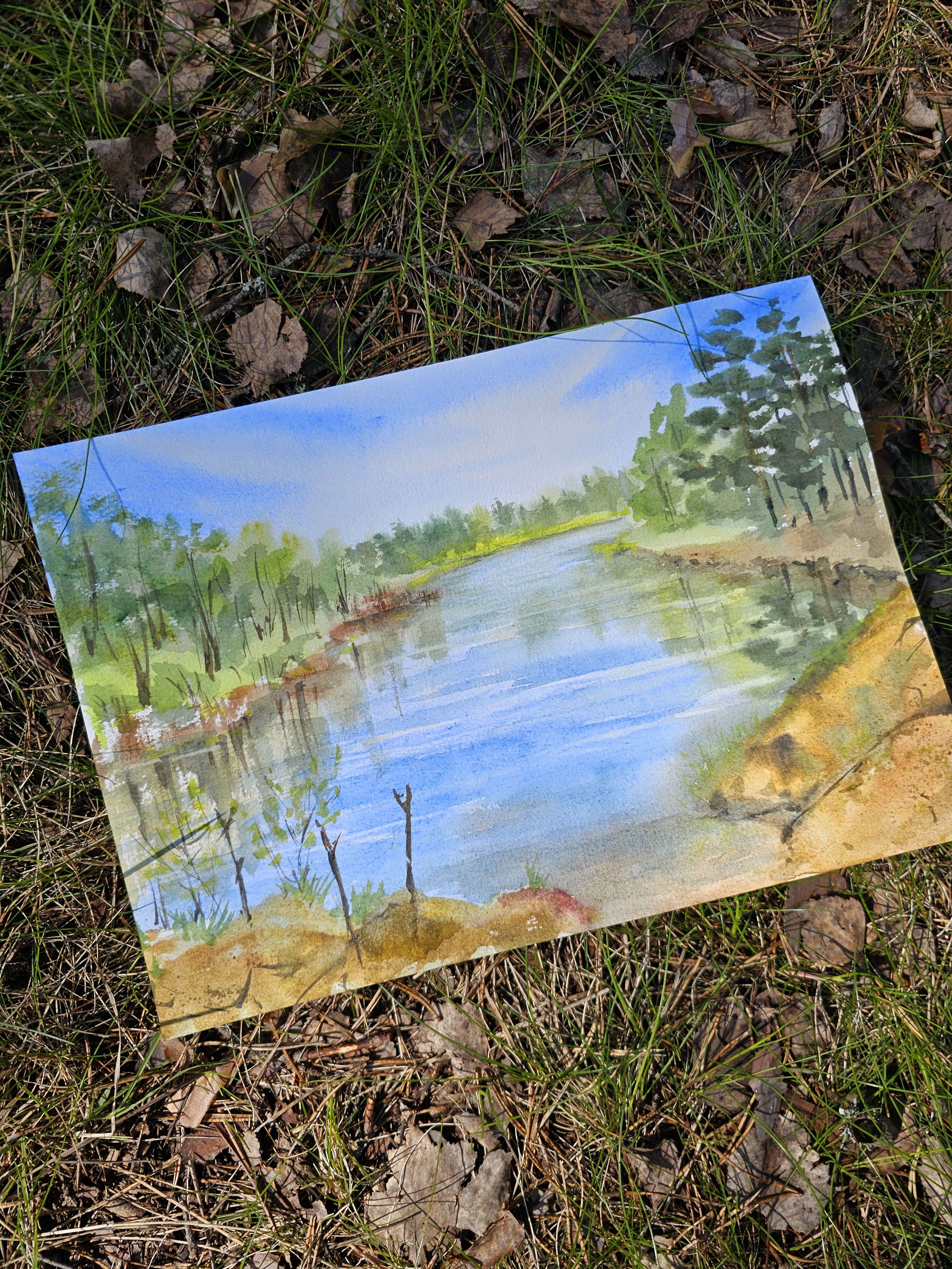 Нам представлена акварельная картина с пейзажем. В центре композиции находится река, отражающая небо. На переднем плане видны травы и кустарники. Вдоль берегов растут деревья, преимущественно хвойные справа и лиственные слева. Небо ясное с легкими облаками. Картина создает атмосферу спокойствия и гармонии с природой.