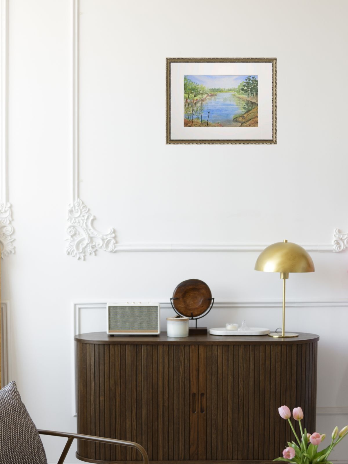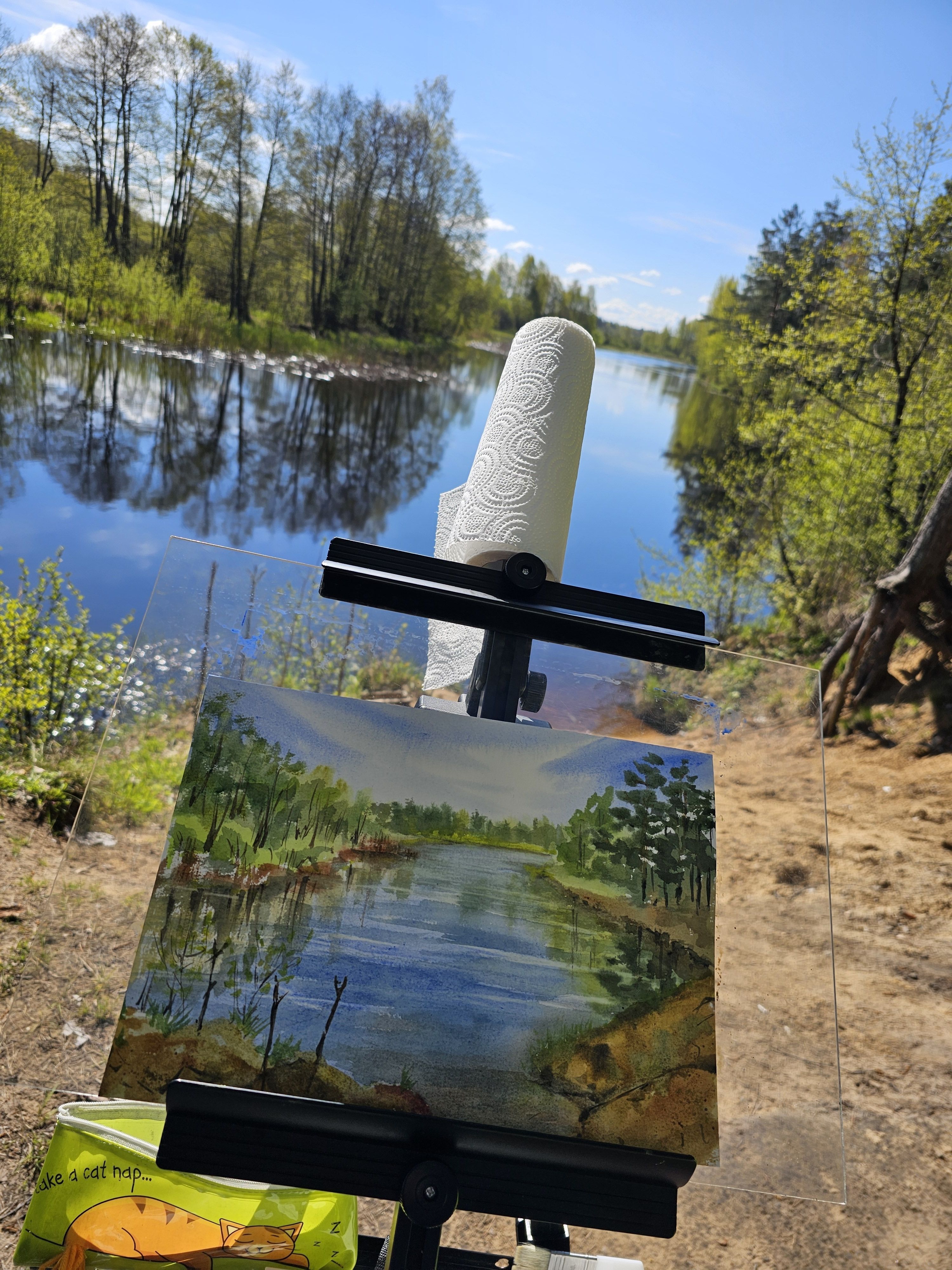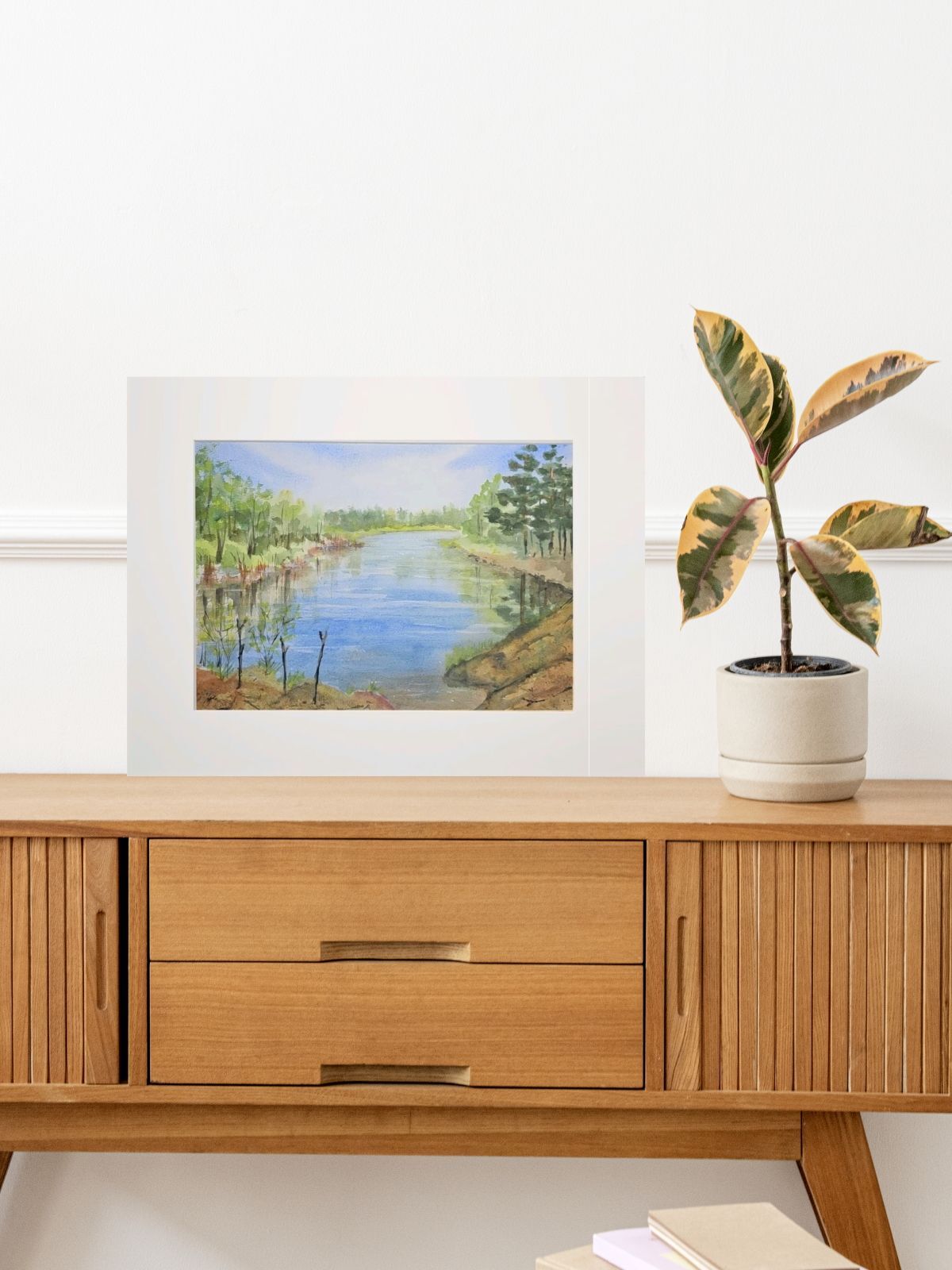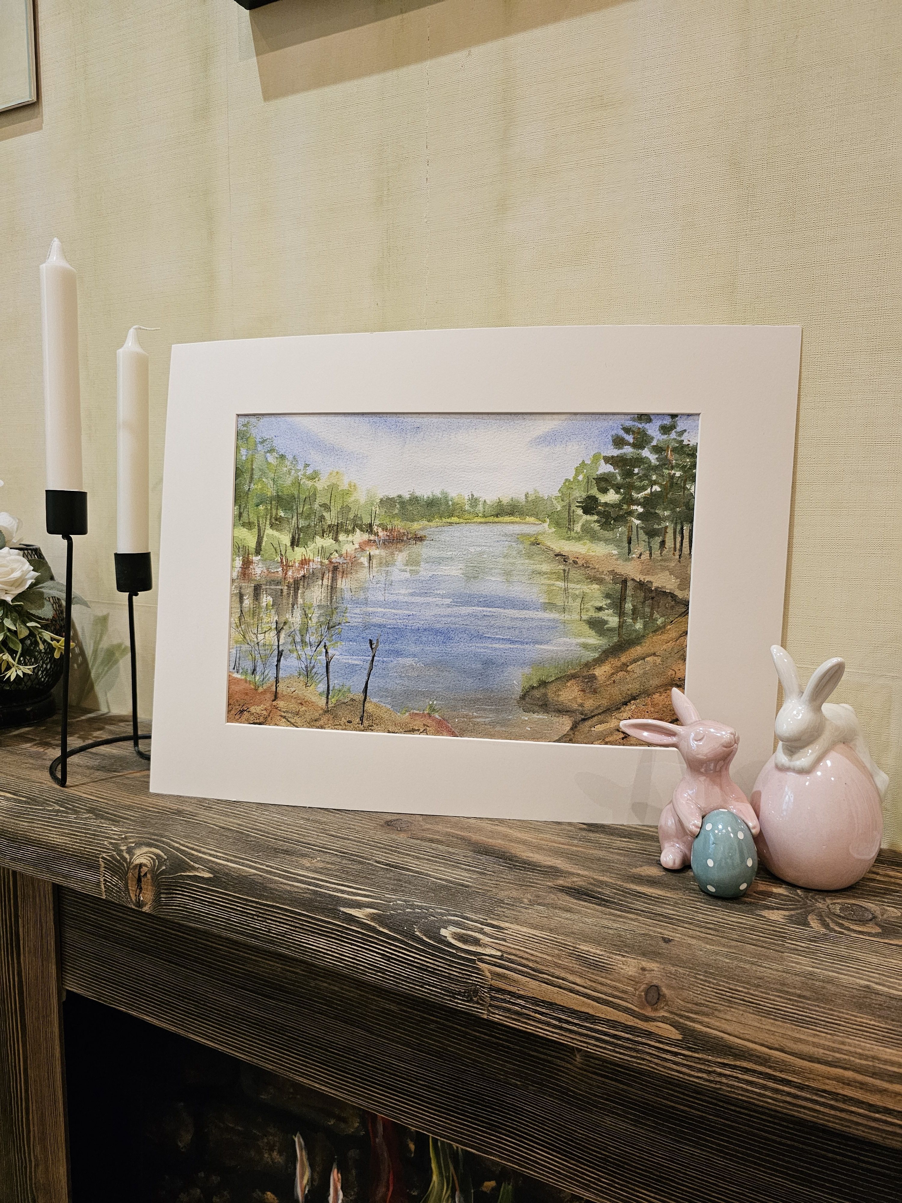 Нам представлена акварельная картина с пейзажем. В центре композиции находится река, отражающая небо. На переднем плане видны травы и кустарники. Вдоль берегов растут деревья, преимущественно хвойные справа и лиственные слева. Небо ясное с легкими облаками. Картина создает атмосферу спокойствия и гармонии с природой.