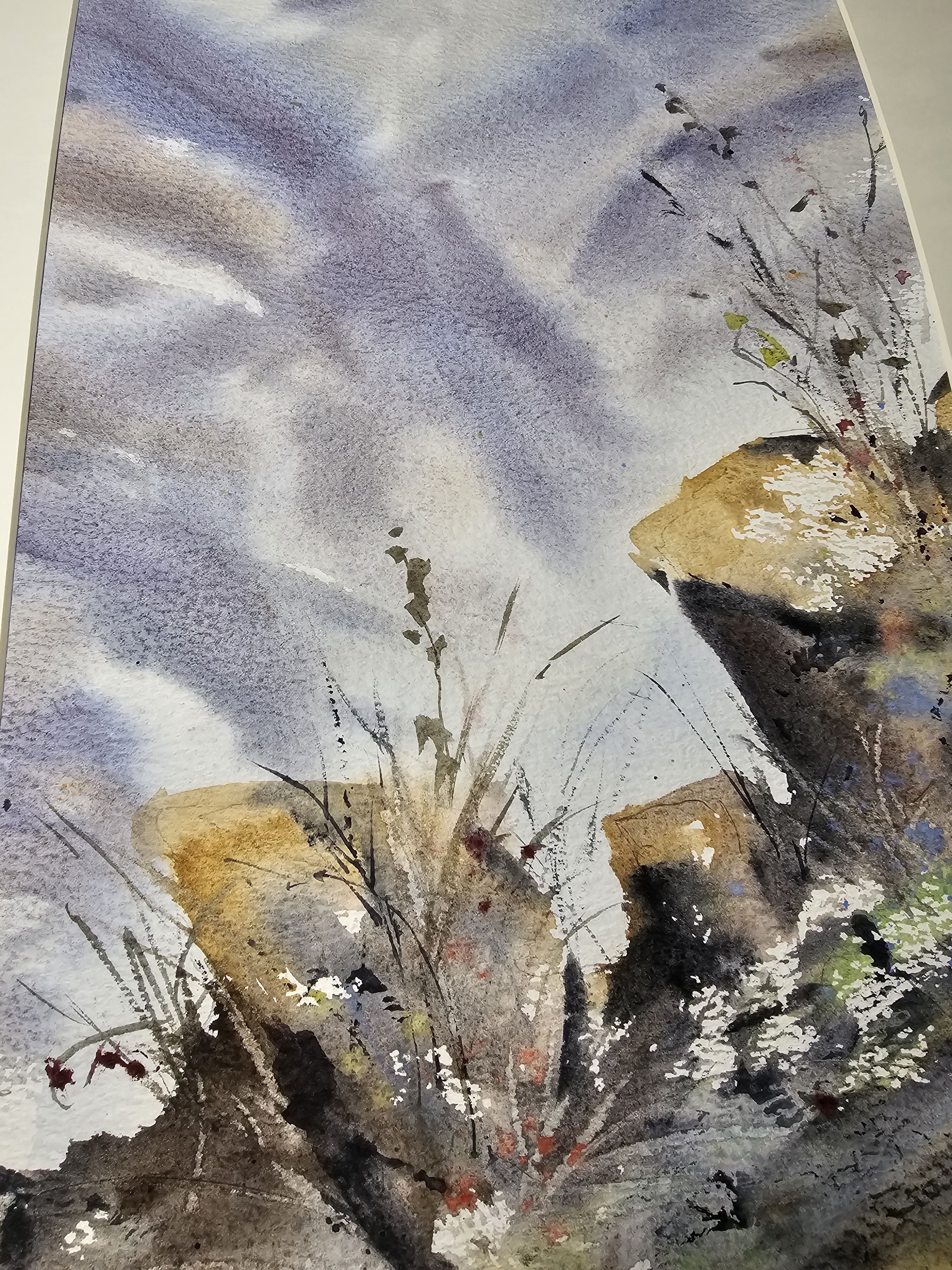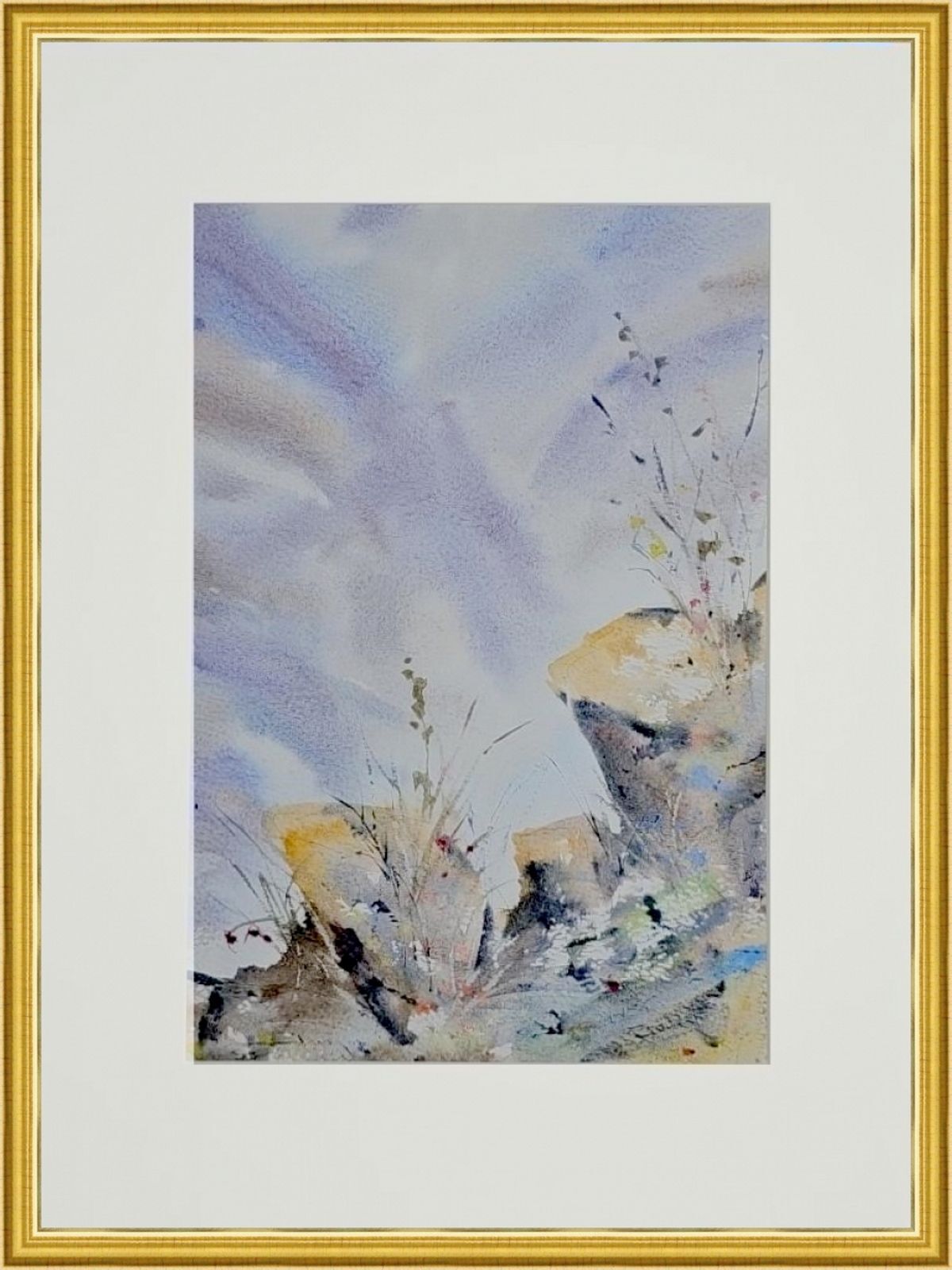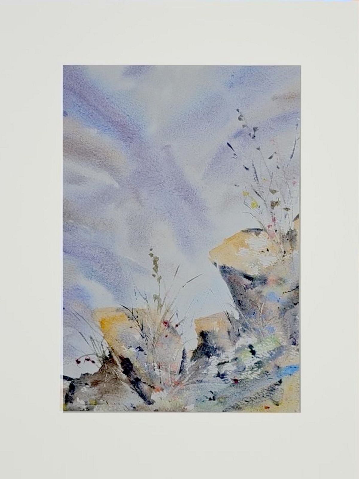 Нам представлена акварельная картина, изображающая пейзаж с элементами природы. В верхней части горный массив в светло-голубом и фиолетовом тумане с лёгкими облаками. На переднем плане изображены камни и растения. Растения выглядят как тонкие стебли с листьями и цветами. Камни имеют жёлтые и серые оттенки с различными текстурами и деталями. Композиция создаёт атмосферу легкости и гармонии.