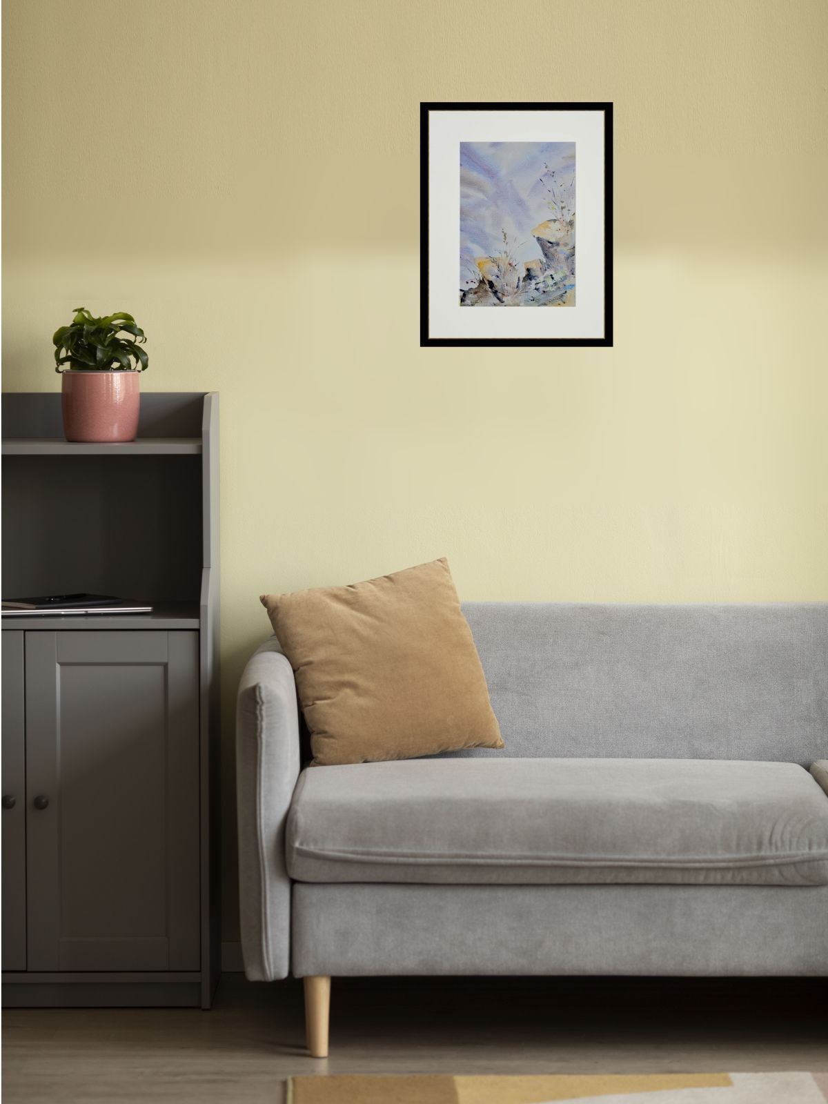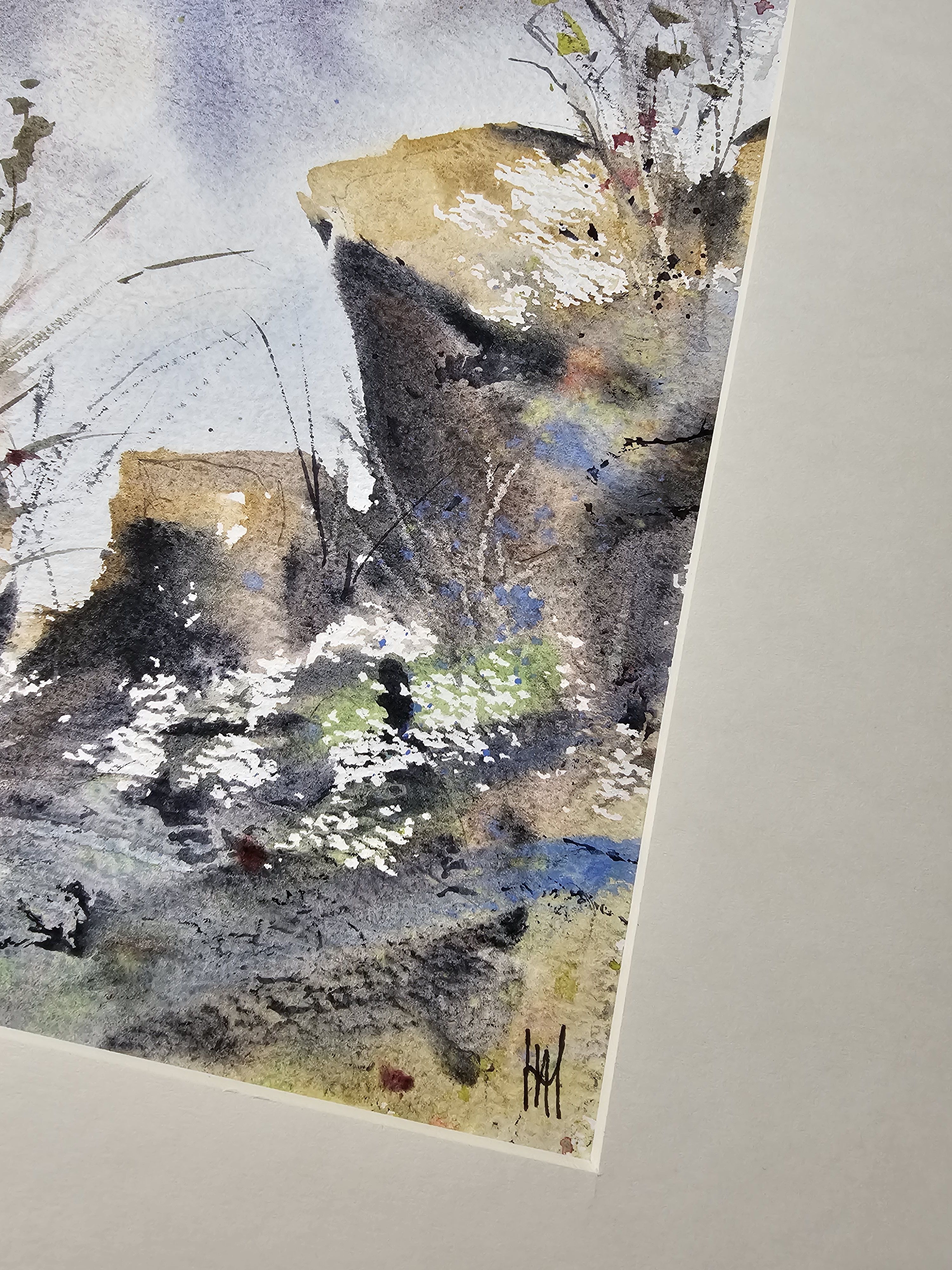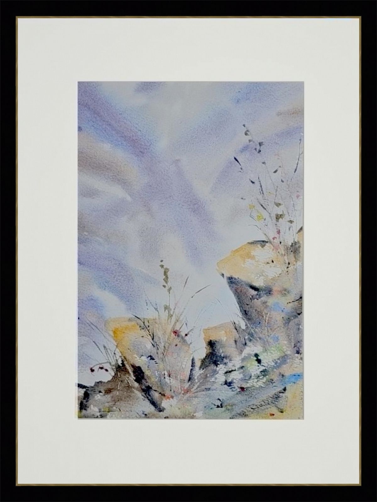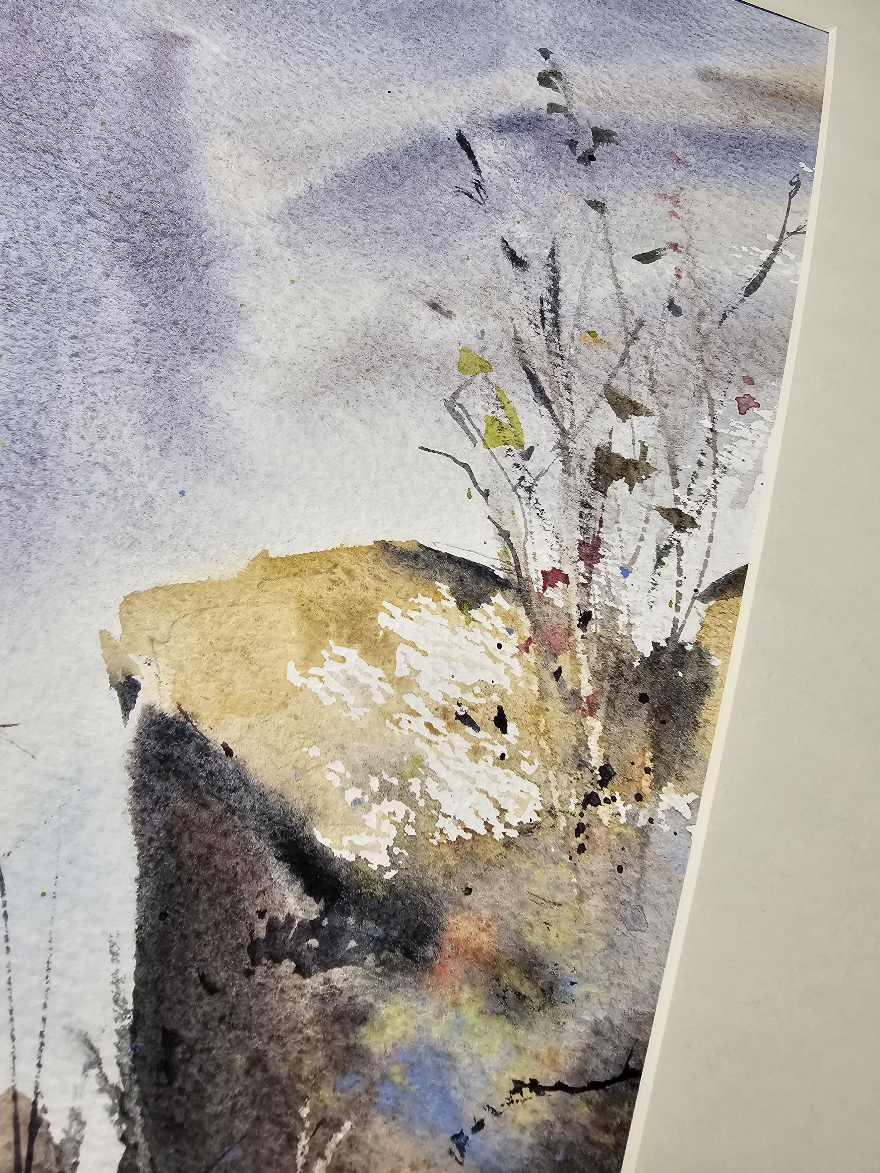 Нам представлена акварельная картина, изображающая пейзаж с элементами природы. В верхней части горный массив в светло-голубом и фиолетовом тумане с лёгкими облаками. На переднем плане изображены камни и растения. Растения выглядят как тонкие стебли с листьями и цветами. Камни имеют жёлтые и серые оттенки с различными текстурами и деталями. Композиция создаёт атмосферу легкости и гармонии.