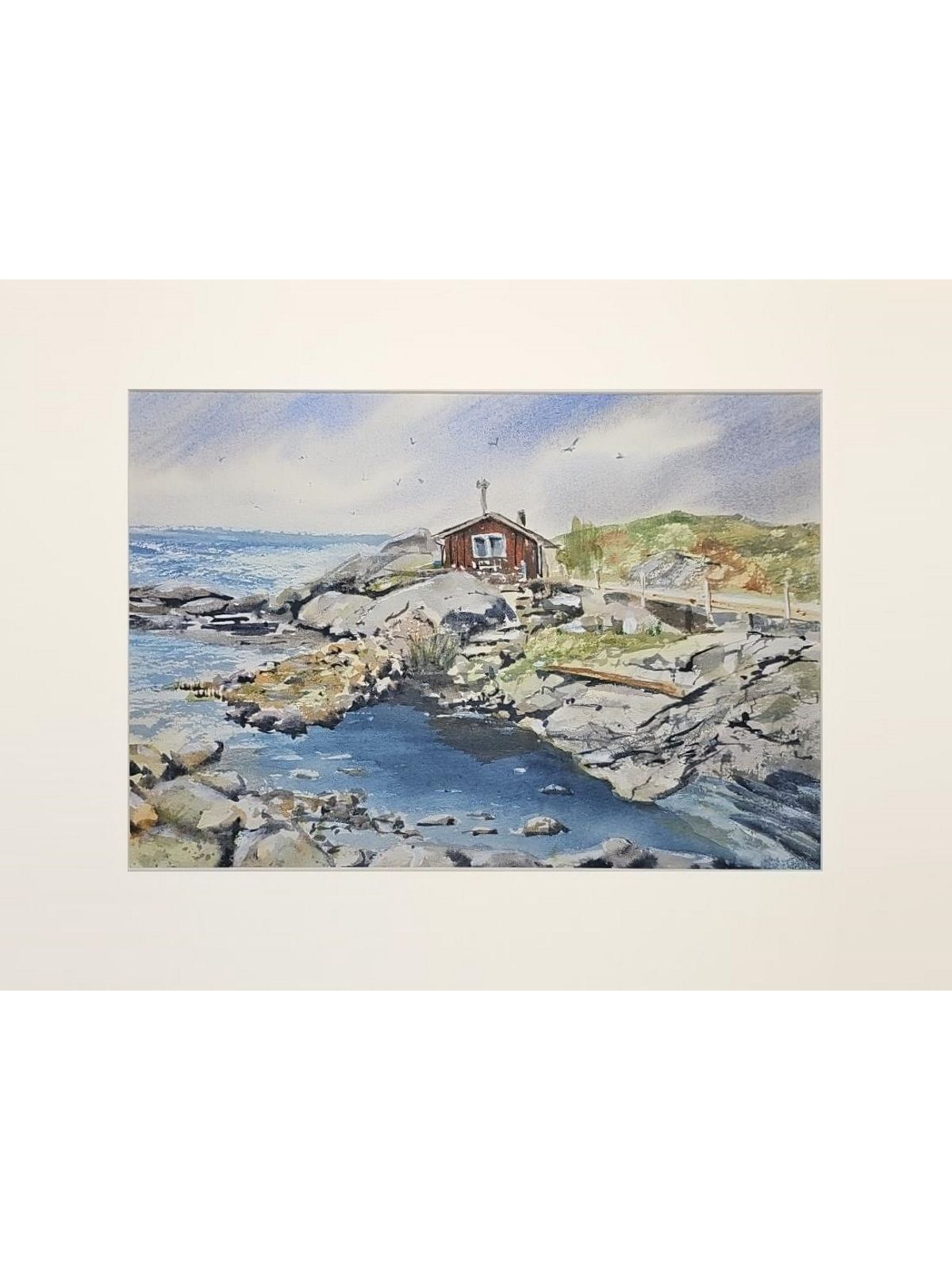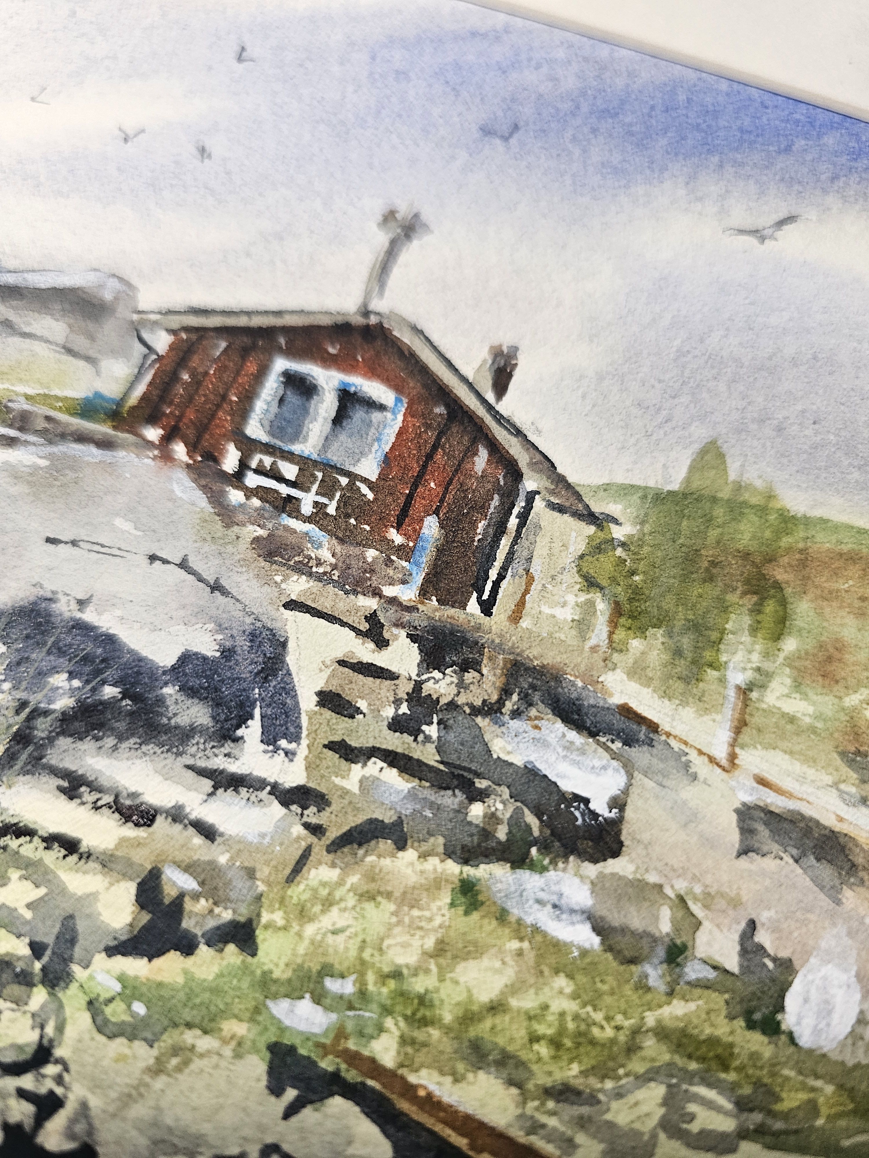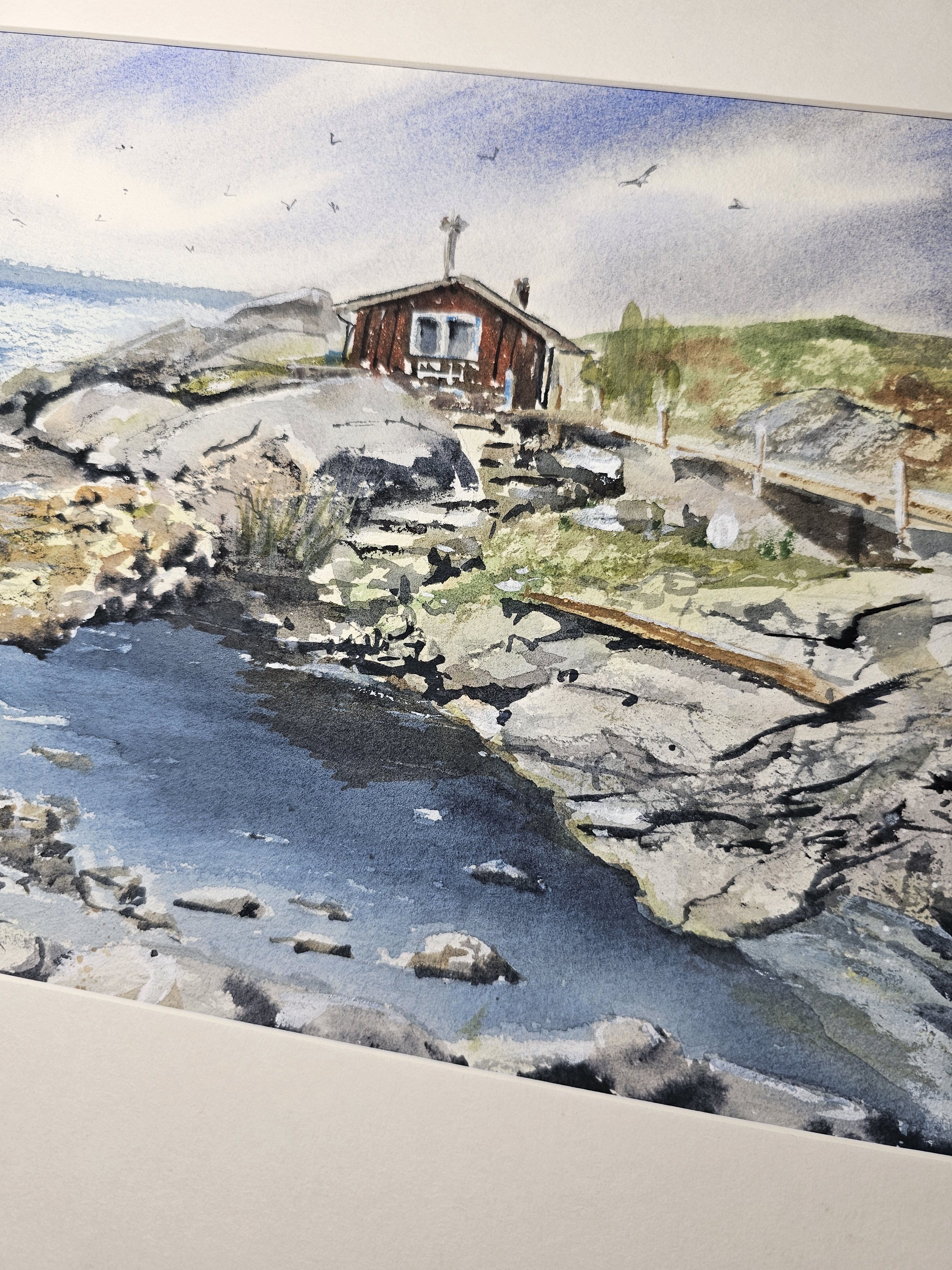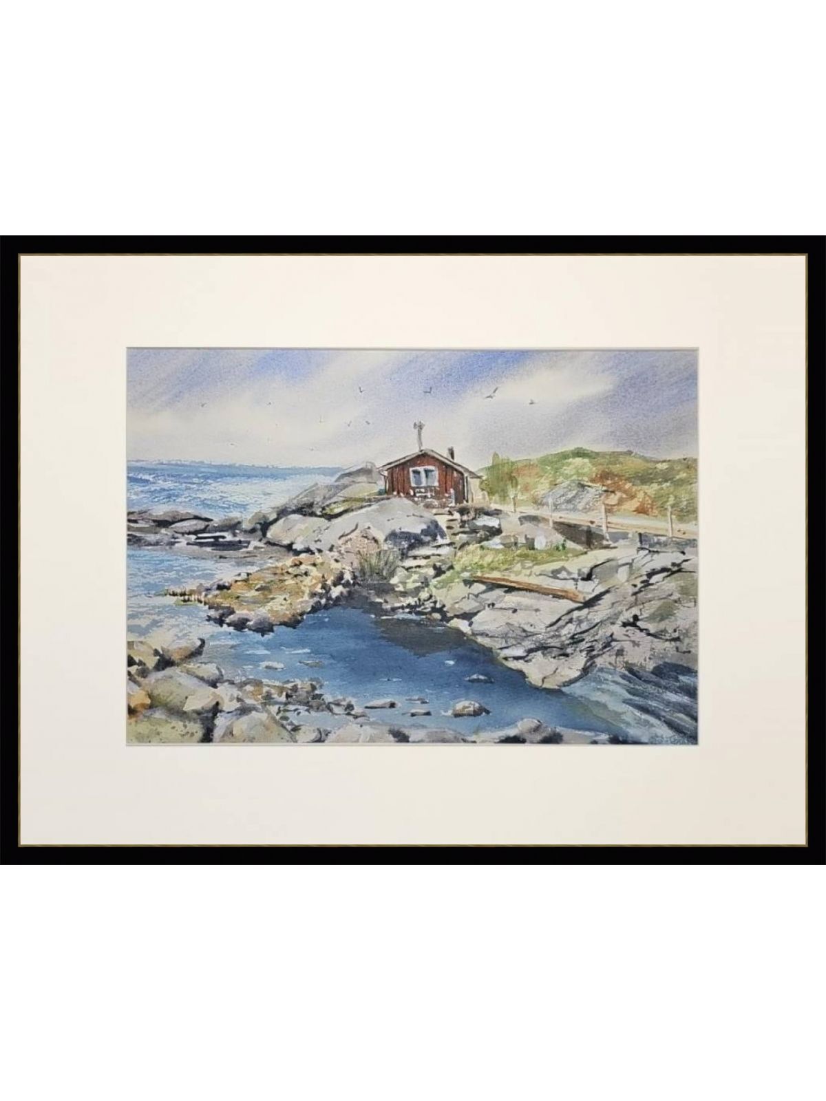 Нам представлена акварельная картина с пейзажем. На переднем плане изображены скалистые берега острова. В центре картины находится деревянный домик на возвышении в котором проживала финская писательница Туве Янссон. Вдали видено большое водное пространство, а небо покрыто облаками. Картина выполнена в нежных и приглушенных тонах, создавая спокойное и гармоничное настроение.