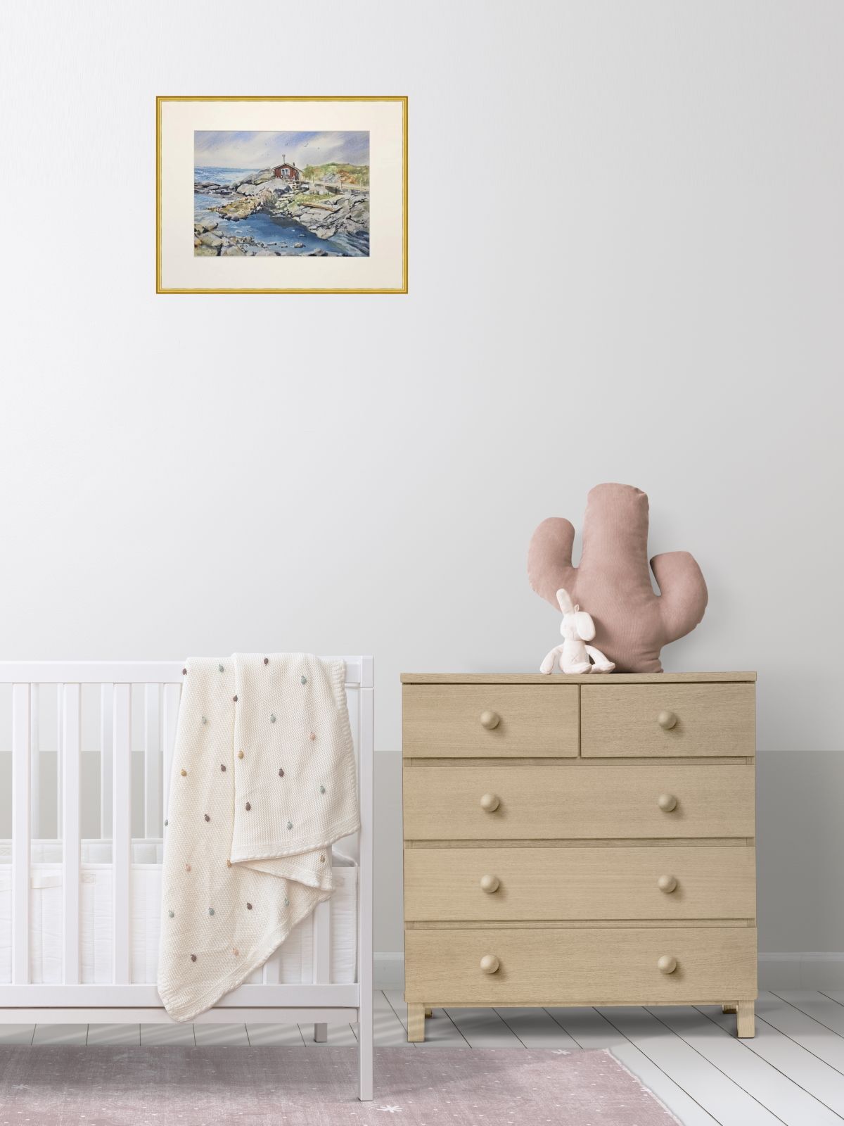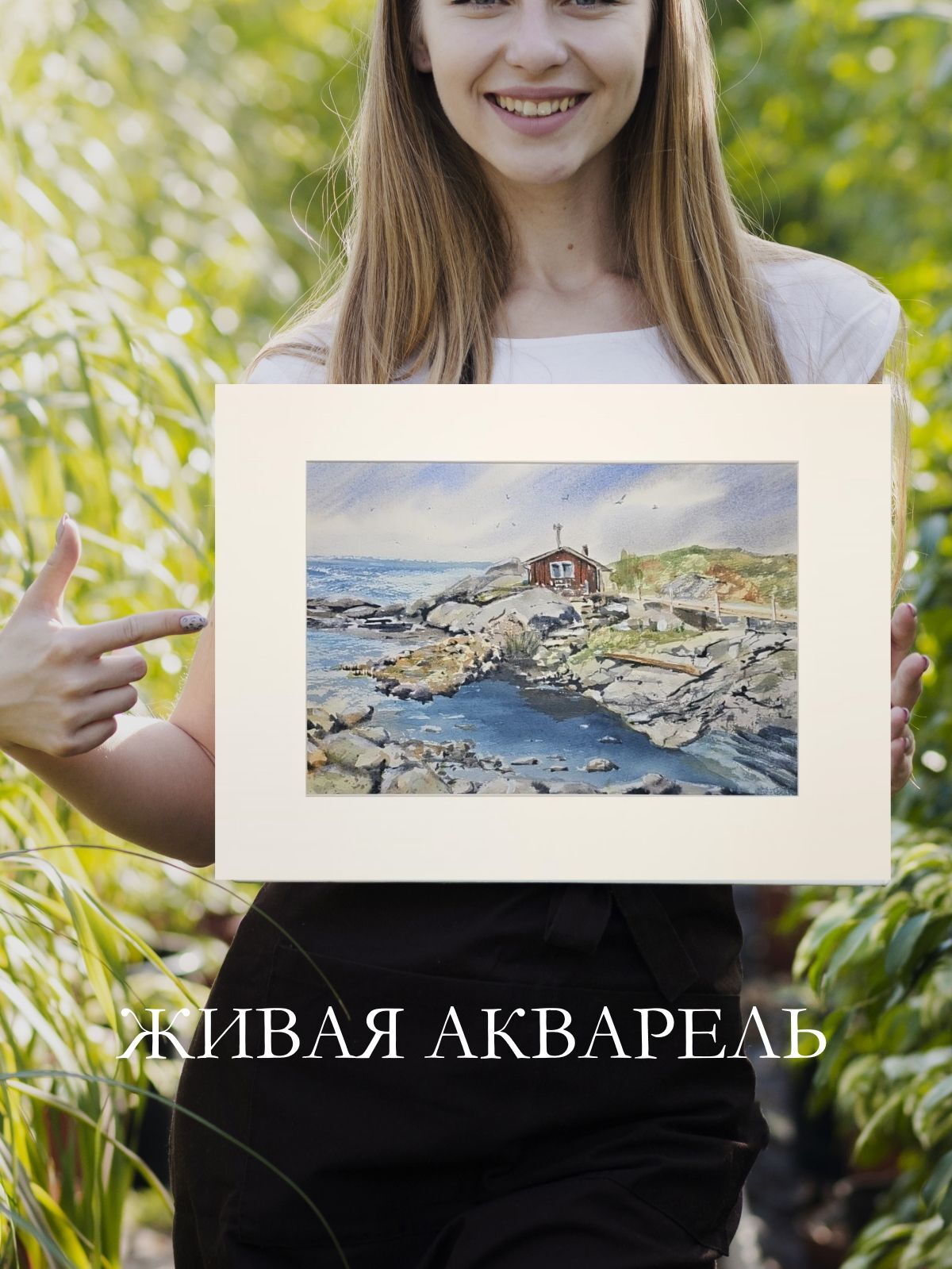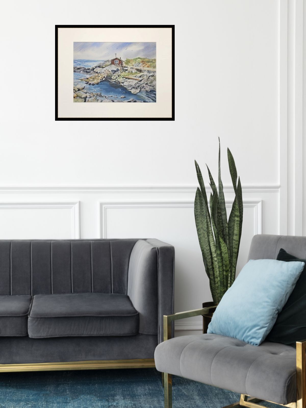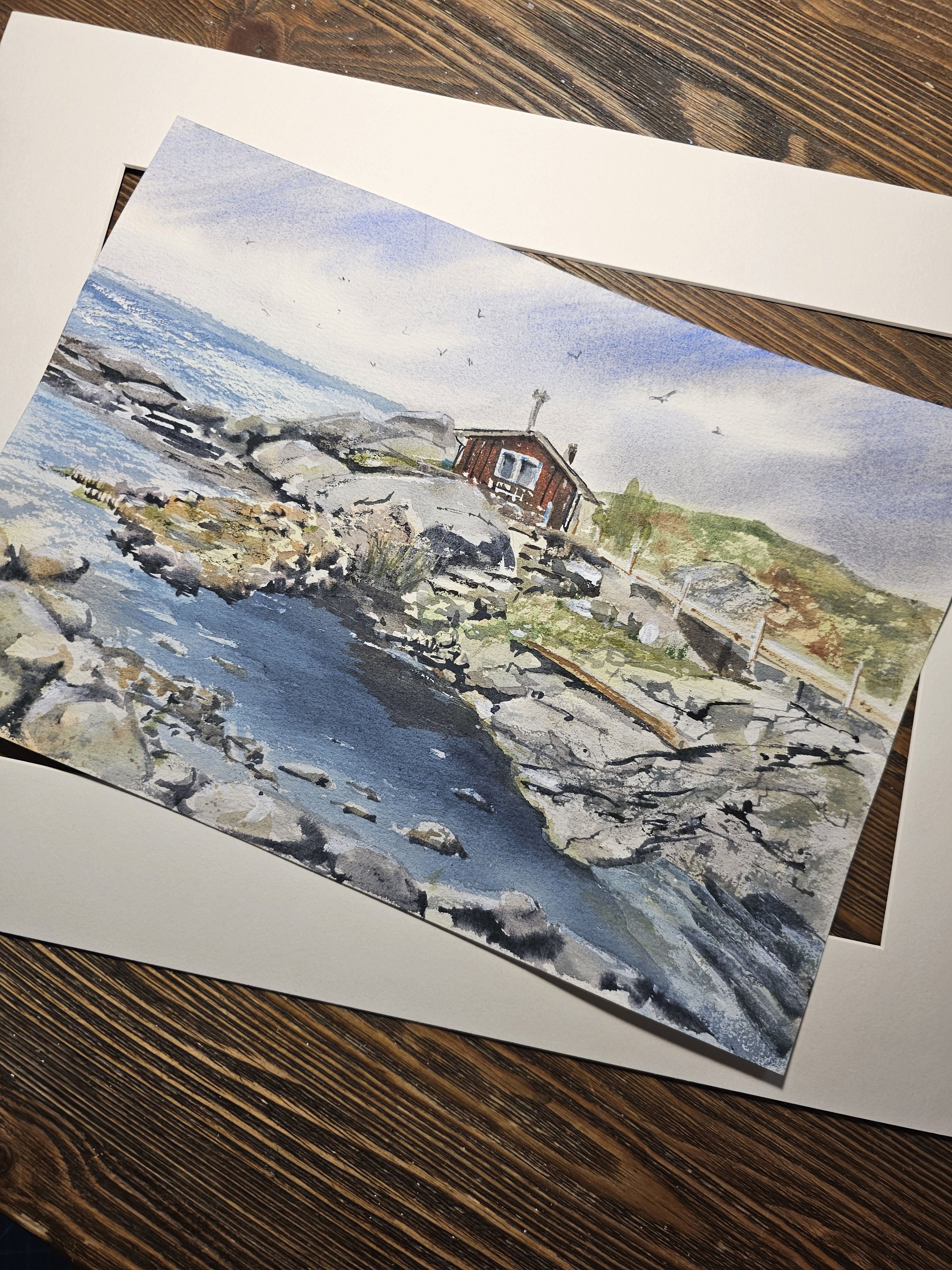 Нам представлена акварельная картина с пейзажем. На переднем плане изображены скалистые берега острова. В центре картины находится деревянный домик на возвышении в котором проживала финская писательница Туве Янссон. Вдали видено большое водное пространство, а небо покрыто облаками. Картина выполнена в нежных и приглушенных тонах, создавая спокойное и гармоничное настроение.
