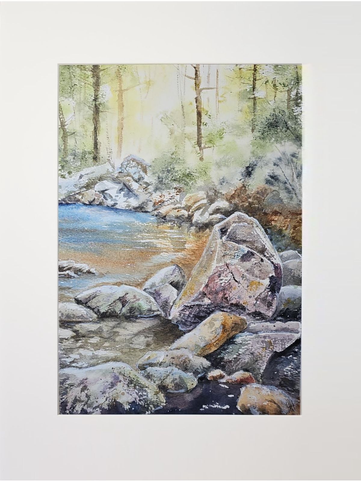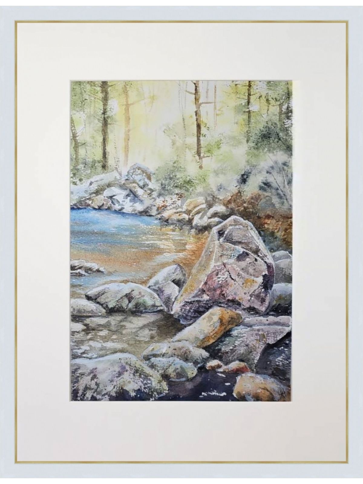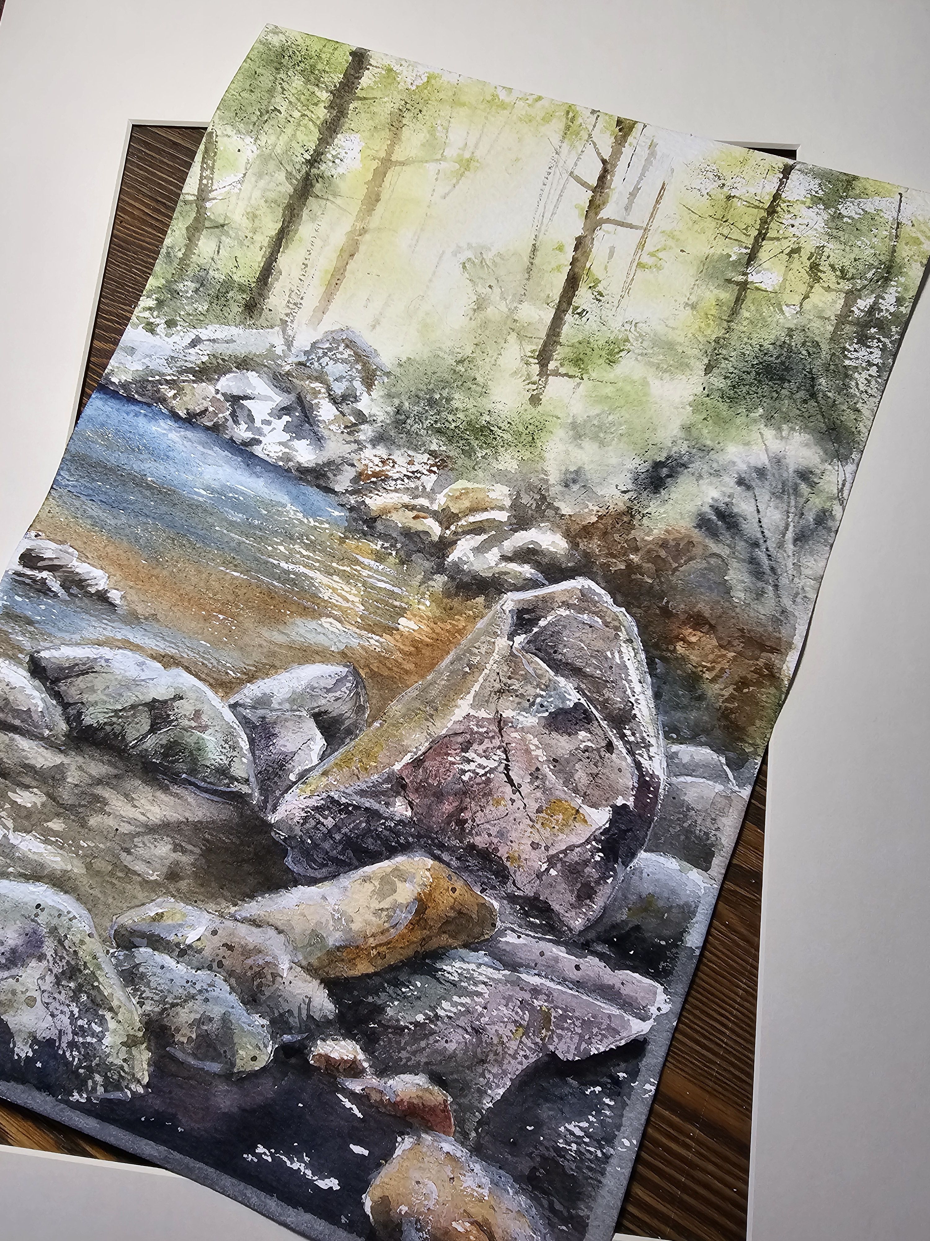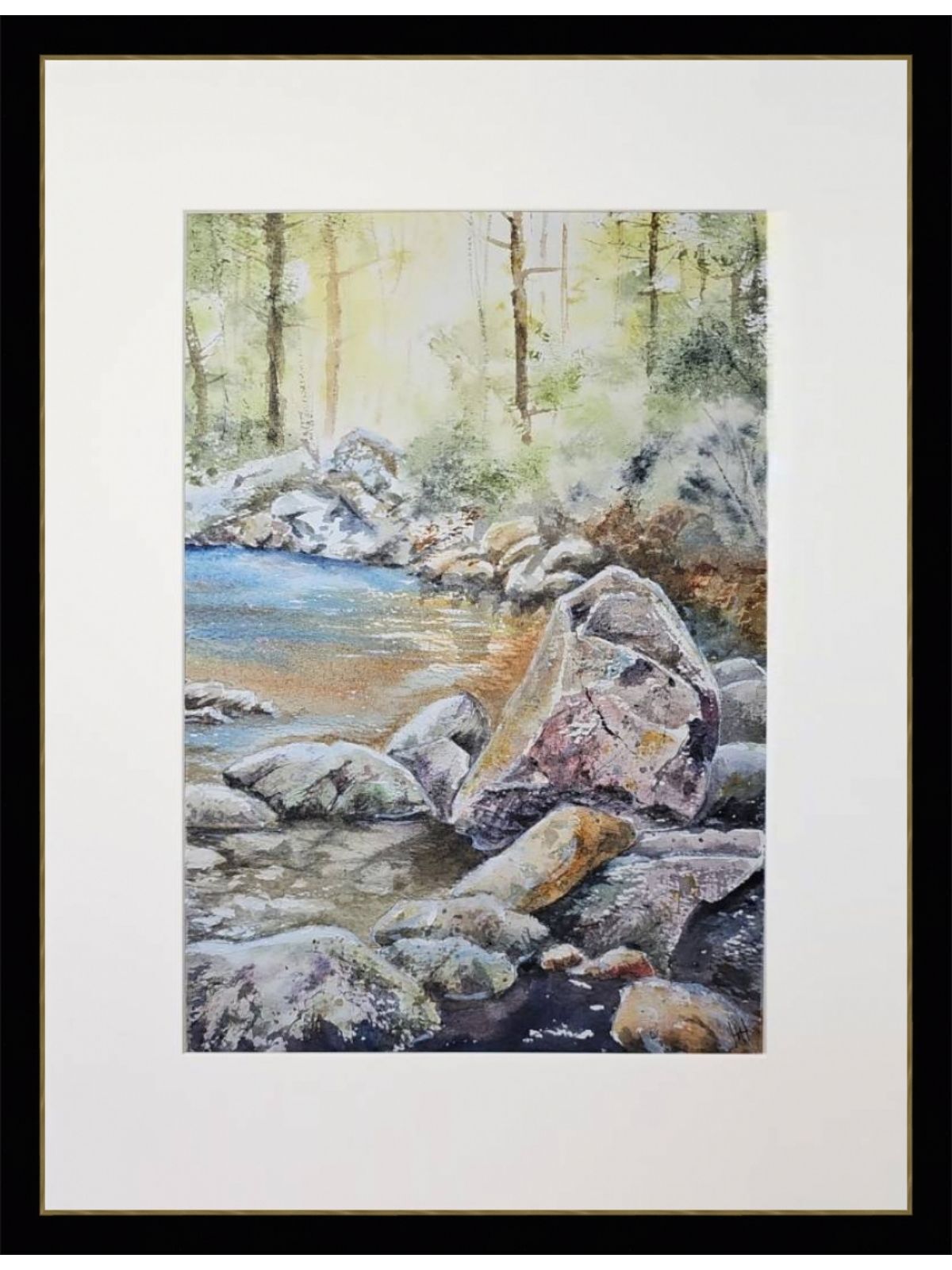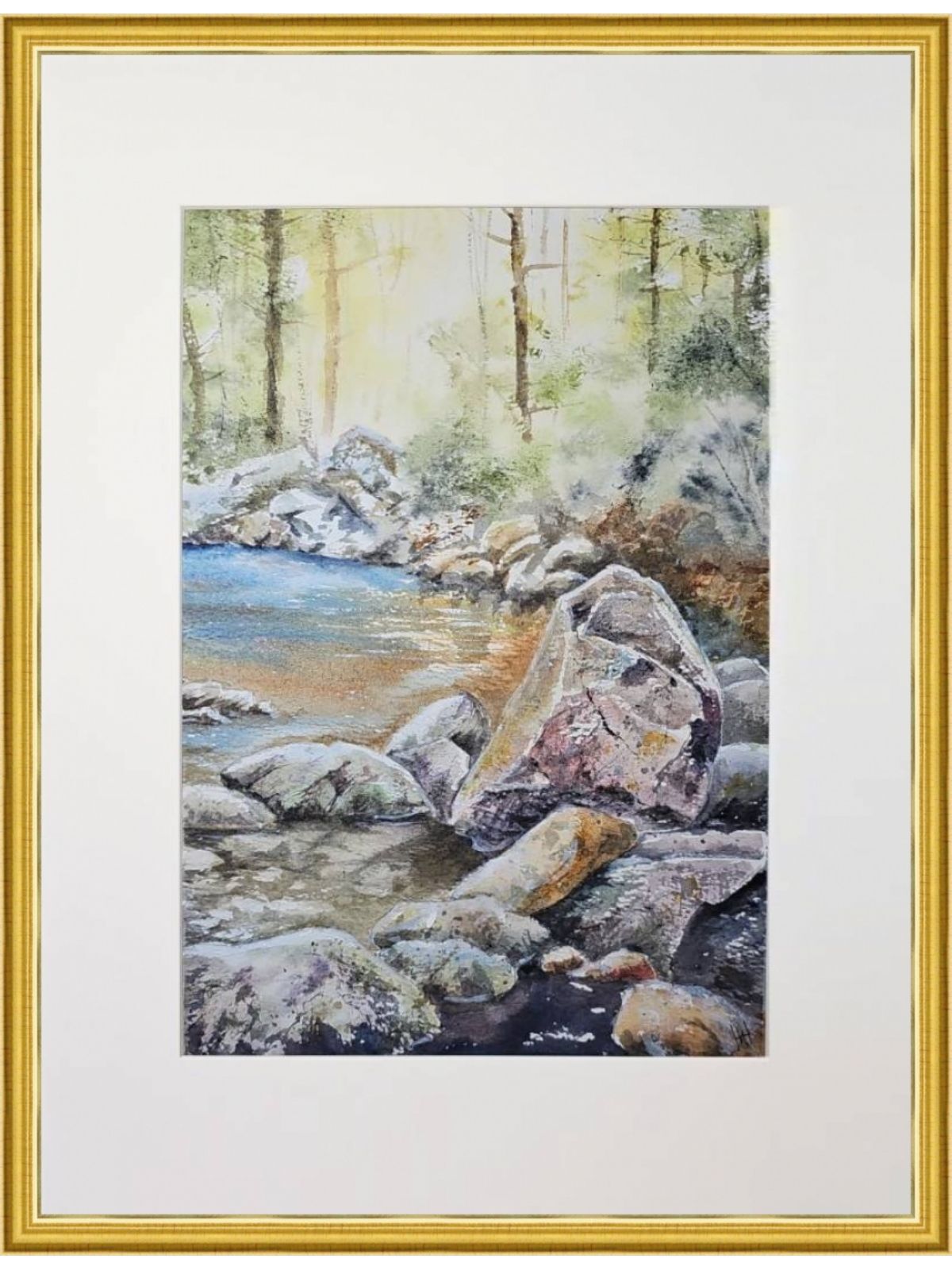 Нам представлена акварельная картина, изображающая лесной пейзаж. На переднем плане видны камни, расположенные у кромки воды. Река или ручей протекает через эту местность, создавая спокойную и умиротворяющую атмосферу. Вода отражает свет, что придаёт изображению ощущение движения. На заднем плане находятся деревья с зелёной листвой, сквозь которые пробивается мягкий свет. Картина выполнена в светлых и пастельных тонах, создавая ощущение свежести и прохлады.
