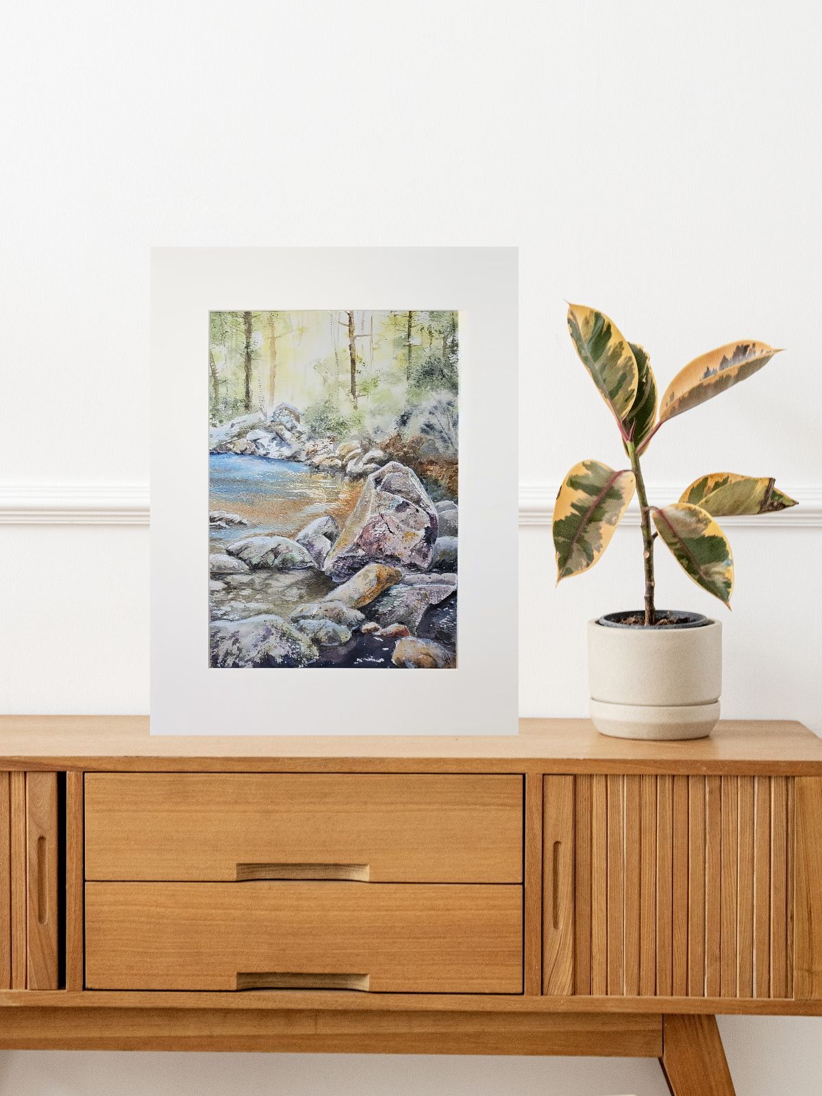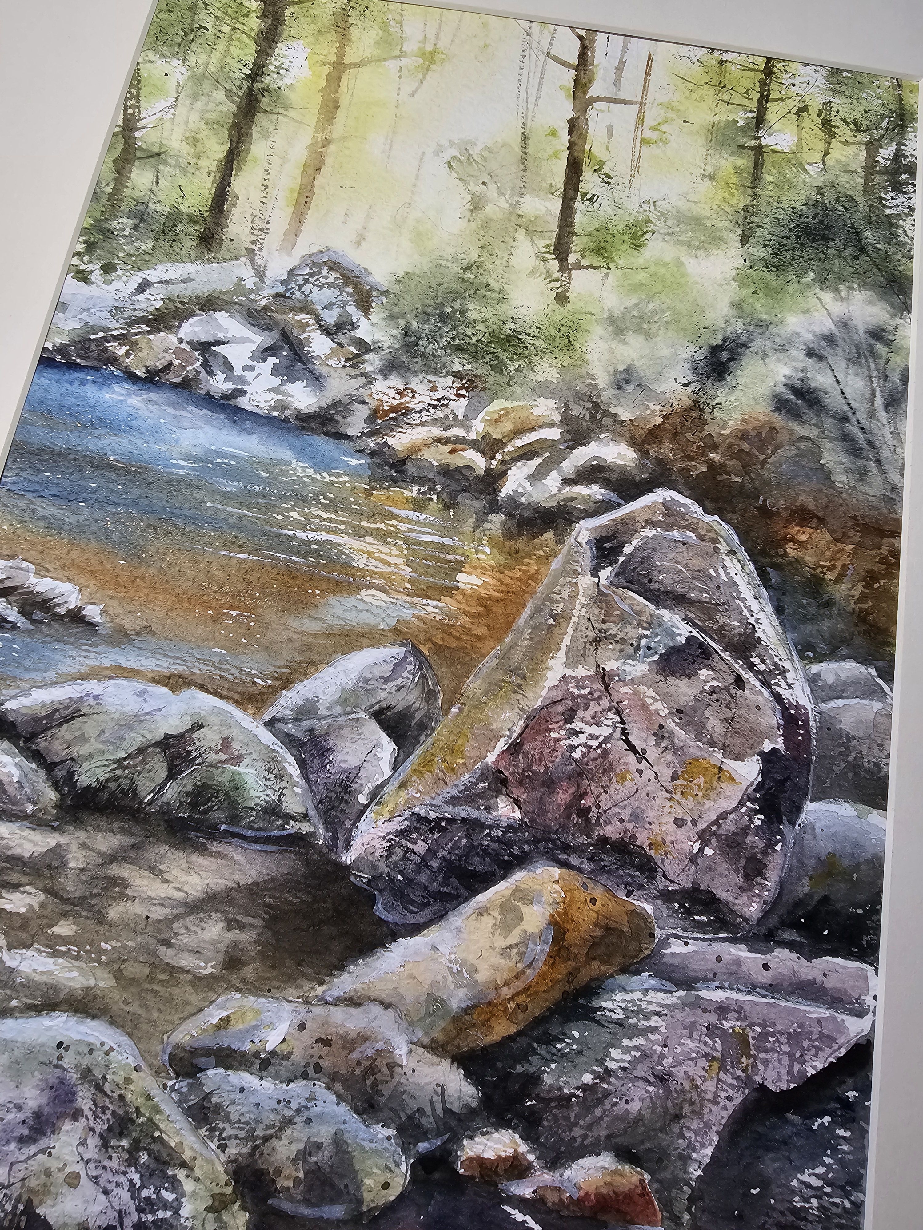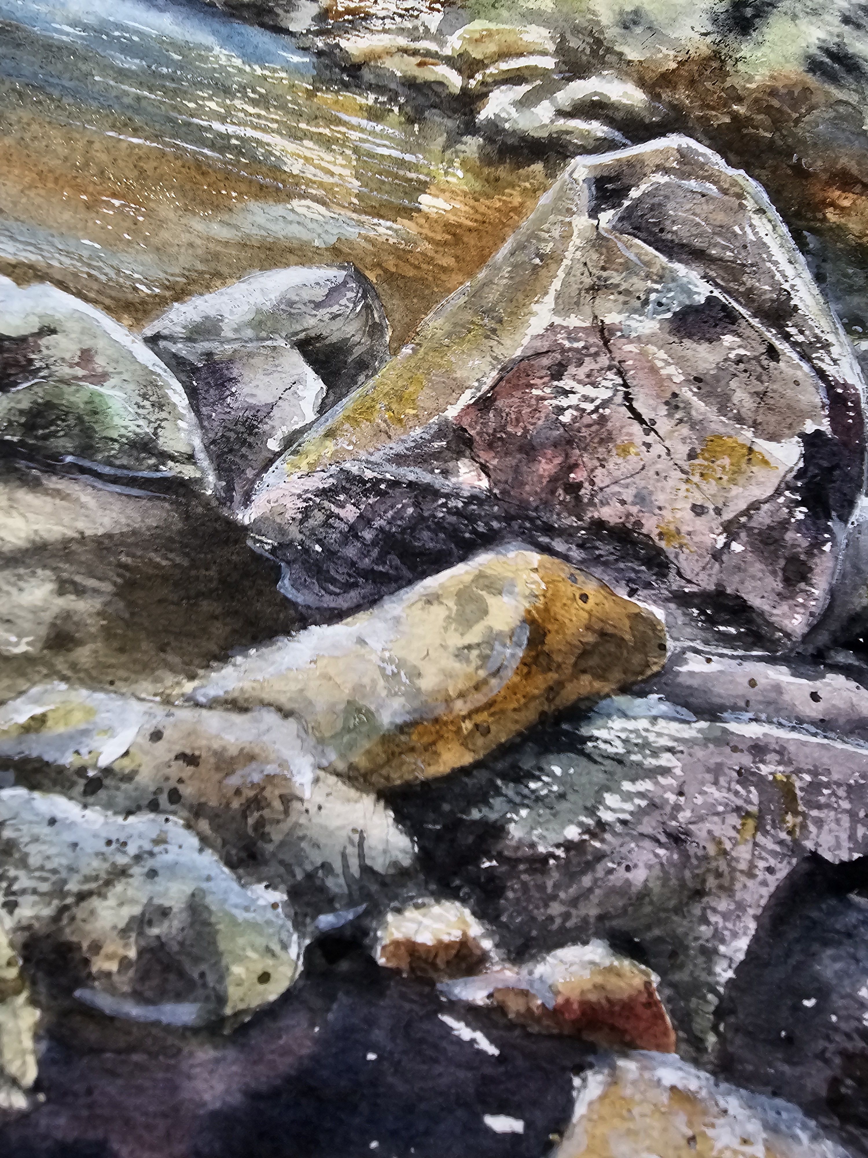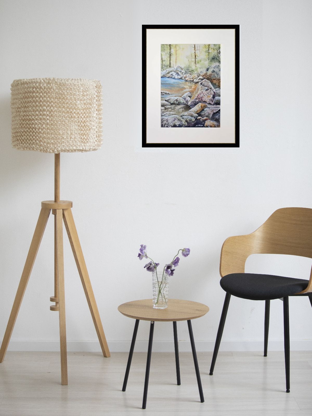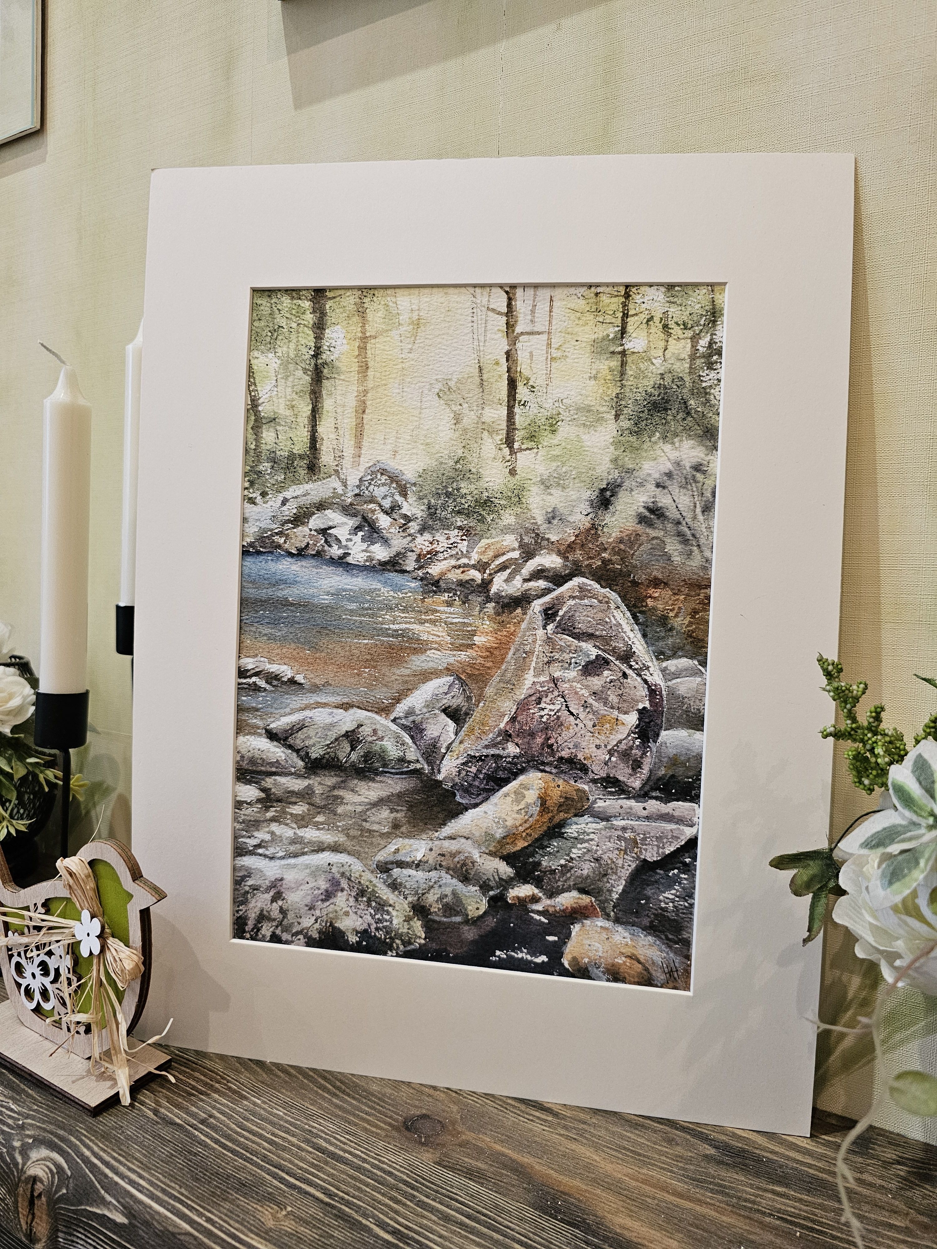 Нам представлена акварельная картина, изображающая лесной пейзаж. На переднем плане видны камни, расположенные у кромки воды. Река или ручей протекает через эту местность, создавая спокойную и умиротворяющую атмосферу. Вода отражает свет, что придаёт изображению ощущение движения. На заднем плане находятся деревья с зелёной листвой, сквозь которые пробивается мягкий свет. Картина выполнена в светлых и пастельных тонах, создавая ощущение свежести и прохлады.