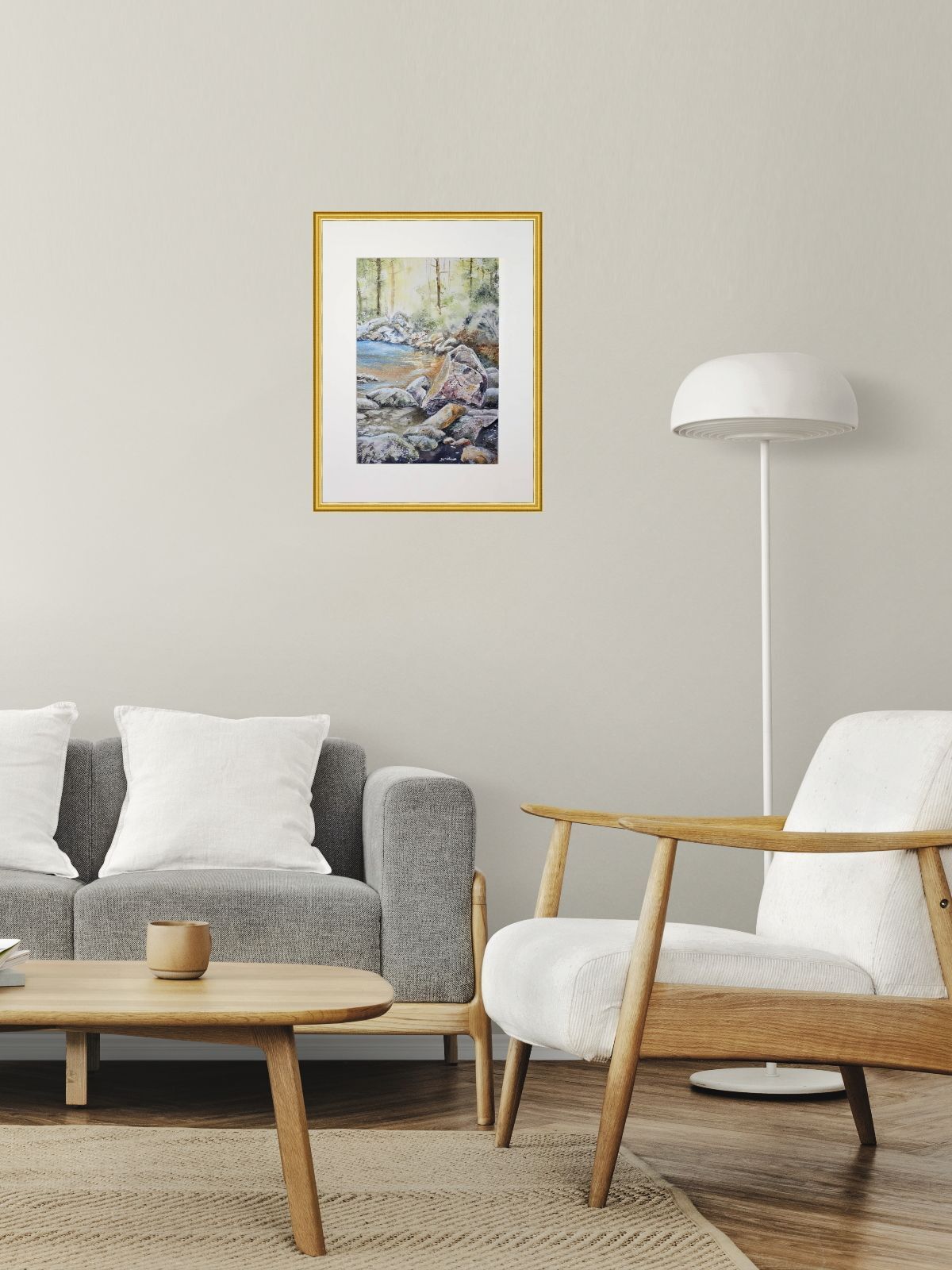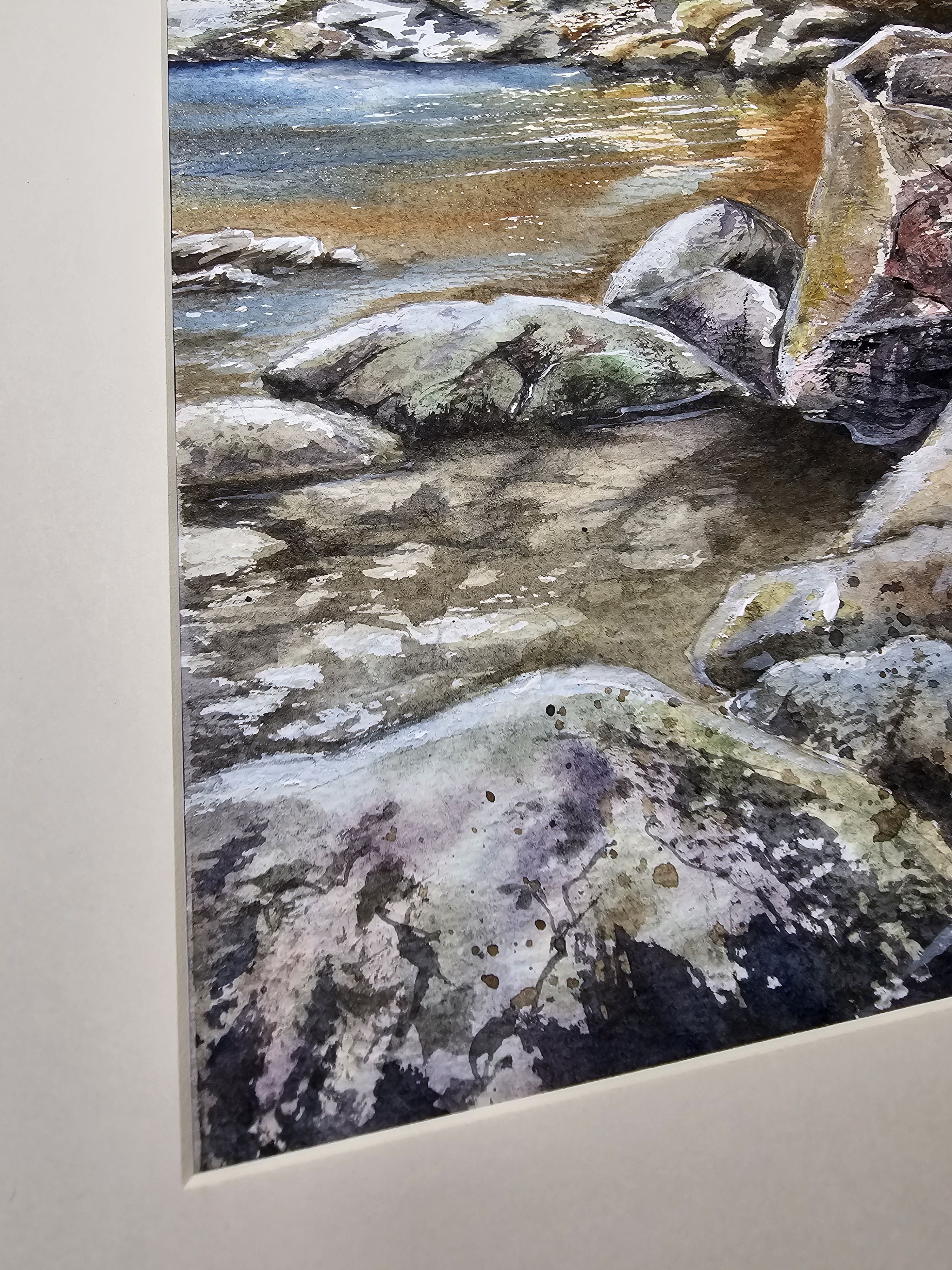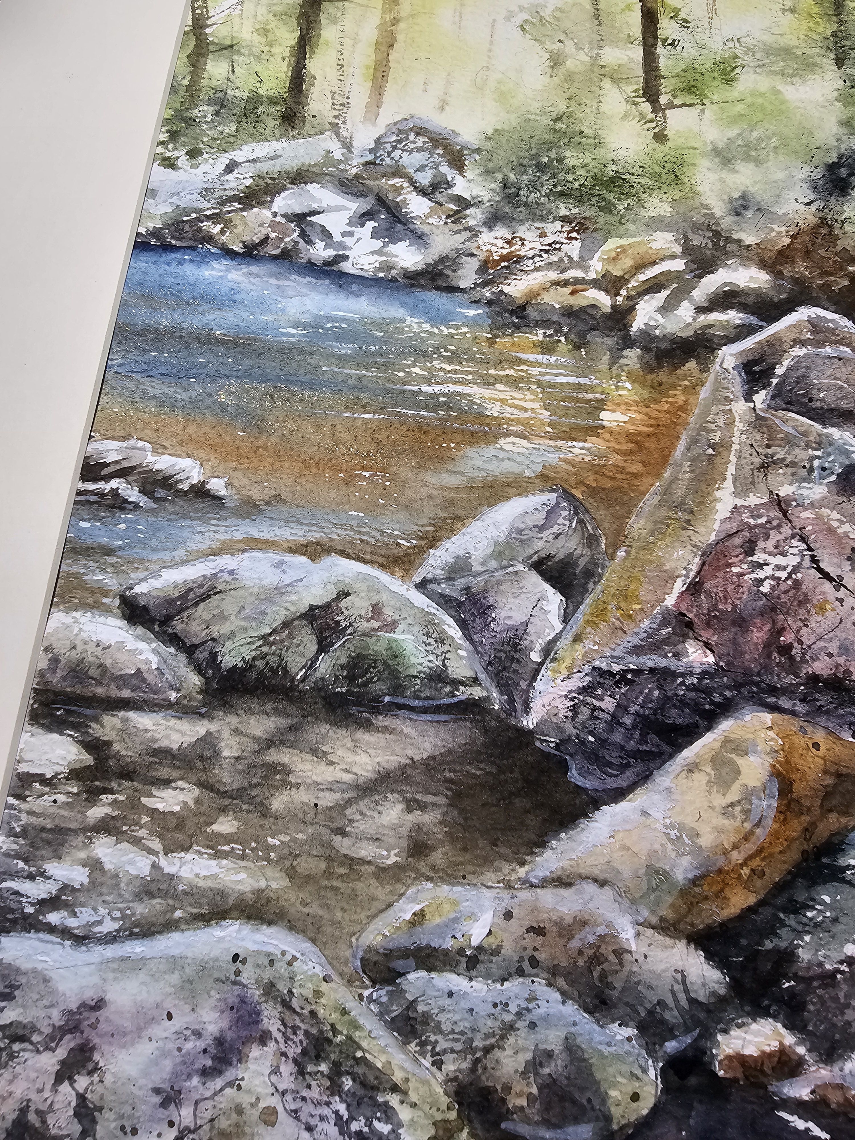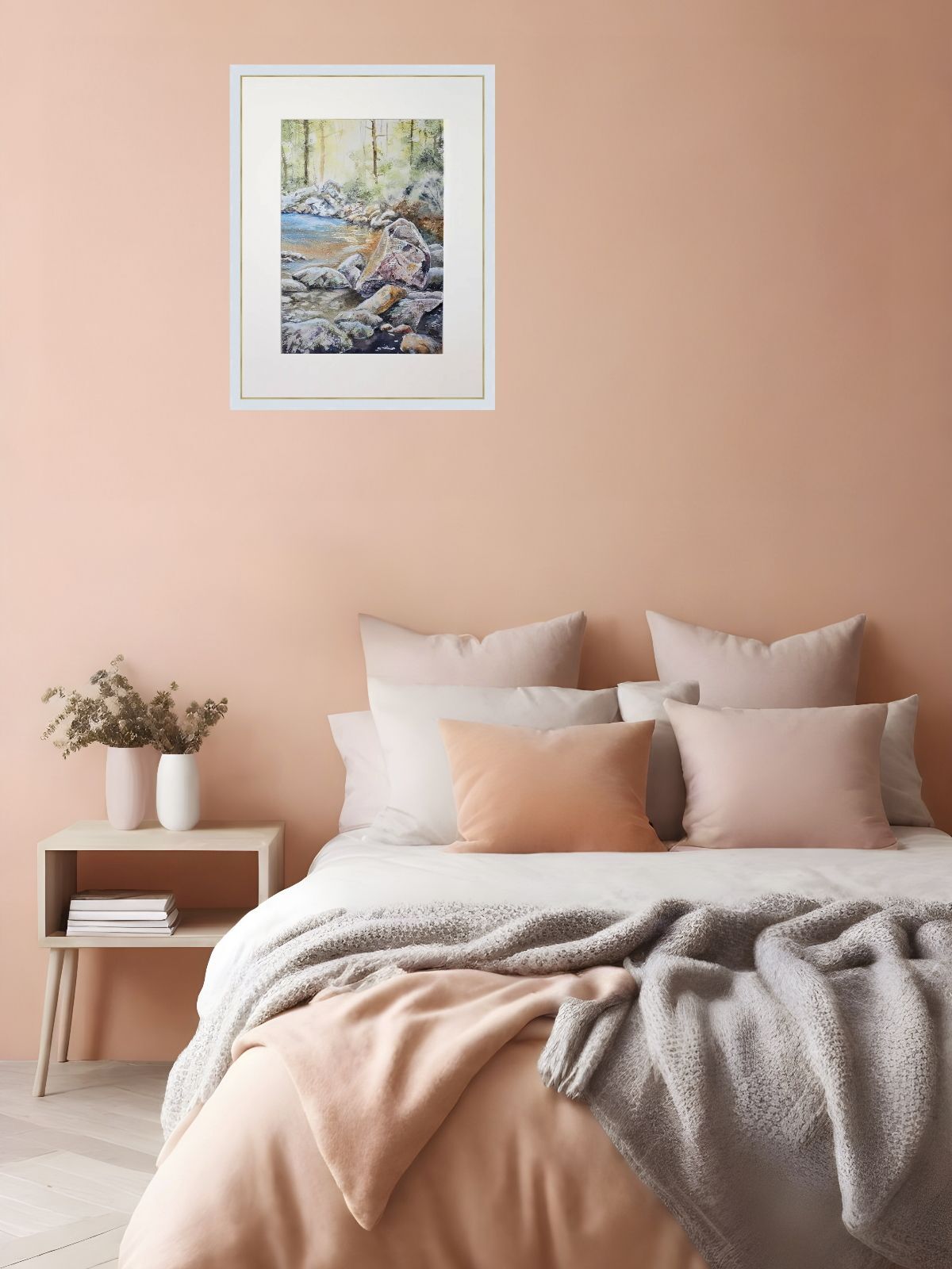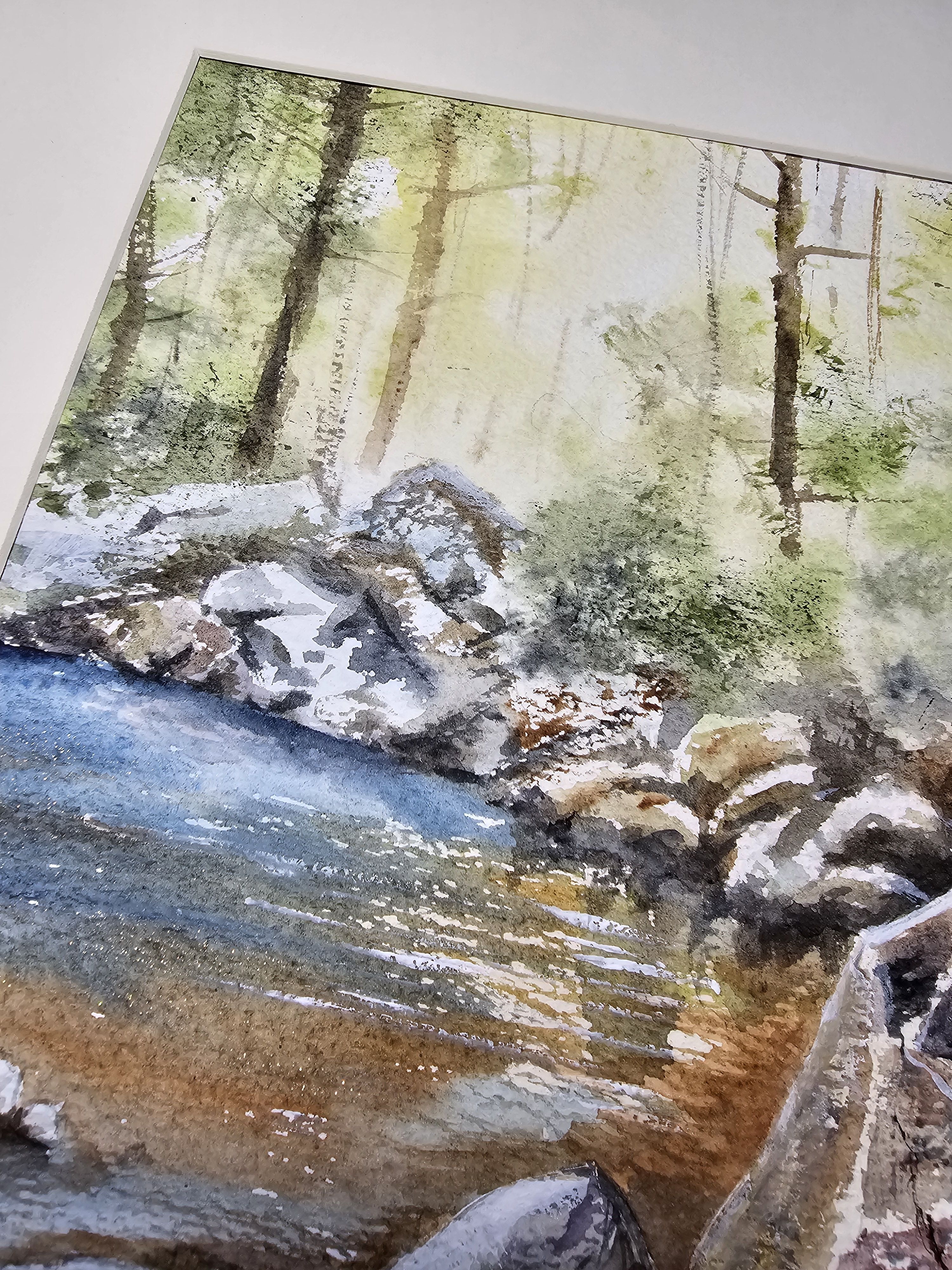Нам представлена акварельная картина, изображающая лесной пейзаж. На переднем плане видны камни, расположенные у кромки воды. Река или ручей протекает через эту местность, создавая спокойную и умиротворяющую атмосферу. Вода отражает свет, что придаёт изображению ощущение движения. На заднем плане находятся деревья с зелёной листвой, сквозь которые пробивается мягкий свет. Картина выполнена в светлых и пастельных тонах, создавая ощущение свежести и прохлады.