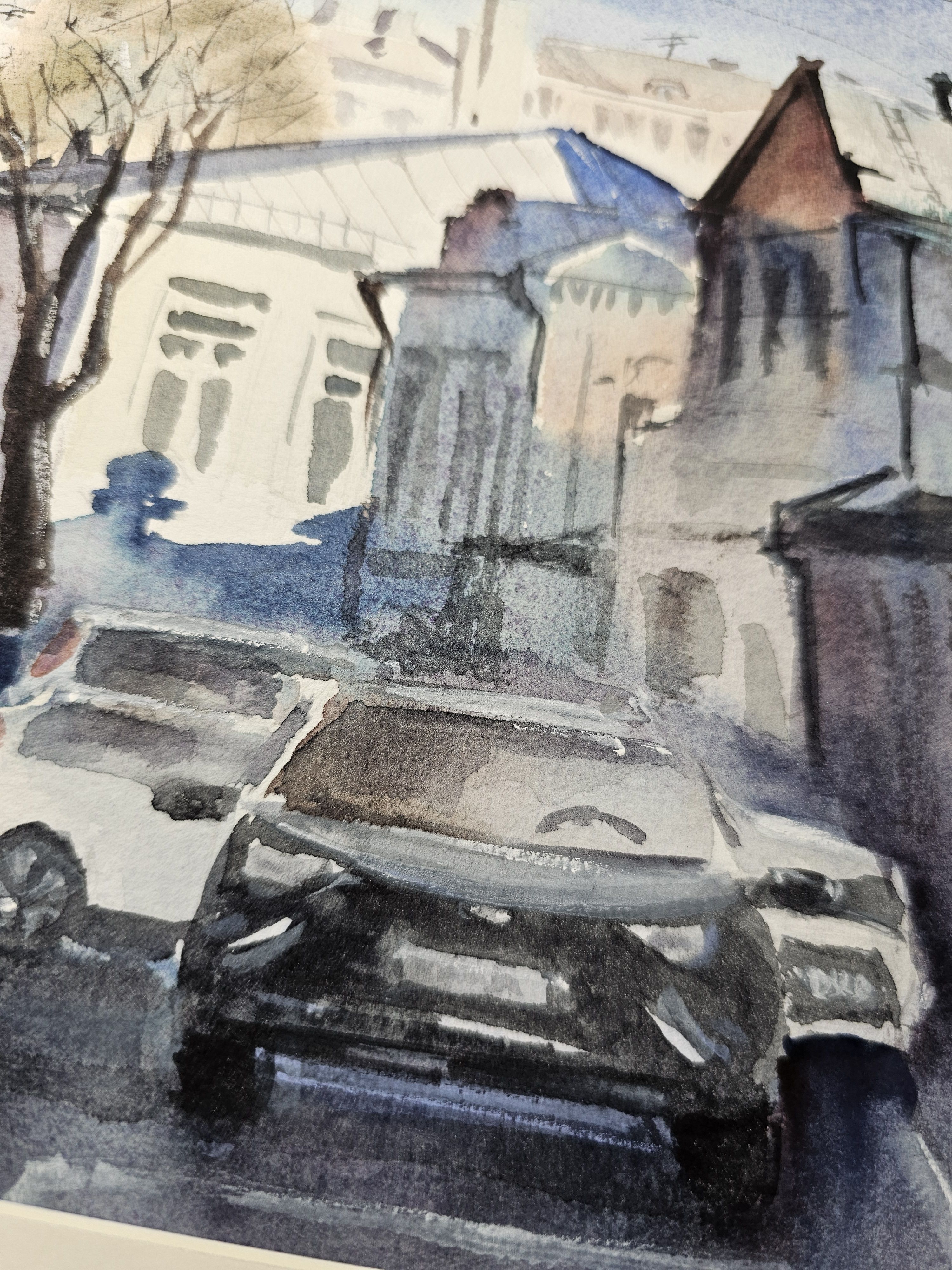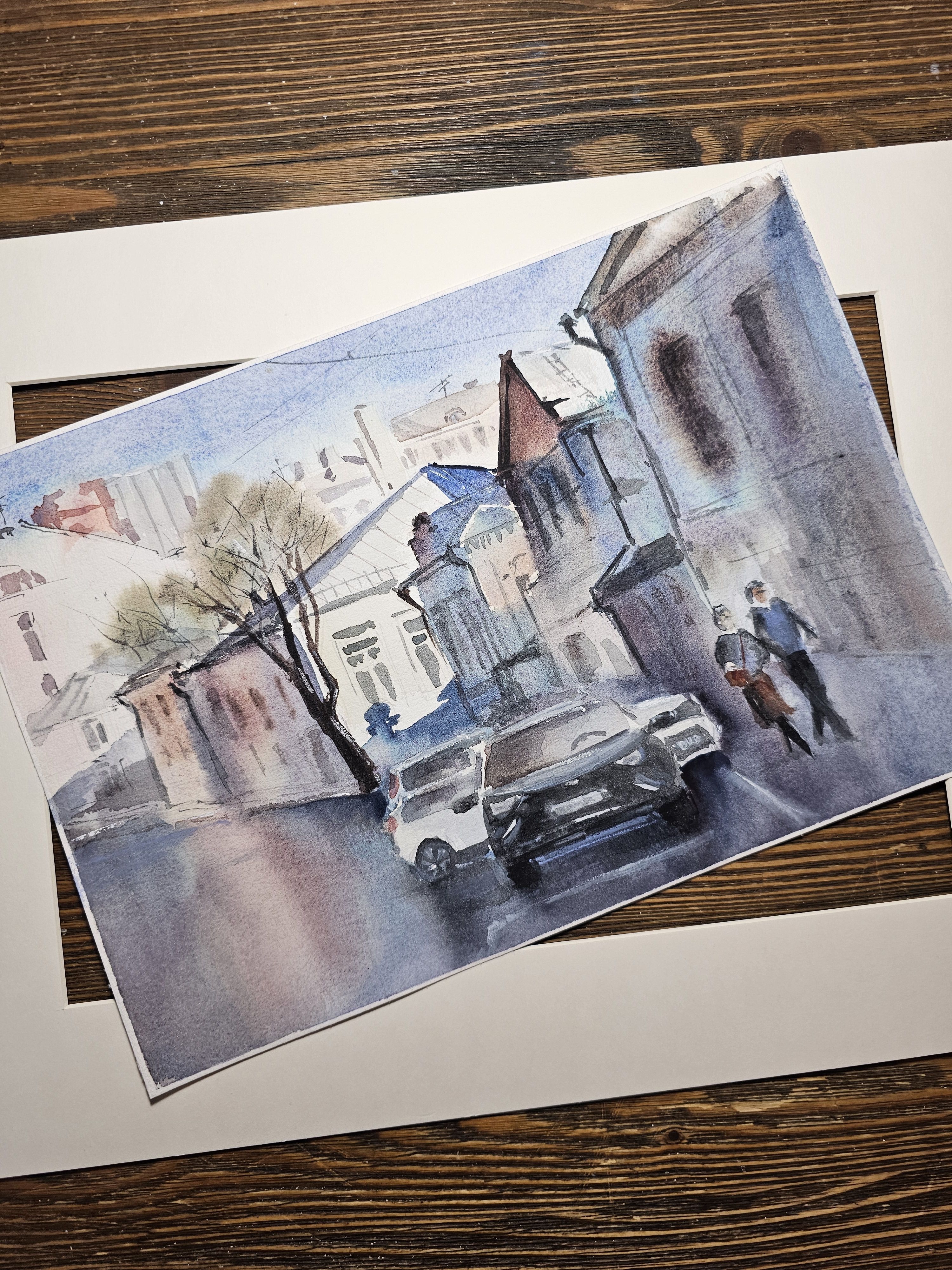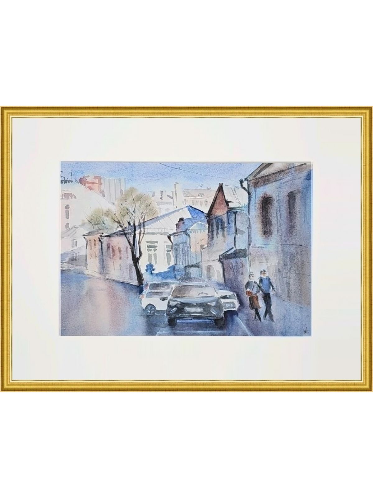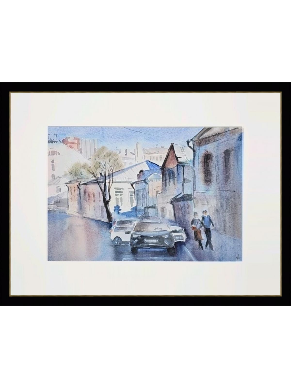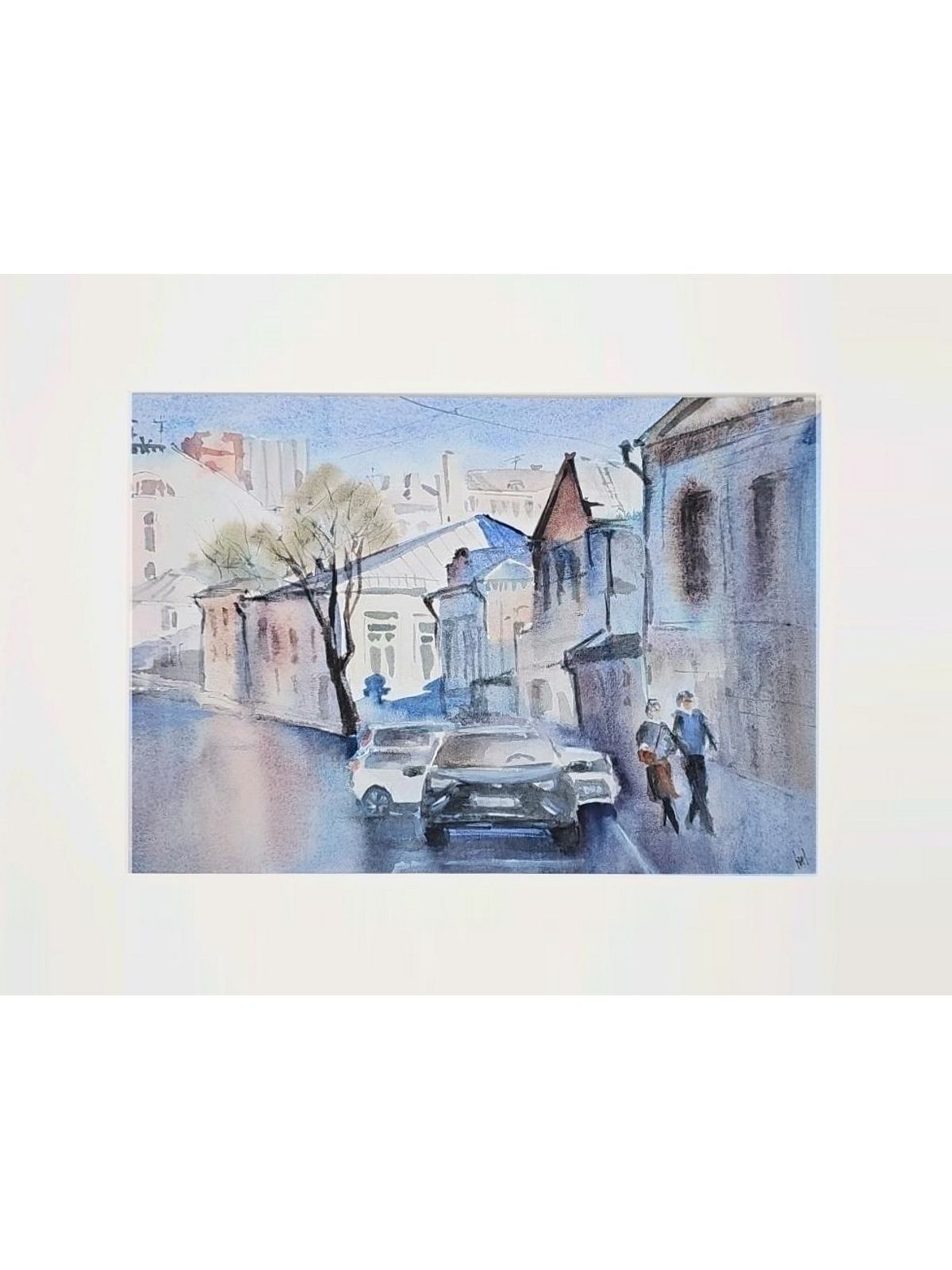 Нам представлен городской пейзаж, выполненный в акварельной технике. В центре композиции находятся улица с домами и припаркованными автомобилями. По обеим сторонам улицы видны здания с элементами архитектуры, характерные для городских построек. Справа идут два человека, вероятно, прохожие. На заднем плане видны деревья с едва распустившейся листвой. Картина выполнена в спокойной цветовой гамме с преобладанием синих и коричневых оттенков, что создаёт ощущение умиротворённости. Работа оформлена в светлое паспарту и готова для размещения в раме стандартного размера.