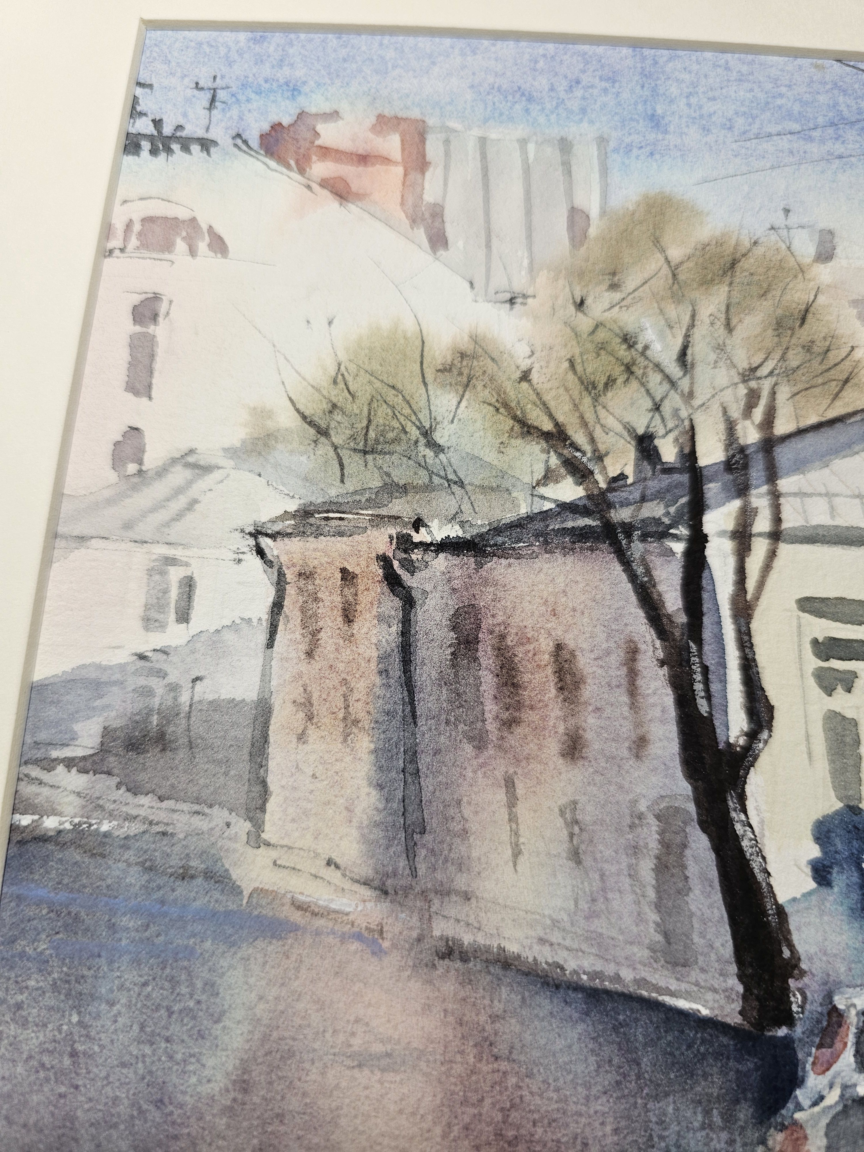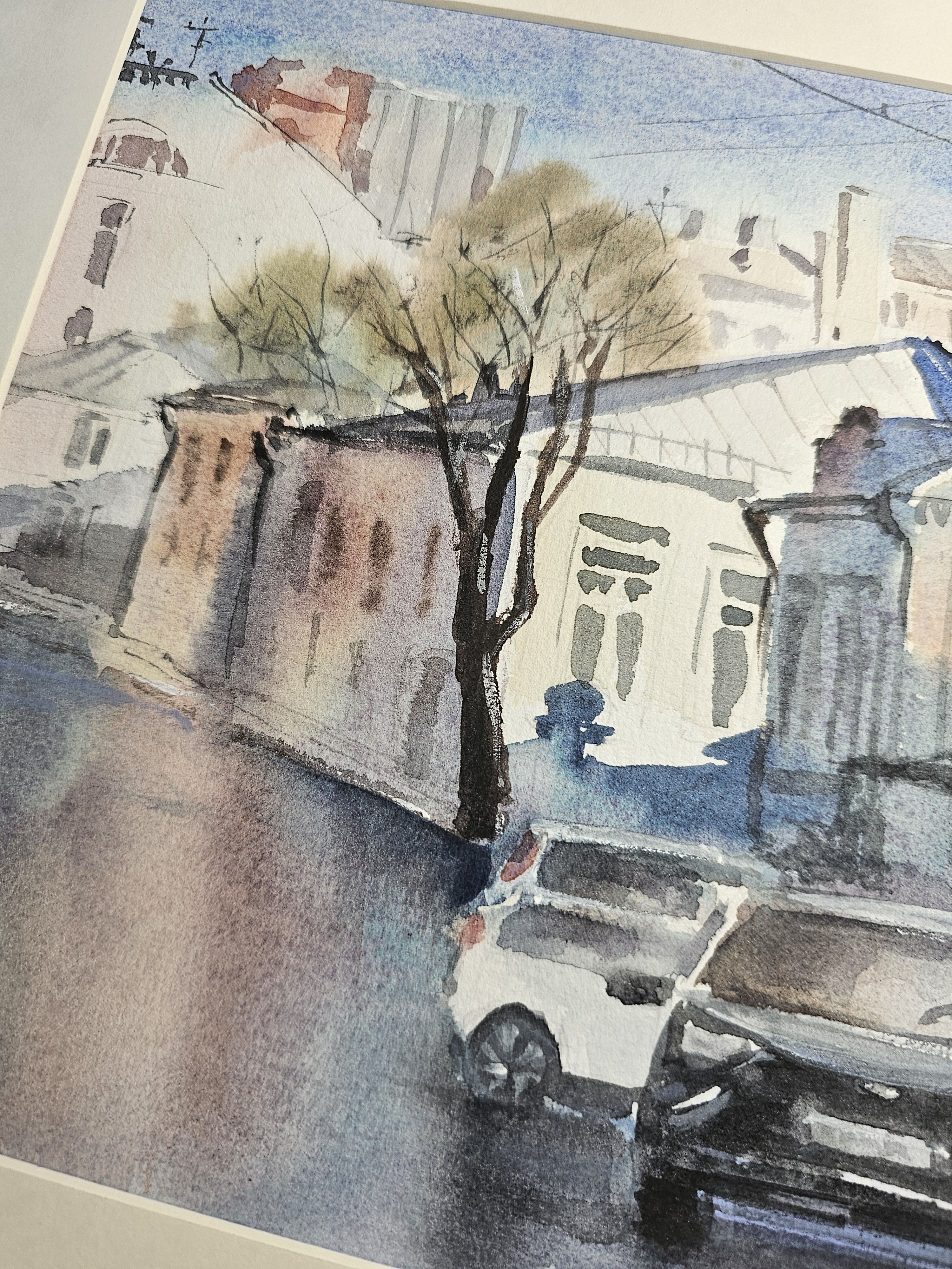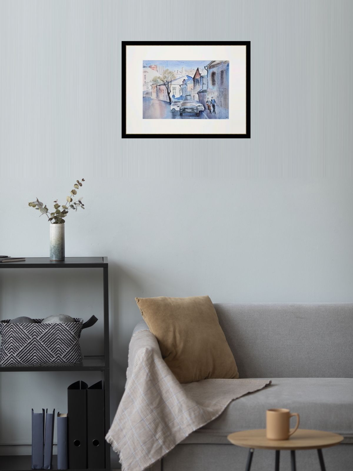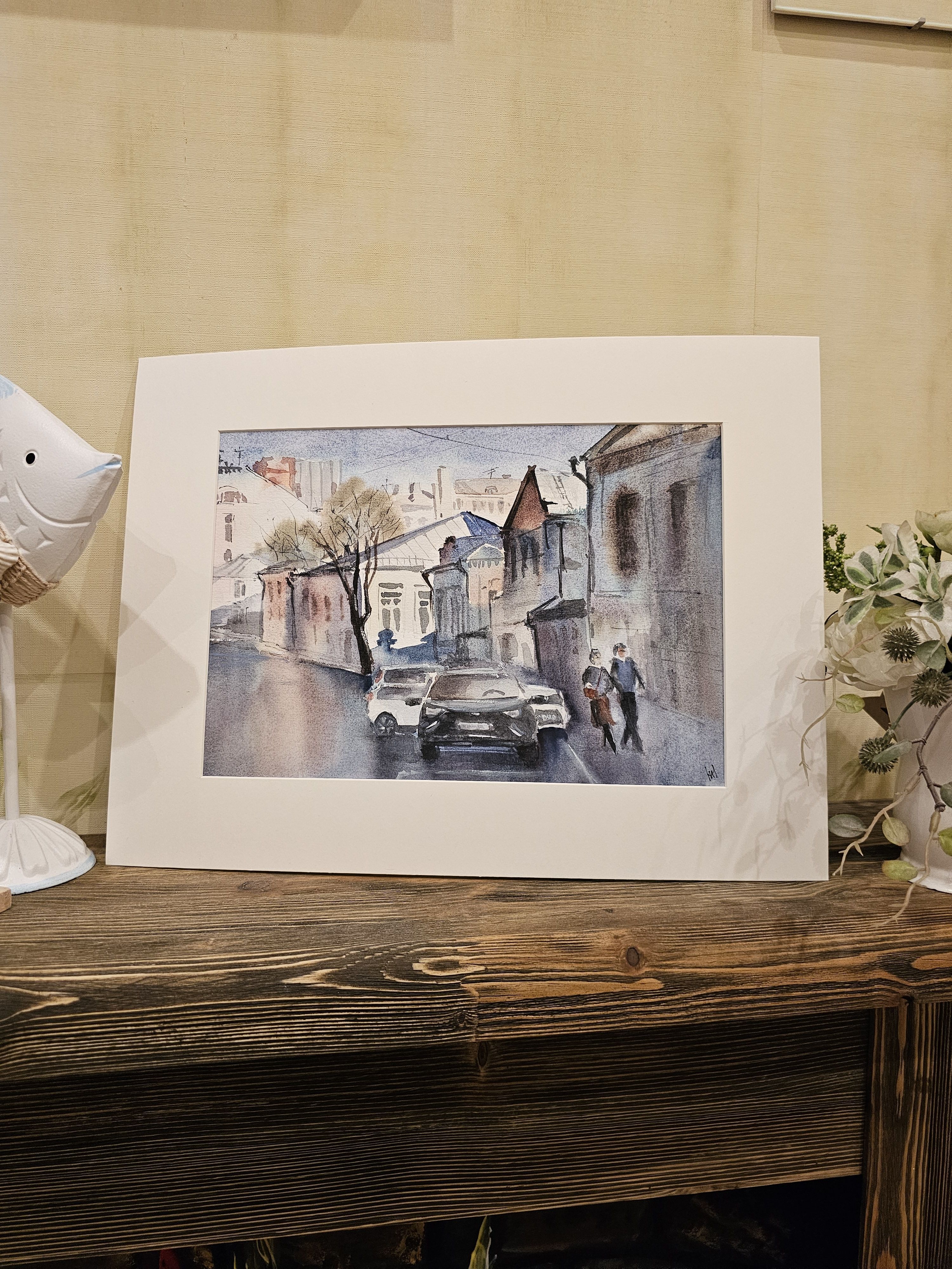 Нам представлен городской пейзаж, выполненный в акварельной технике. В центре композиции находятся улица с домами и припаркованными автомобилями. По обеим сторонам улицы видны здания с элементами архитектуры, характерные для городских построек. Справа идут два человека, вероятно, прохожие. На заднем плане видны деревья с едва распустившейся листвой. Картина выполнена в спокойной цветовой гамме с преобладанием синих и коричневых оттенков, что создаёт ощущение умиротворённости. Работа оформлена в светлое паспарту и готова для размещения в раме стандартного размера.