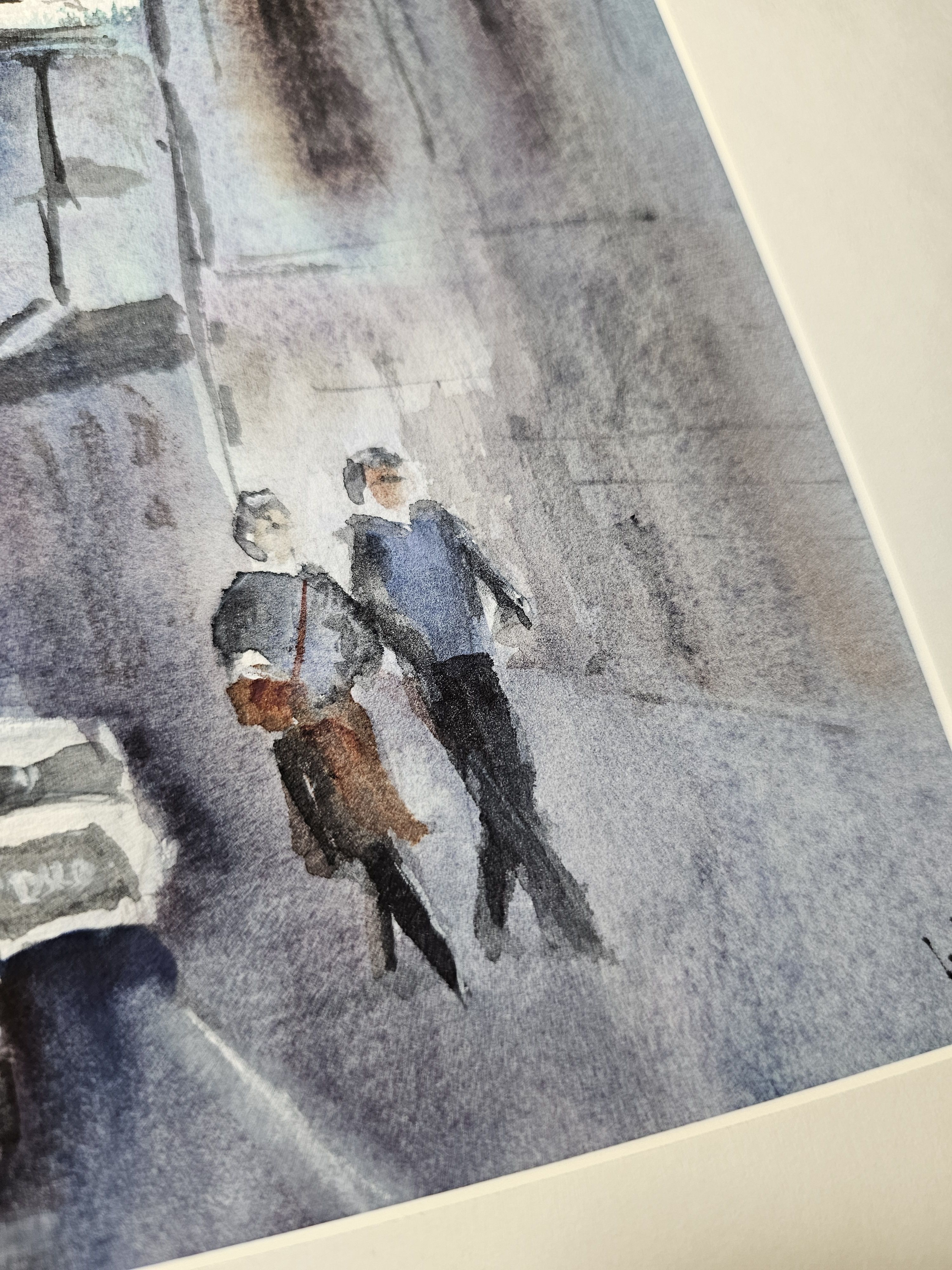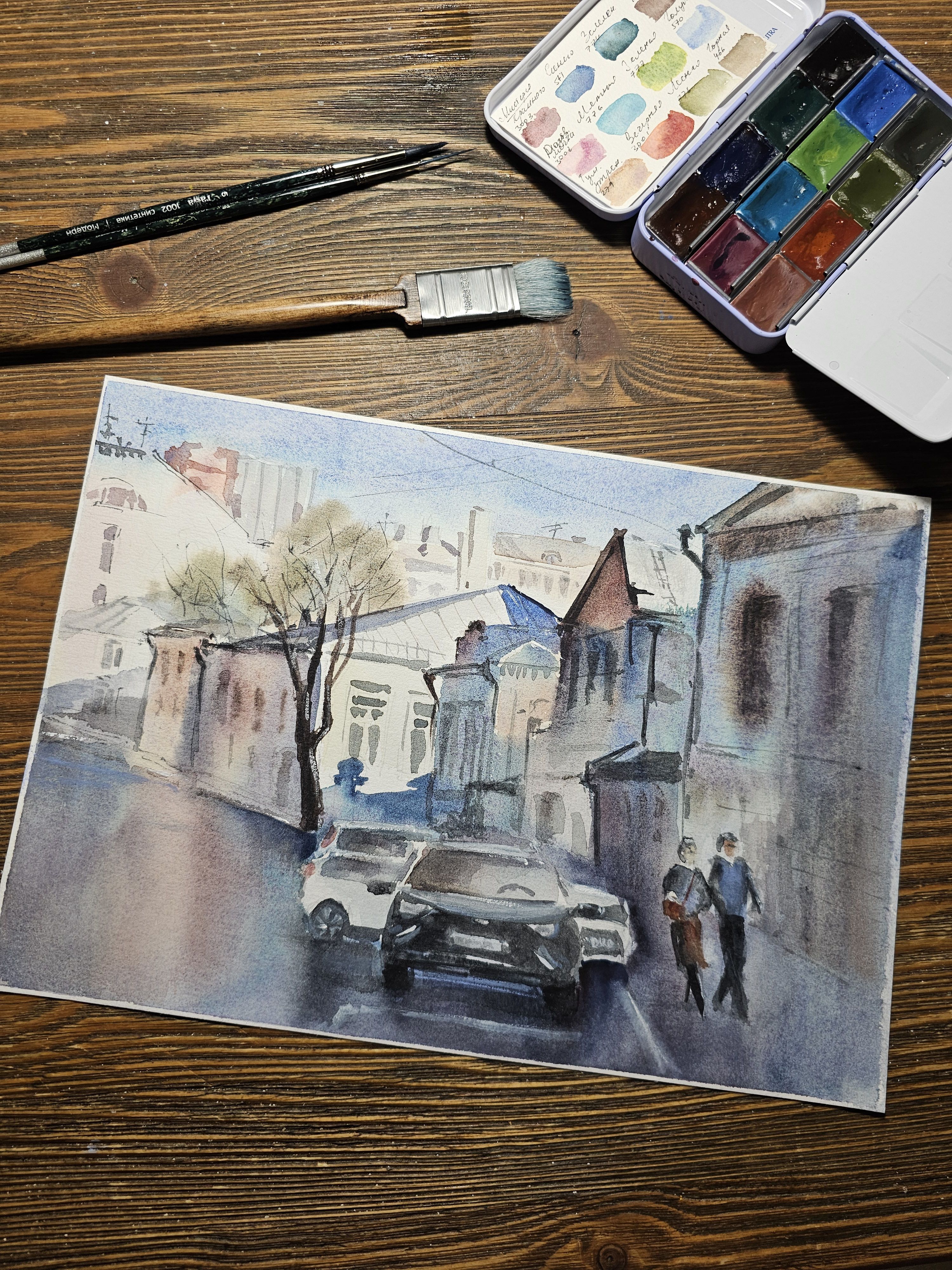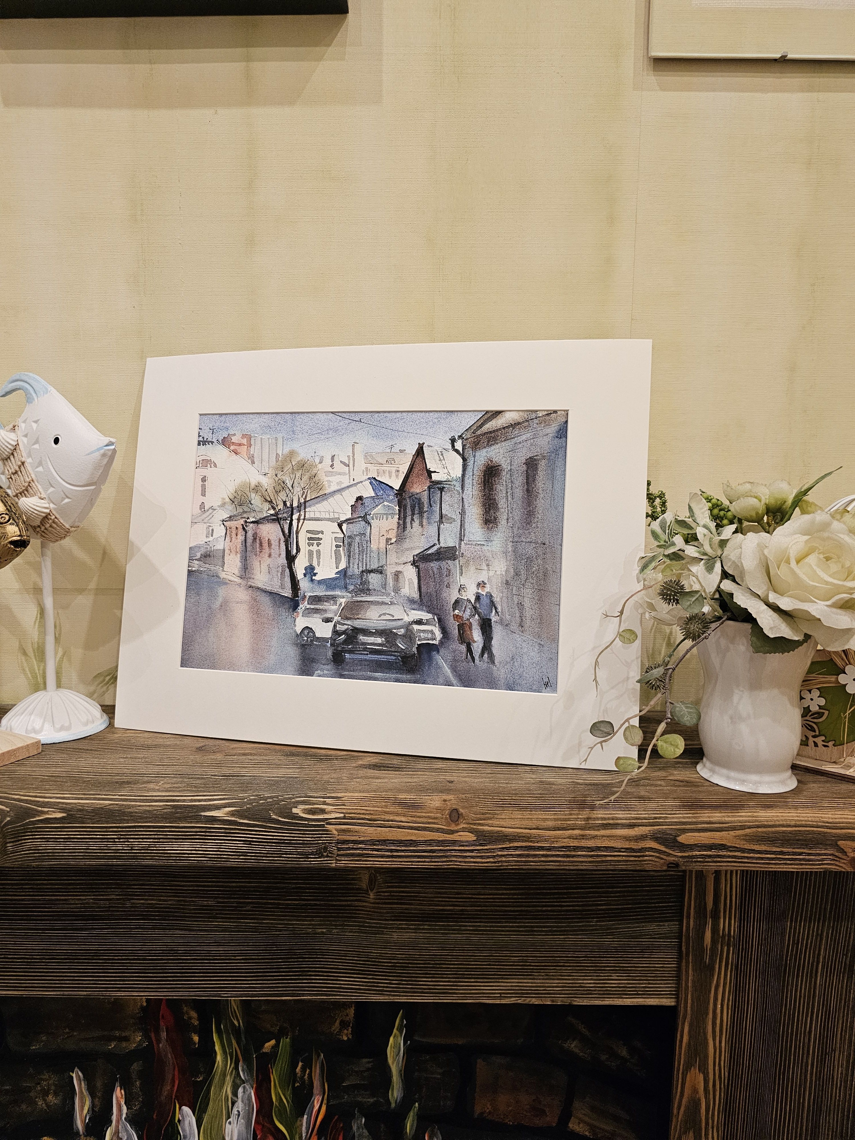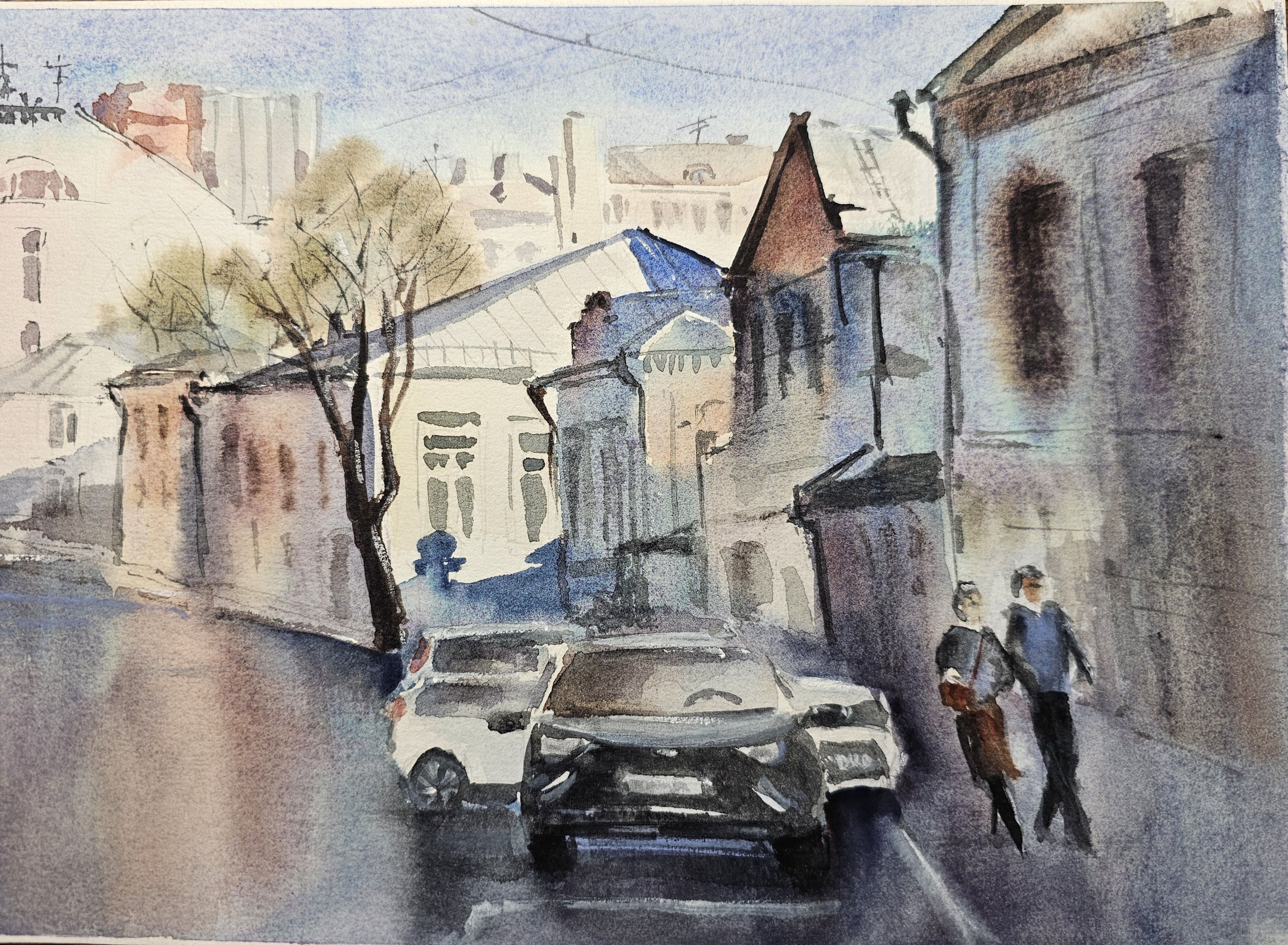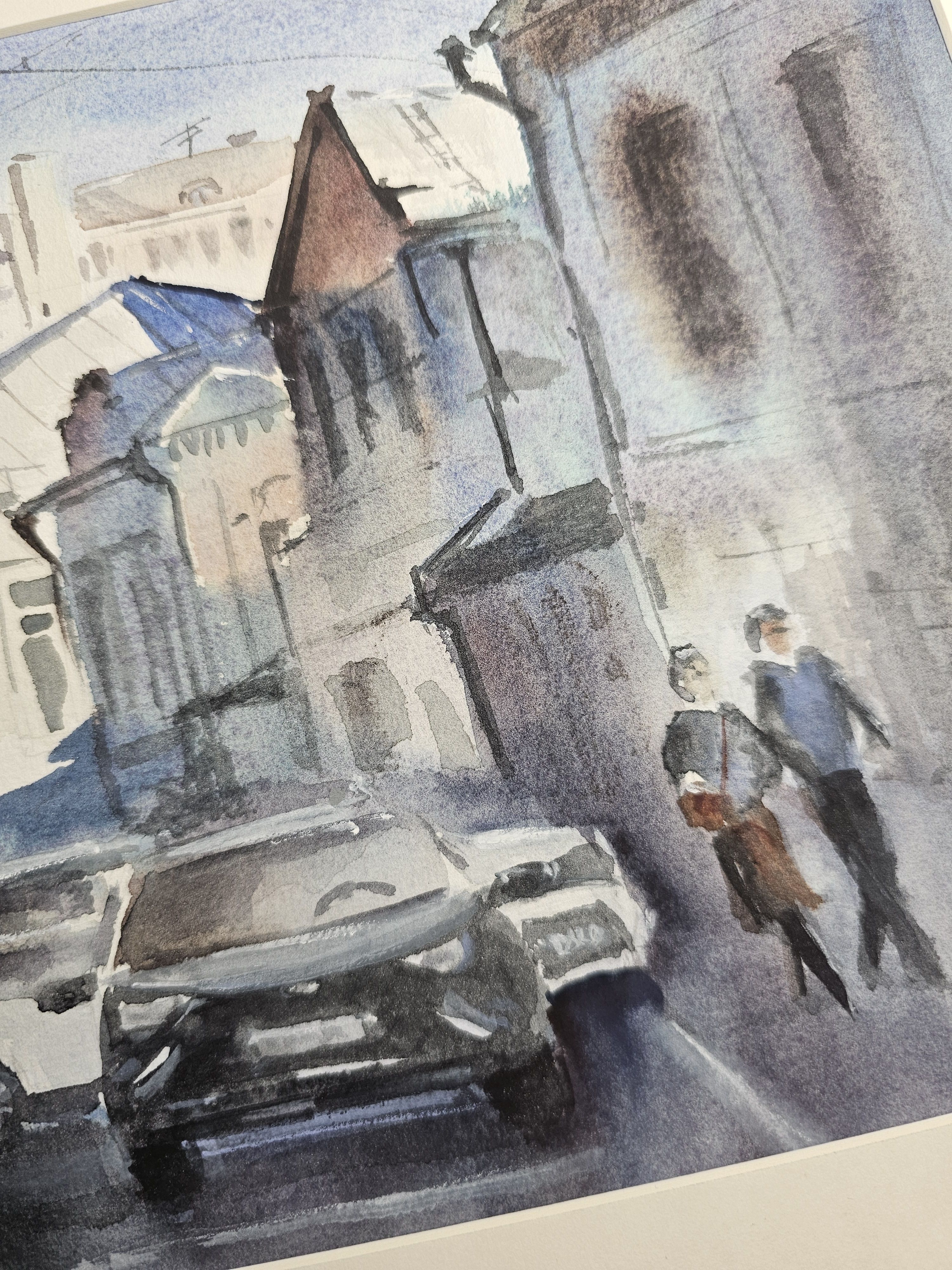 Нам представлен городской пейзаж, выполненный в акварельной технике. В центре композиции находятся улица с домами и припаркованными автомобилями. По обеим сторонам улицы видны здания с элементами архитектуры, характерные для городских построек. Справа идут два человека, вероятно, прохожие. На заднем плане видны деревья с едва распустившейся листвой. Картина выполнена в спокойной цветовой гамме с преобладанием синих и коричневых оттенков, что создаёт ощущение умиротворённости. Работа оформлена в светлое паспарту и готова для размещения в раме стандартного размера.