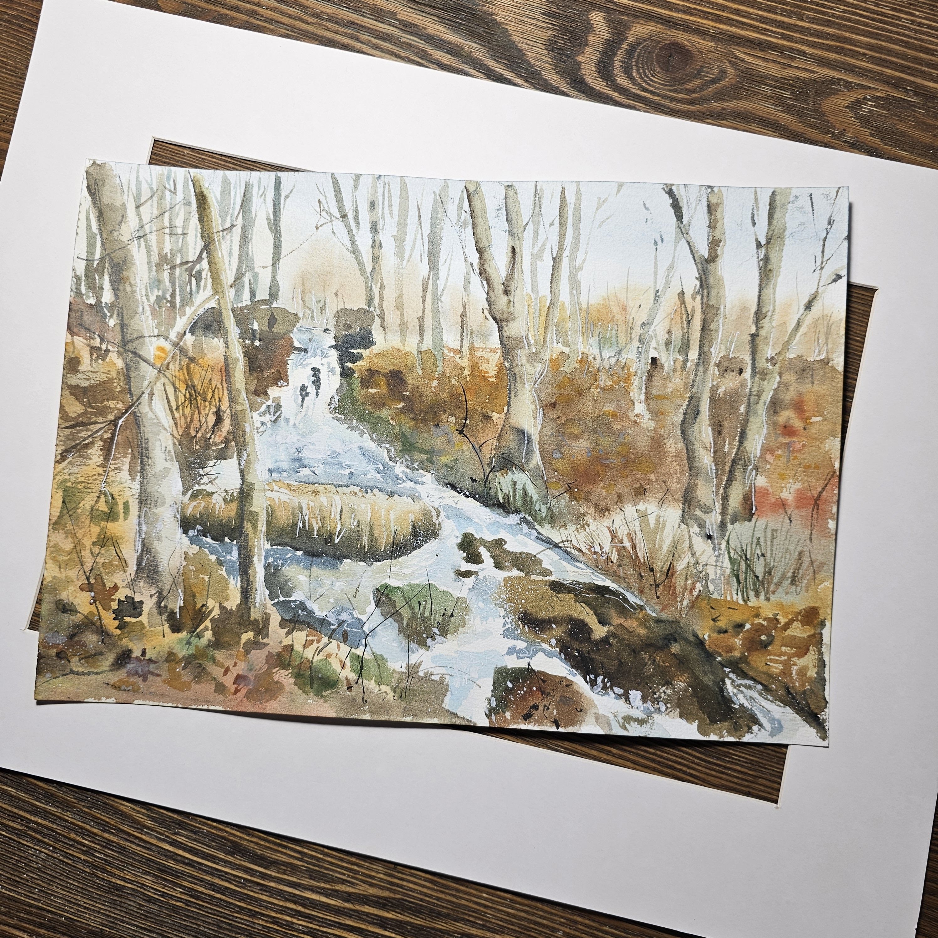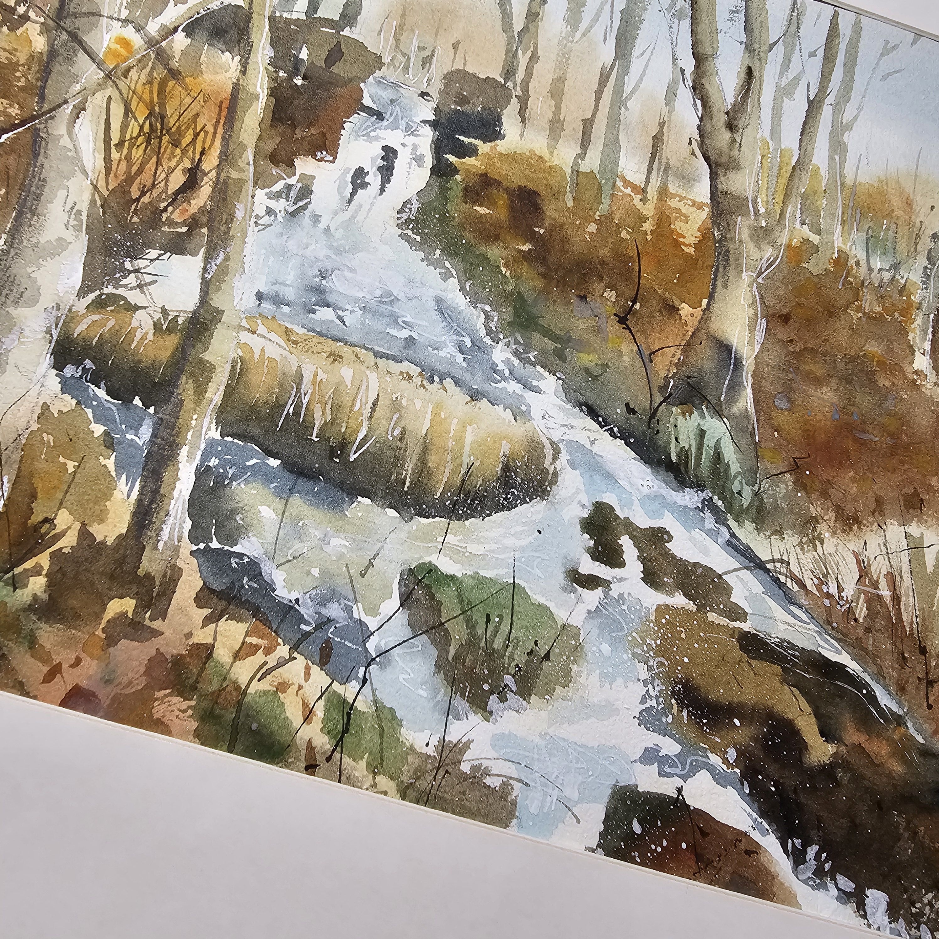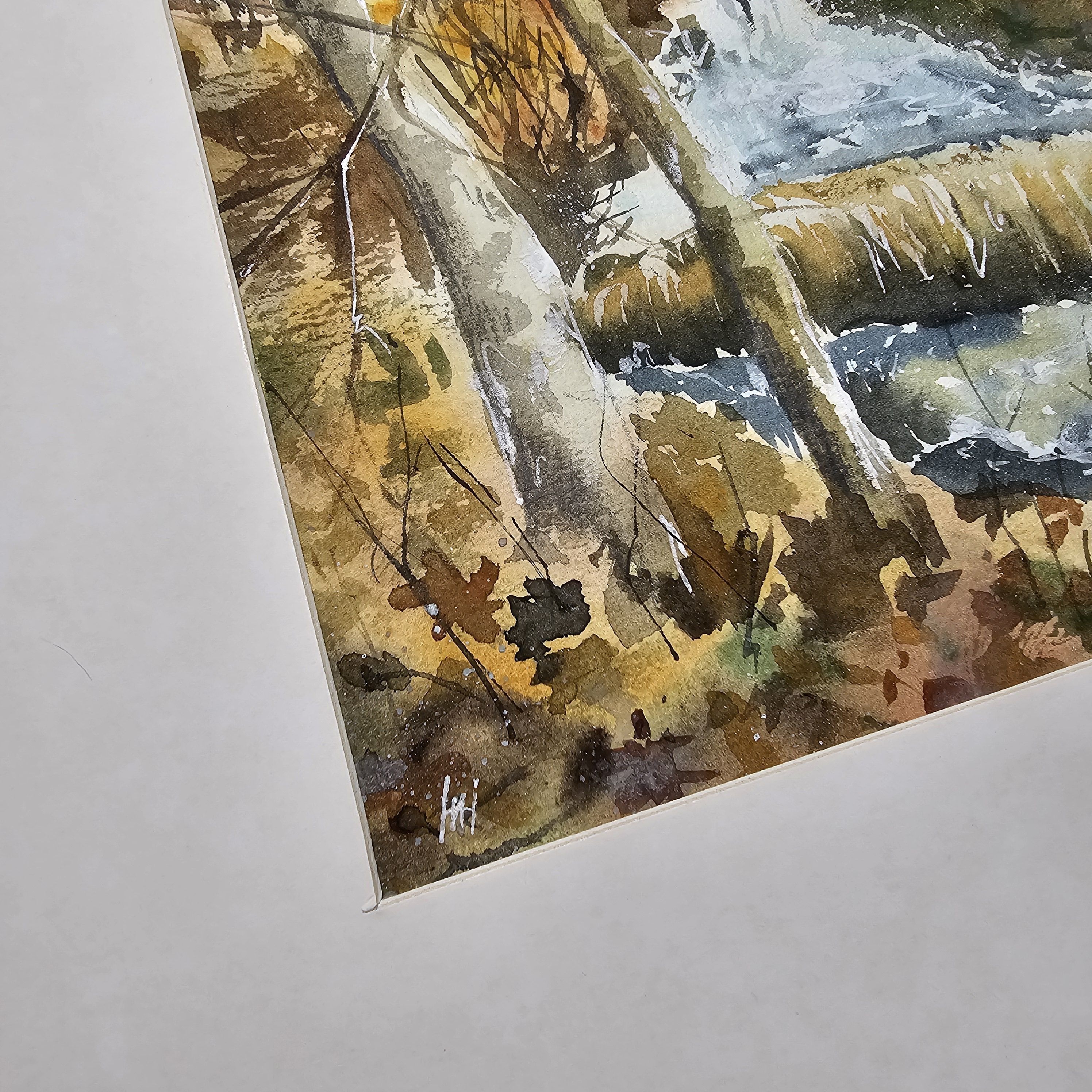 Нам представлена картина, пейзаж с речкой, протекающей среди деревьев. Деревья стоят без листвы, что свидетельствует о поздней осени или начале зимы. Вода в реке кажется прозрачной и быстро текущей и если мы посмотрим немного вверх, то мы увидим, что это небольшой водопад. Окружающая растительность окрашена в тёплые оранжевые и коричневые тона, передавая ощущение осени. Картина выполнена в акварельной технике, что придает ей особую легкость и прозрачность. Светлое паспарту позволяет подобрать раму практически любого цвета.