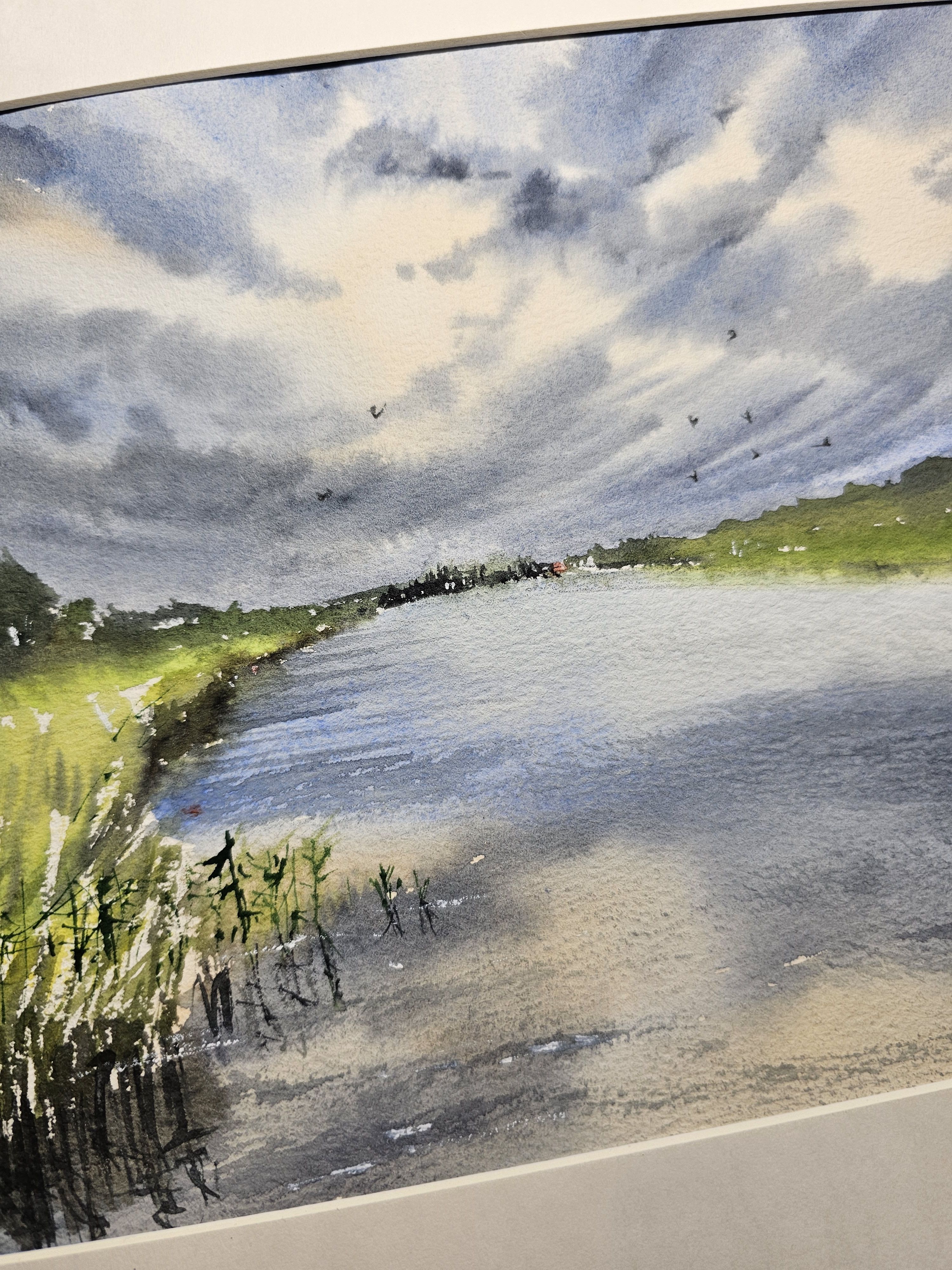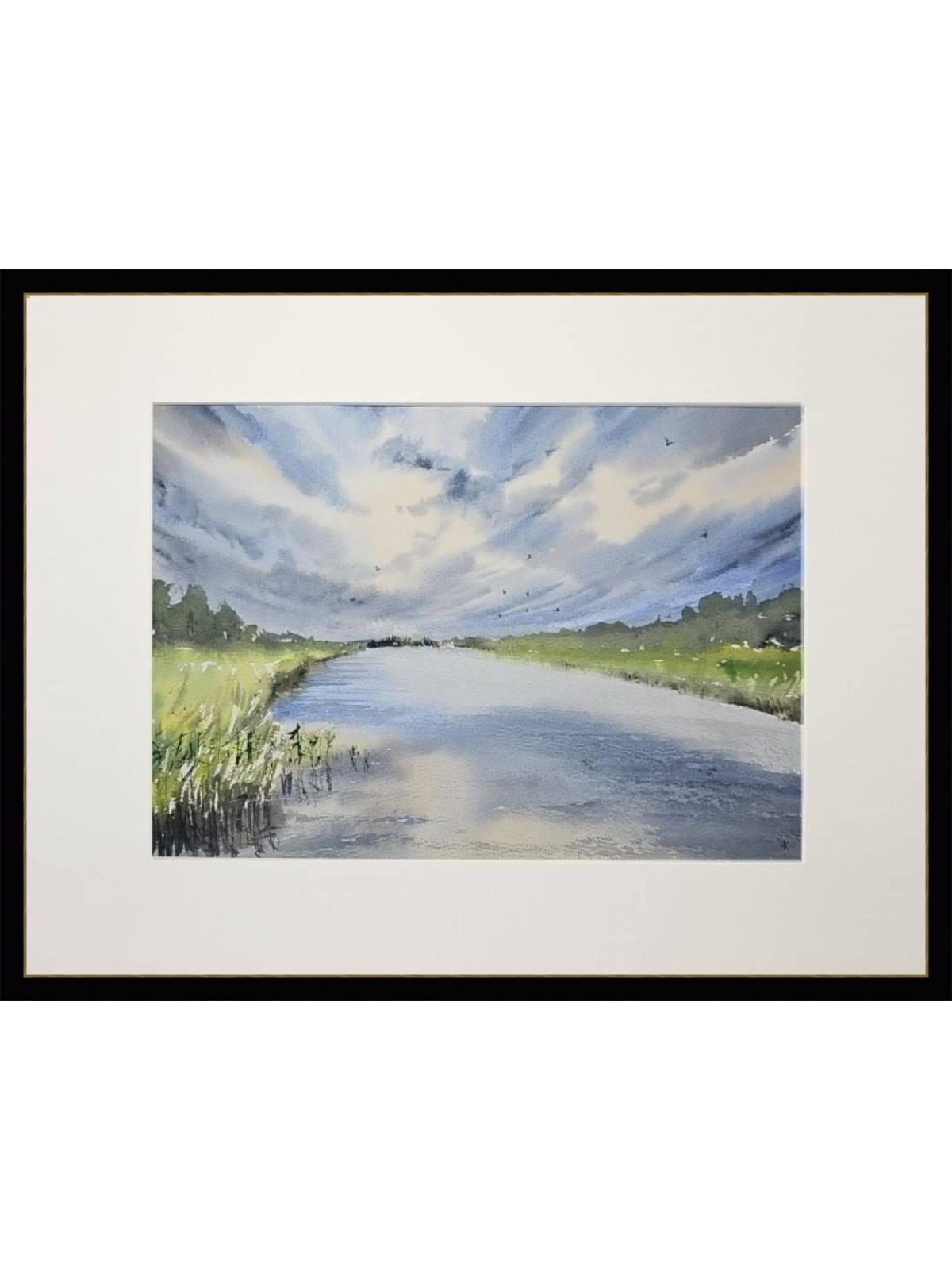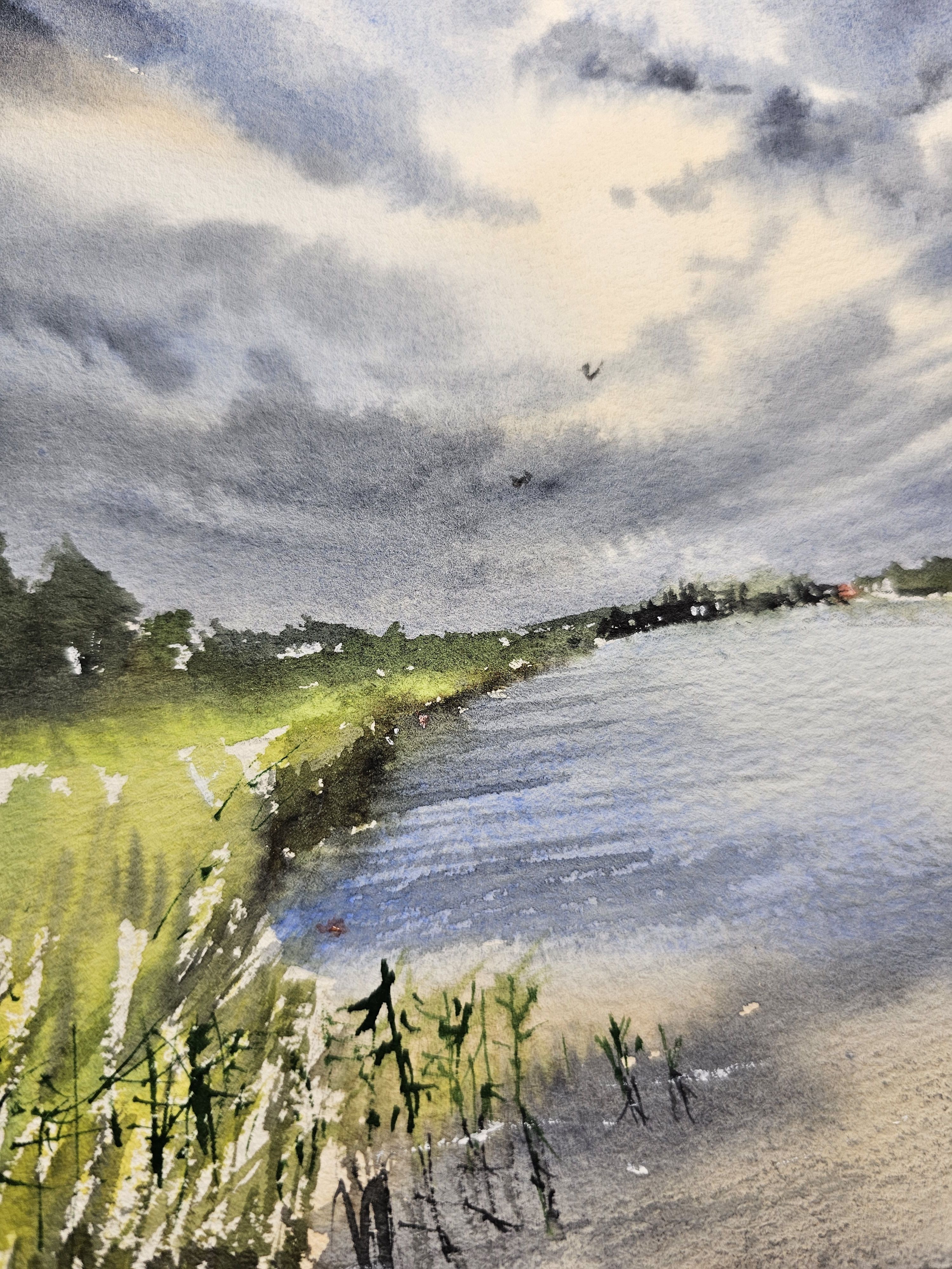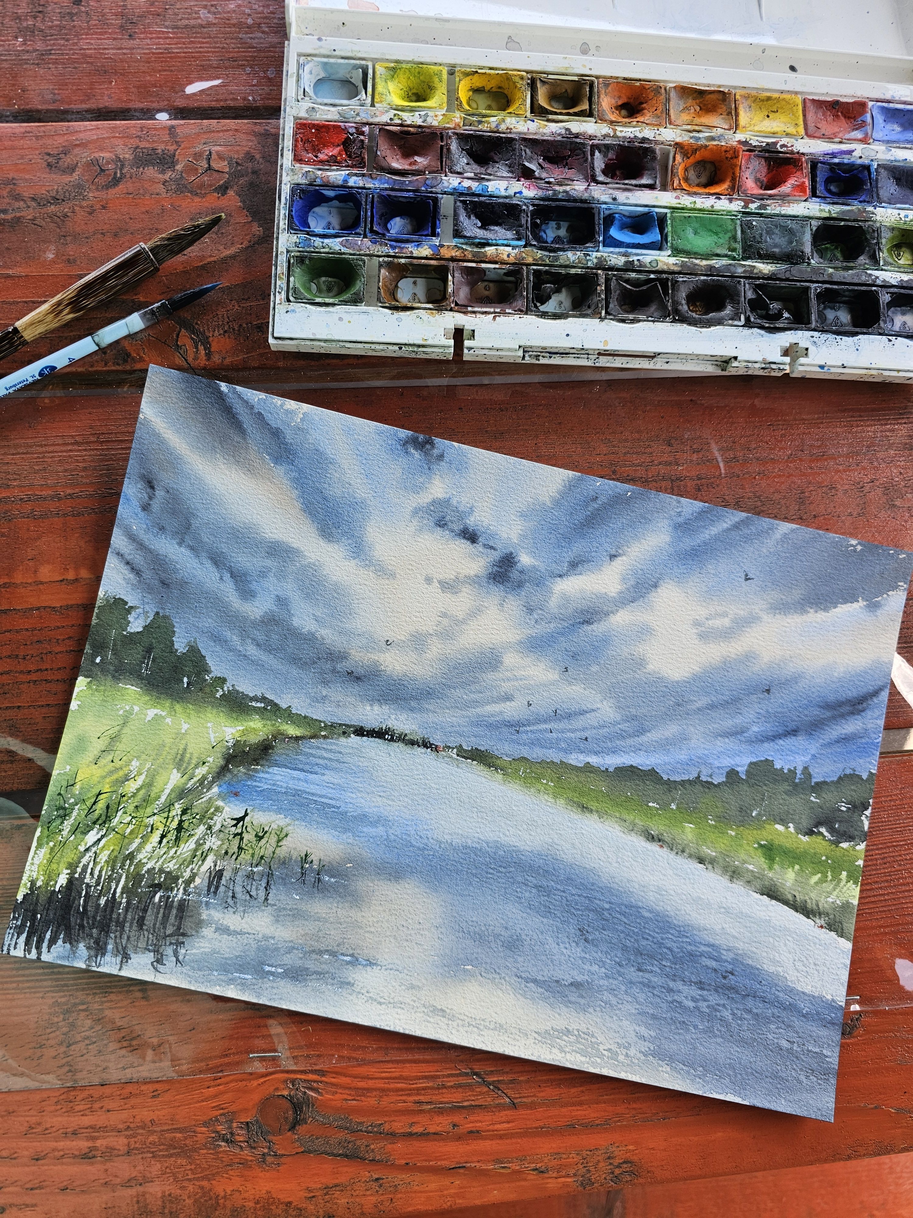 Нам представлена акварельная картина с пейзажем. В центре композиции находится река Яуза с гладкой поверхностью, отражающей небо. По обеим сторонам расположены зеленые берега с травой и кустарниками. Вдали виднеется линия горизонта с деревьями. Небо покрыто облаками, создающими динамичный эффект. А высоко в небе парят птицы.