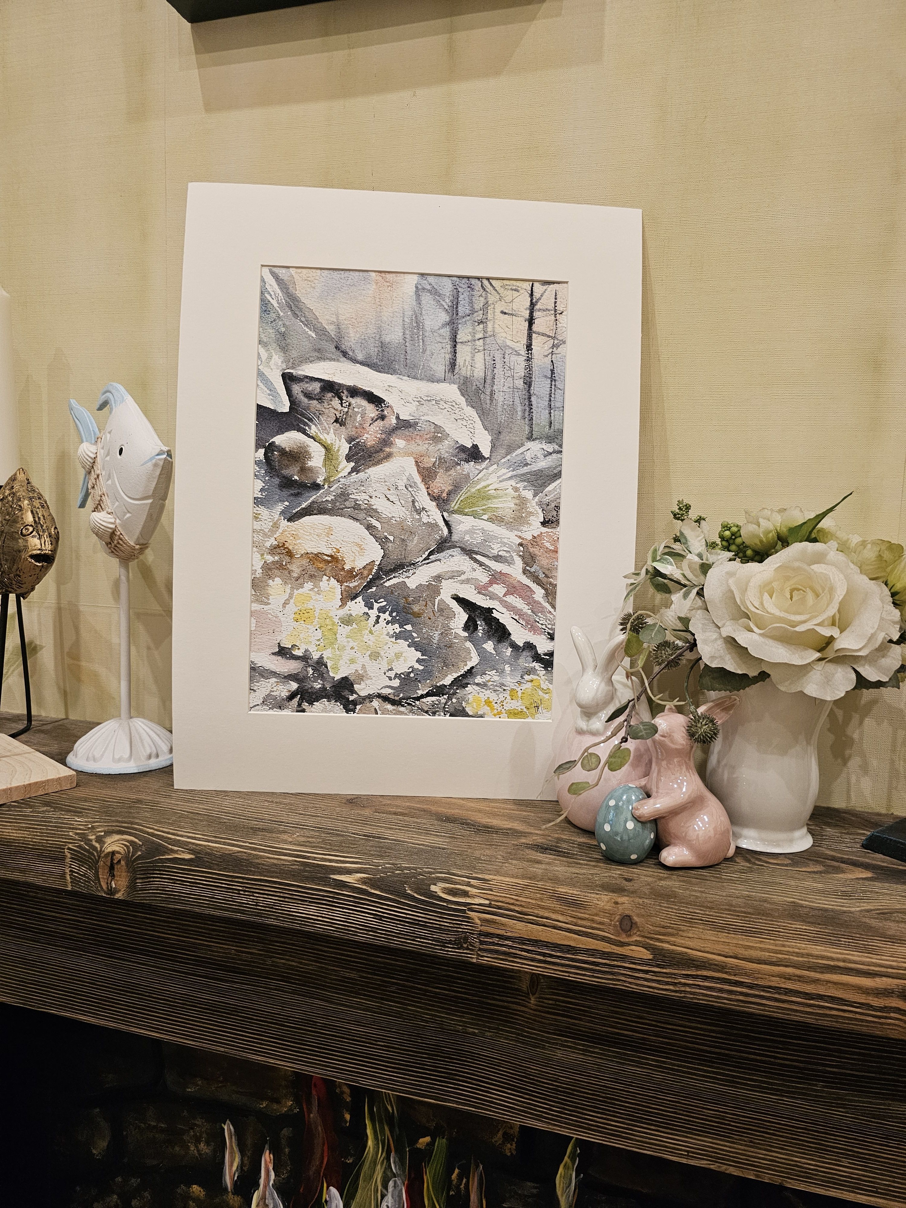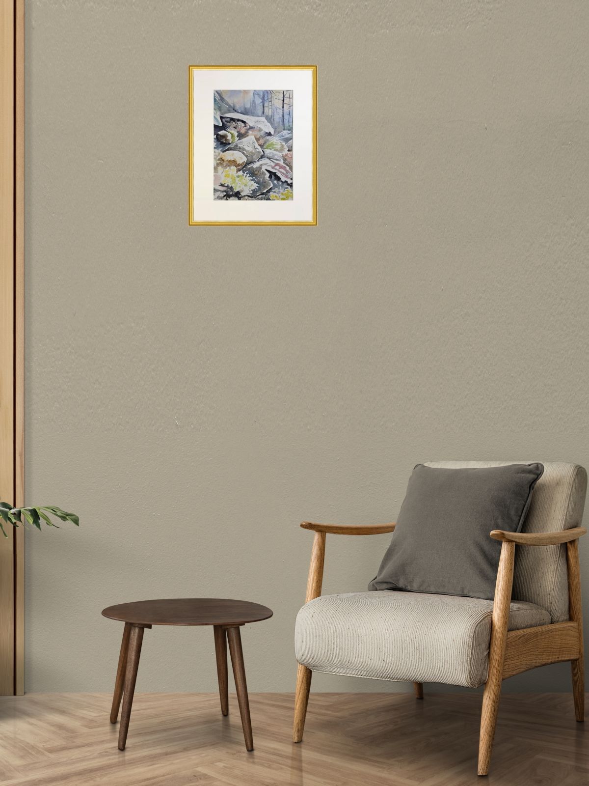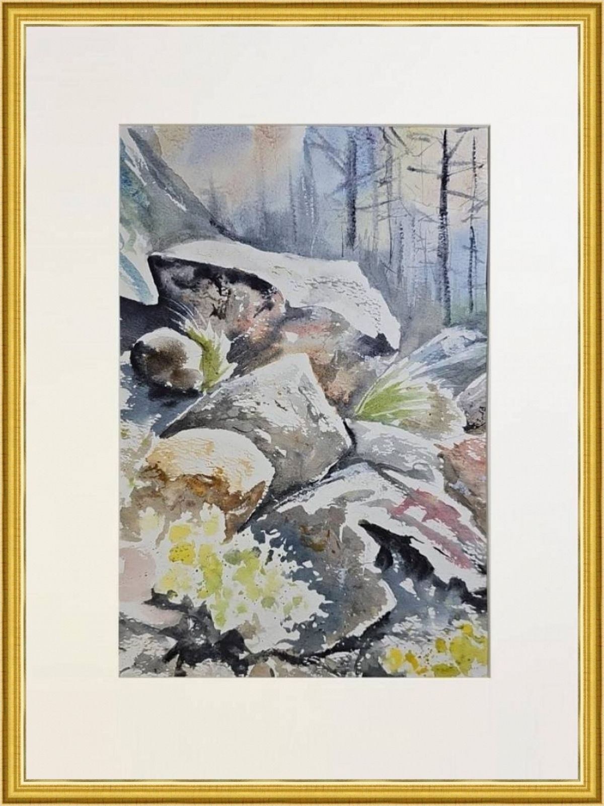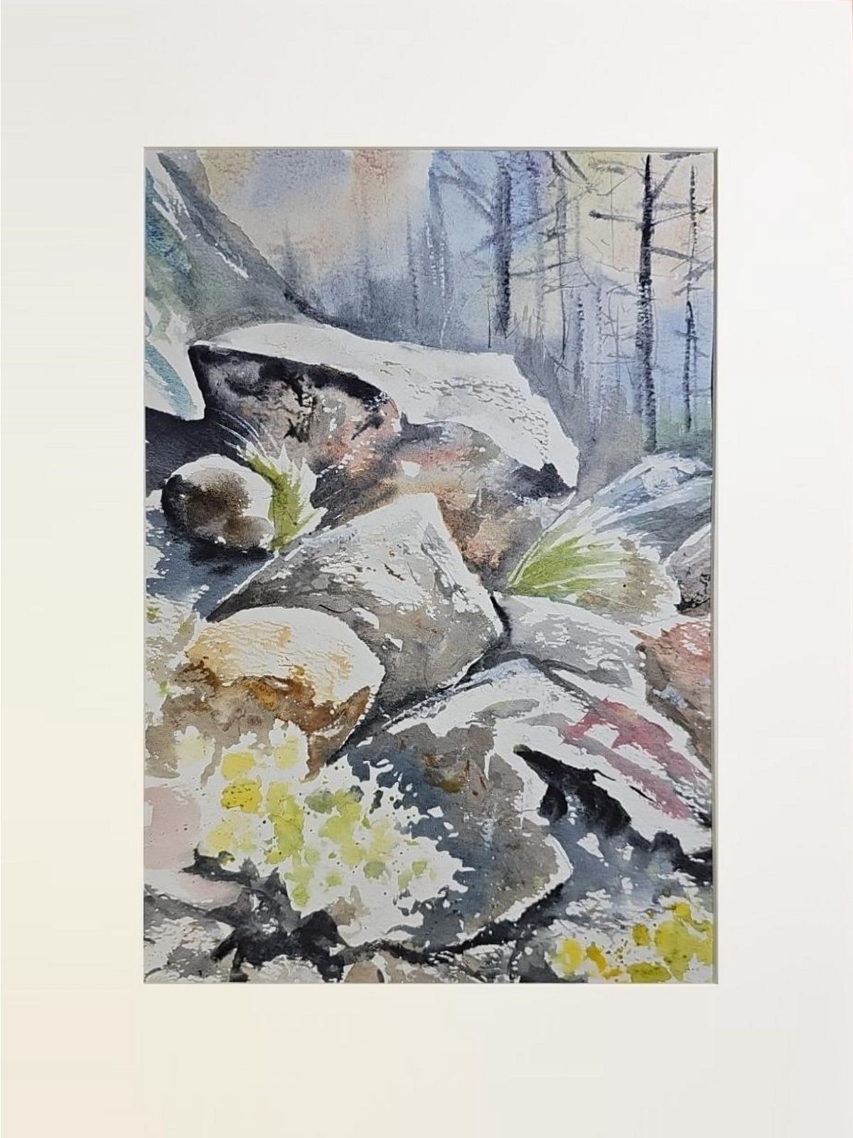 Нам представлена акварельная картина с природным пейзажем. На переднем плане изображены крупные камни с разнообразной текстурой, расположенные хаотично. Присутствуют оттенки серого, белого и коричневого, а также зелёные пятна, напоминающие растительность. Вдали виднеются силуэты деревьев, что создаёт ощущение лесистой местности. Картина выполнена в мягких, размытых тонах, передающих спокойствие и прохладу природной среды. Работа оформлена в светлое паспарту и готова для размещения в раме стандартного размера 30*40 см.
