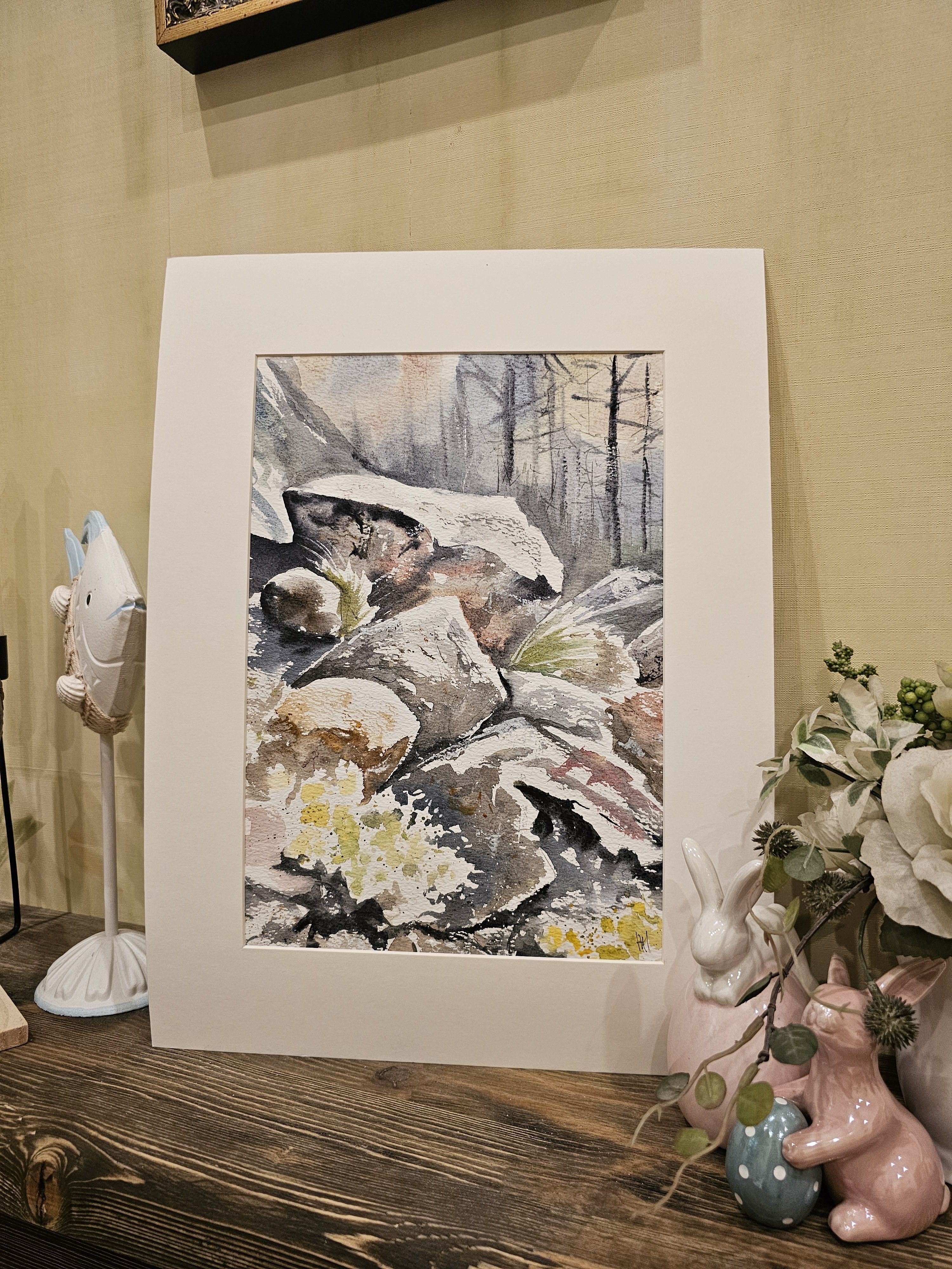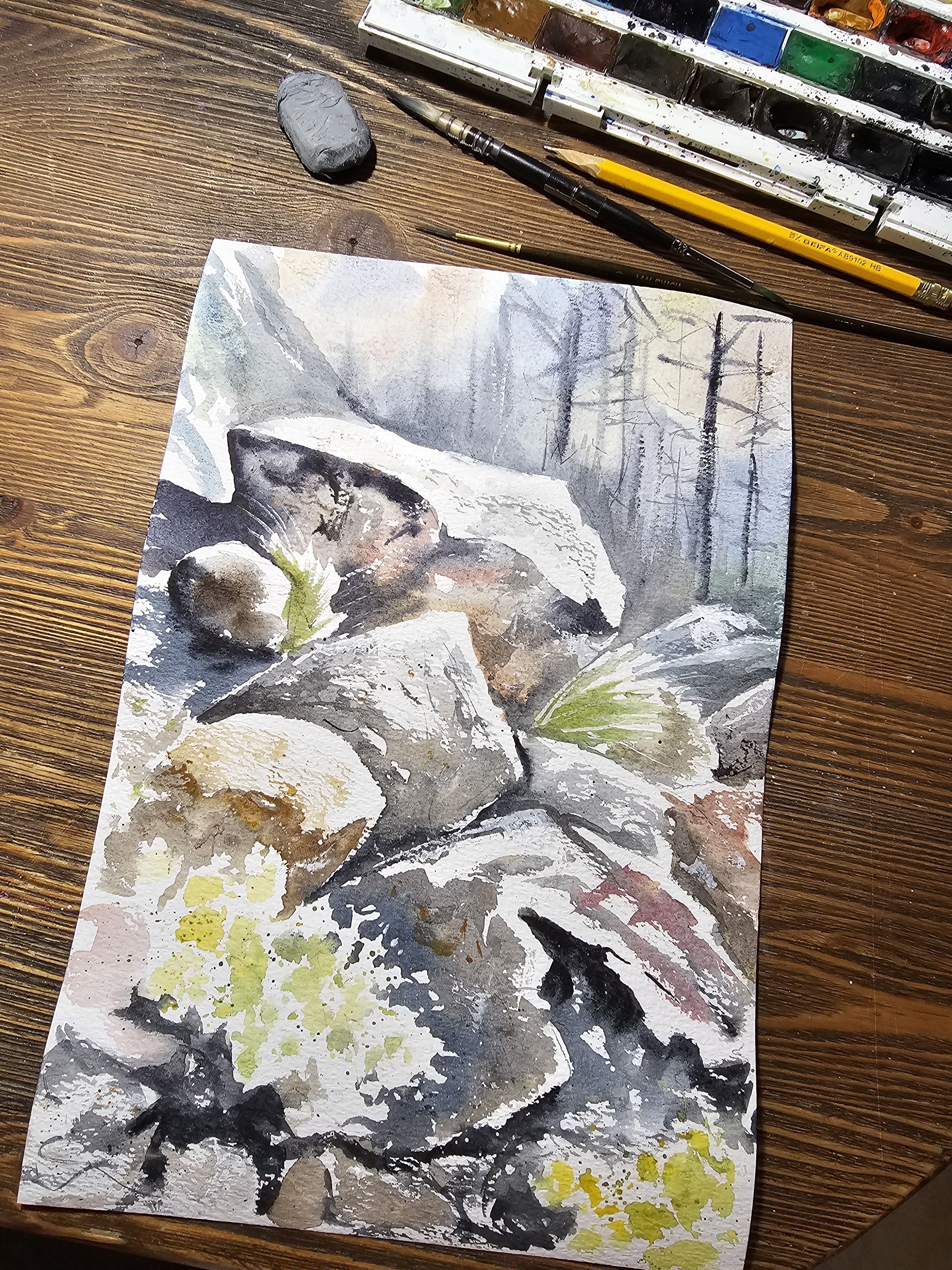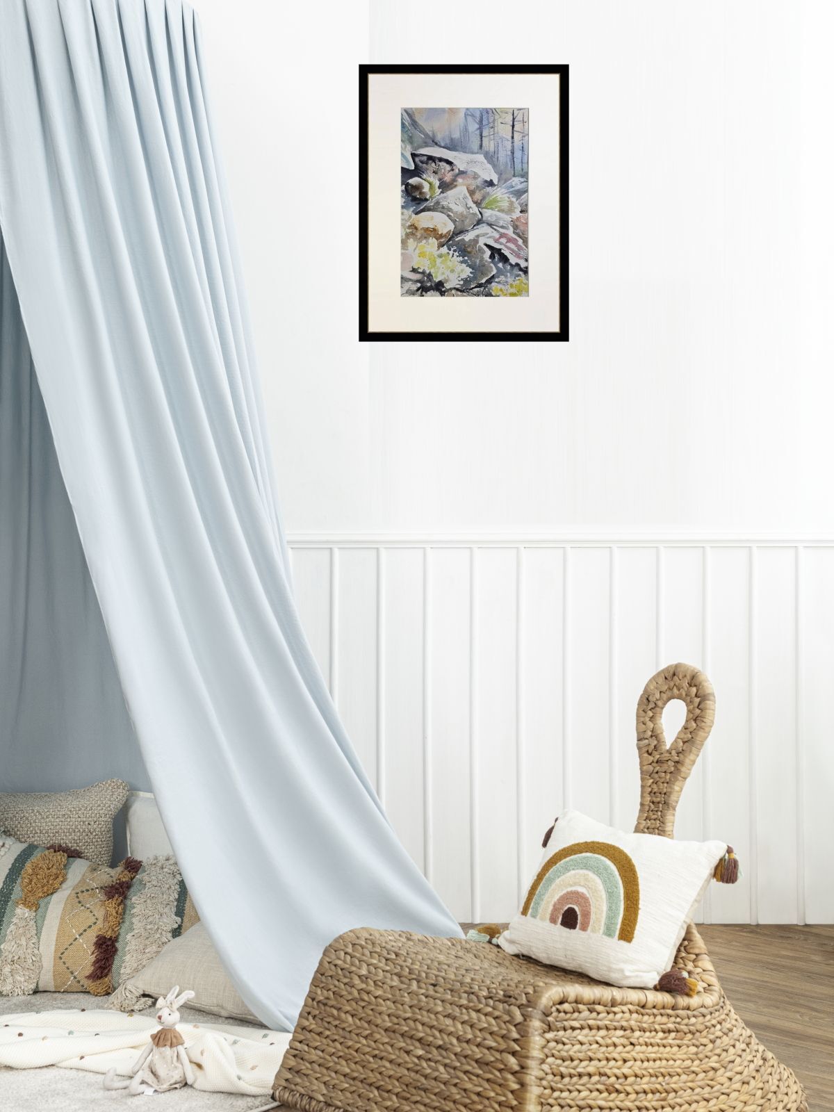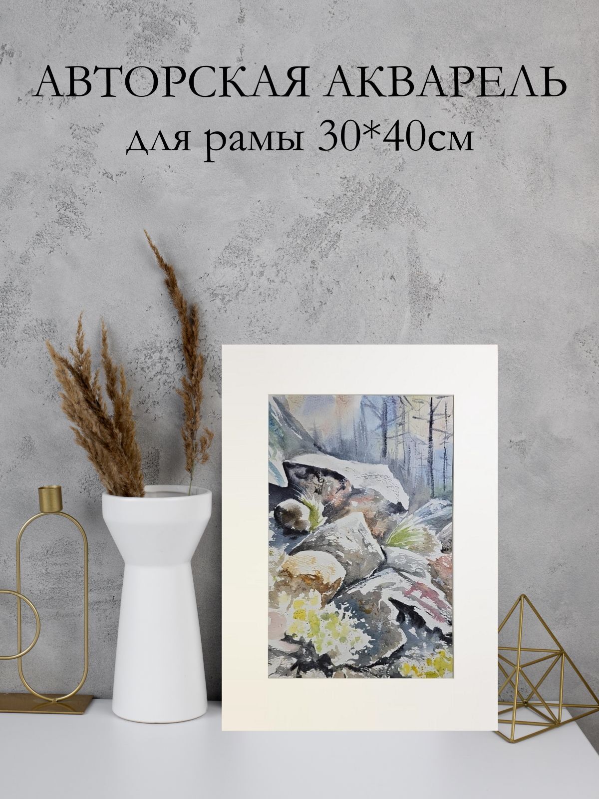Нам представлена акварельная картина с природным пейзажем. На переднем плане изображены крупные камни с разнообразной текстурой, расположенные хаотично. Присутствуют оттенки серого, белого и коричневого, а также зелёные пятна, напоминающие растительность. Вдали виднеются силуэты деревьев, что создаёт ощущение лесистой местности. Картина выполнена в мягких, размытых тонах, передающих спокойствие и прохладу природной среды. Работа оформлена в светлое паспарту и готова для размещения в раме стандартного размера 30*40 см.