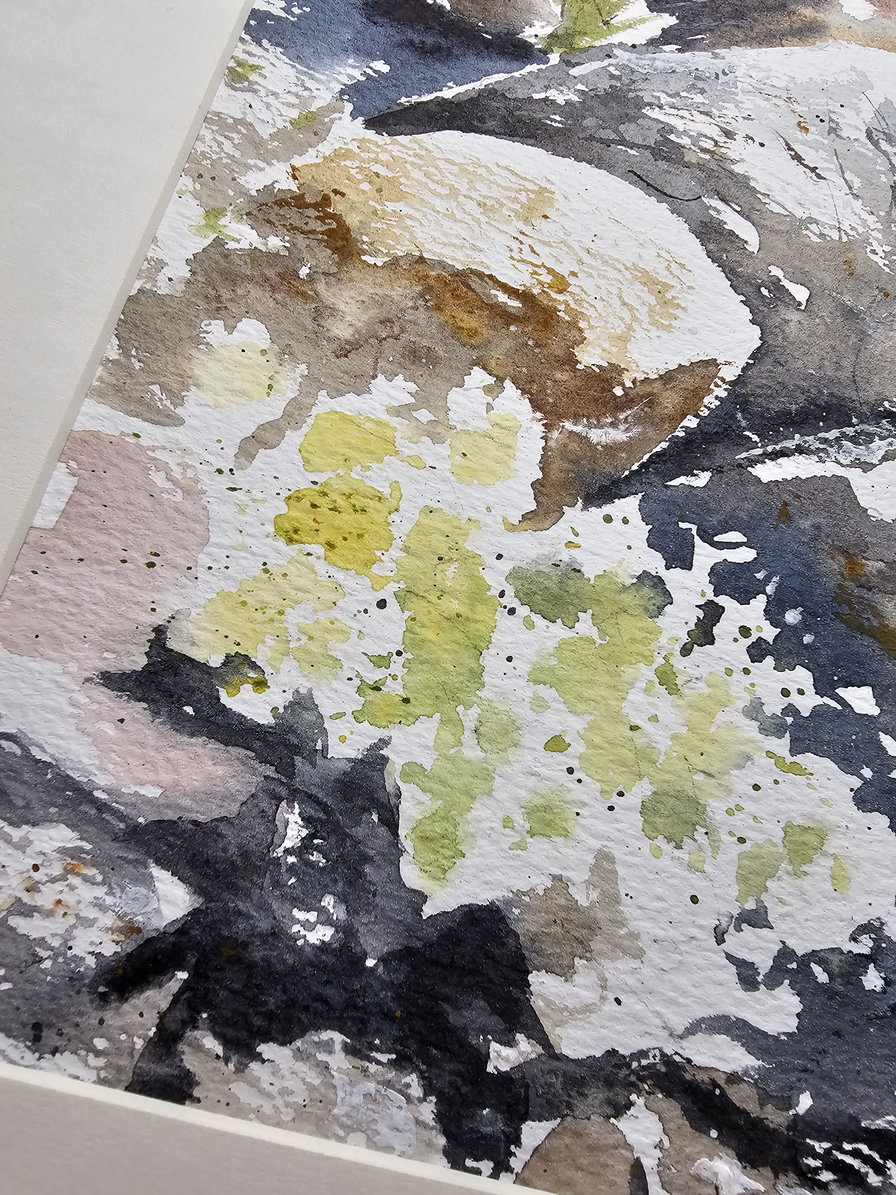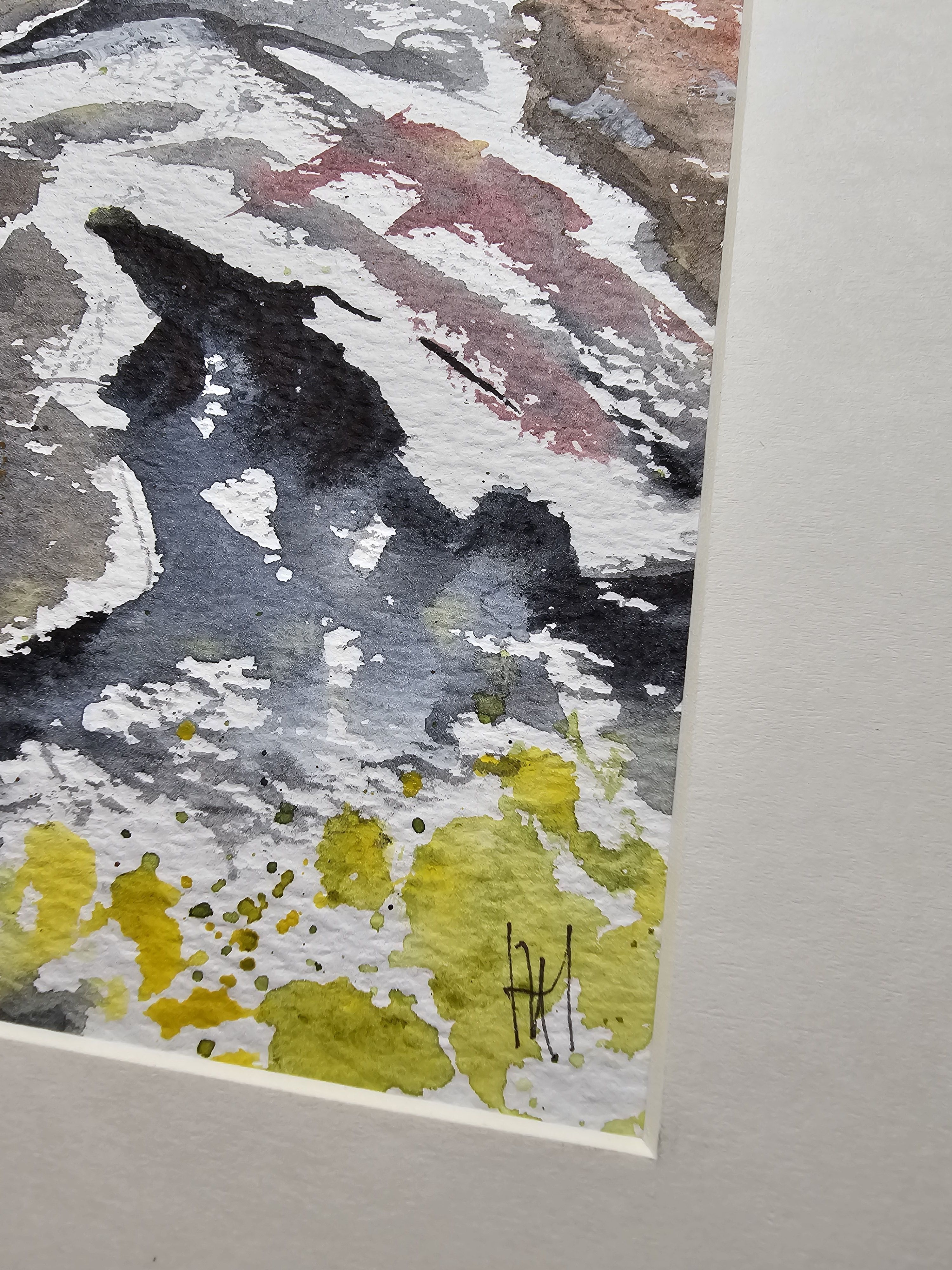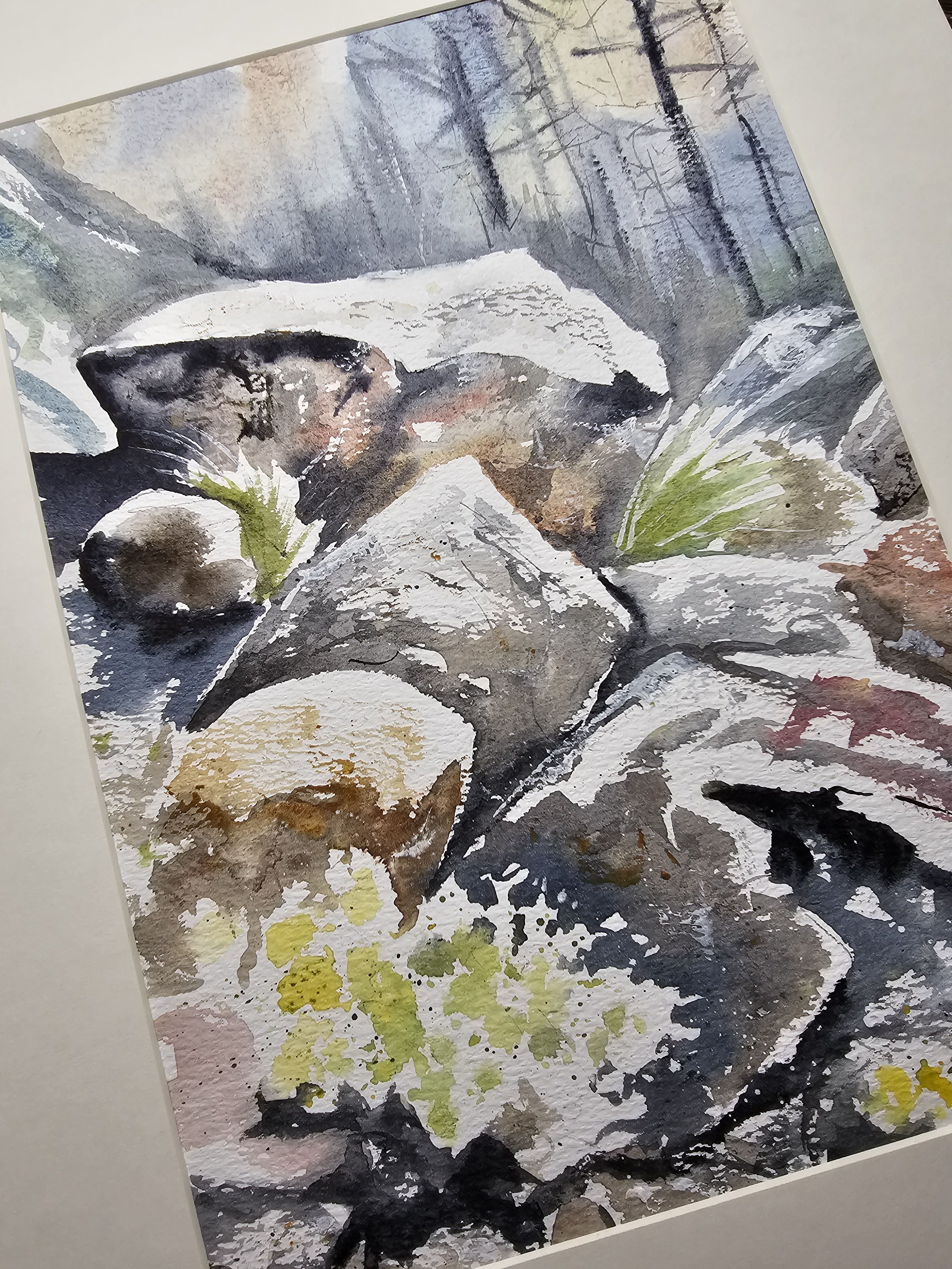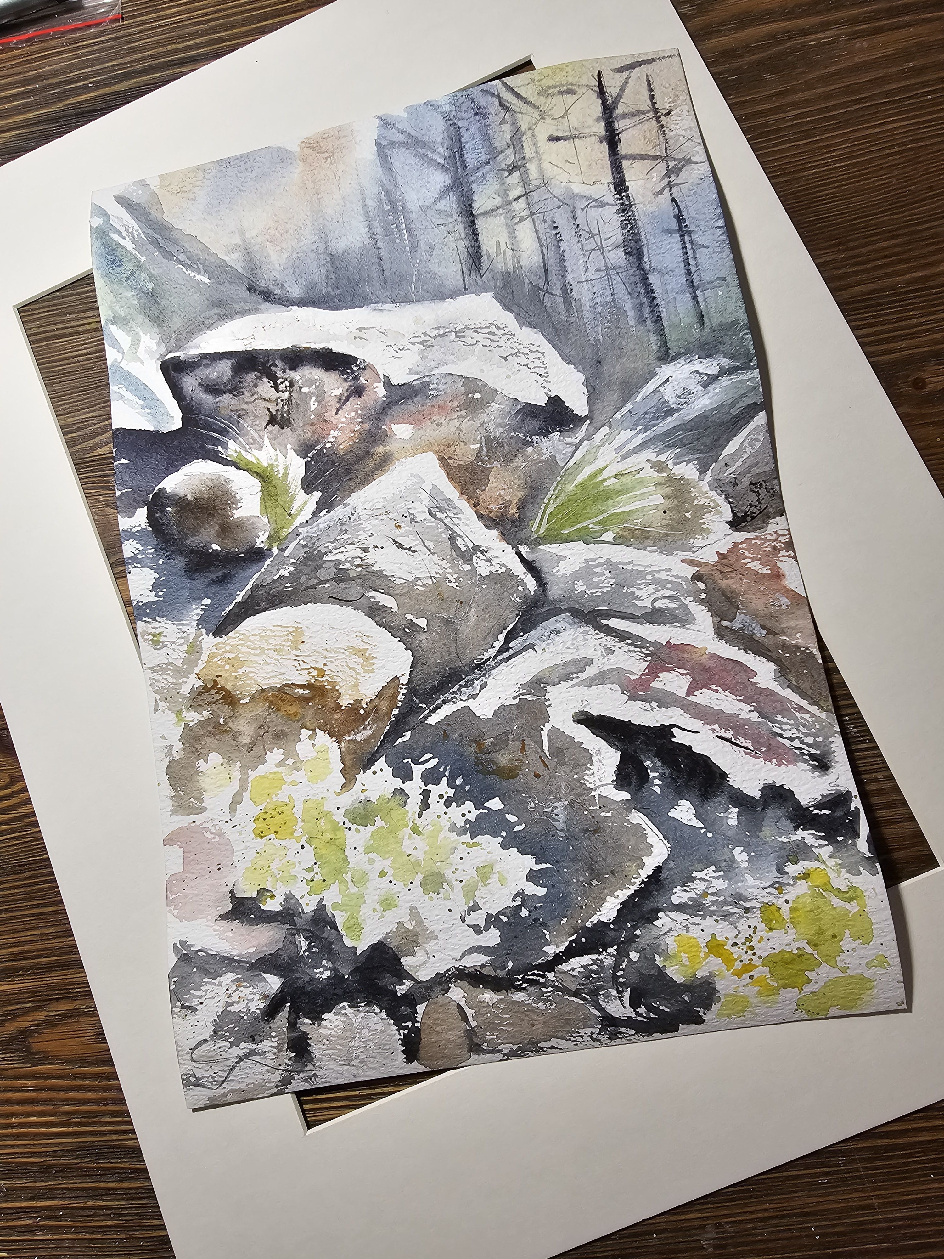 Нам представлена акварельная картина с природным пейзажем. На переднем плане изображены крупные камни с разнообразной текстурой, расположенные хаотично. Присутствуют оттенки серого, белого и коричневого, а также зелёные пятна, напоминающие растительность. Вдали виднеются силуэты деревьев, что создаёт ощущение лесистой местности. Картина выполнена в мягких, размытых тонах, передающих спокойствие и прохладу природной среды. Работа оформлена в светлое паспарту и готова для размещения в раме стандартного размера 30*40 см.