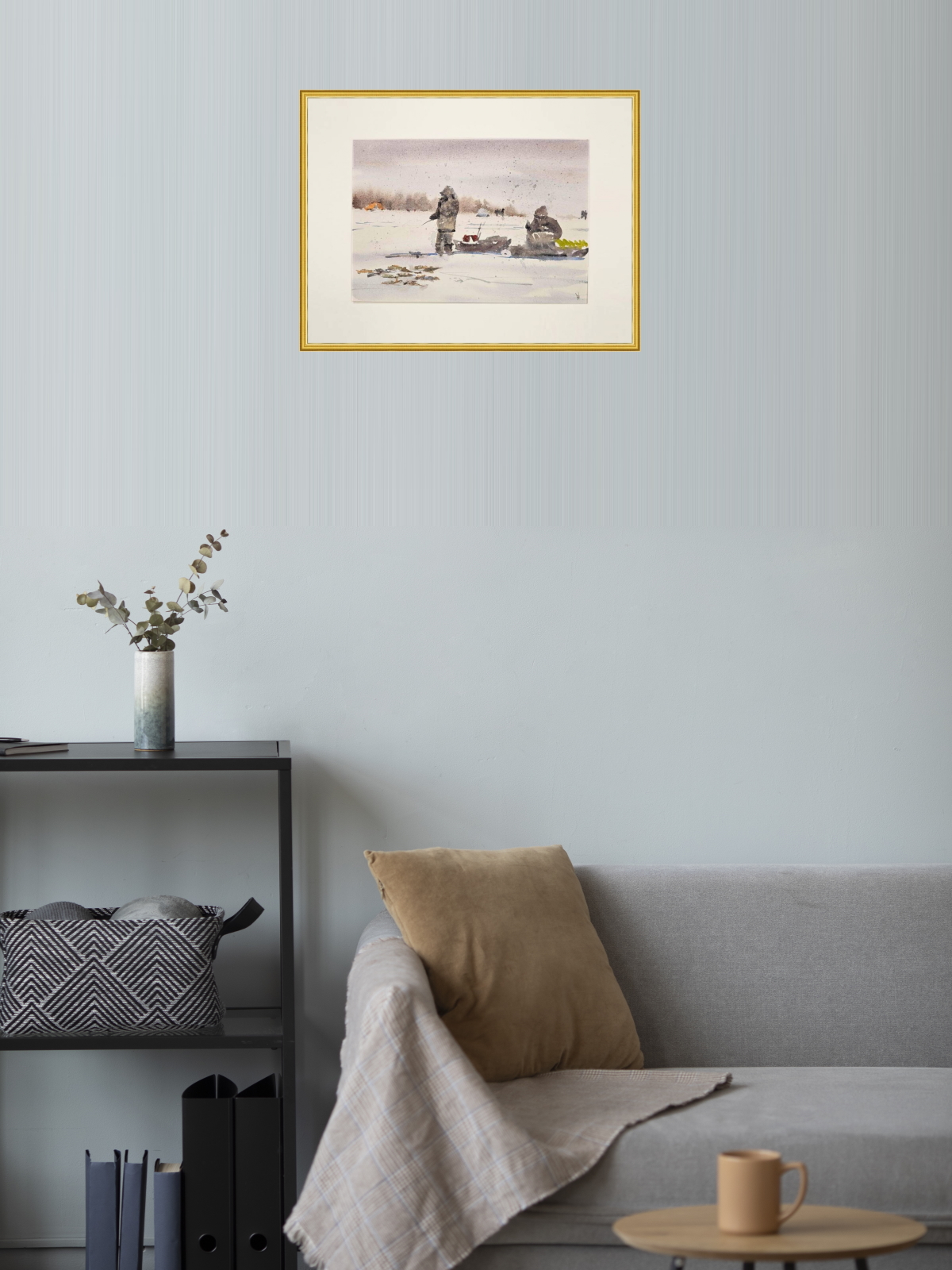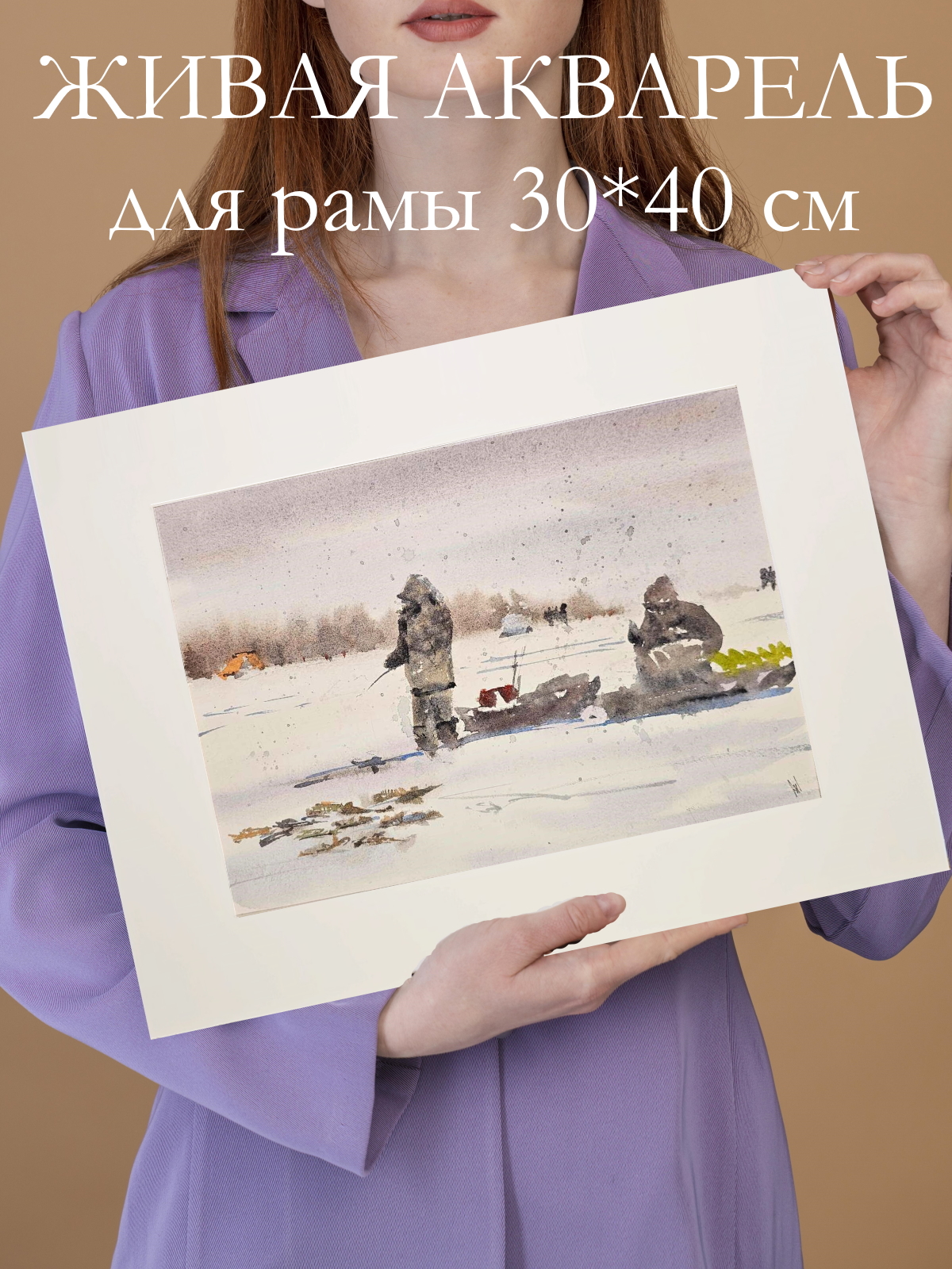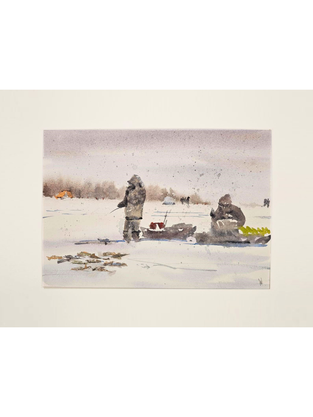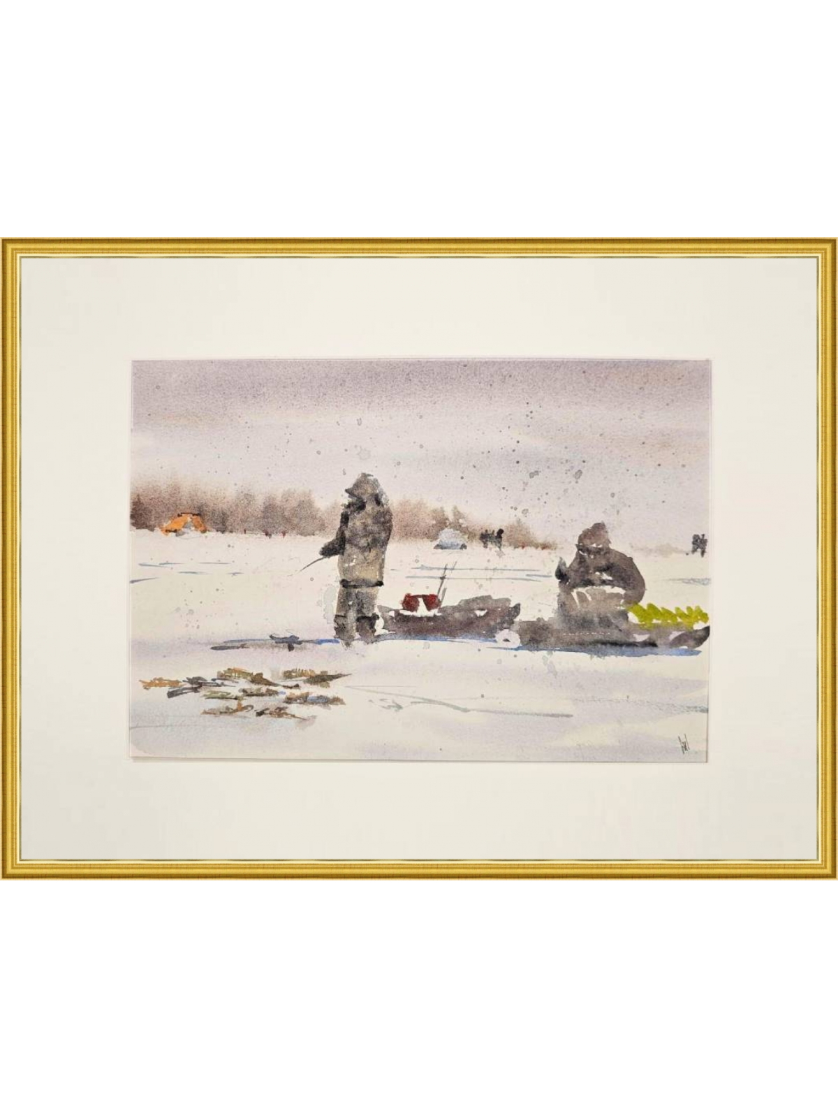 Нам представлена акварельная картина, на которой изображены два человека, занимающихся зимней рыбалкой на замерзшем водоеме. Один человек стоит с удочкой, а другой сидит рядом с санями, на которых находятся различные предметы, возможно, рыболовные принадлежности. На заднем плане виднеются деревья и несколько палаток других рыбаков. Работа оформлена в светлое паспарту и готова к размещению в стандартной раме 30*40 см.