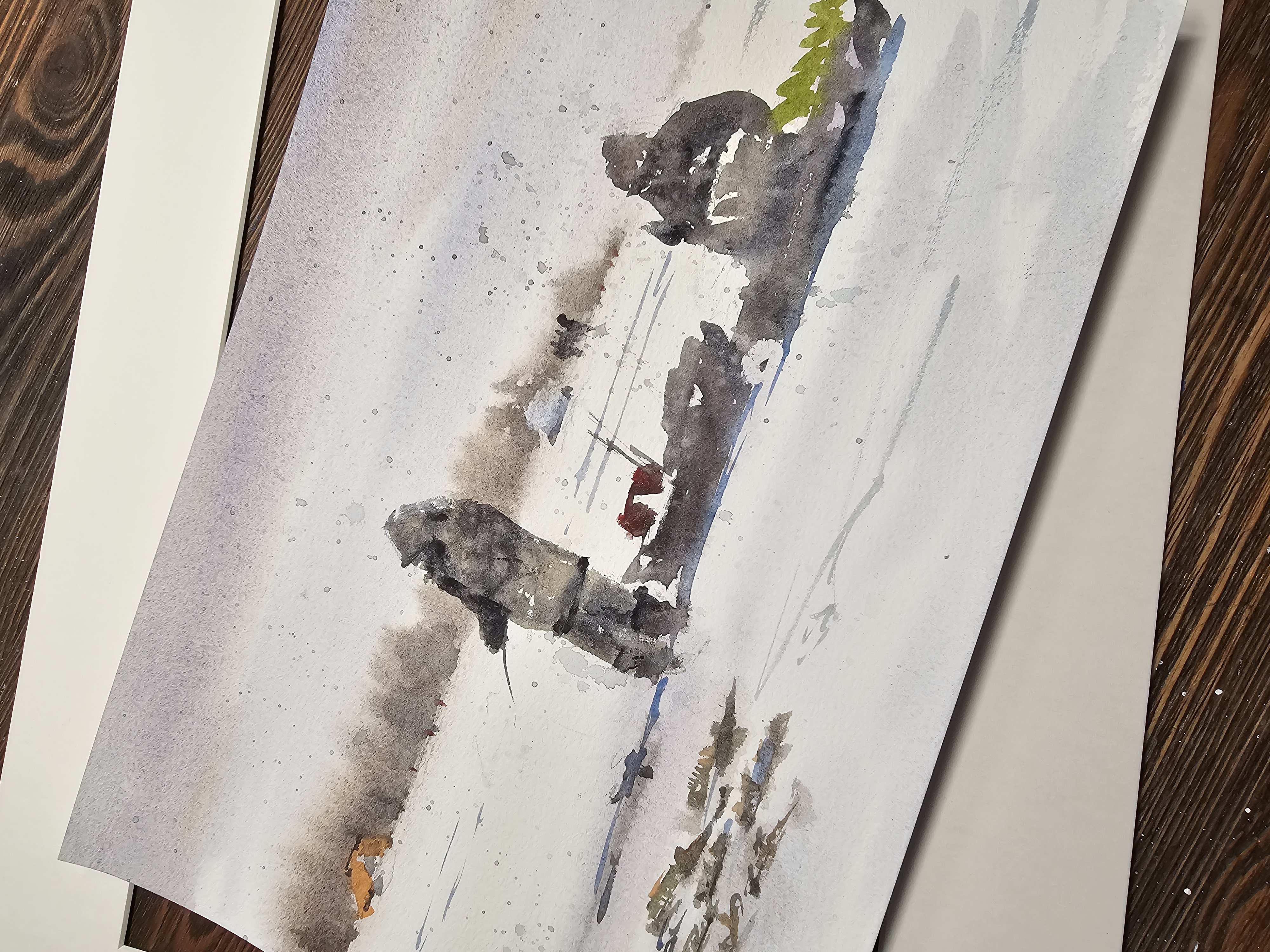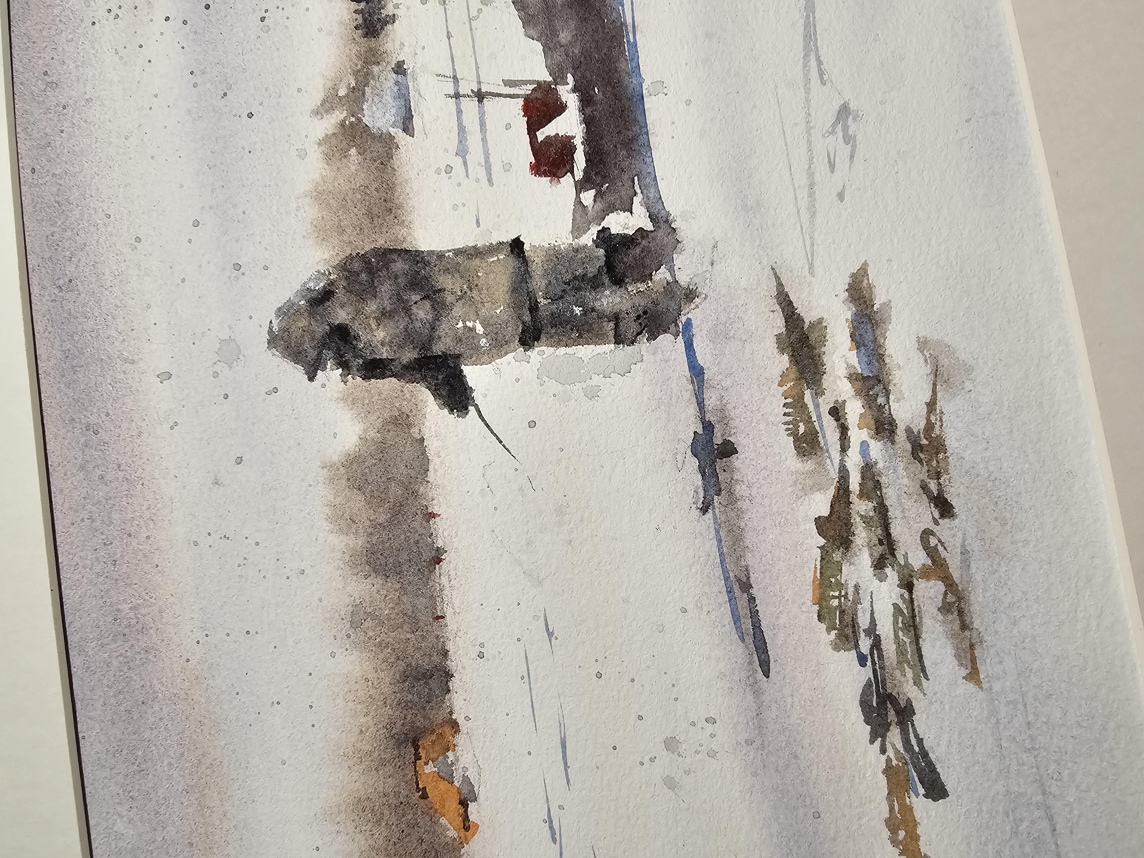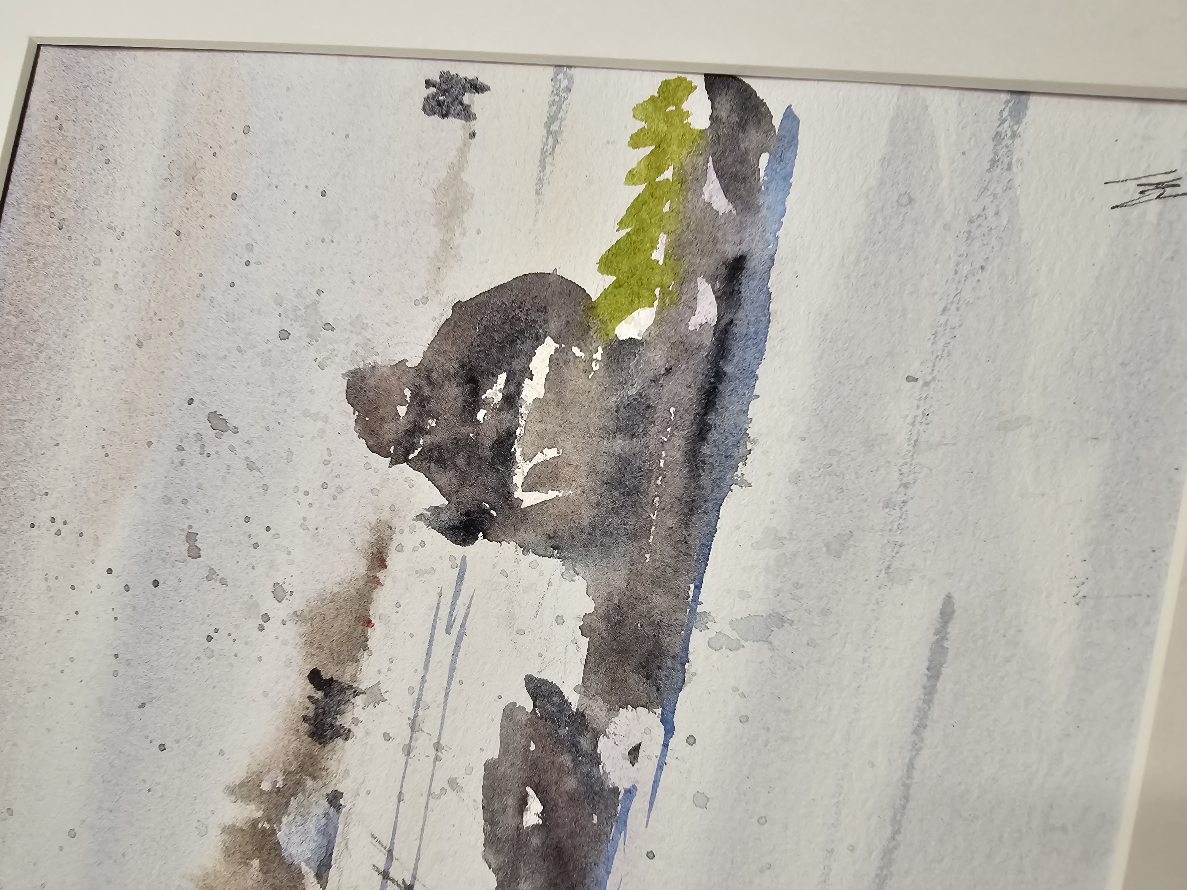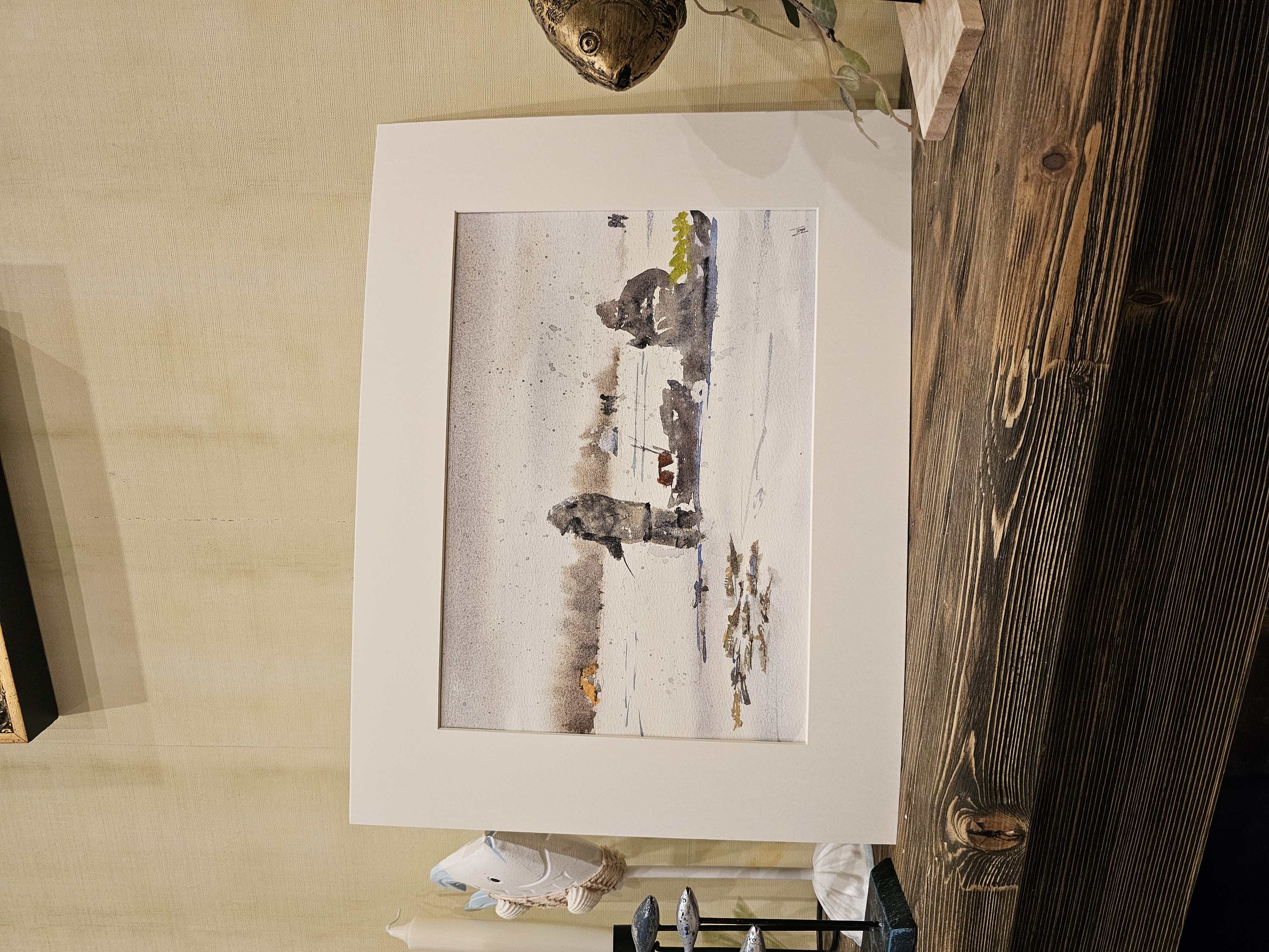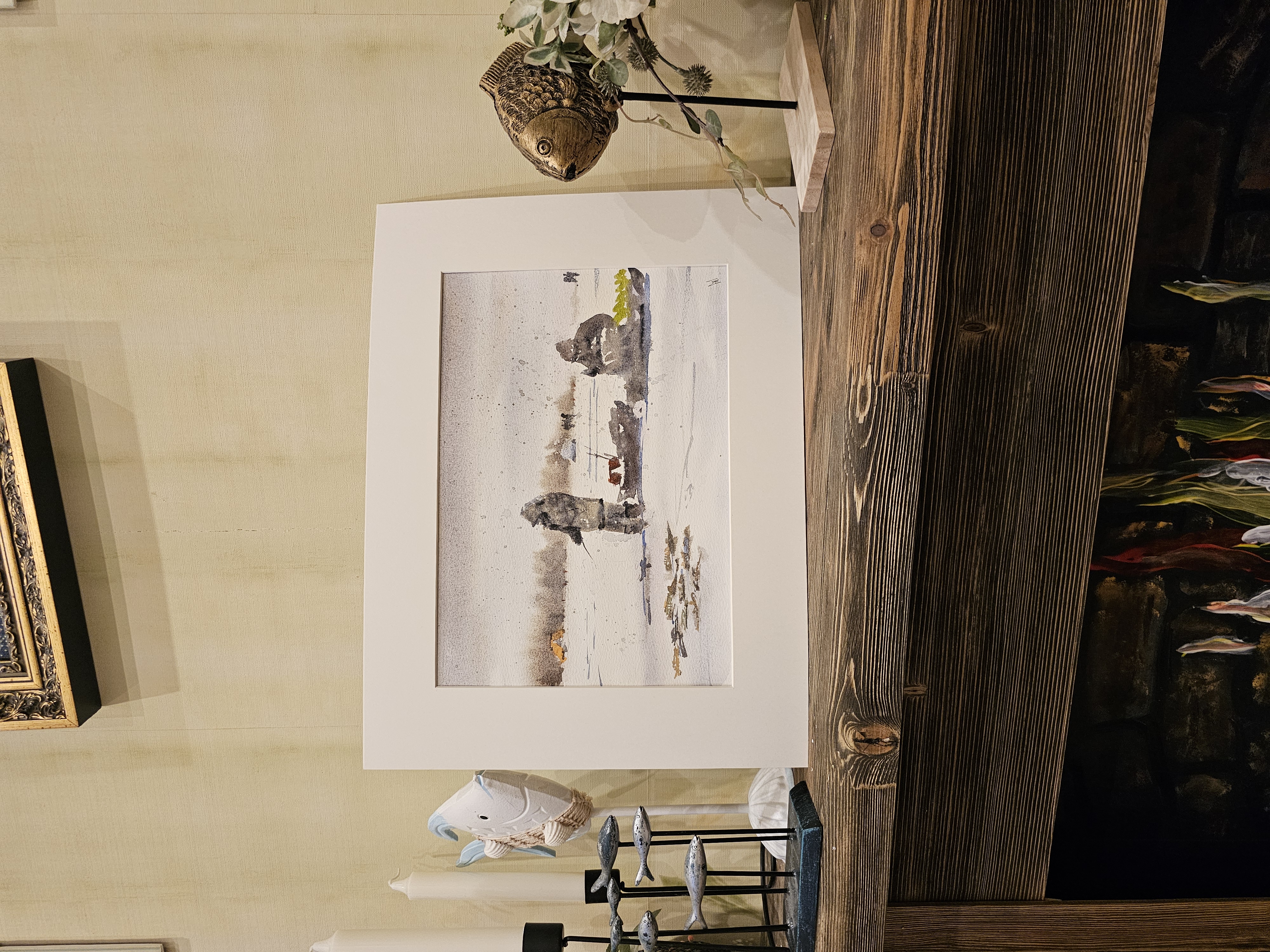 Нам представлена акварельная картина, на которой изображены два человека, занимающихся зимней рыбалкой на замерзшем водоеме. Один человек стоит с удочкой, а другой сидит рядом с санями, на которых находятся различные предметы, возможно, рыболовные принадлежности. На заднем плане виднеются деревья и несколько палаток других рыбаков. Работа оформлена в светлое паспарту и готова к размещению в стандартной раме 30*40 см.