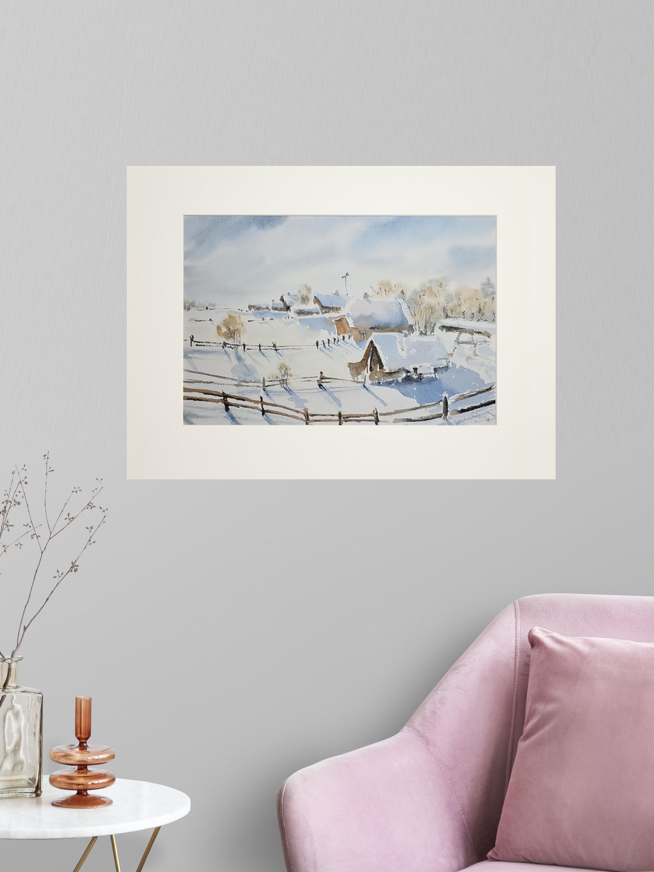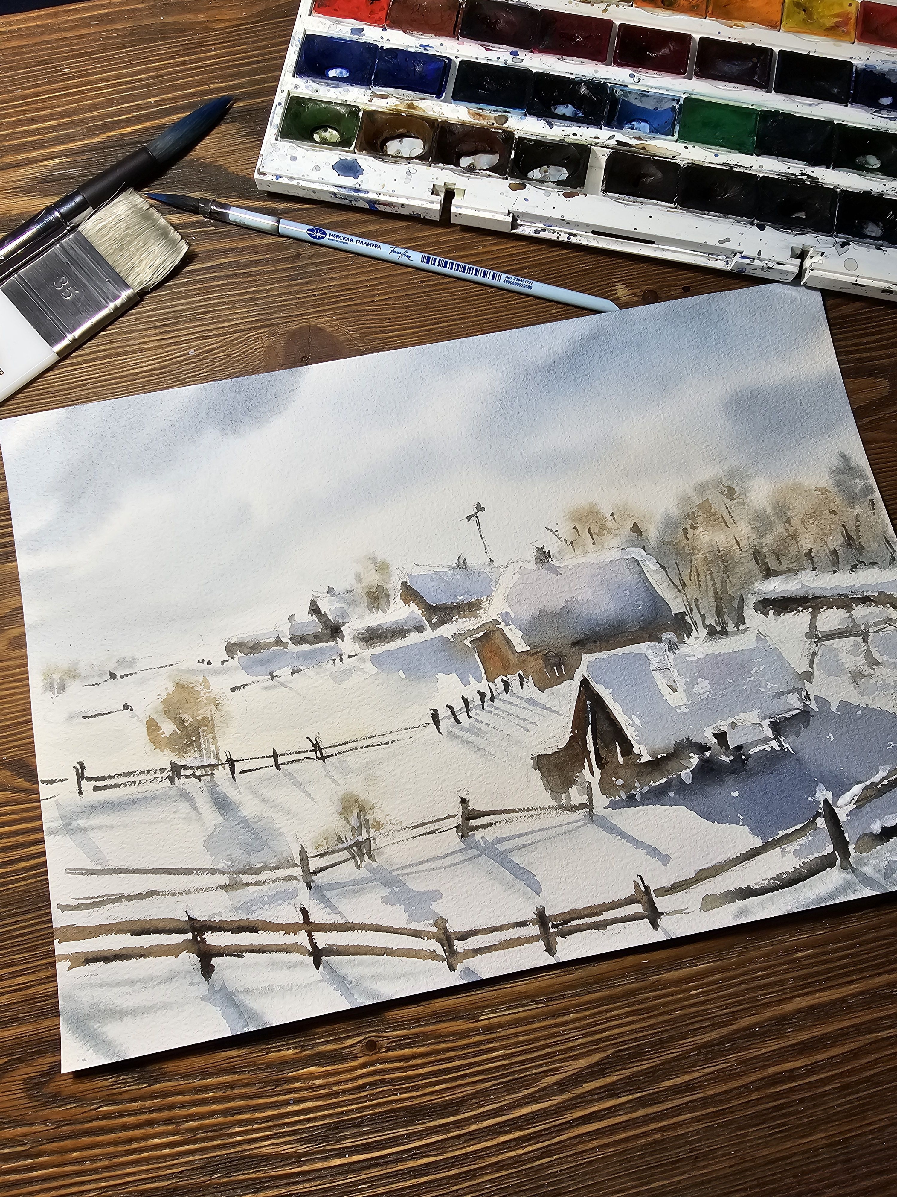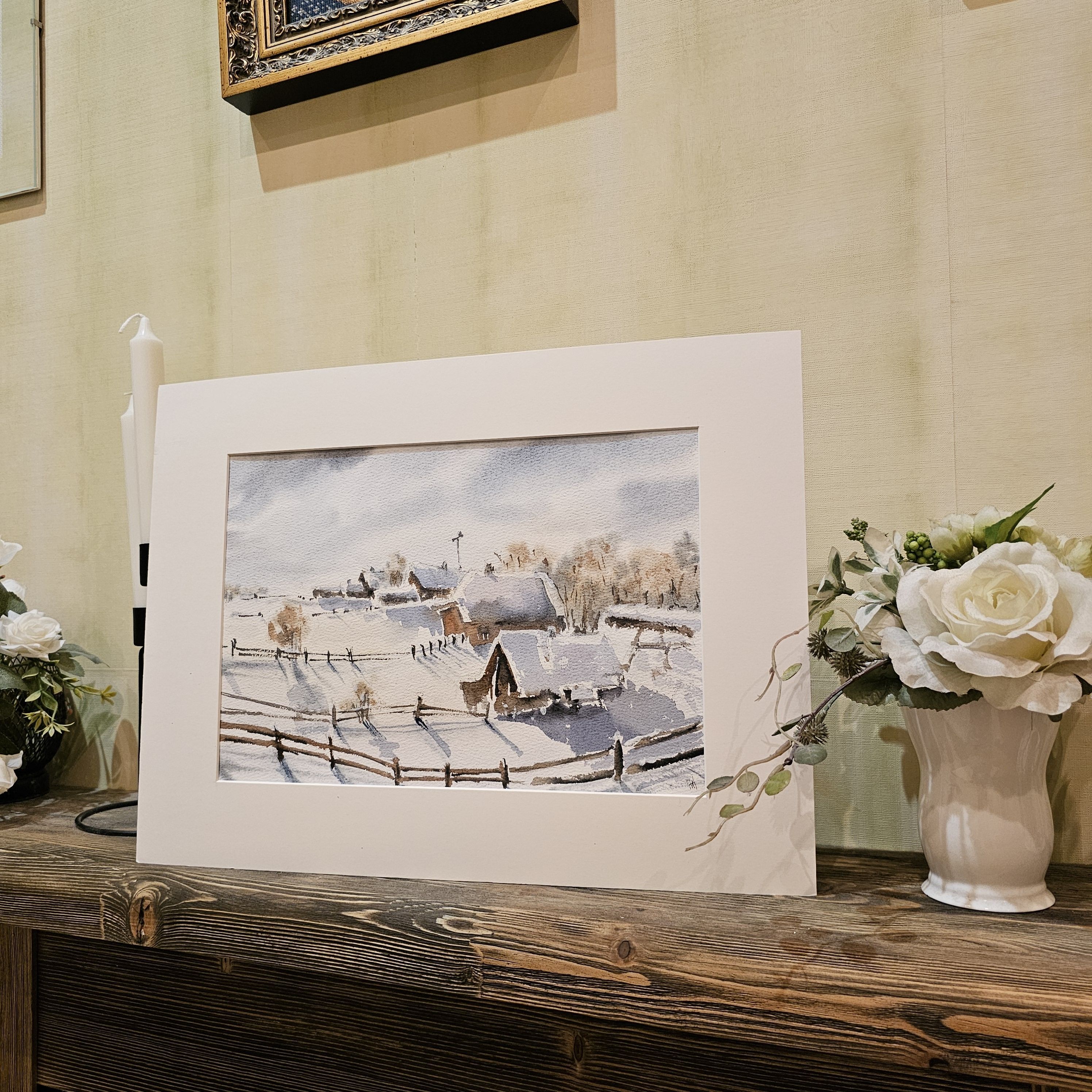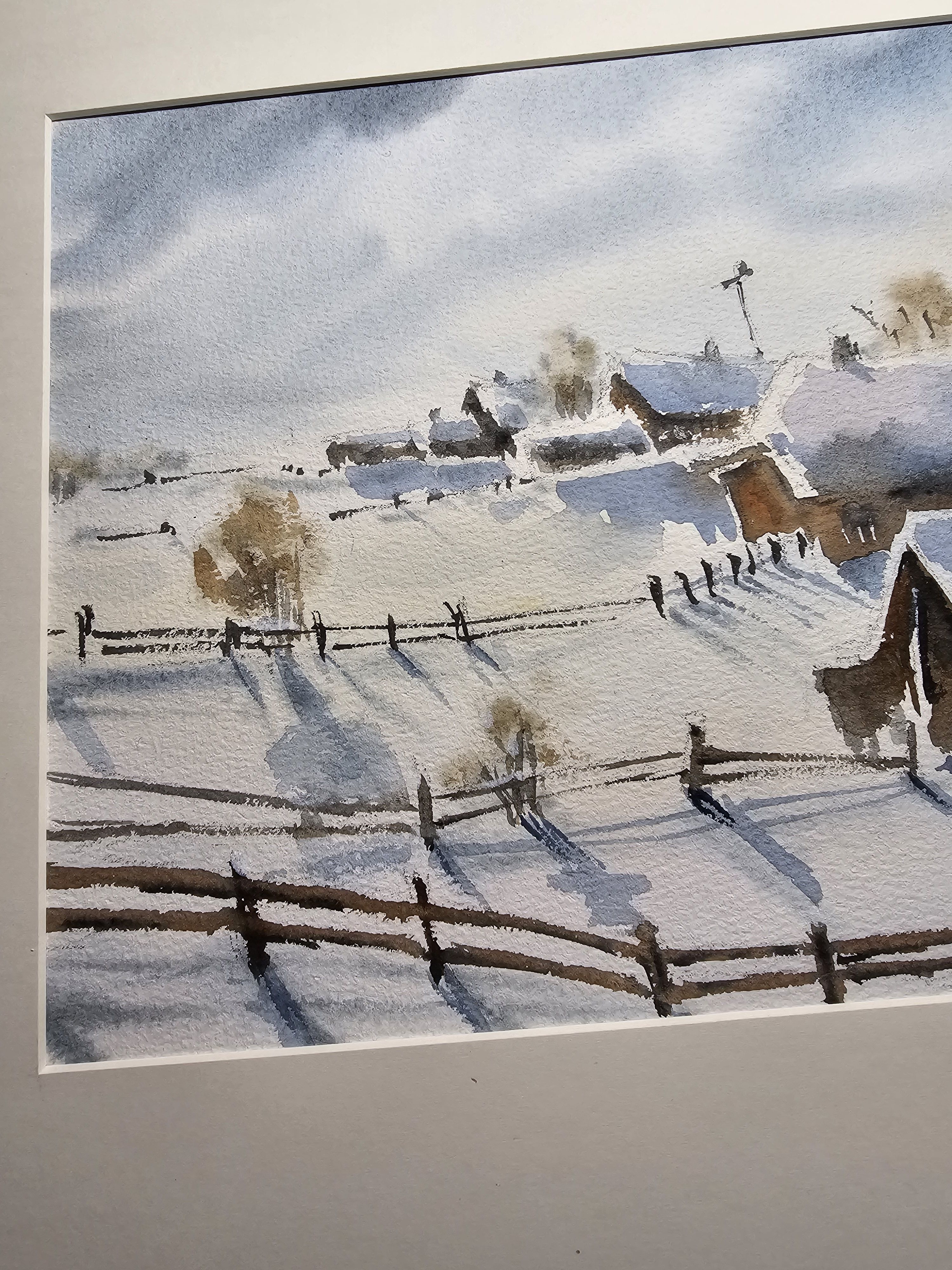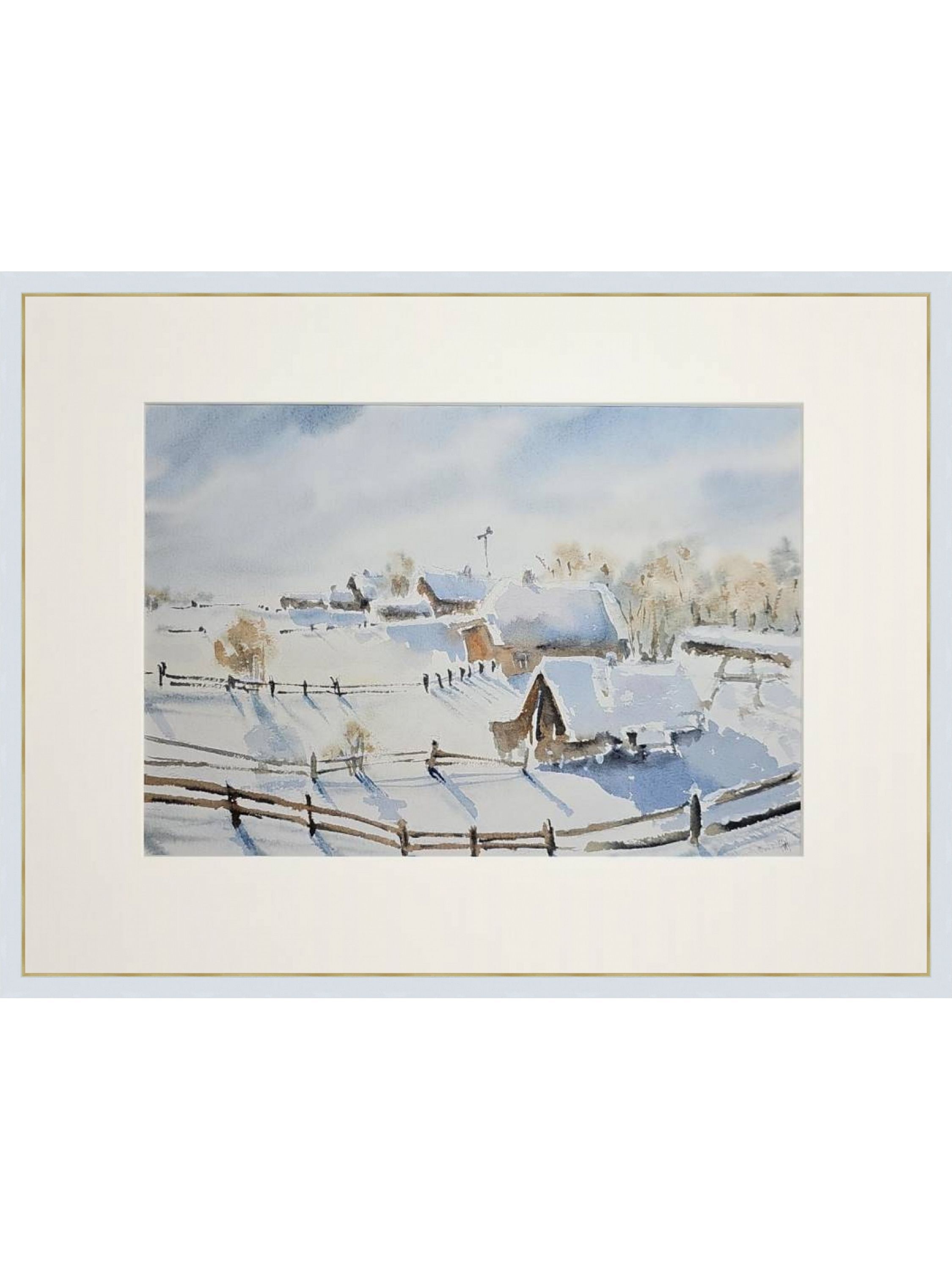 Нам представлено акварельное изображение зимнего сельского пейзажа. Видно несколько домов с заснеженными крышами, окруженные деревянным забором. Вся сцена укрыта снегом, создающим мягкую и спокойную атмосферу. На заднем плане видны деревья, частично покрытые снегом, что добавляет глубину композиции. Небо окрашено в светло-голубые и серые тона, что придает картине ощущение прохладного зимнего дня. Акварель оформлена в светлое паспарту, что позволяет вставить ее в раму любого цвета.