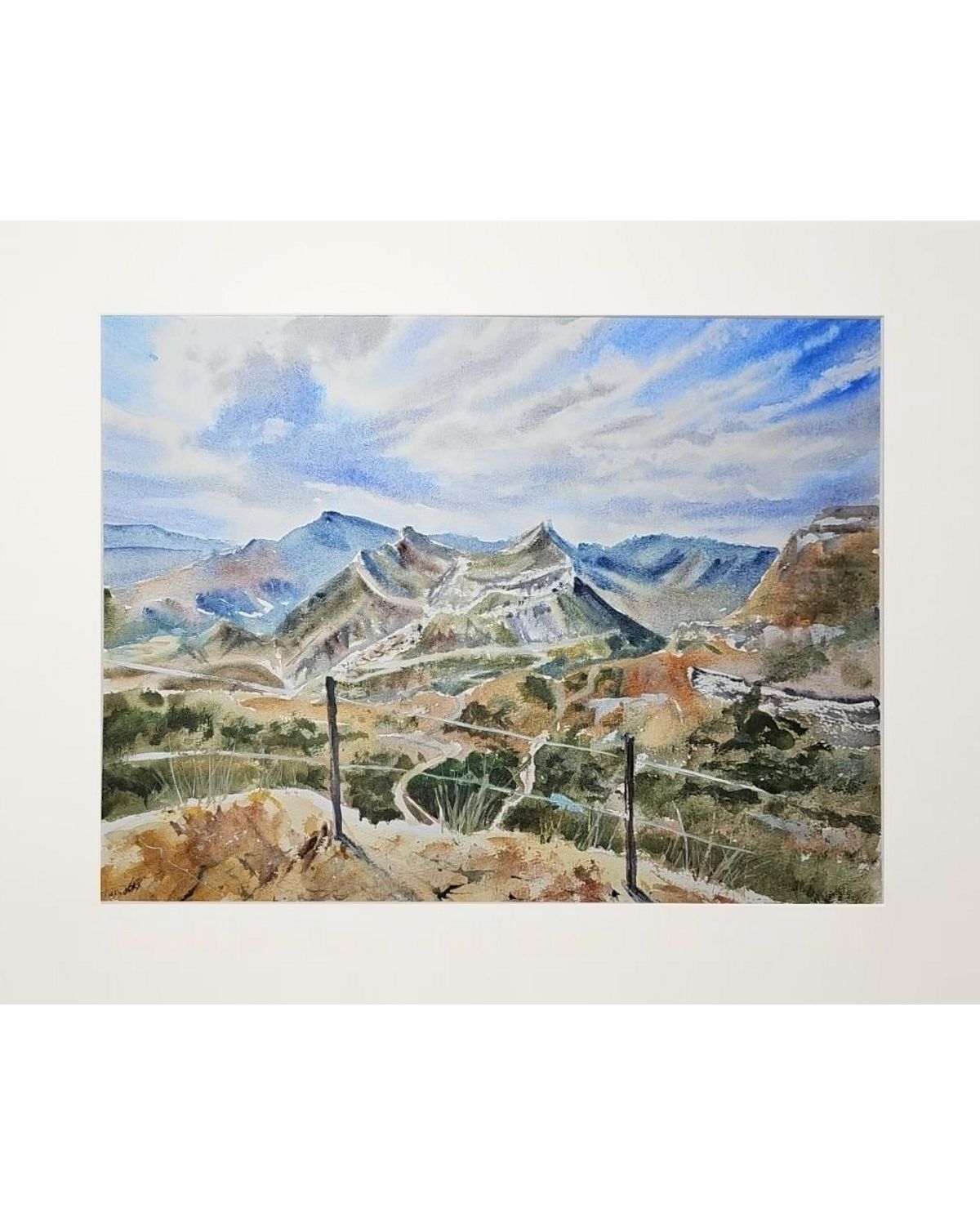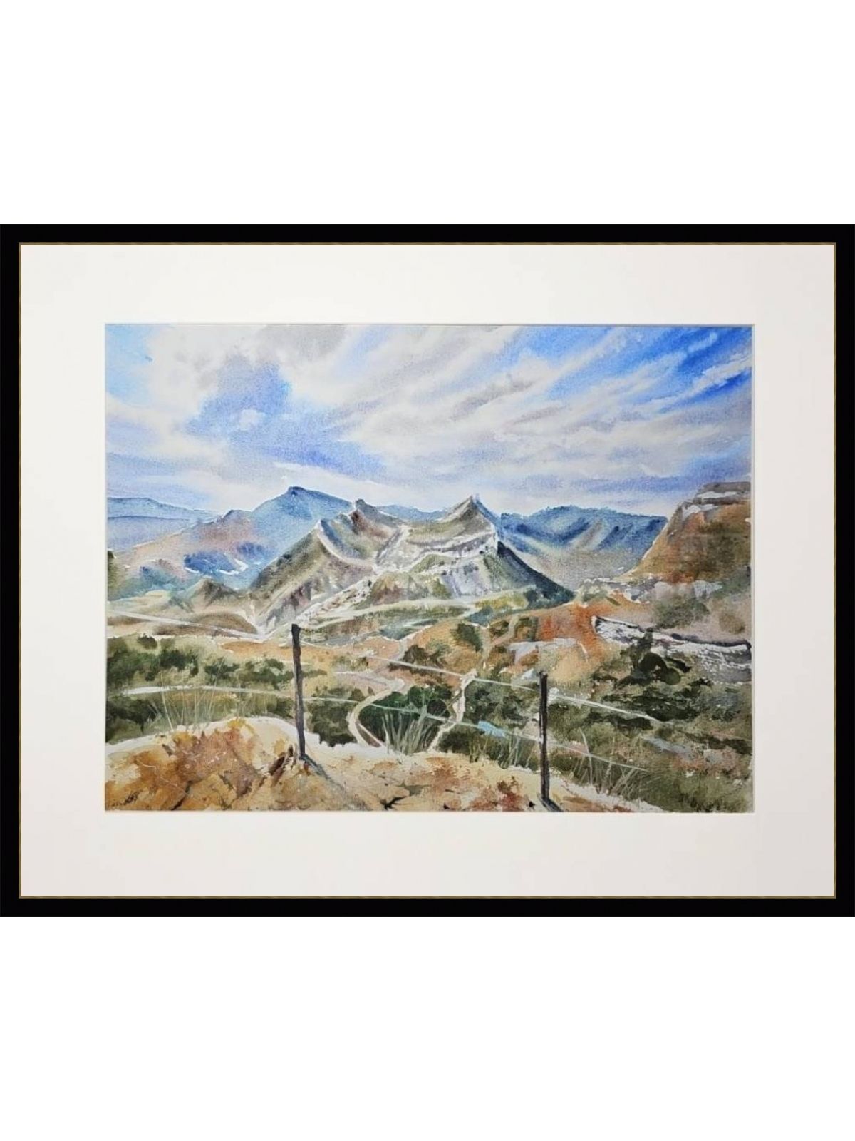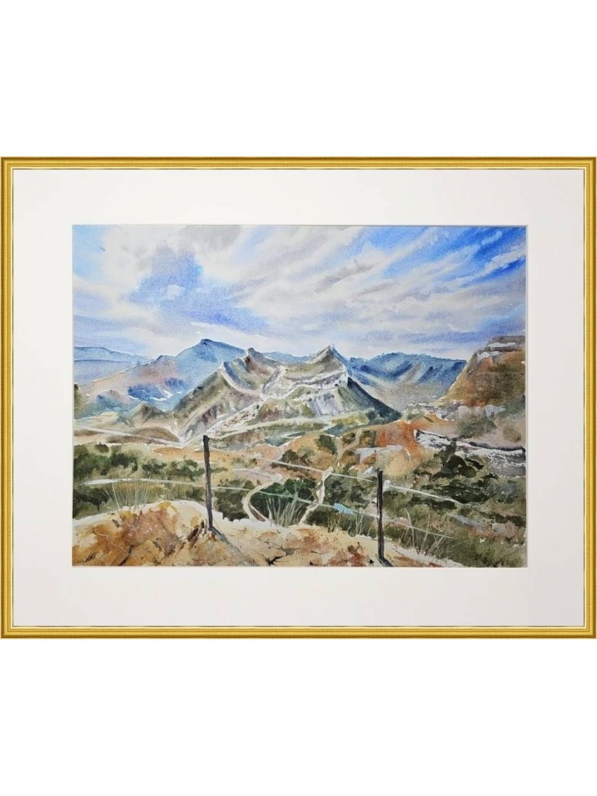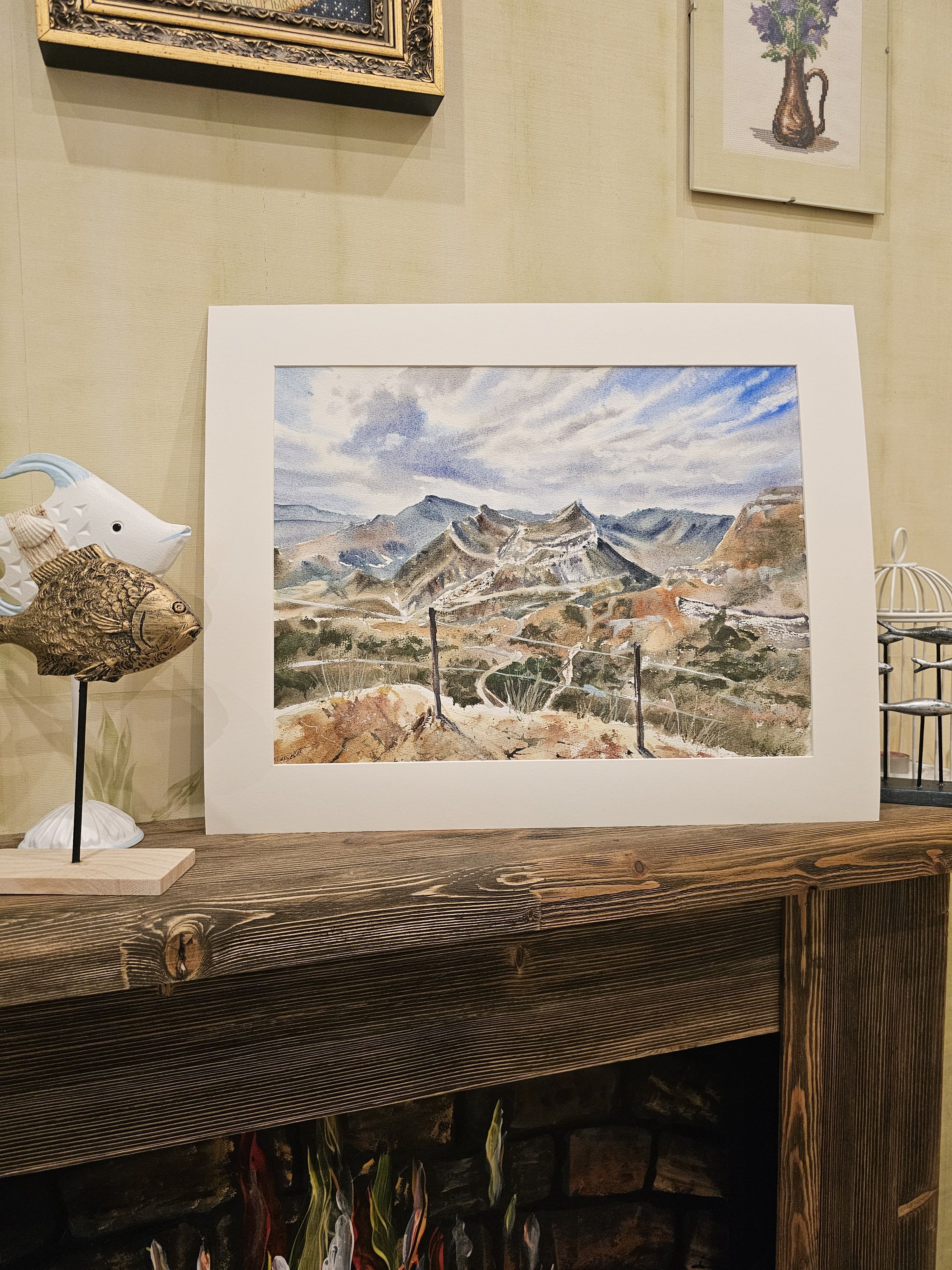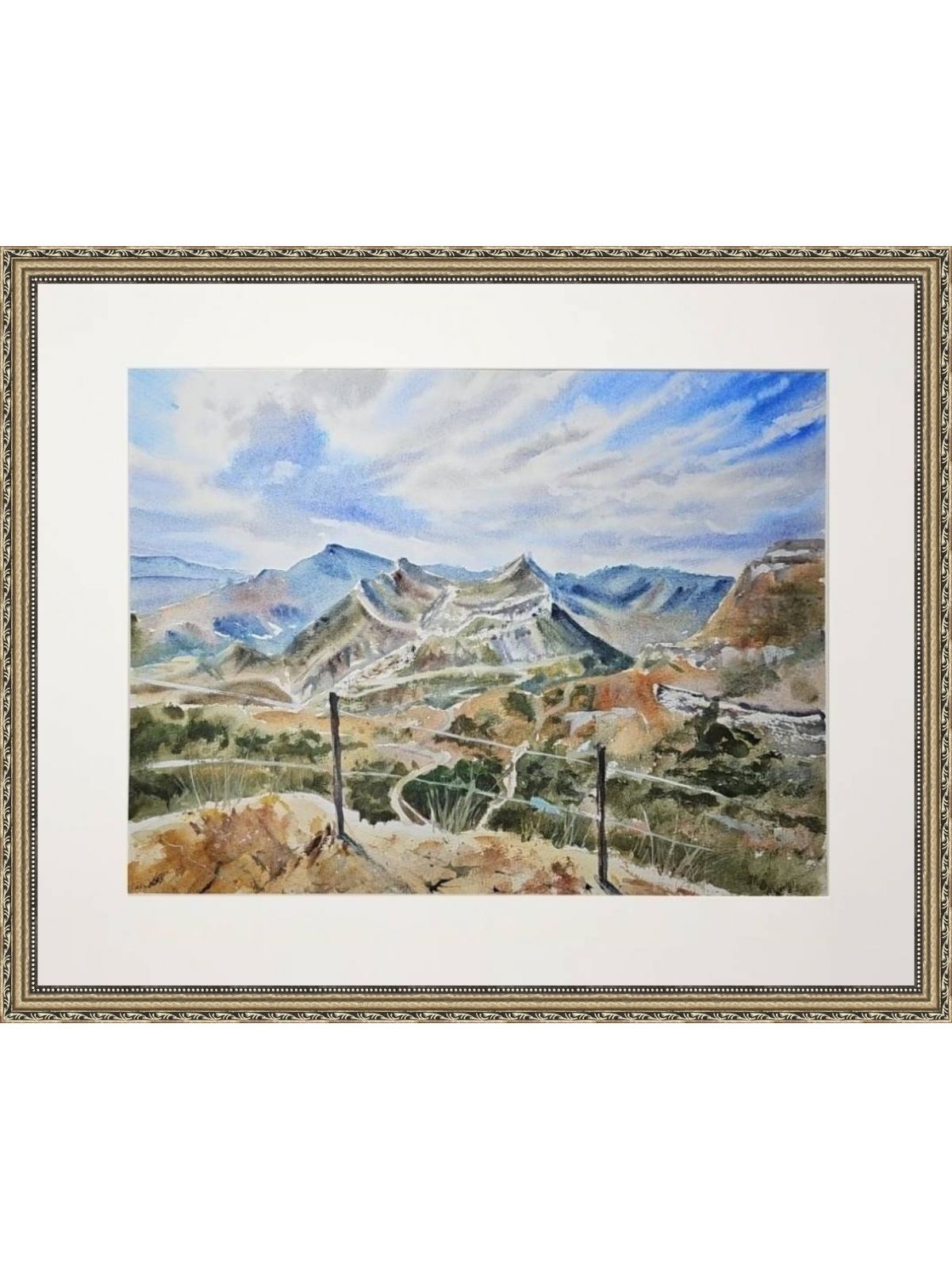 Нам представлен пейзаж. На переднем плане изображены природные элементы, такие как камни и растительность. Зеленые и коричневые оттенки деревьев в сочетании с более светлыми цветовыми акцентами создают гармонию. На заднем плане видны горы, расположенные под голубым небом с белыми облаками. Горы изображены в сине-серой цветовой гамме, показывая их удаленность и масштаб. Небо занимает значительную часть изображения, создавая эффект глубины. В целом, картина передает умиротворение и естественную красоту природы. Картина оформлена в светлое паспарту и готова к оформлению в раму стандартного размера.