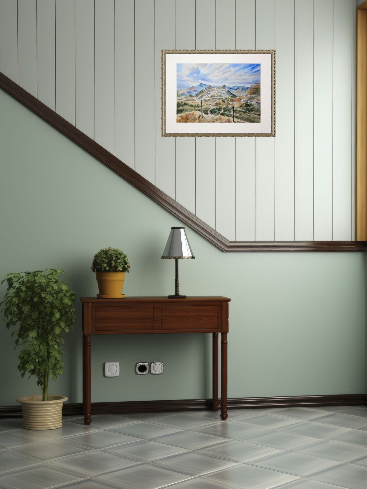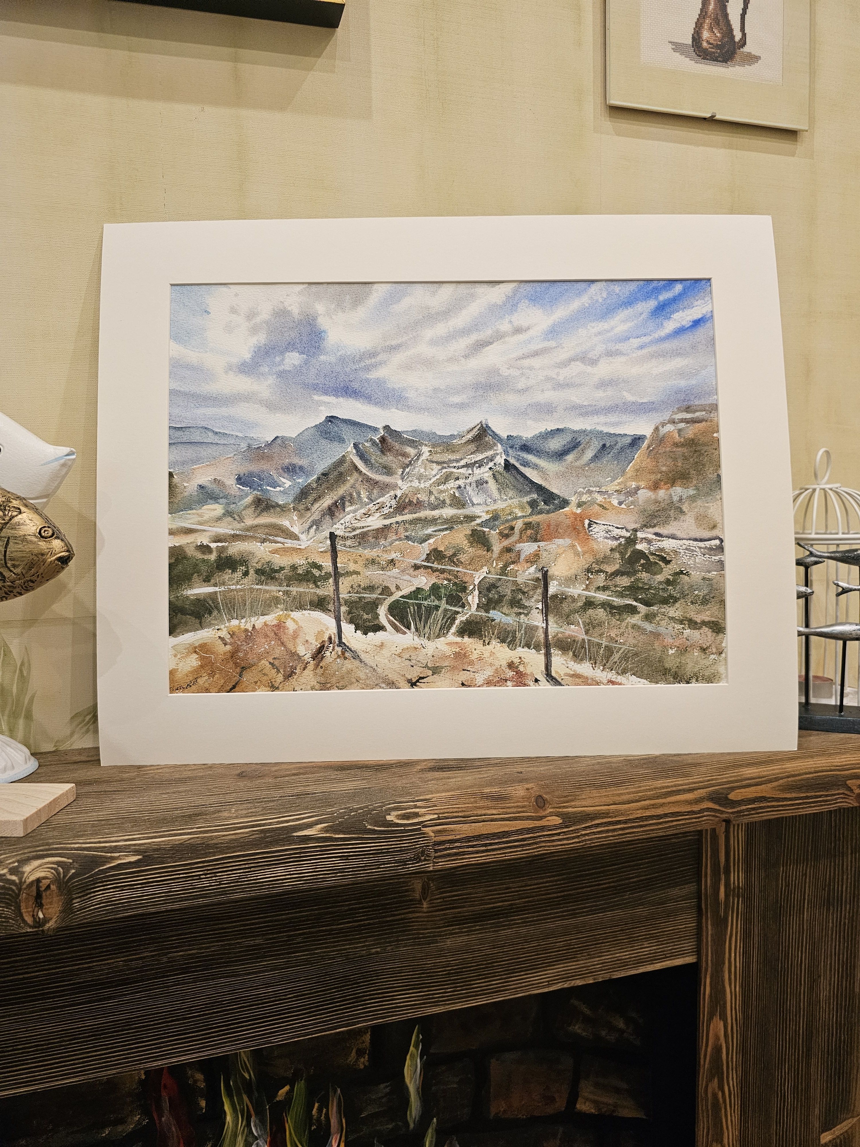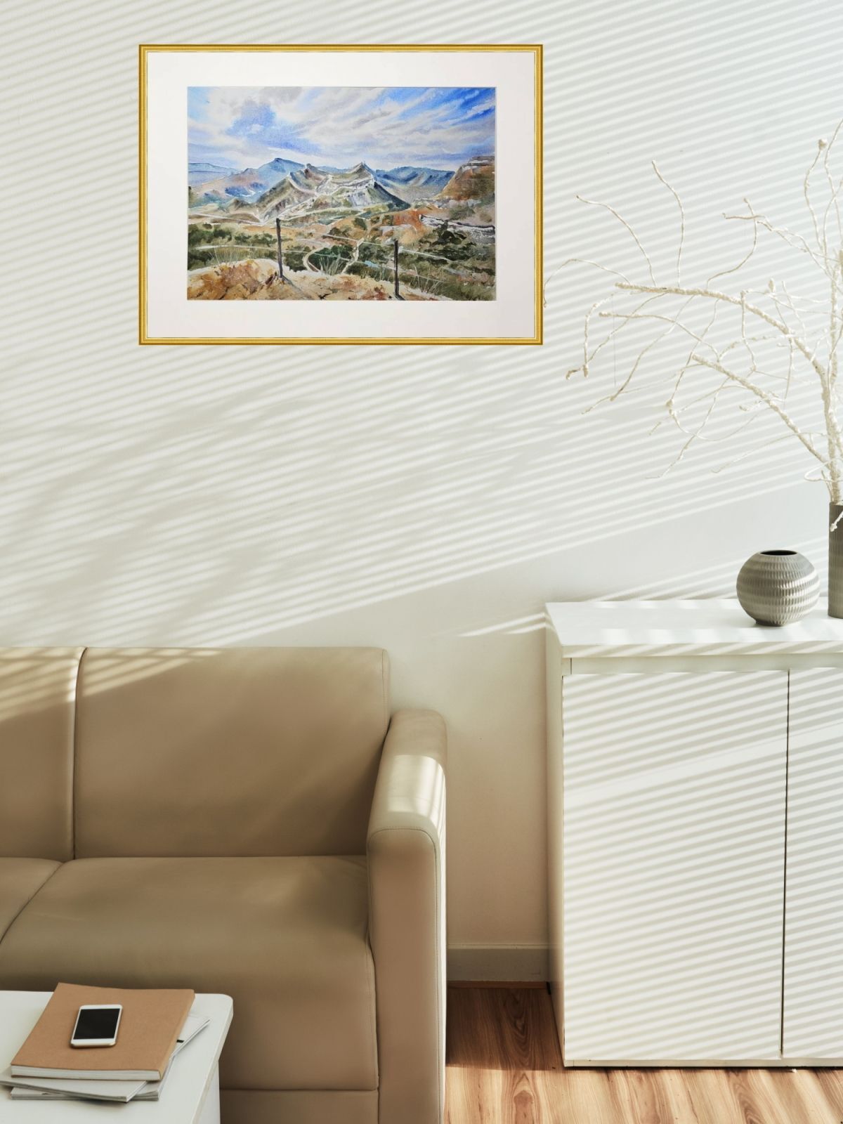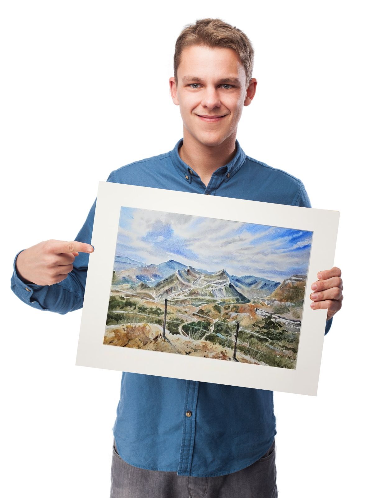 Нам представлен пейзаж. На переднем плане изображены природные элементы, такие как камни и растительность. Зеленые и коричневые оттенки деревьев в сочетании с более светлыми цветовыми акцентами создают гармонию. На заднем плане видны горы, расположенные под голубым небом с белыми облаками. Горы изображены в сине-серой цветовой гамме, показывая их удаленность и масштаб. Небо занимает значительную часть изображения, создавая эффект глубины. В целом, картина передает умиротворение и естественную красоту природы. Картина оформлена в светлое паспарту и готова к оформлению в раму стандартного размера.