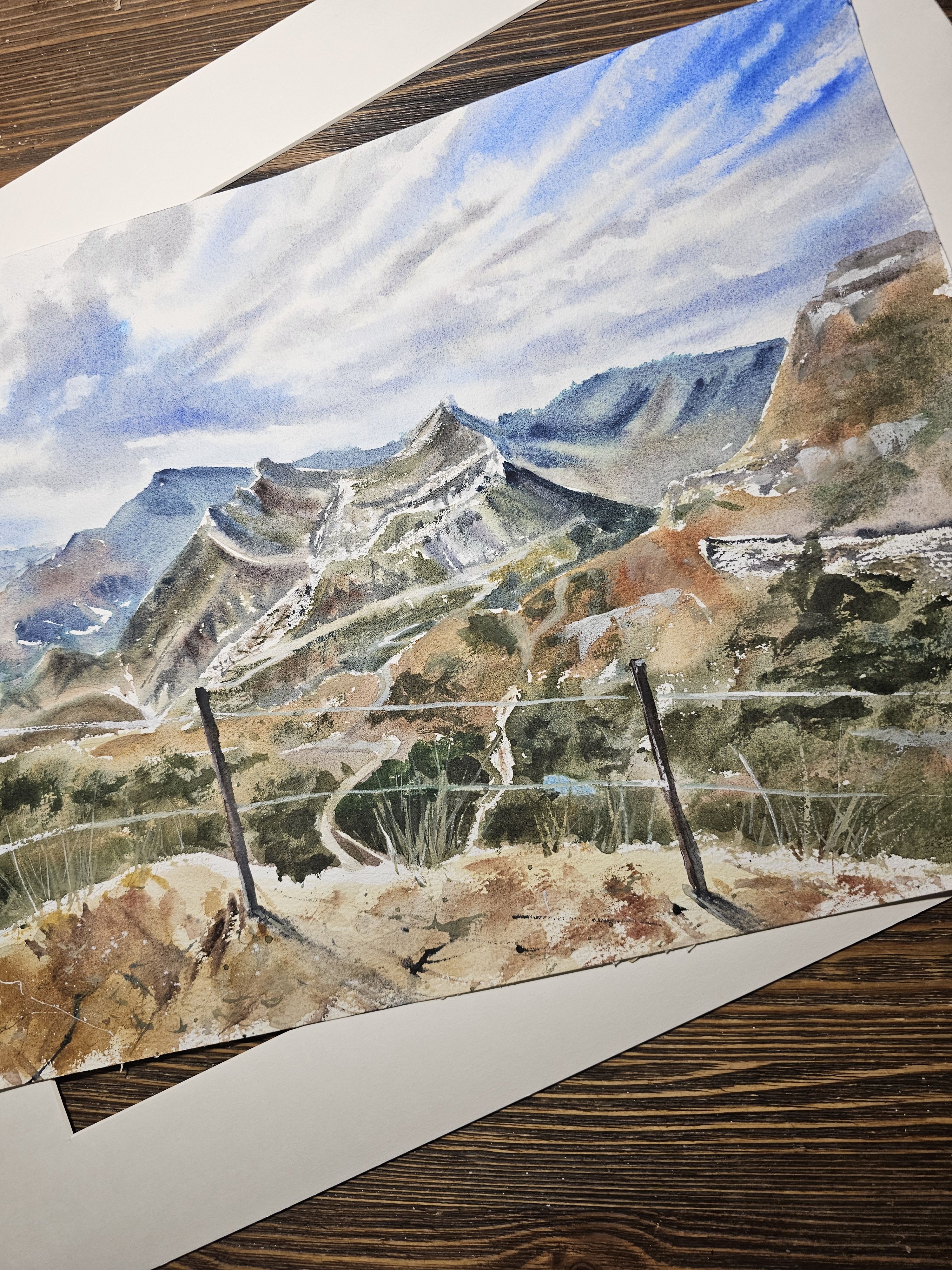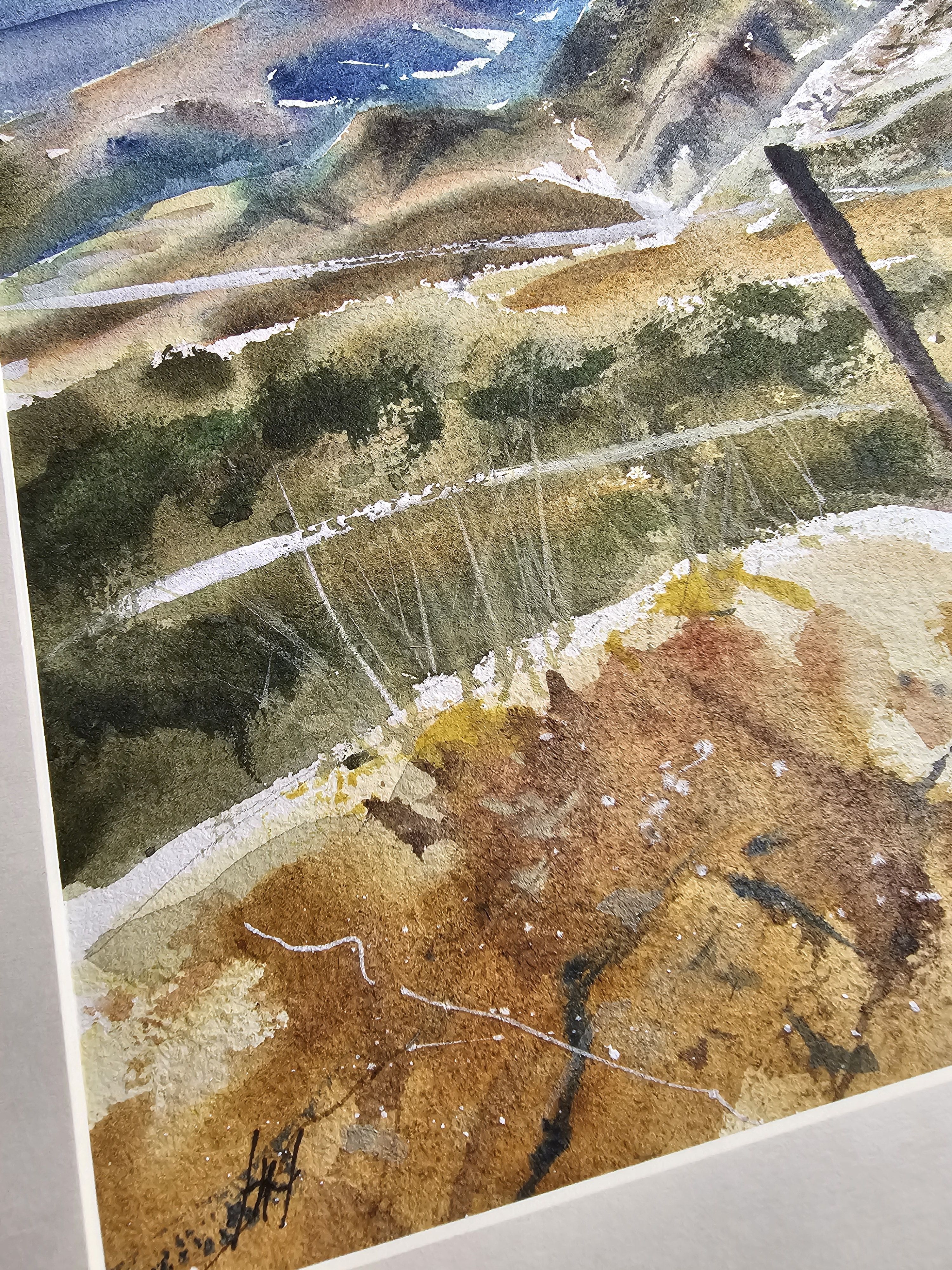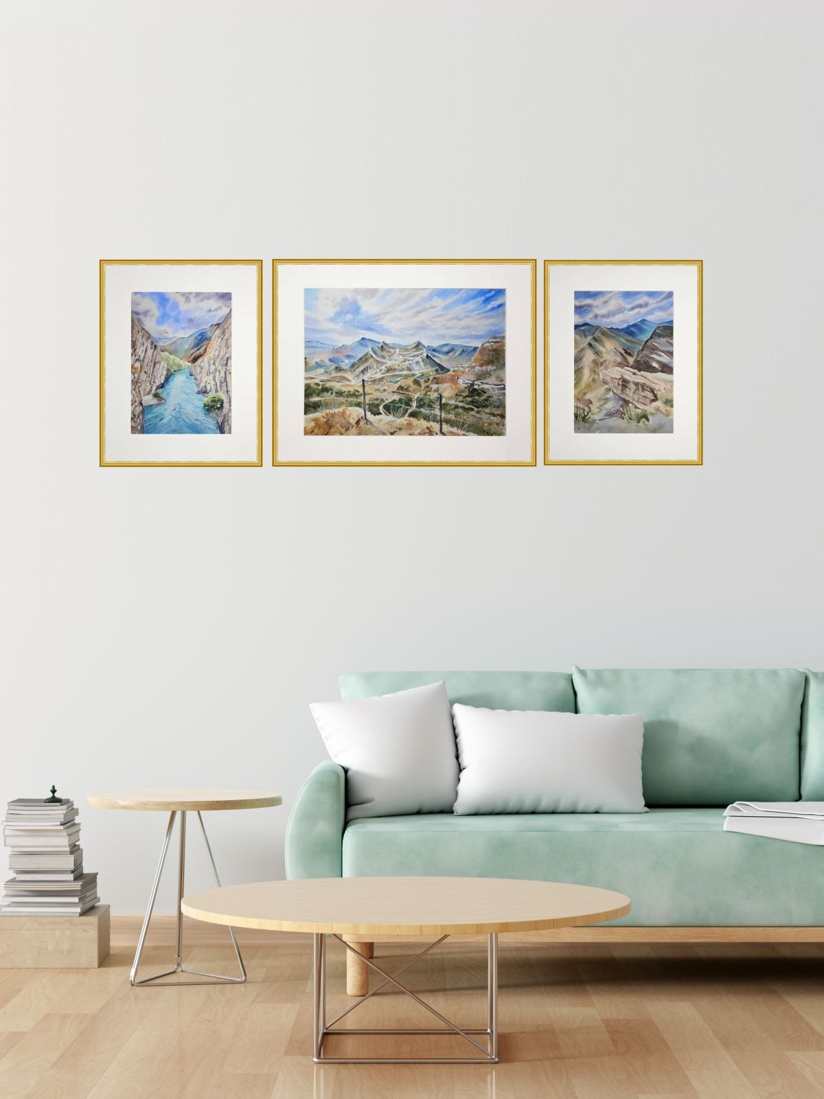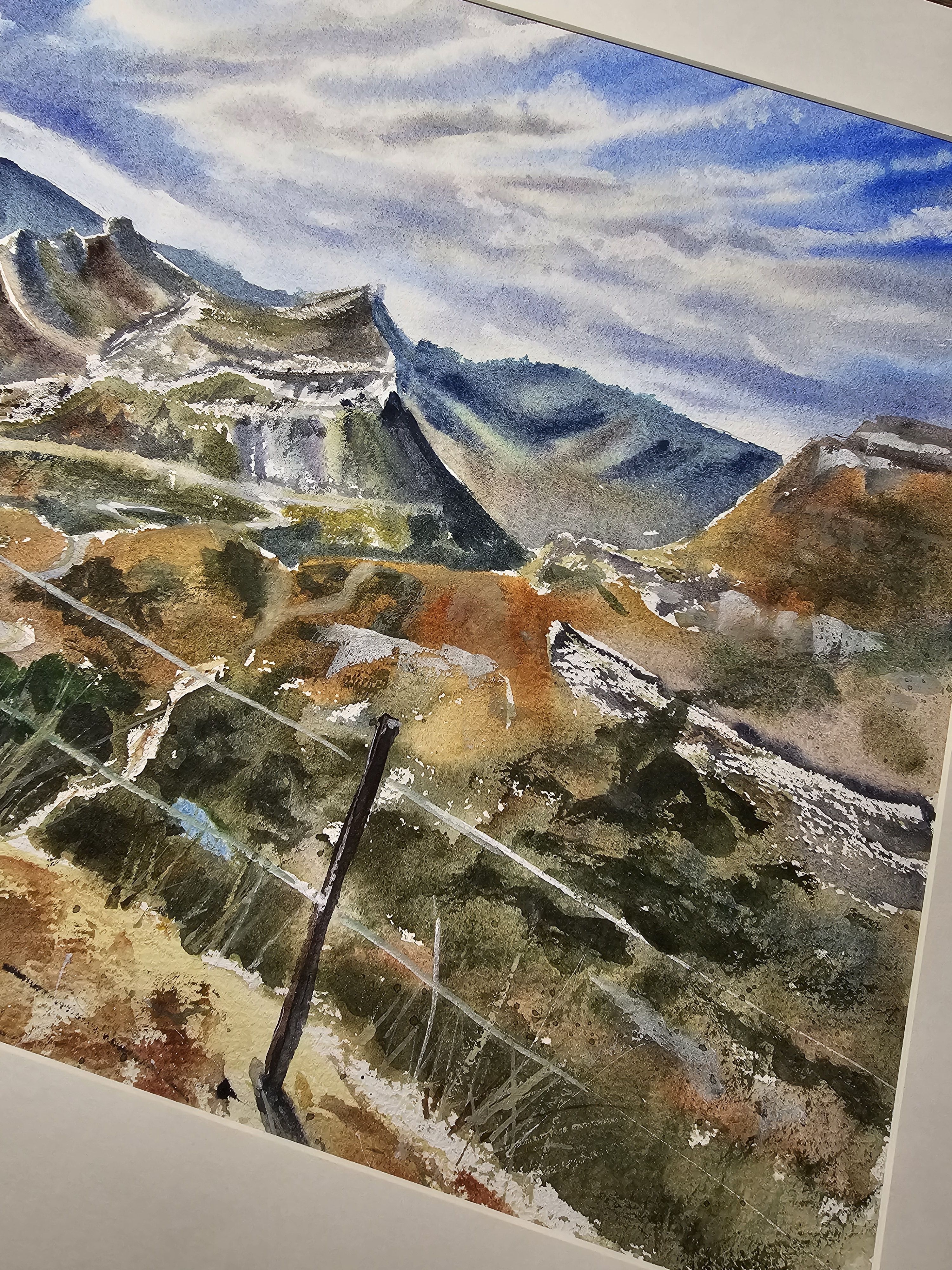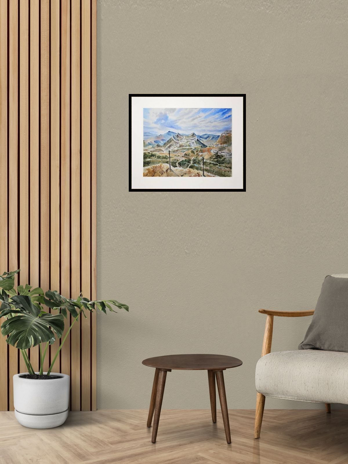Нам представлен пейзаж. На переднем плане изображены природные элементы, такие как камни и растительность. Зеленые и коричневые оттенки деревьев в сочетании с более светлыми цветовыми акцентами создают гармонию. На заднем плане видны горы, расположенные под голубым небом с белыми облаками. Горы изображены в сине-серой цветовой гамме, показывая их удаленность и масштаб. Небо занимает значительную часть изображения, создавая эффект глубины. В целом, картина передает умиротворение и естественную красоту природы. Картина оформлена в светлое паспарту и готова к оформлению в раму стандартного размера.