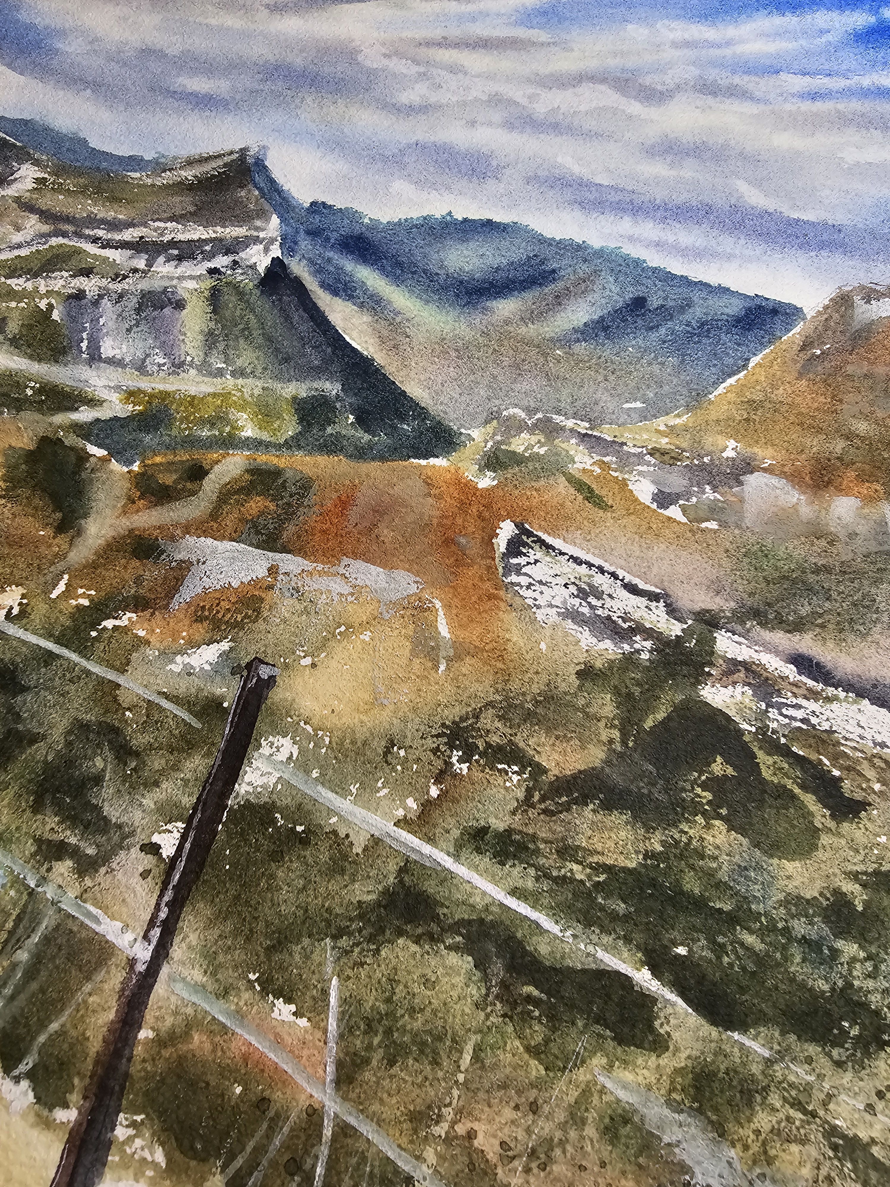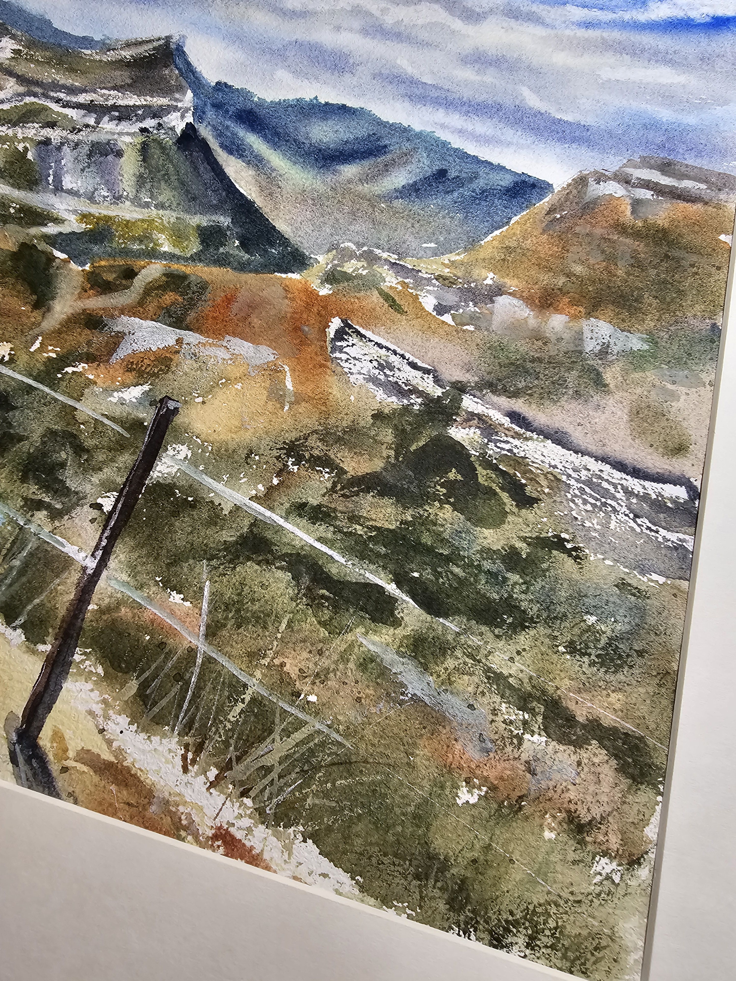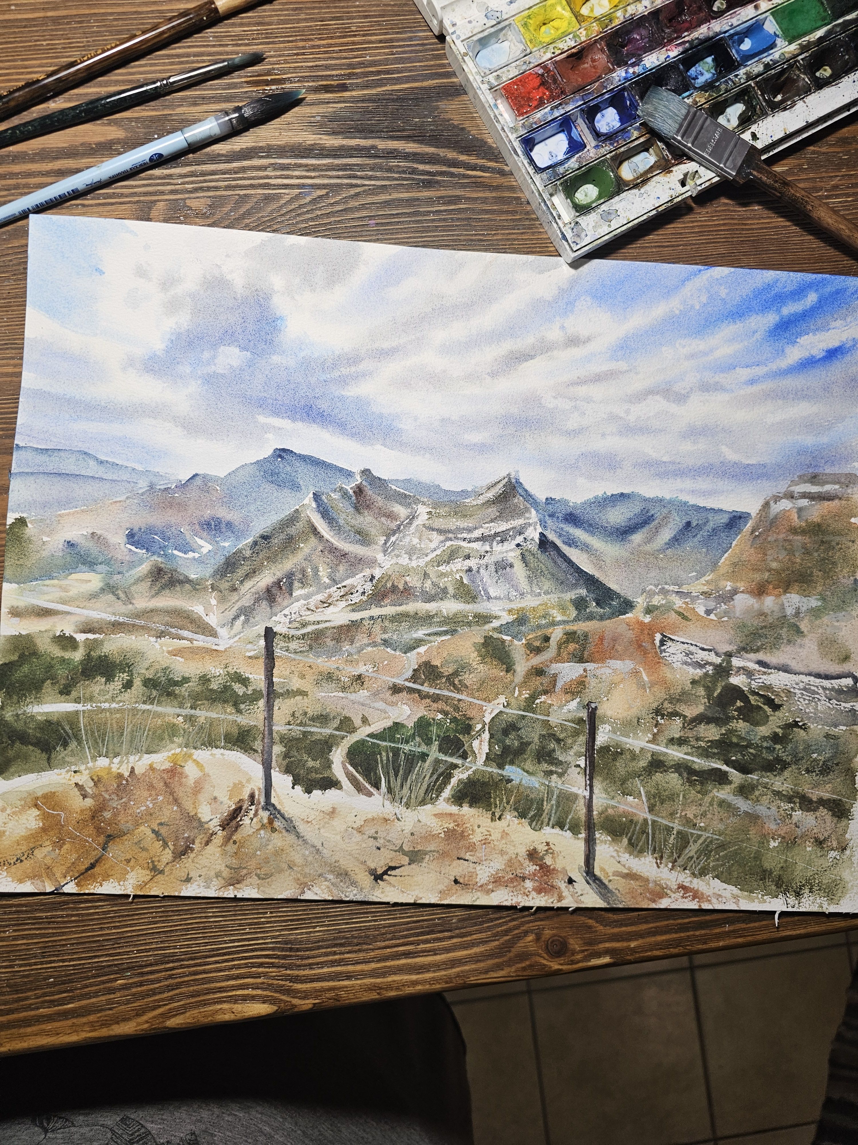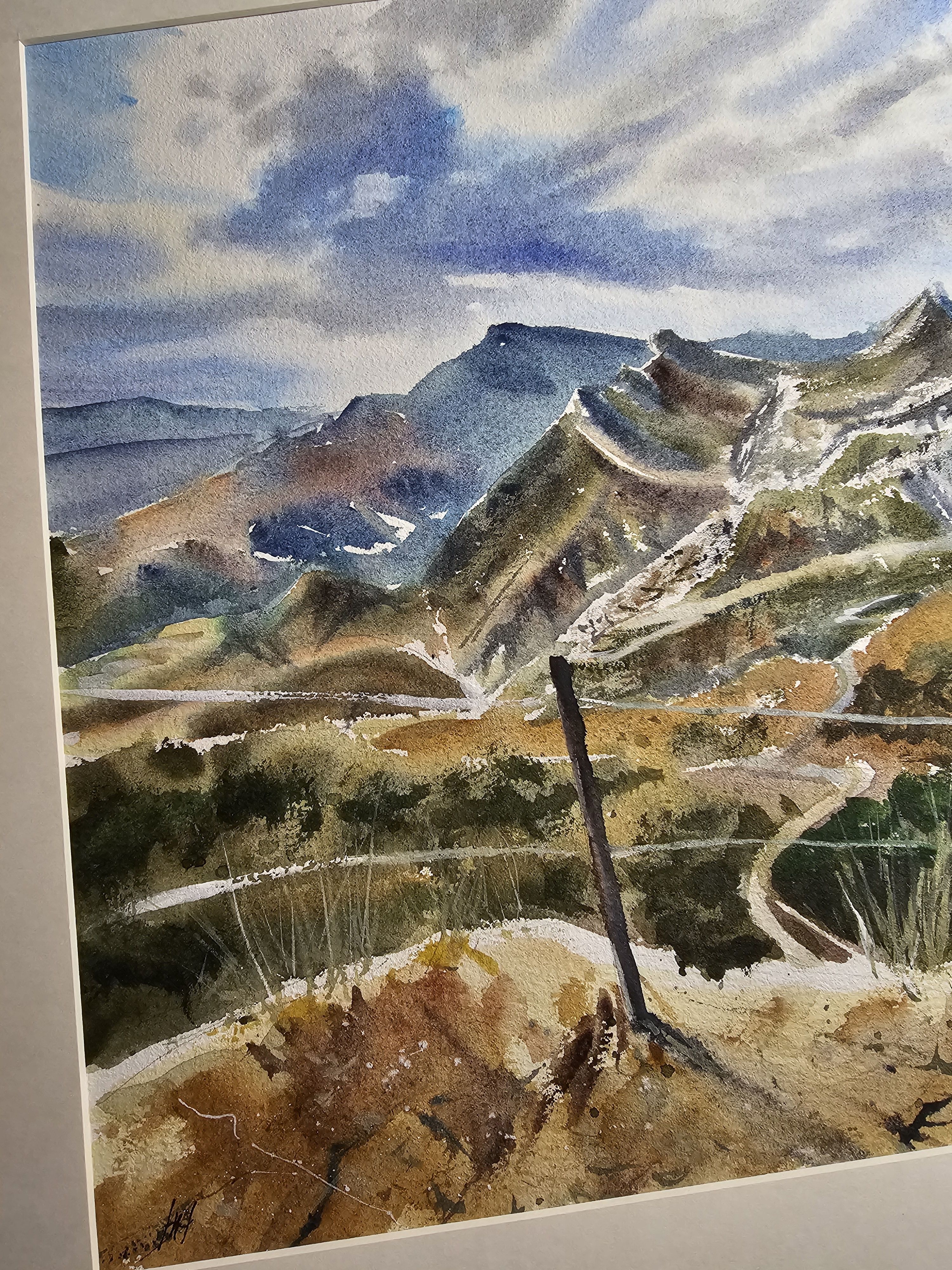 Нам представлен пейзаж. На переднем плане изображены природные элементы, такие как камни и растительность. Зеленые и коричневые оттенки деревьев в сочетании с более светлыми цветовыми акцентами создают гармонию. На заднем плане видны горы, расположенные под голубым небом с белыми облаками. Горы изображены в сине-серой цветовой гамме, показывая их удаленность и масштаб. Небо занимает значительную часть изображения, создавая эффект глубины. В целом, картина передает умиротворение и естественную красоту природы. Картина оформлена в светлое паспарту и готова к оформлению в раму стандартного размера.