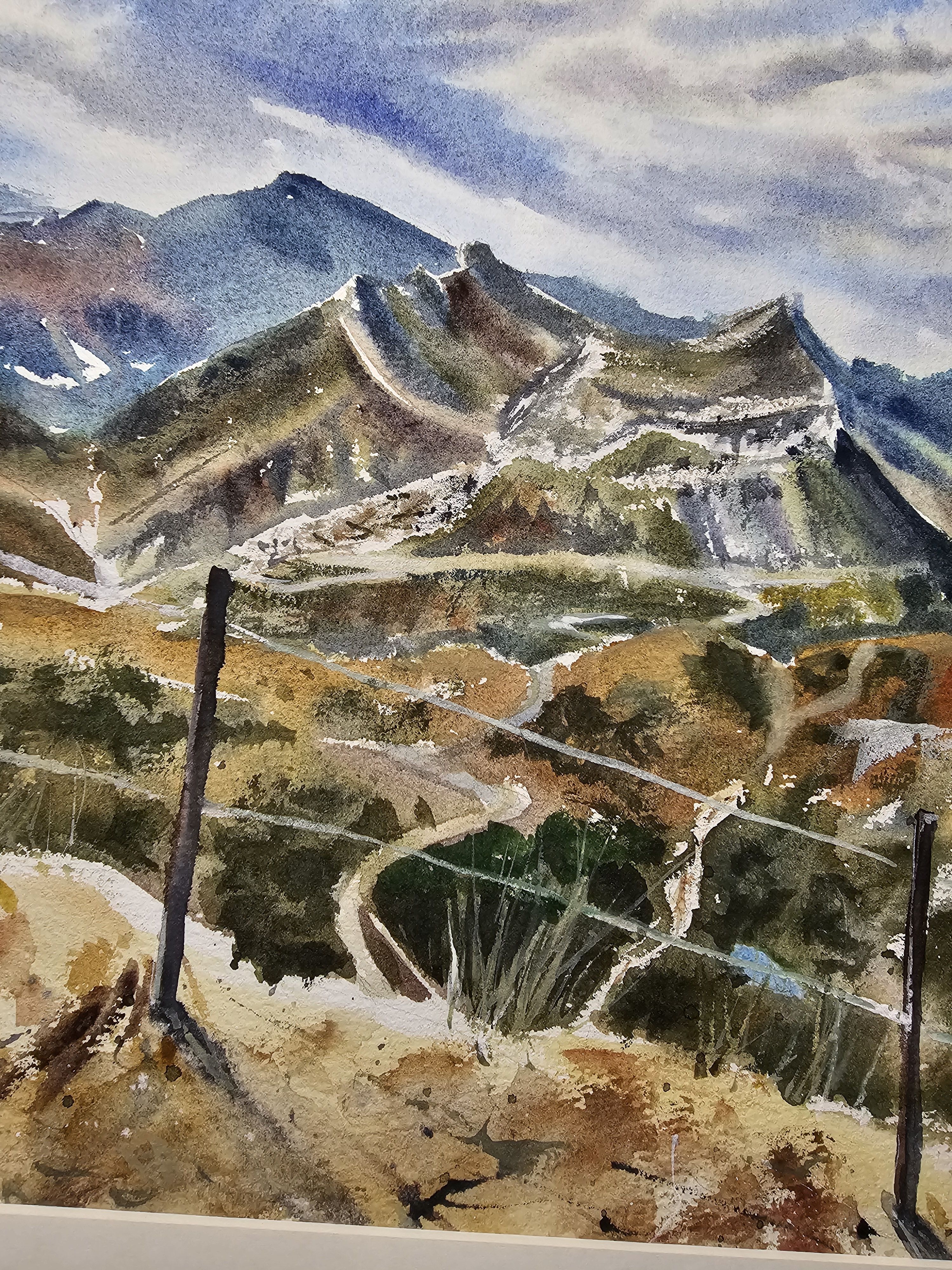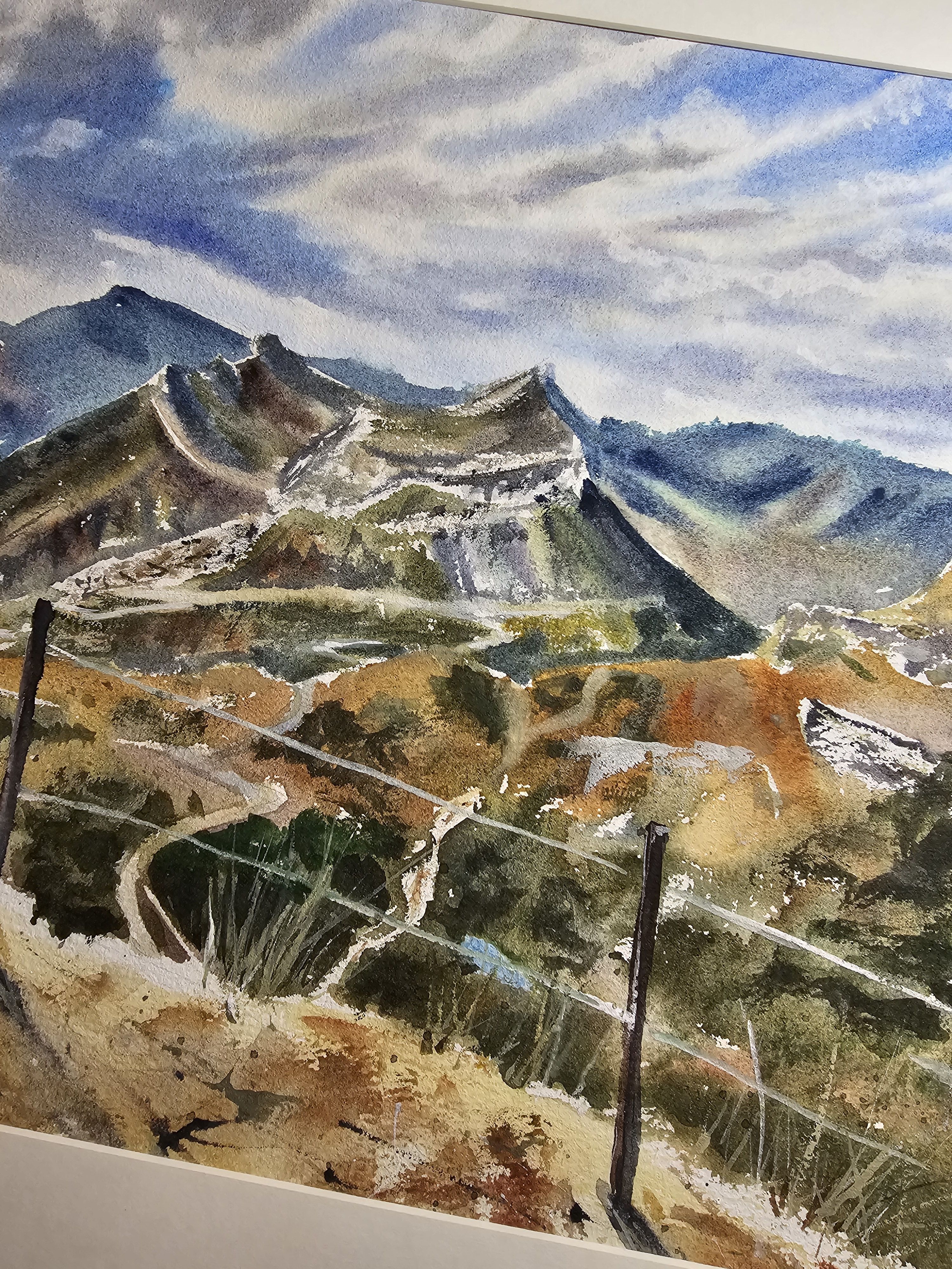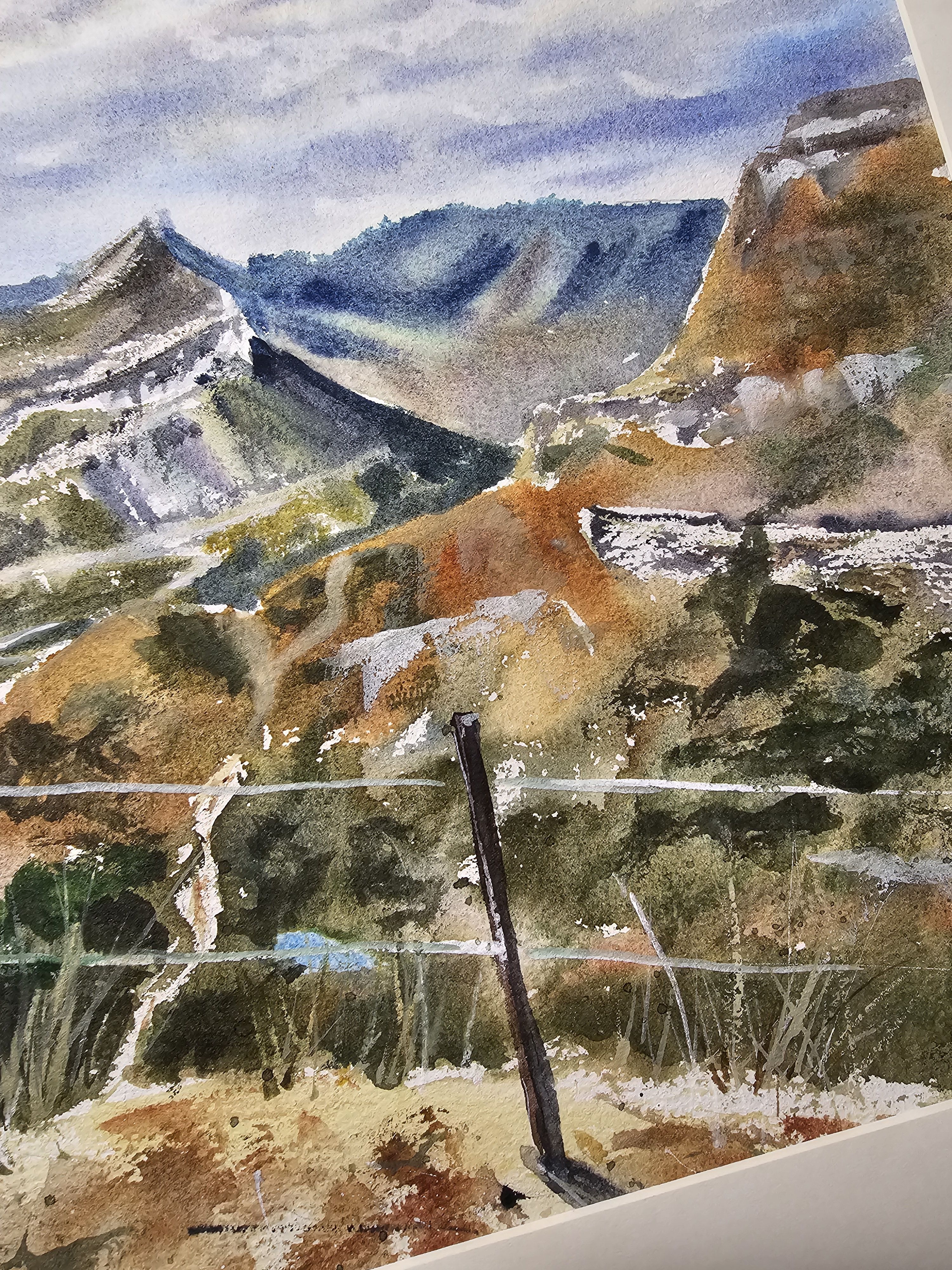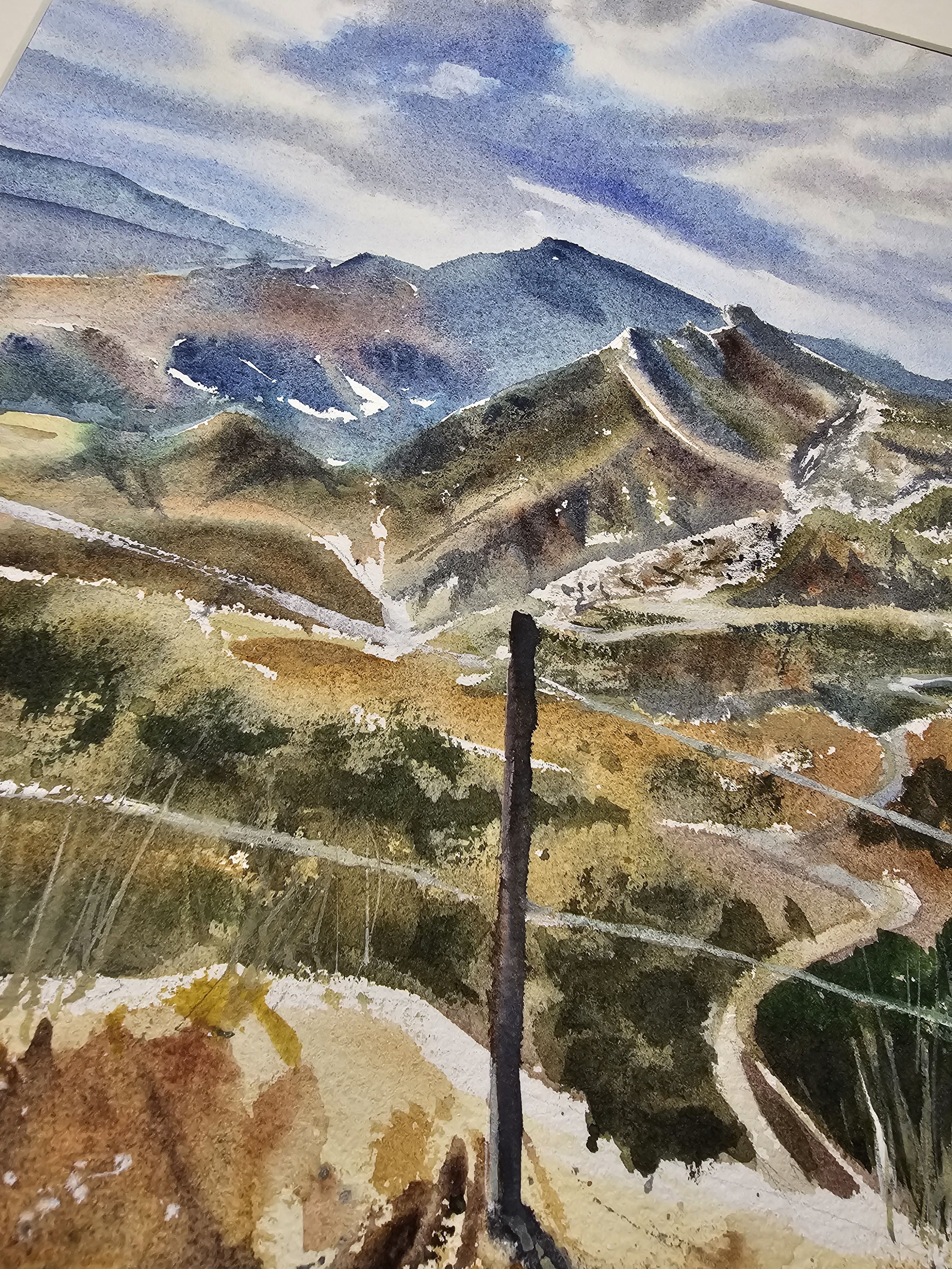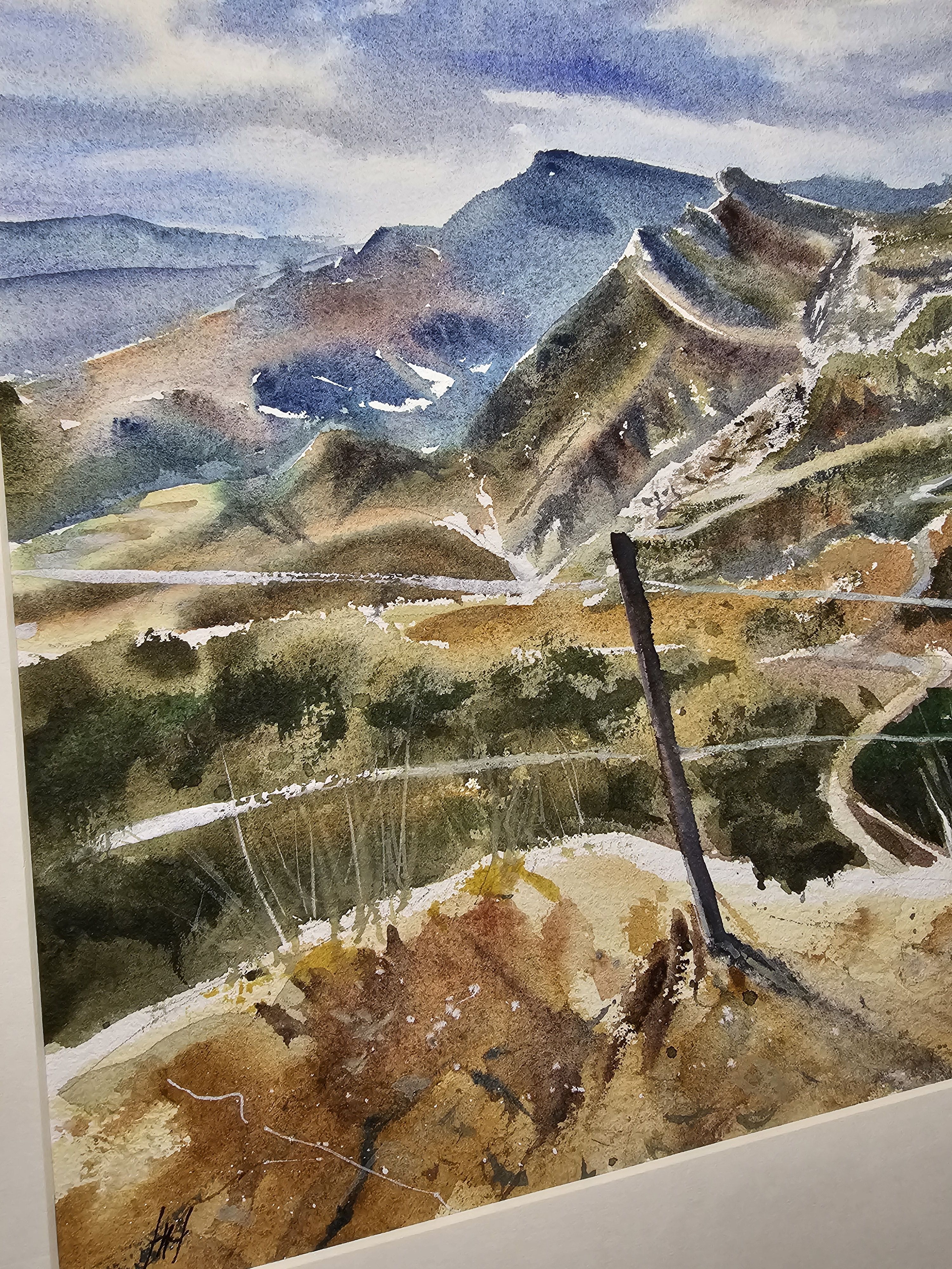 Нам представлен пейзаж. На переднем плане изображены природные элементы, такие как камни и растительность. Зеленые и коричневые оттенки деревьев в сочетании с более светлыми цветовыми акцентами создают гармонию. На заднем плане видны горы, расположенные под голубым небом с белыми облаками. Горы изображены в сине-серой цветовой гамме, показывая их удаленность и масштаб. Небо занимает значительную часть изображения, создавая эффект глубины. В целом, картина передает умиротворение и естественную красоту природы. Картина оформлена в светлое паспарту и готова к оформлению в раму стандартного размера.