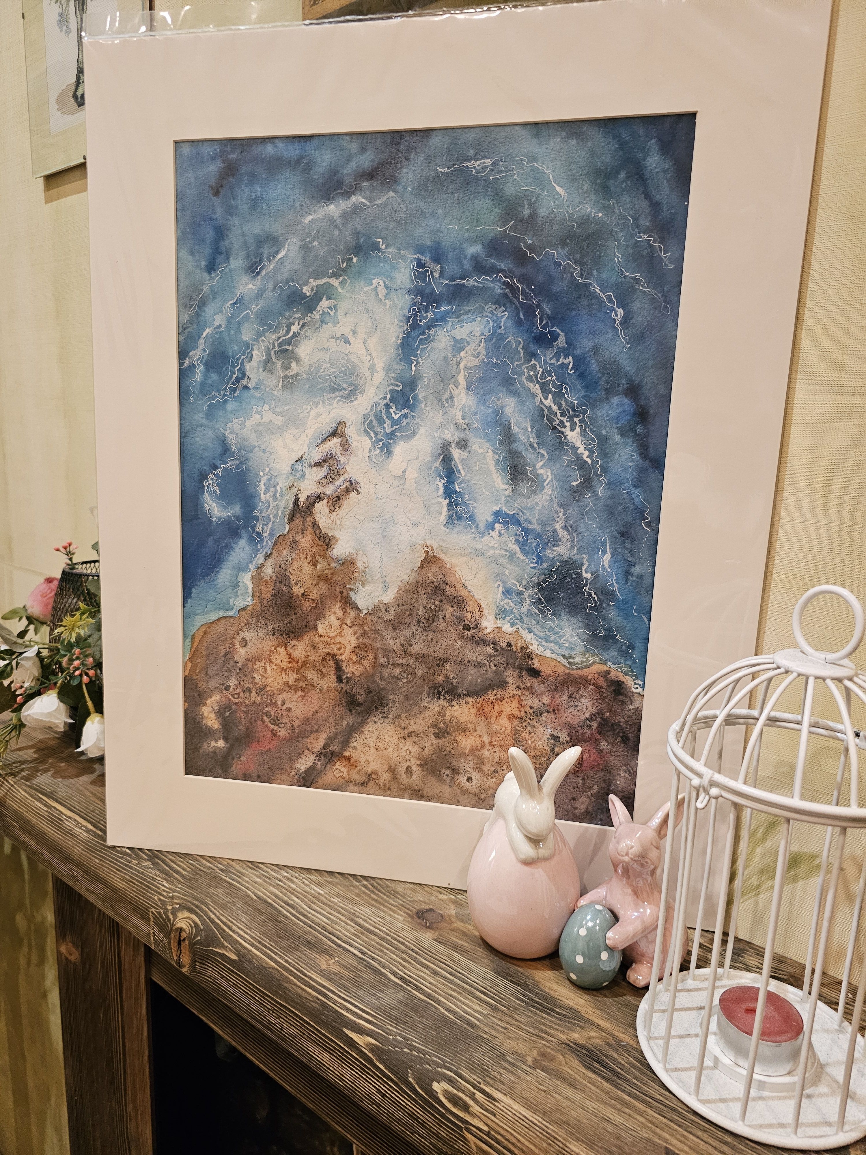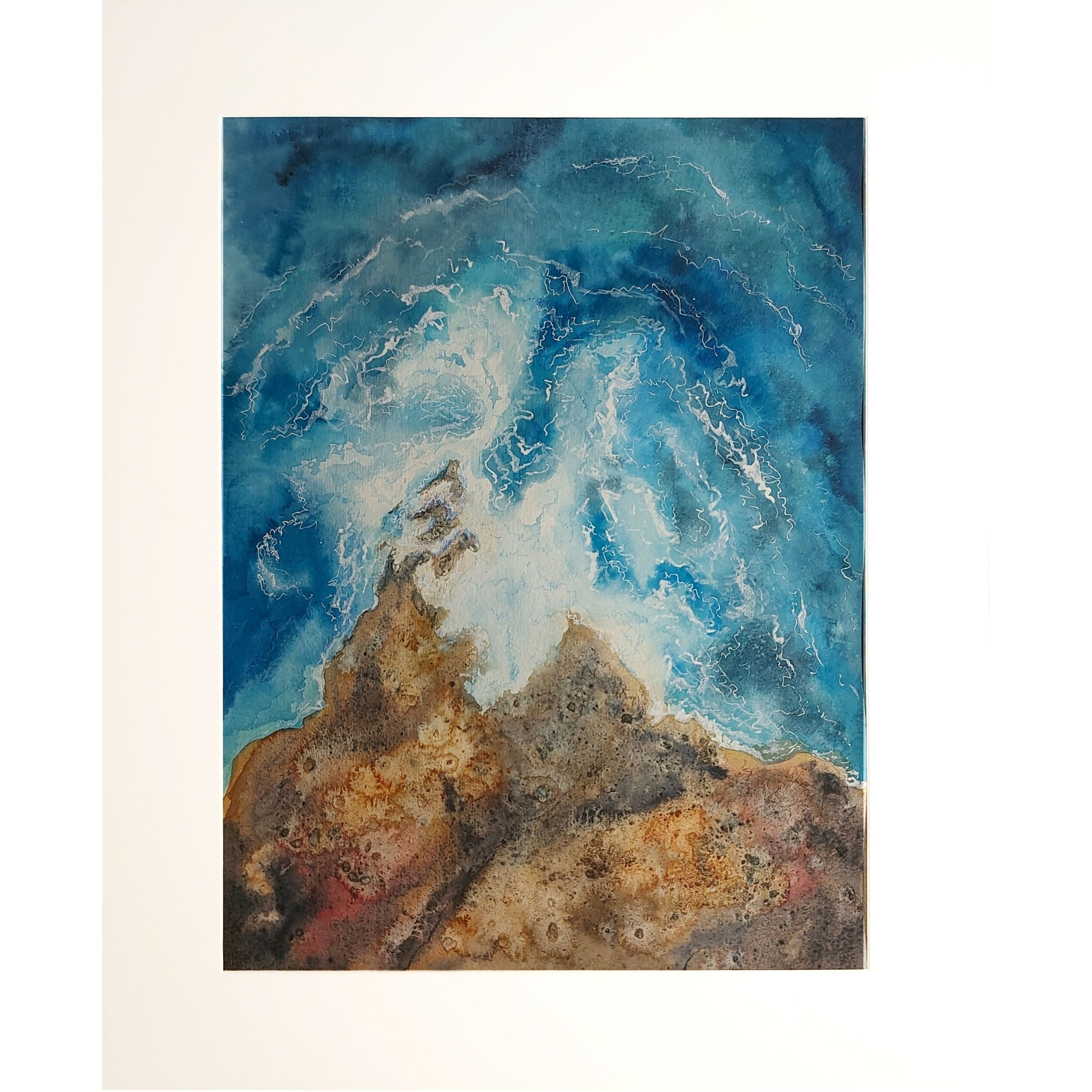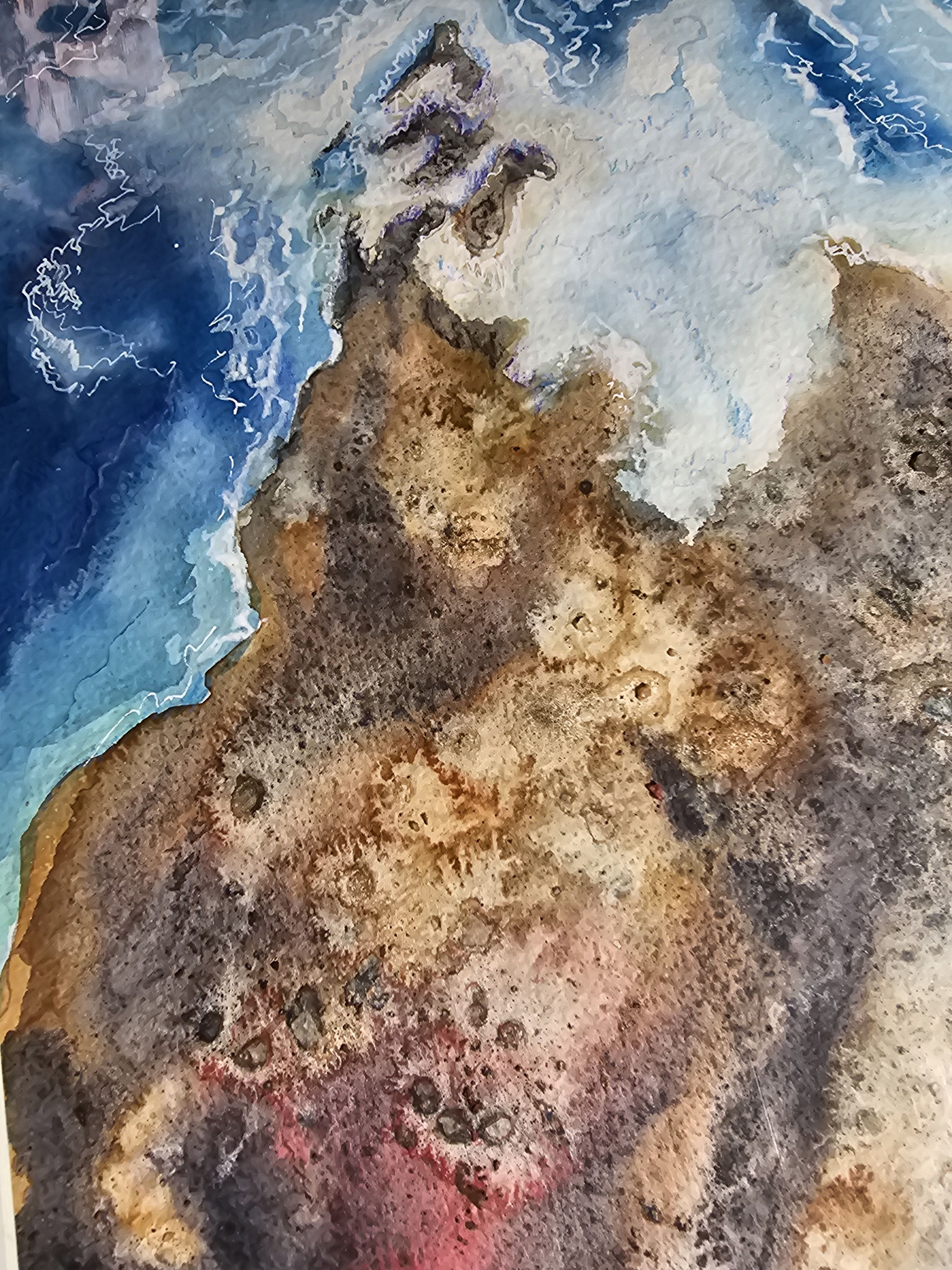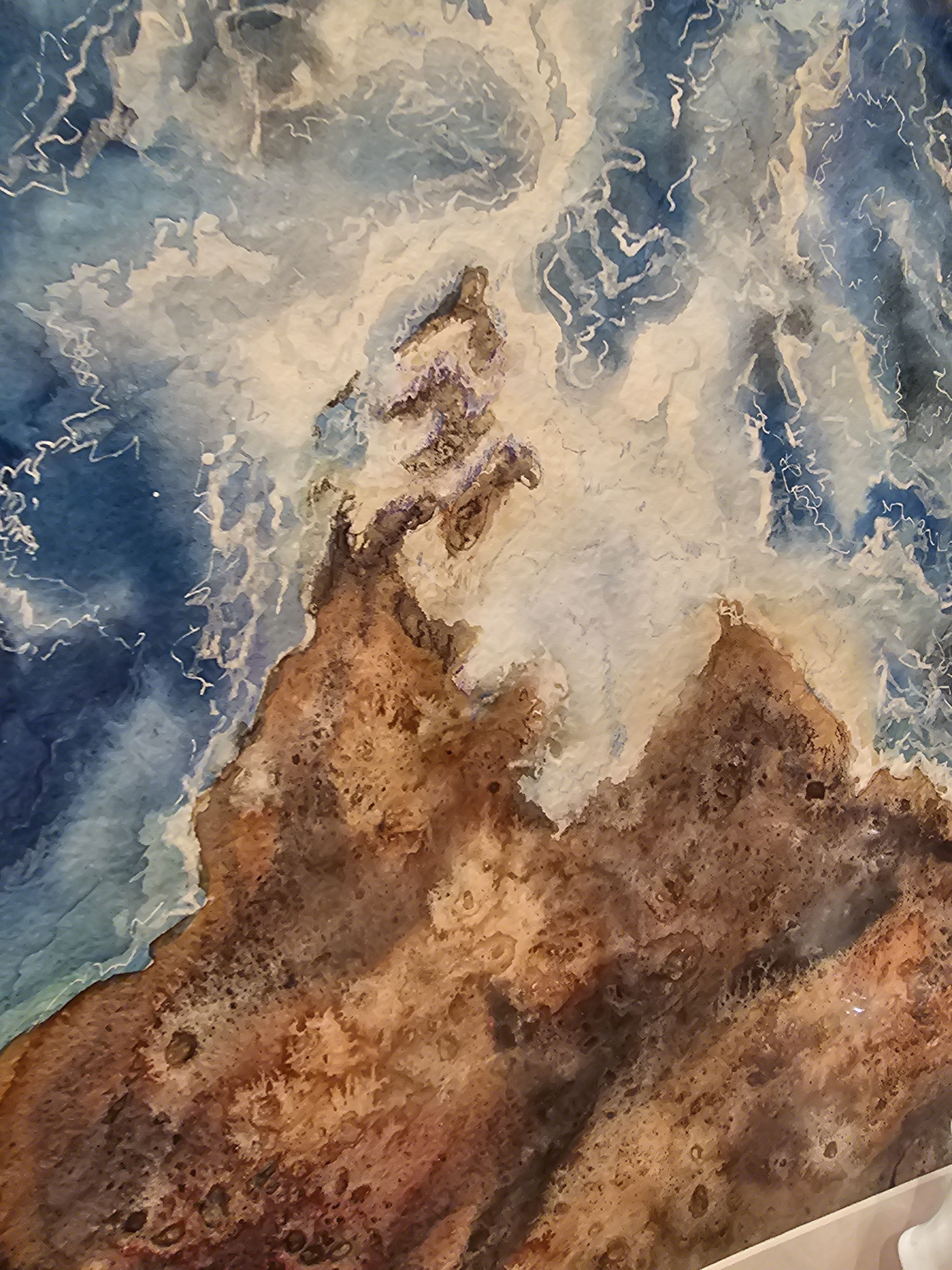 Художник изобразил морской пейзаж с волнами и скалами. Картина выполнена в основном в синих и коричневых оттенках с использованием белого цвета для подчеркивания гребней волн и пены. Верхняя часть картины заполнена мощными волнами, изображенными в различных тонах синего, создающими ощущение движения и турбулентности воды. Ниже на картине нарисованы скалы, выполненные в коричневых и бежевых тонах, с видимыми различными оттенками и текстурой, которые придают им реалистичный вид.