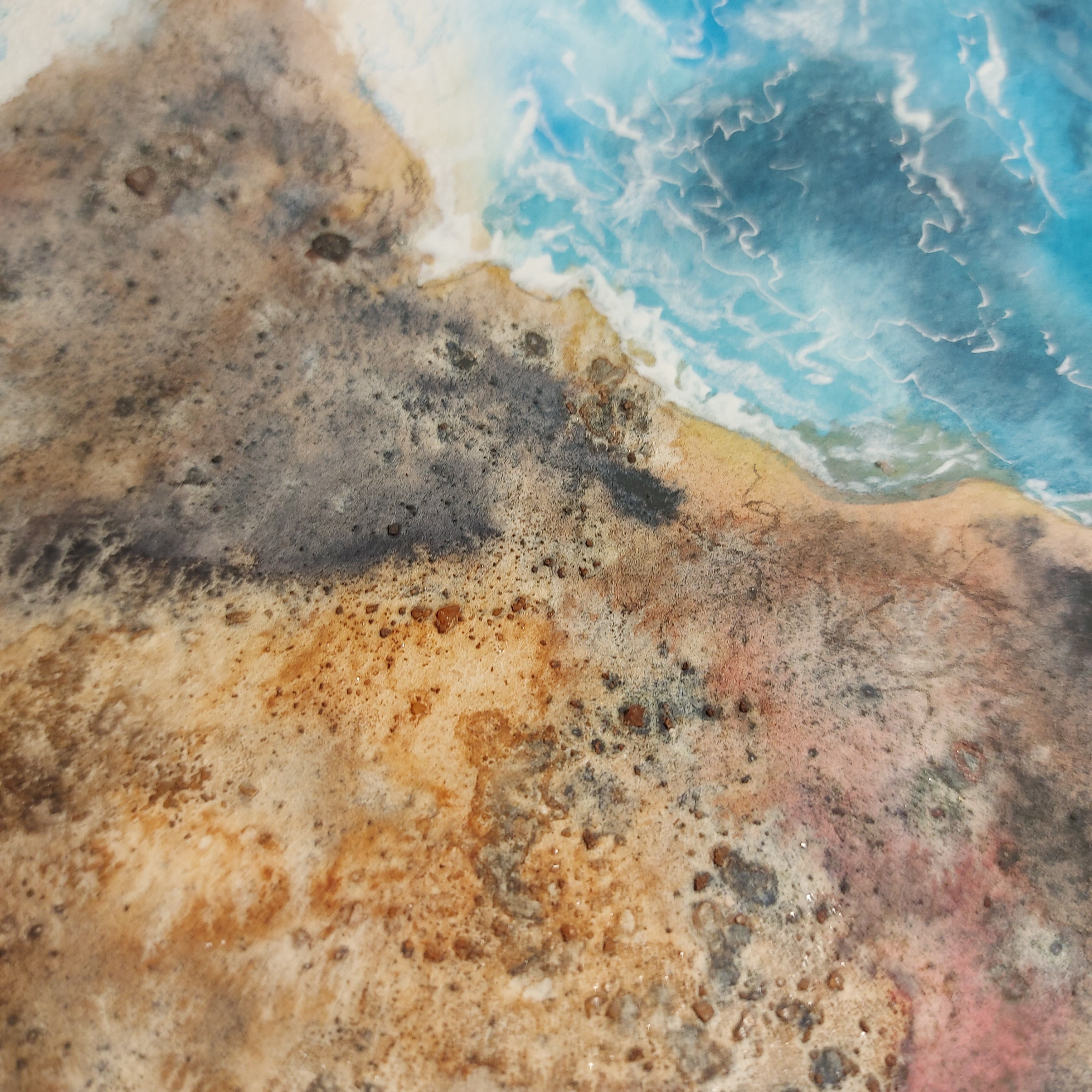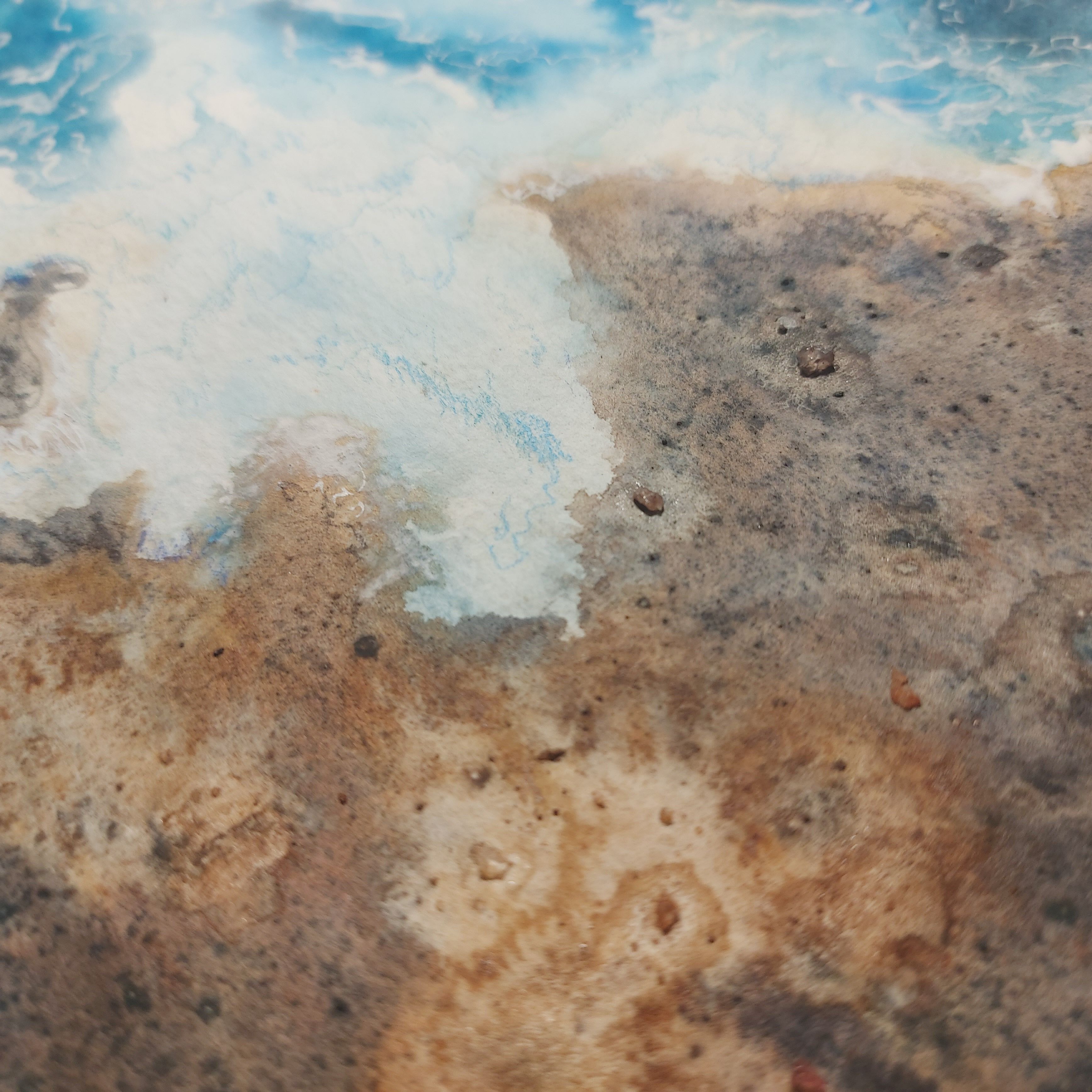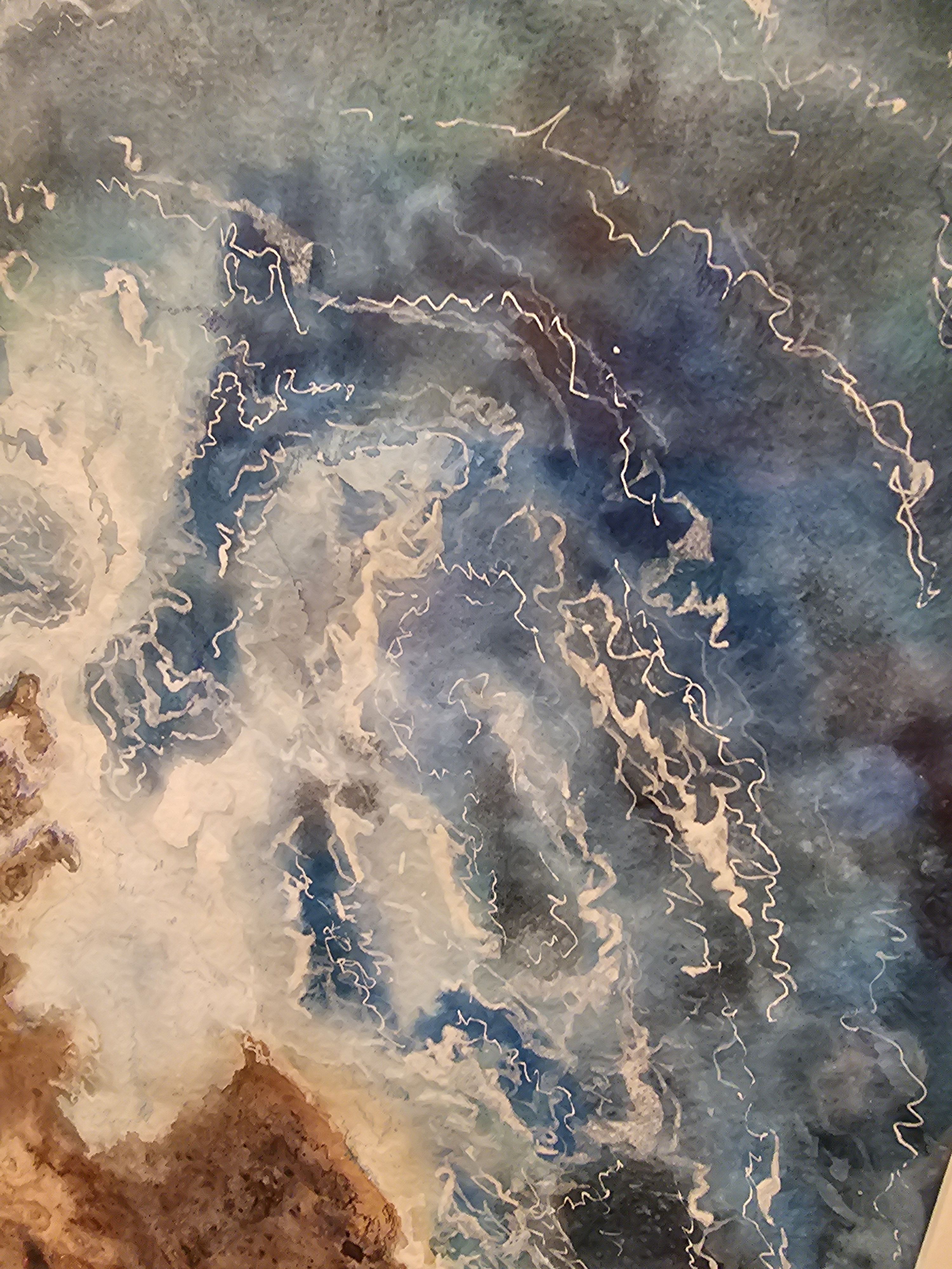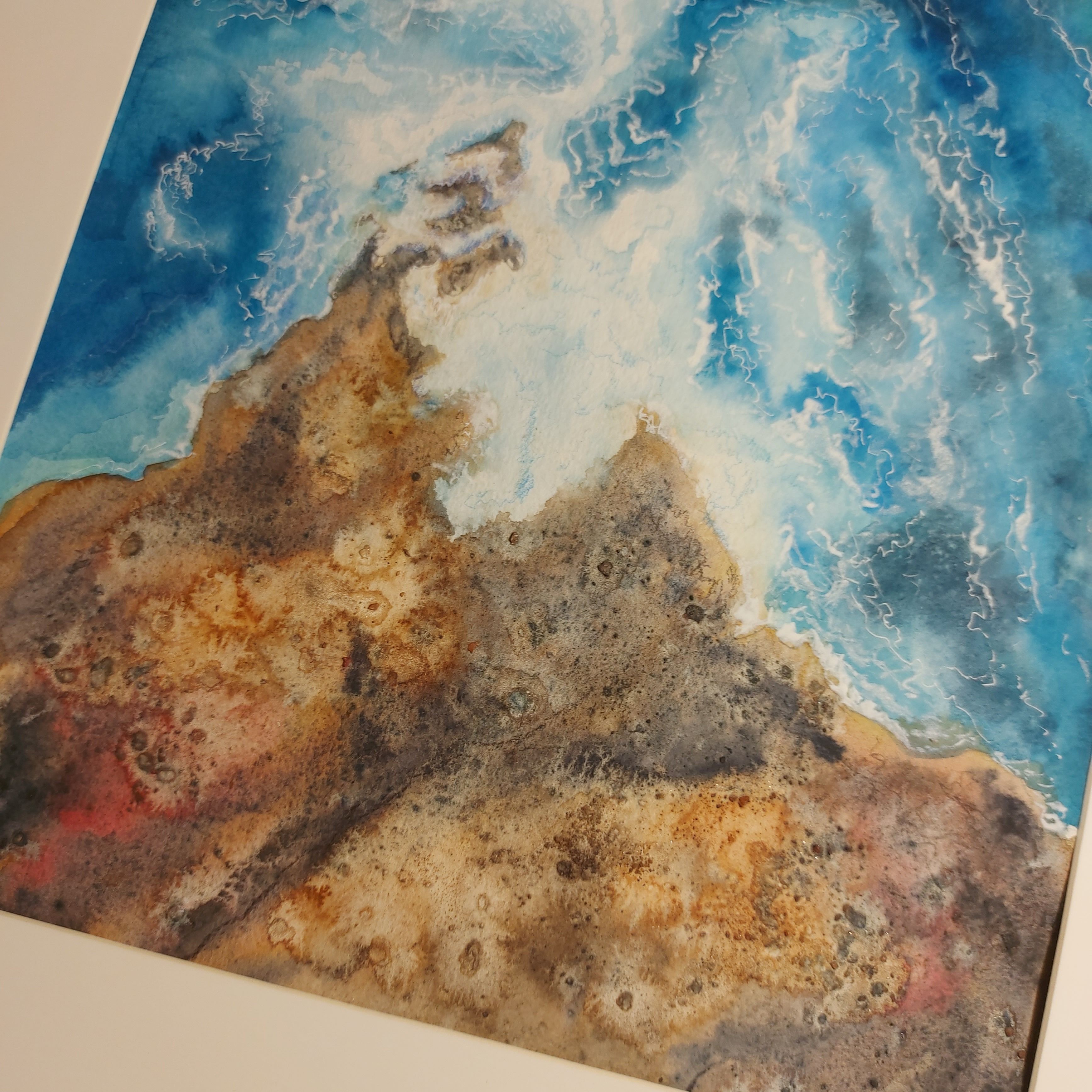 Художник изобразил морской пейзаж с волнами и скалами. Картина выполнена в основном в синих и коричневых оттенках с использованием белого цвета для подчеркивания гребней волн и пены. Верхняя часть картины заполнена мощными волнами, изображенными в различных тонах синего, создающими ощущение движения и турбулентности воды. Ниже на картине нарисованы скалы, выполненные в коричневых и бежевых тонах, с видимыми различными оттенками и текстурой, которые придают им реалистичный вид.