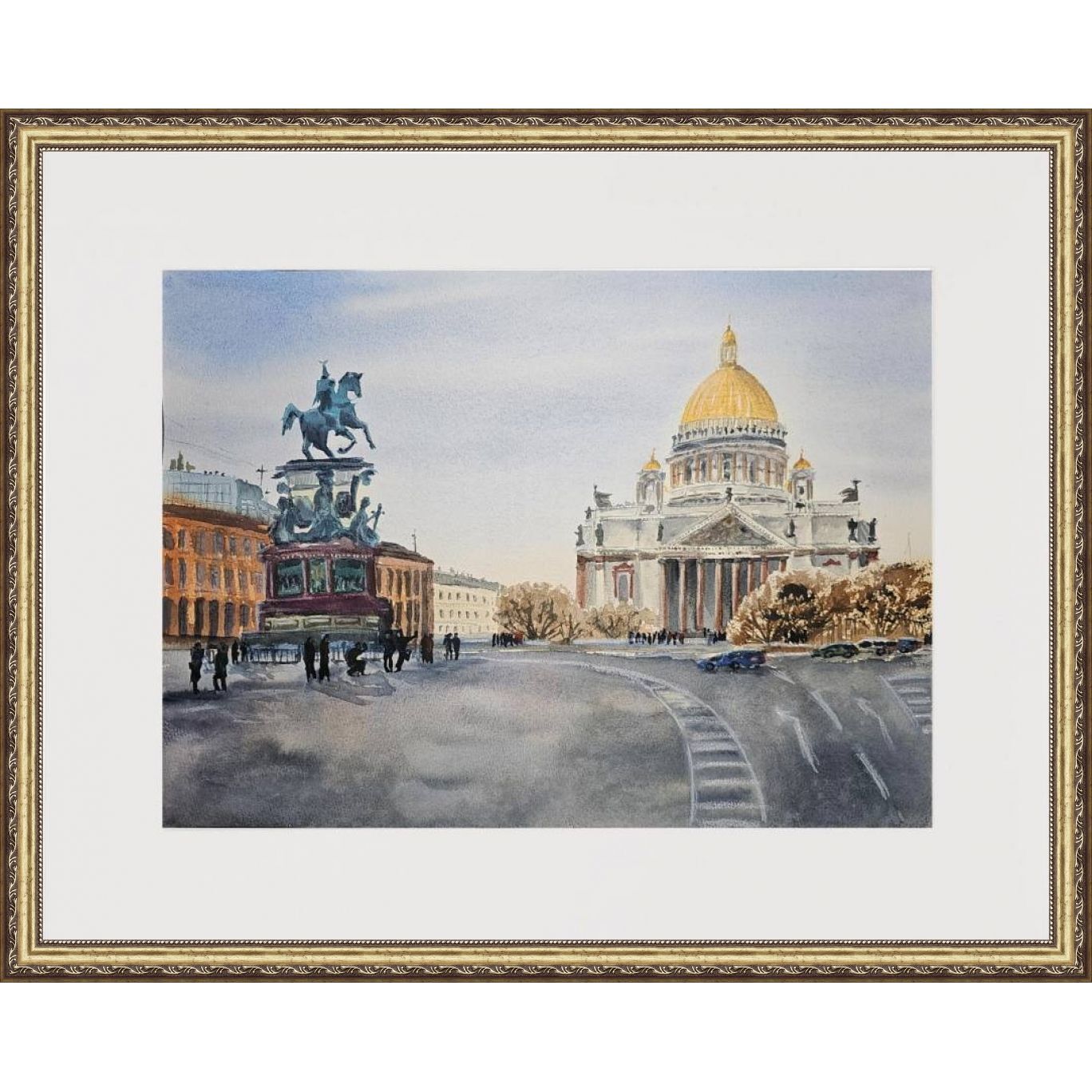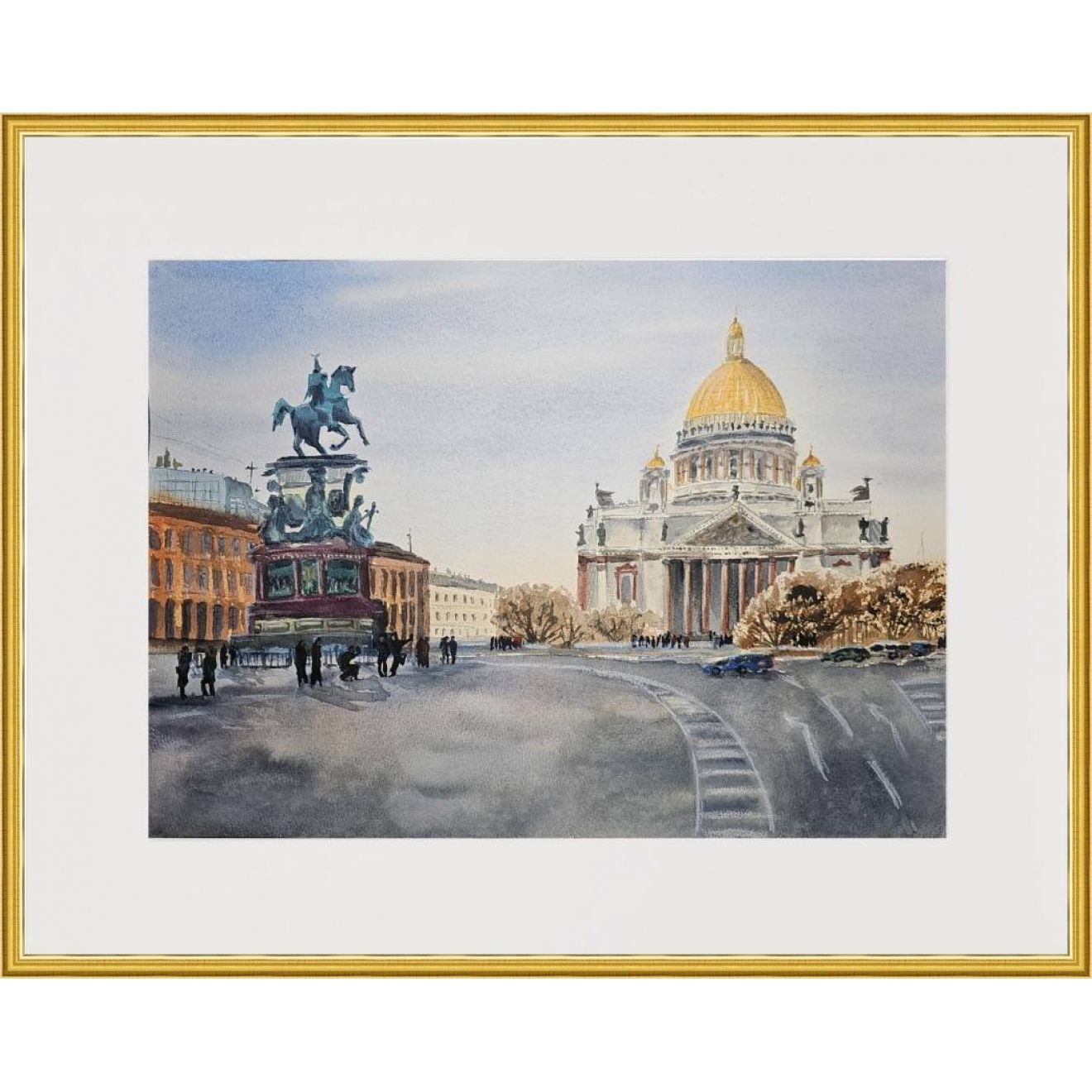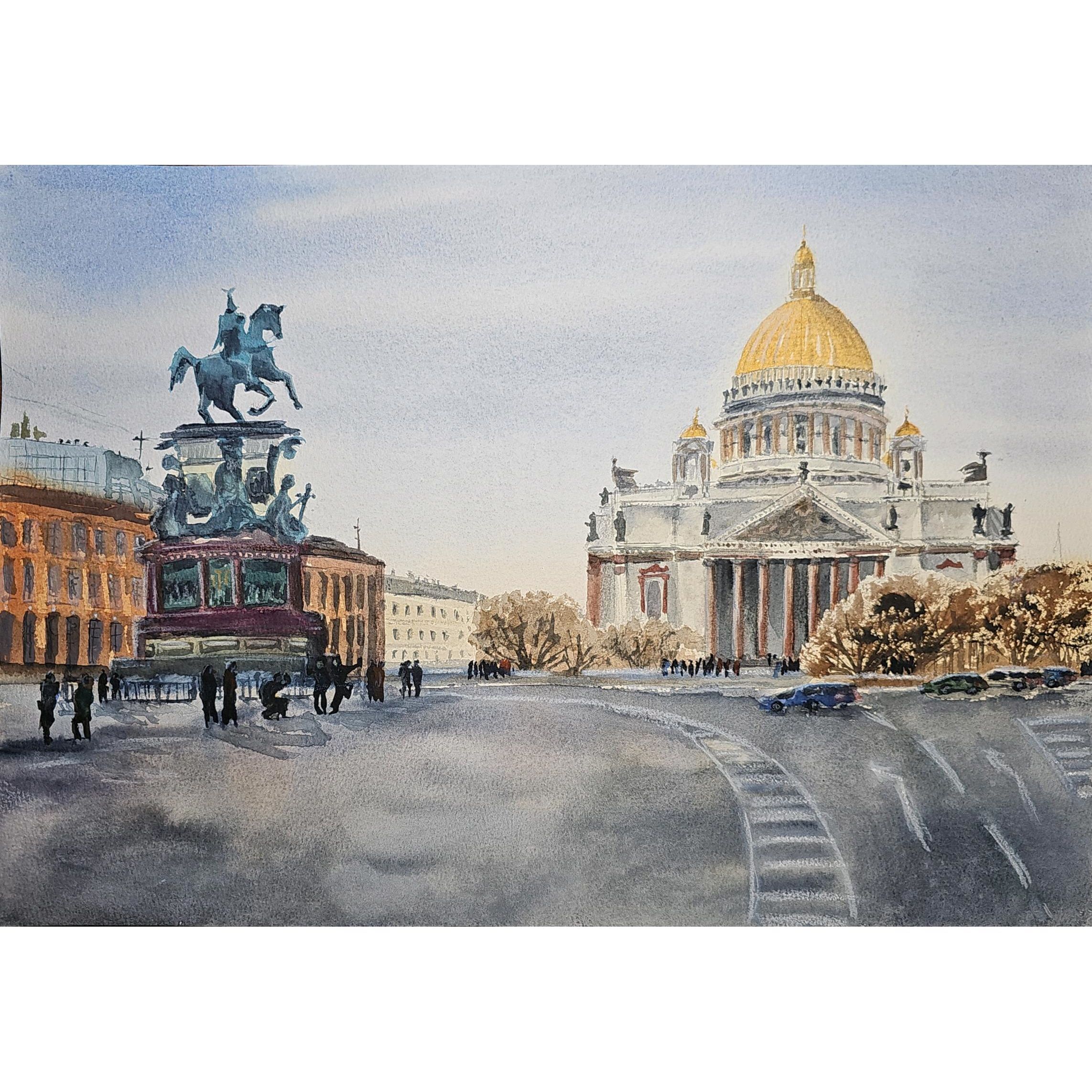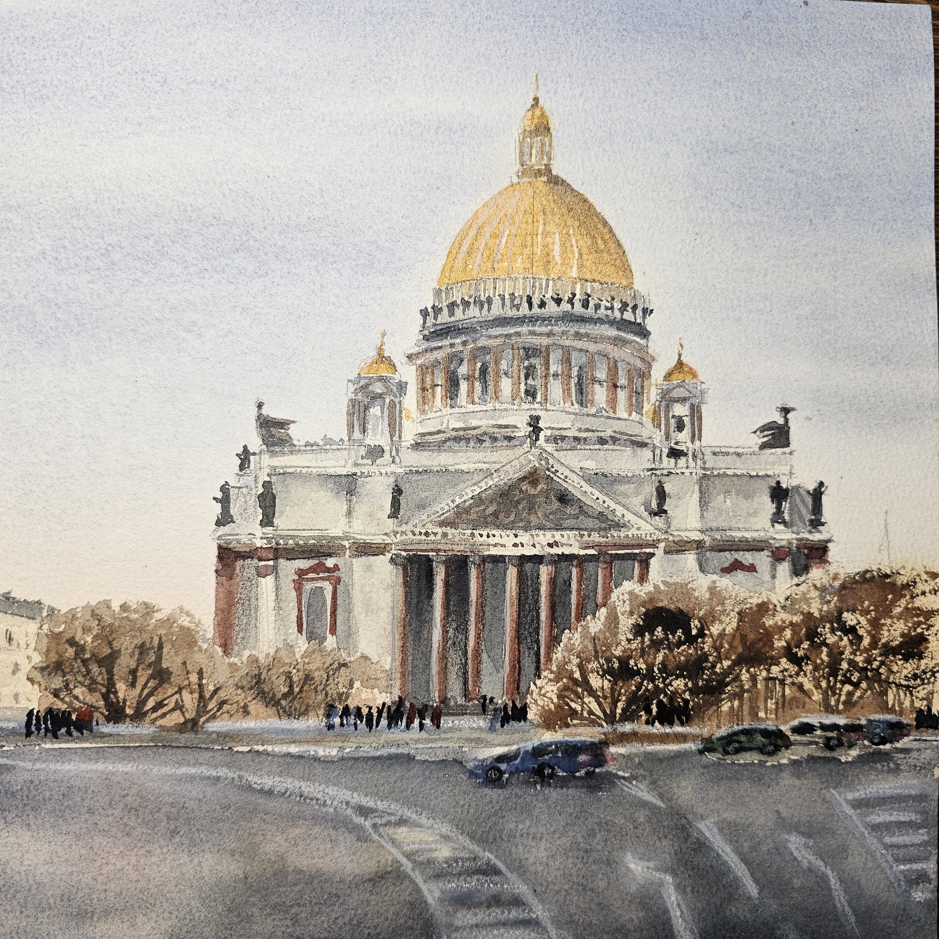 Нам представлен городской пейзаж конца зимы в Санкт-Петербурге. В центре рисунка находится большое здание Исаакиевского собора со светлым фасадом и золотым куполом. Это здание с колоннами у входа. Справа от здания видны деревья и несколько автомобилей, припаркованных на дороге.