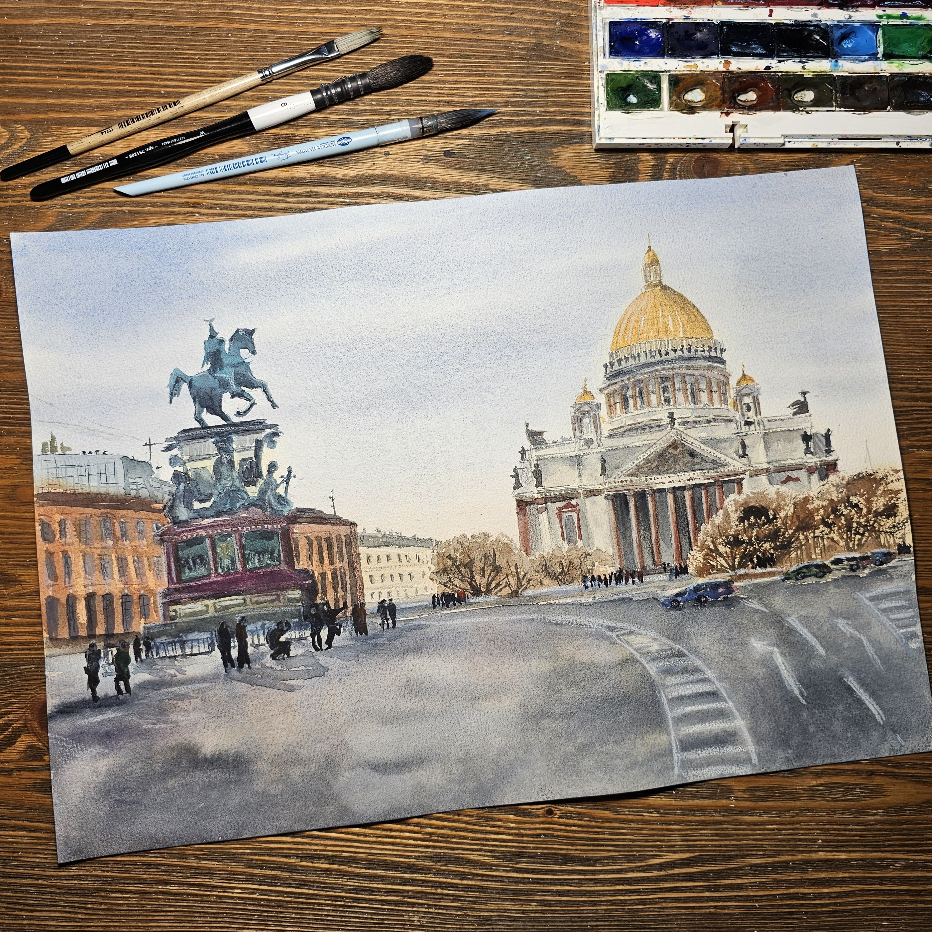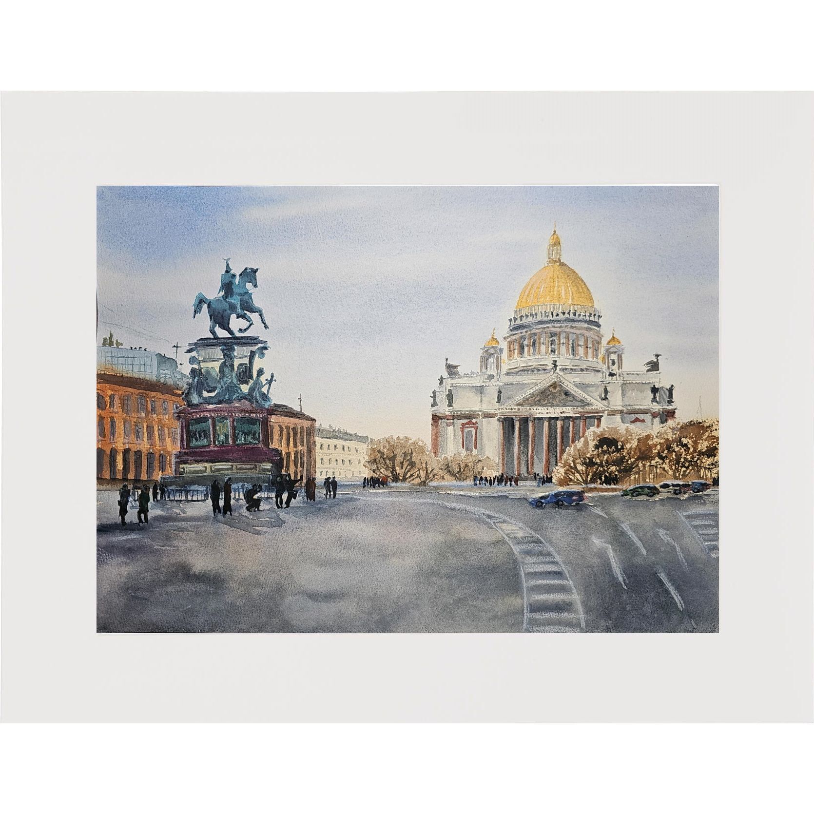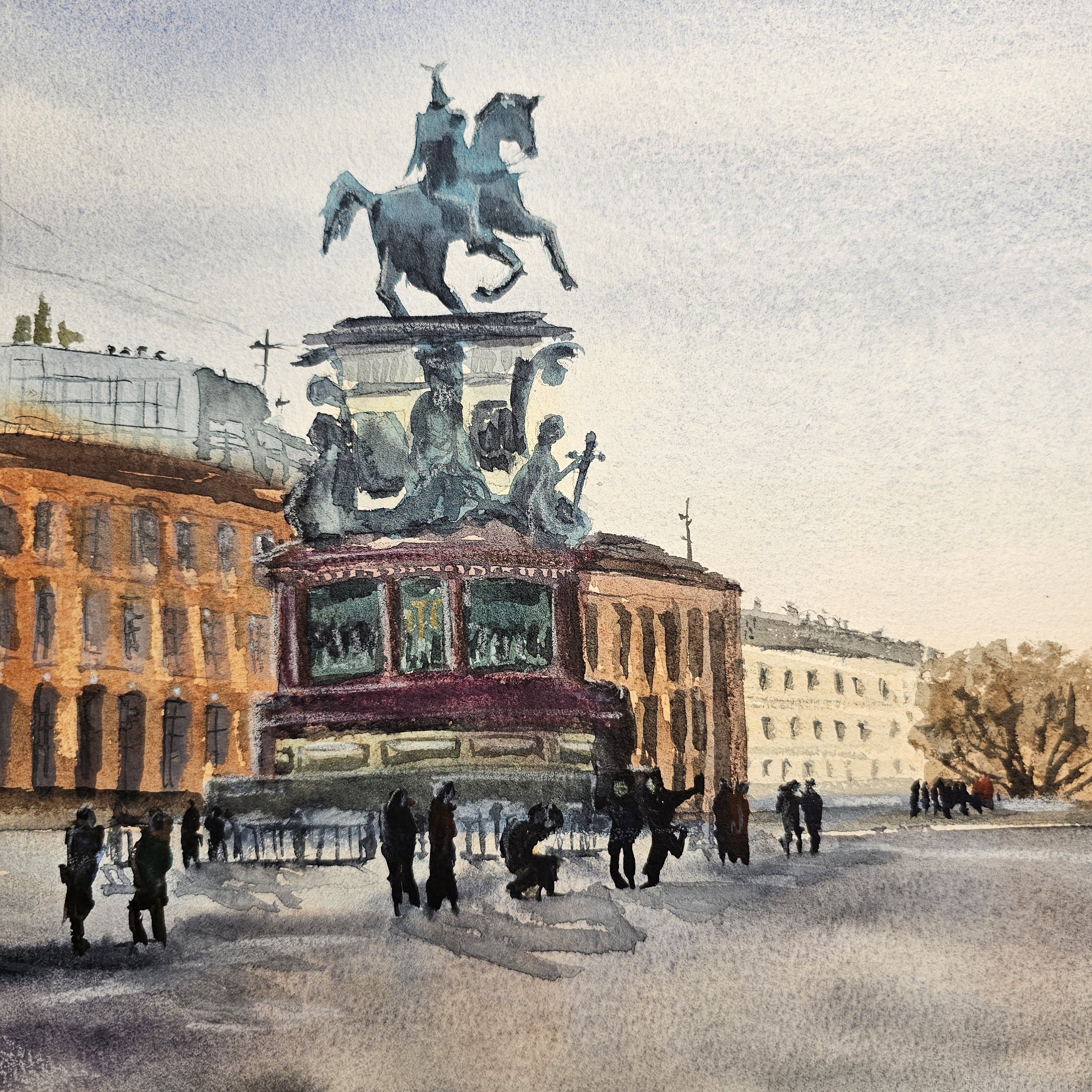 Несколько пешеходов, которые гуляют или стоят рядом с памятником и перед собором. Небо на изображении светлое, возможно, ясный день. Цветовая гамма рисунка выполнена в светлых и приятных пастельных тонах, что придаёт изображению реалистичности и мягкости.