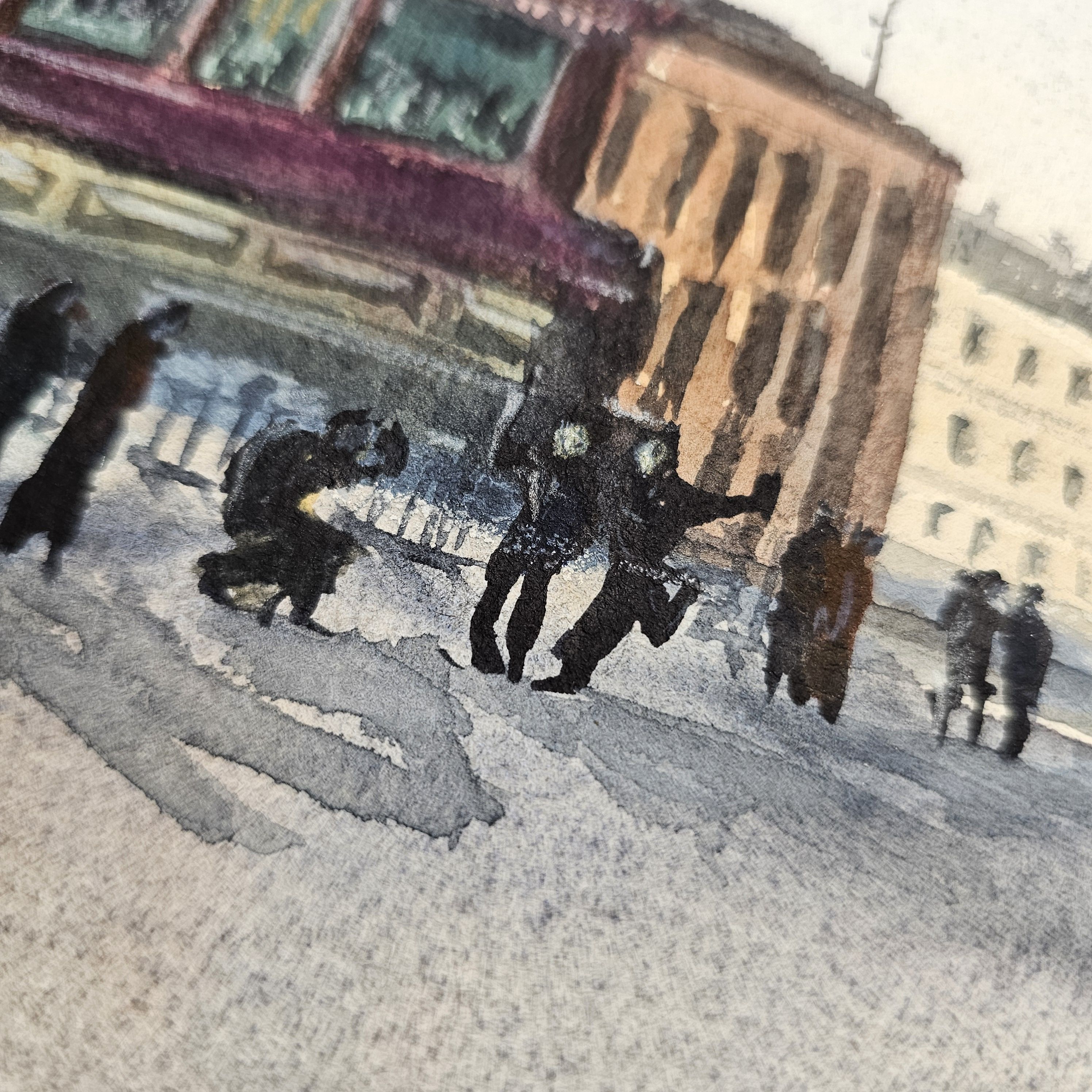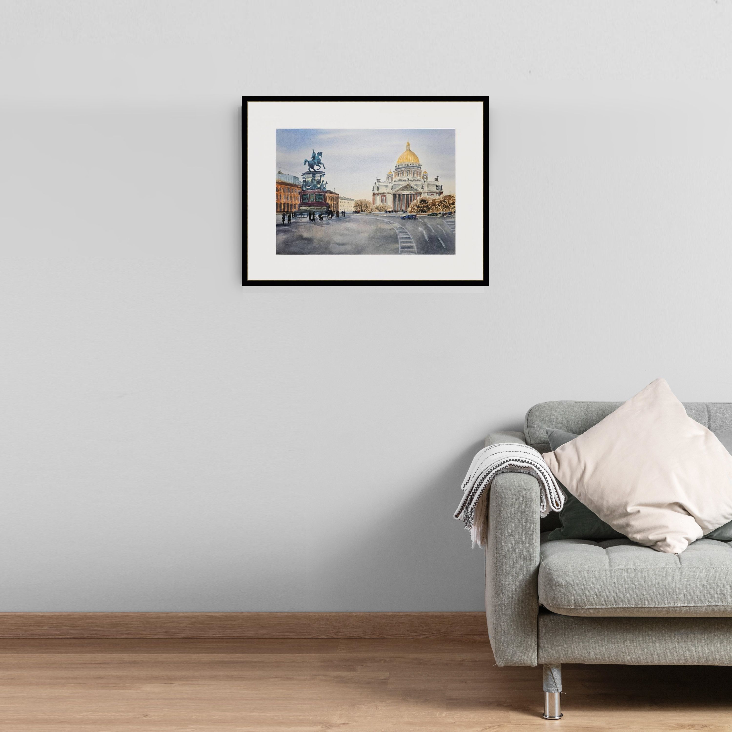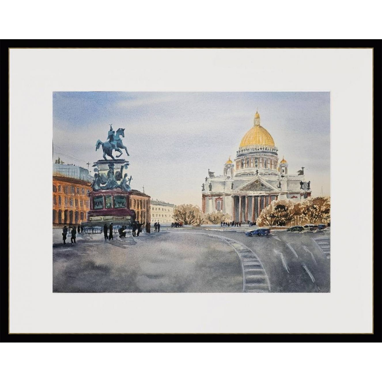 Несколько пешеходов, которые гуляют или стоят рядом с памятником и перед собором. Небо на изображении светлое, возможно, ясный день. Цветовая гамма рисунка выполнена в светлых и приятных пастельных тонах, что придаёт изображению реалистичности и мягкости.