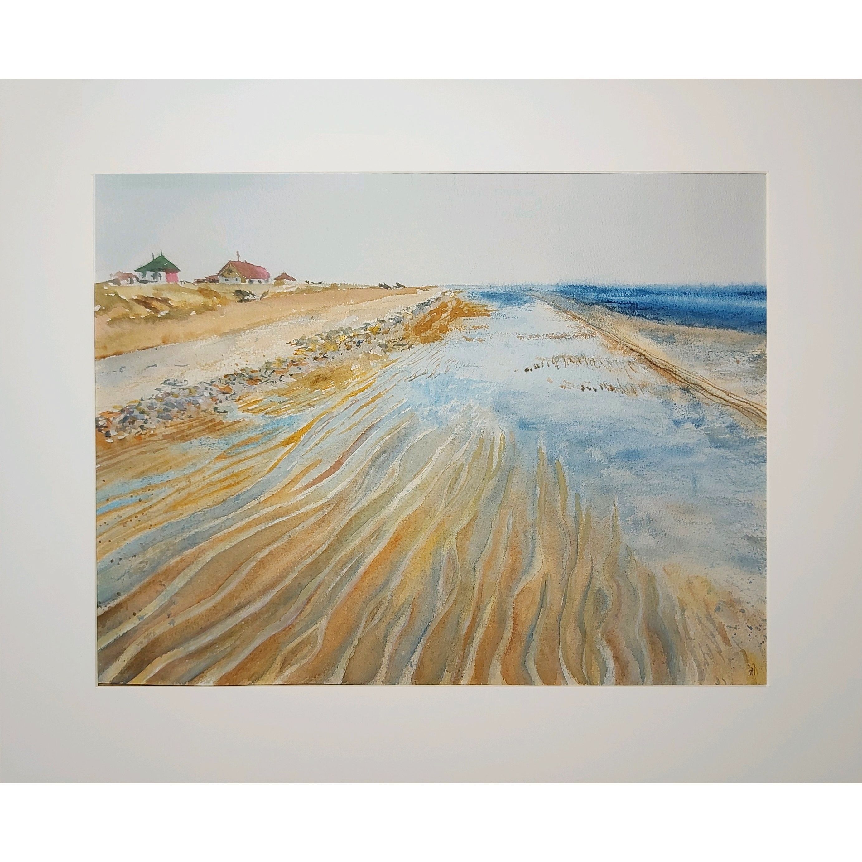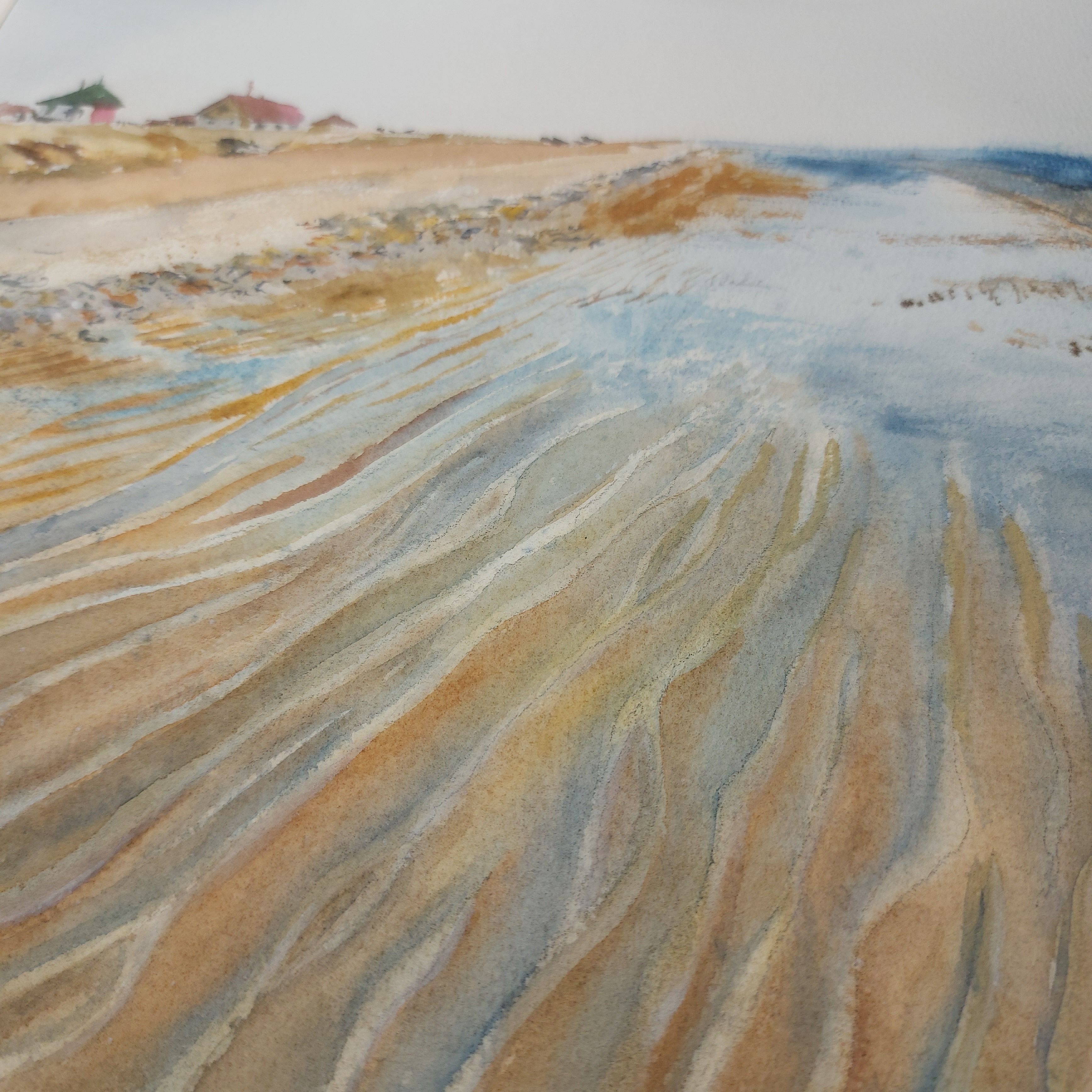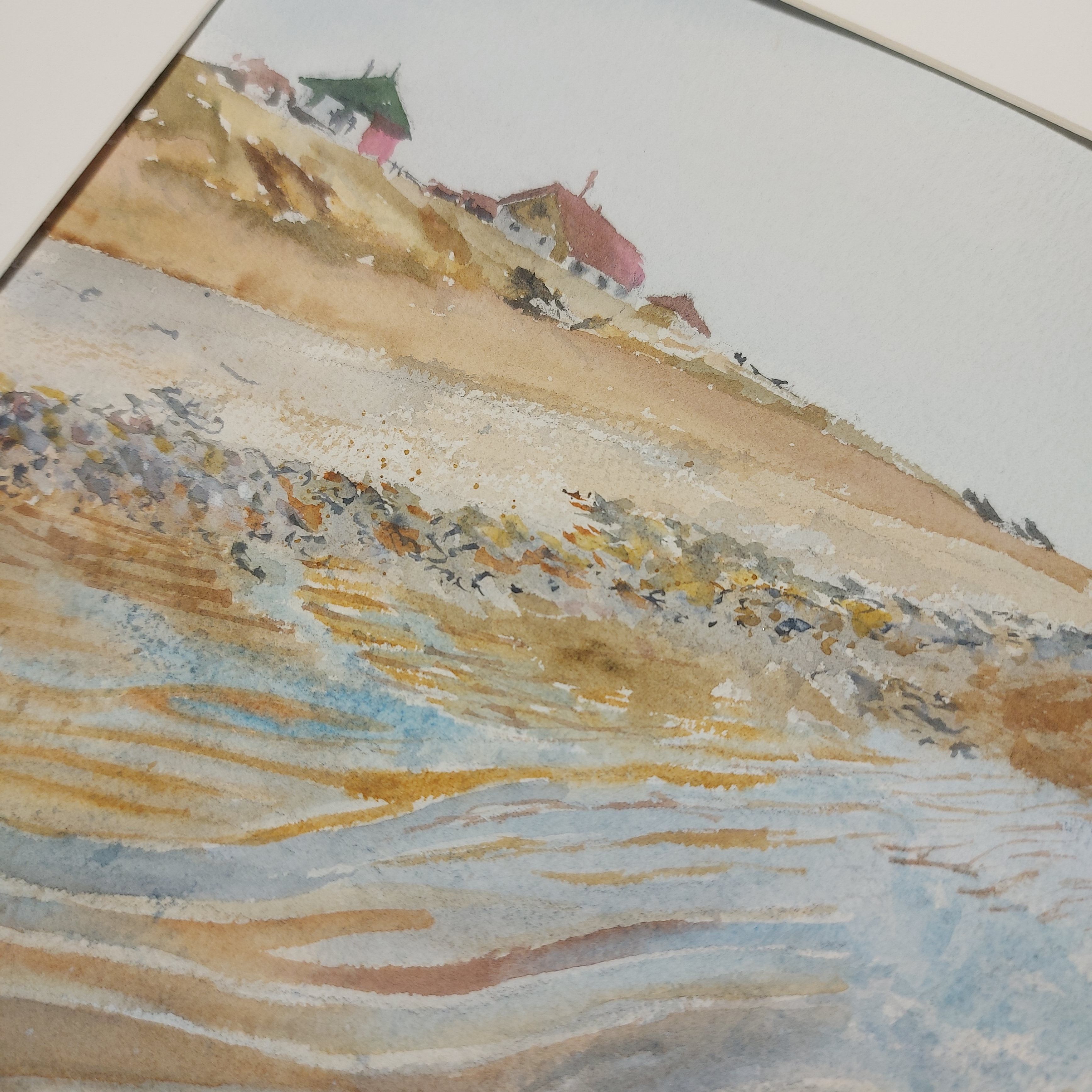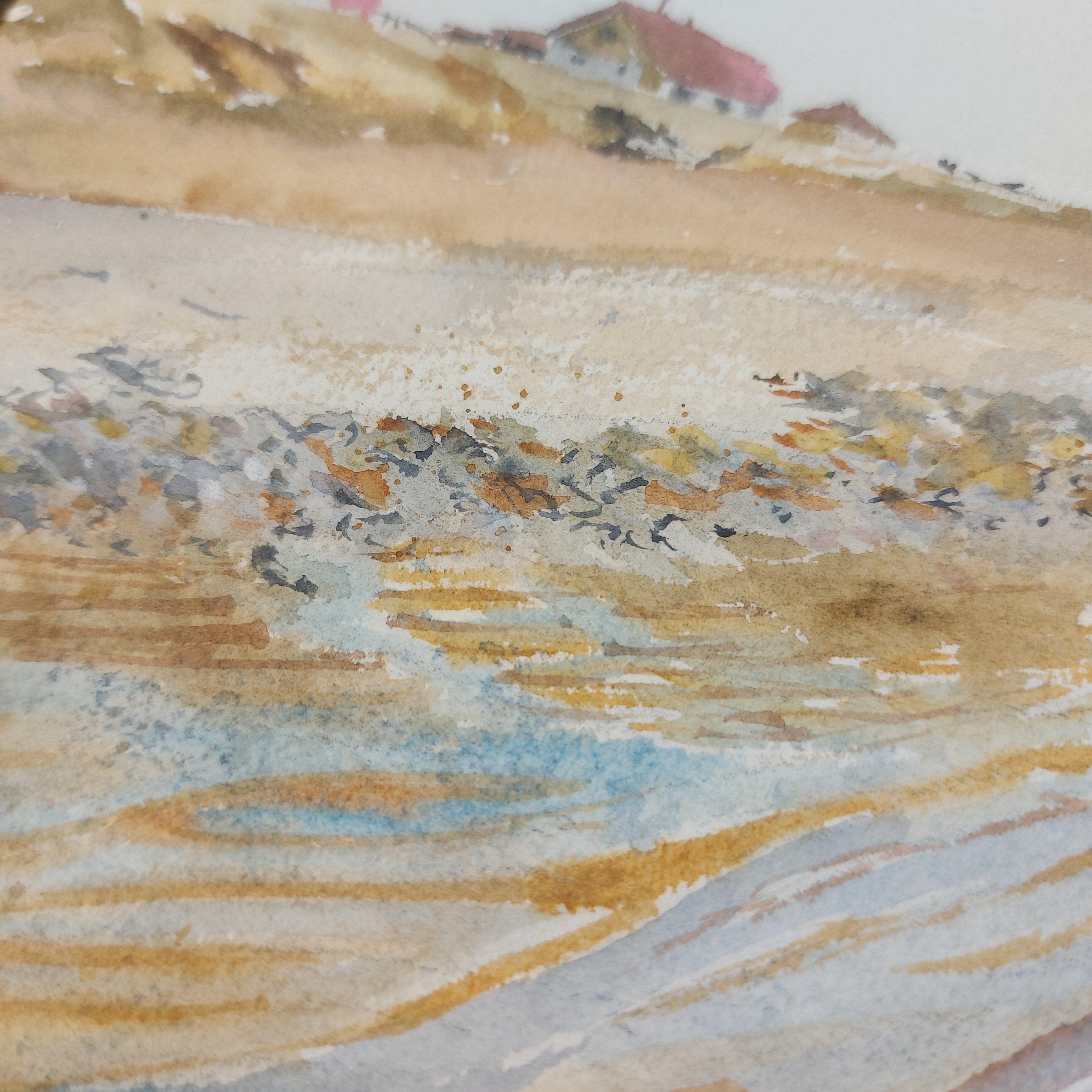 На этой акварельной картине изображен пейзаж прибрежной зоны. На переднем плане видны песчаные волны и отмели, пересеченные водой. На заднем плане расположены несколько небольших домов с разноцветными крышами. Береговая линия галечная, а справа простирается море. Картина выполнена в светлых тонах, и передает спокойствие и умиротворение прибрежного пейзажа.