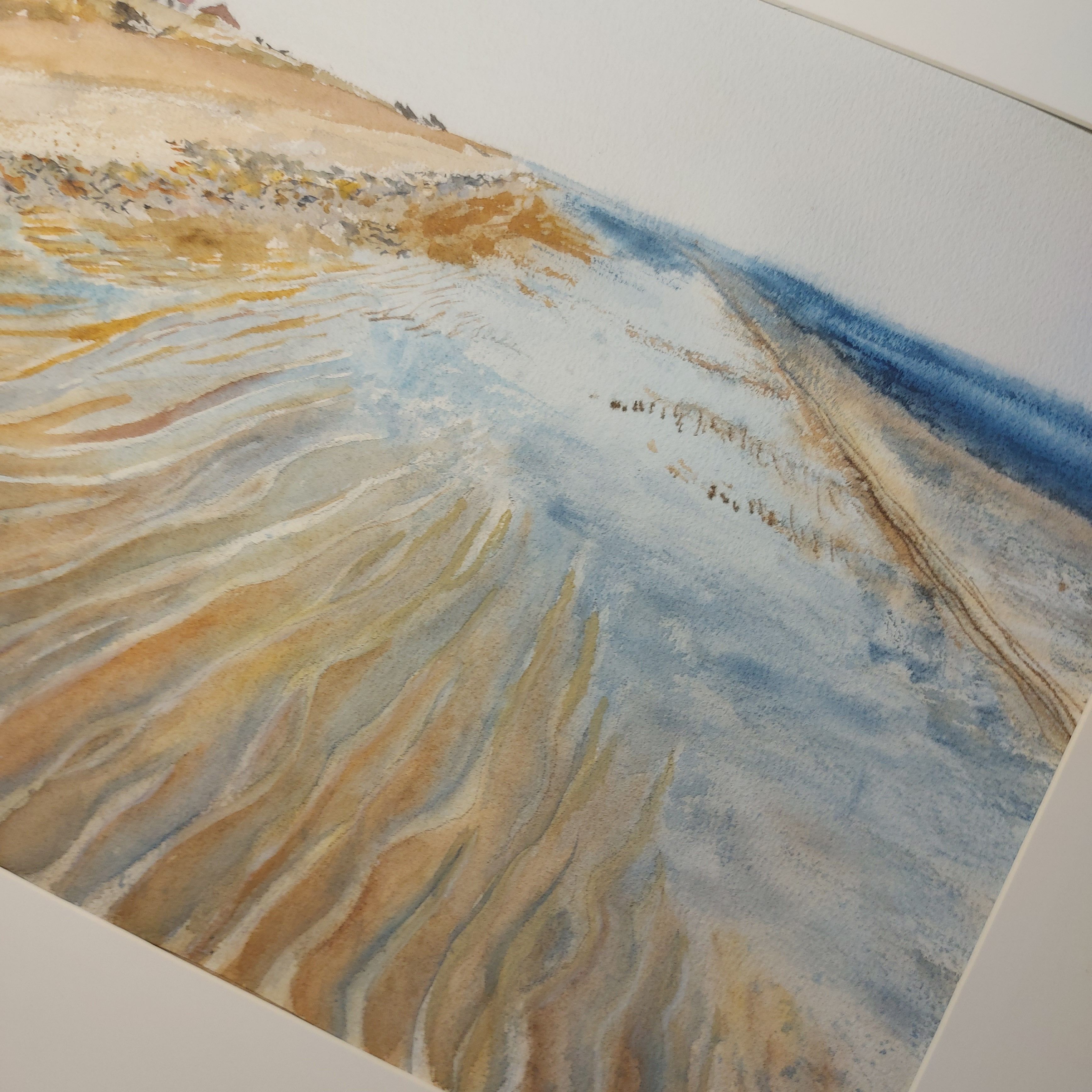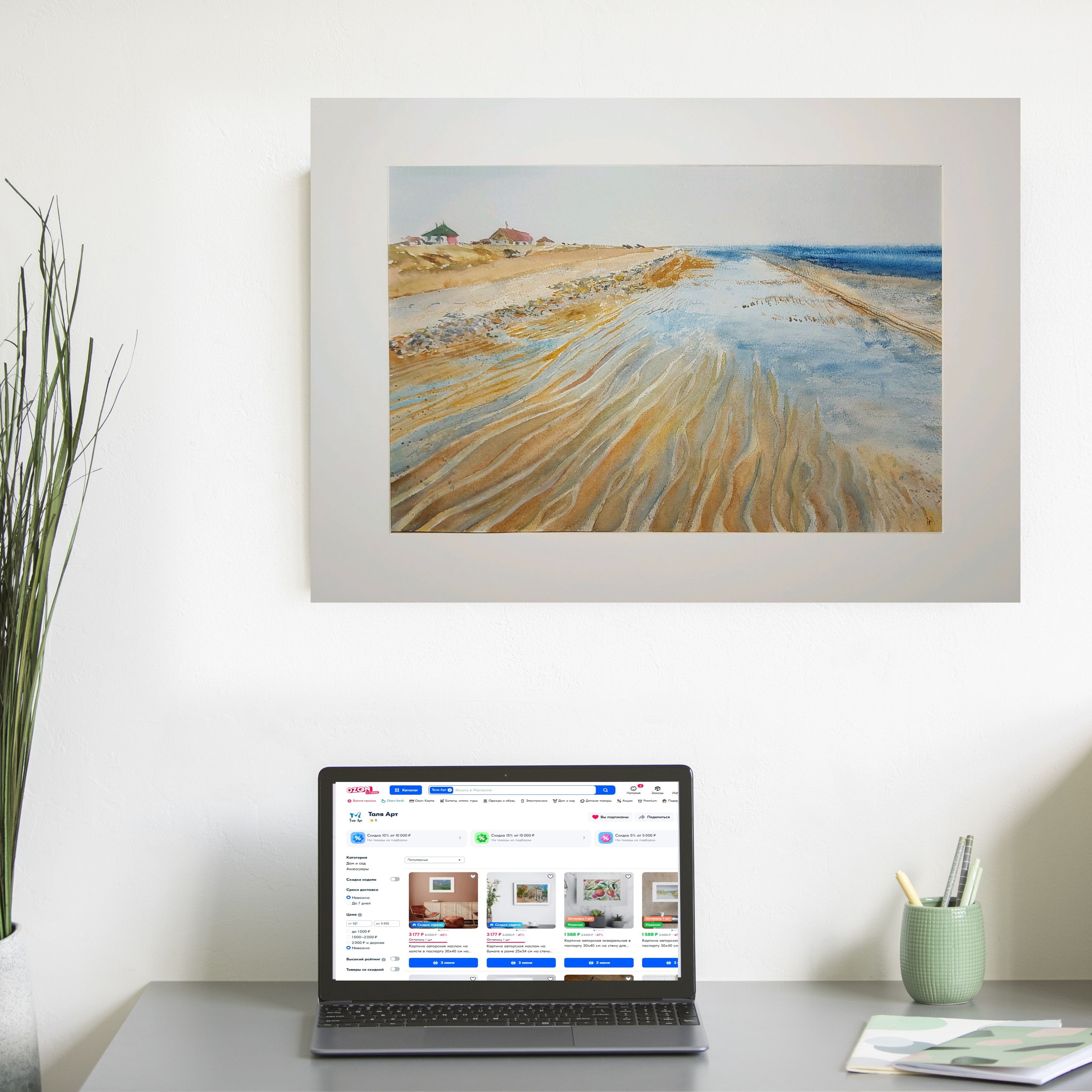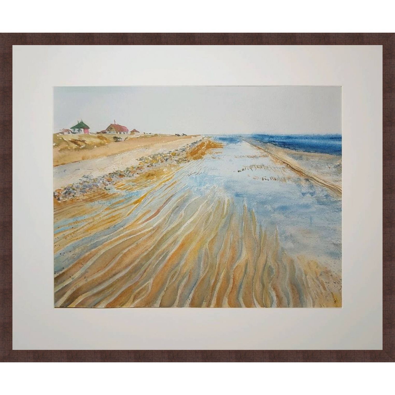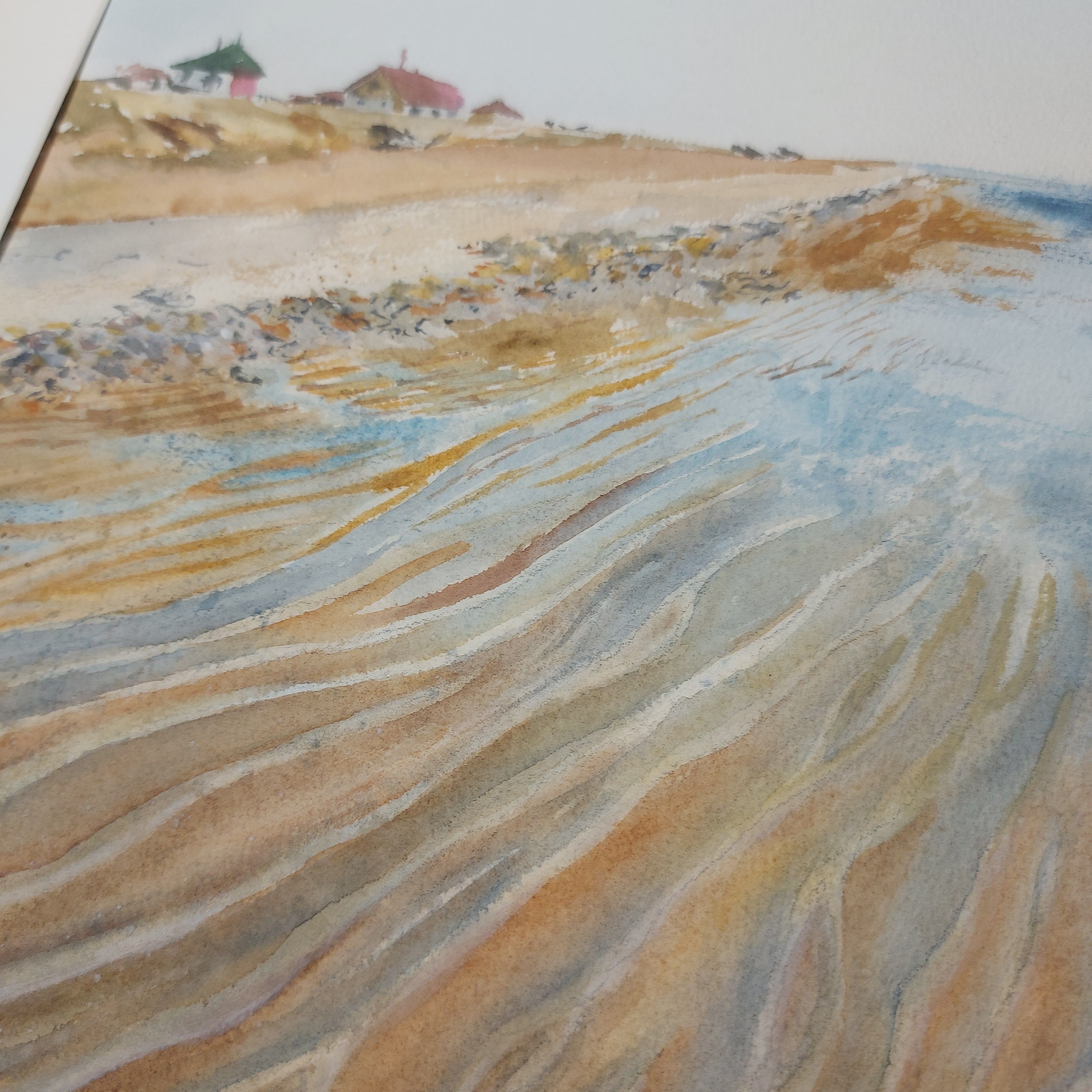 На этой акварельной картине изображен пейзаж прибрежной зоны. На переднем плане видны песчаные волны и отмели, пересеченные водой. На заднем плане расположены несколько небольших домов с разноцветными крышами. Береговая линия галечная, а справа простирается море. Картина выполнена в светлых тонах, и передает спокойствие и умиротворение прибрежного пейзажа.