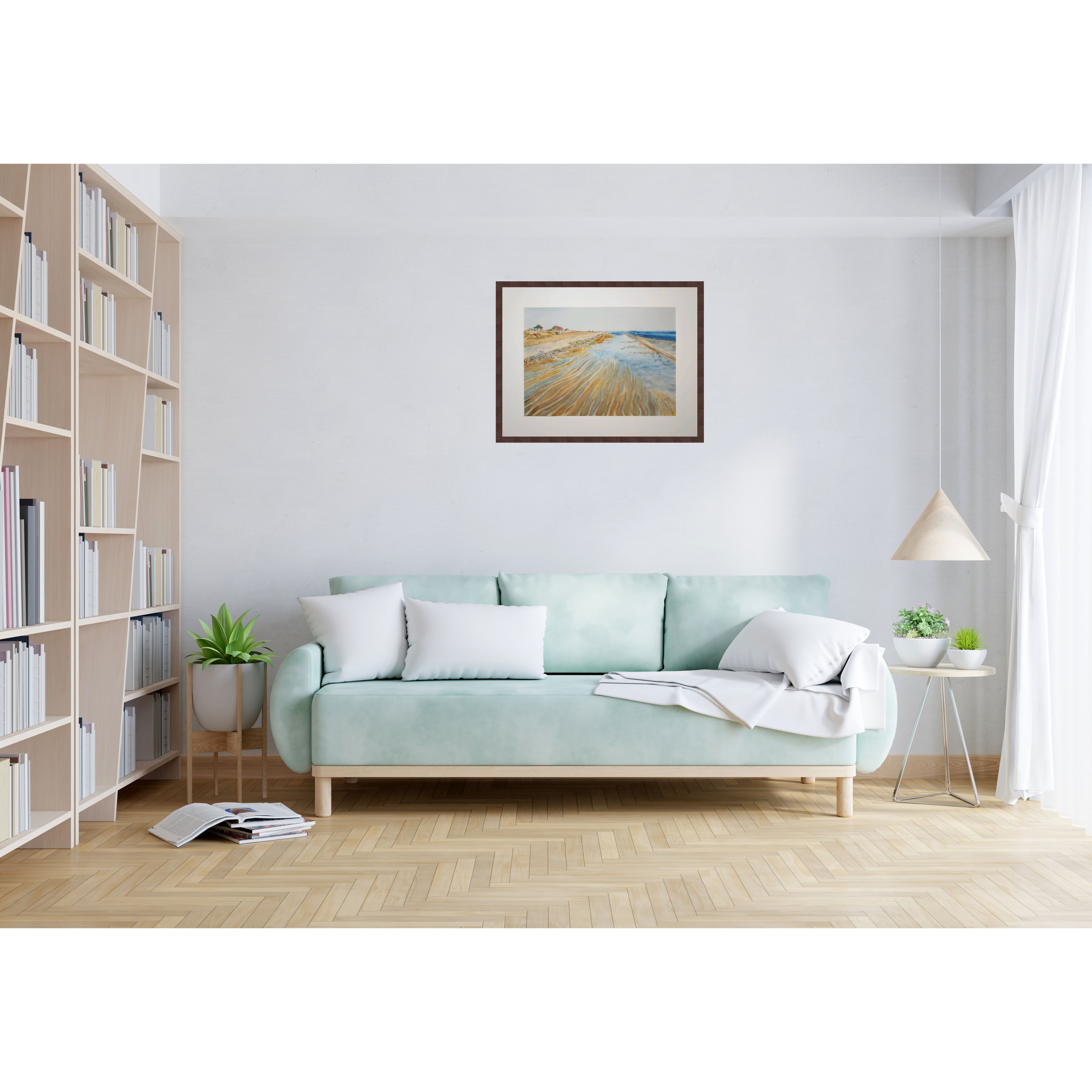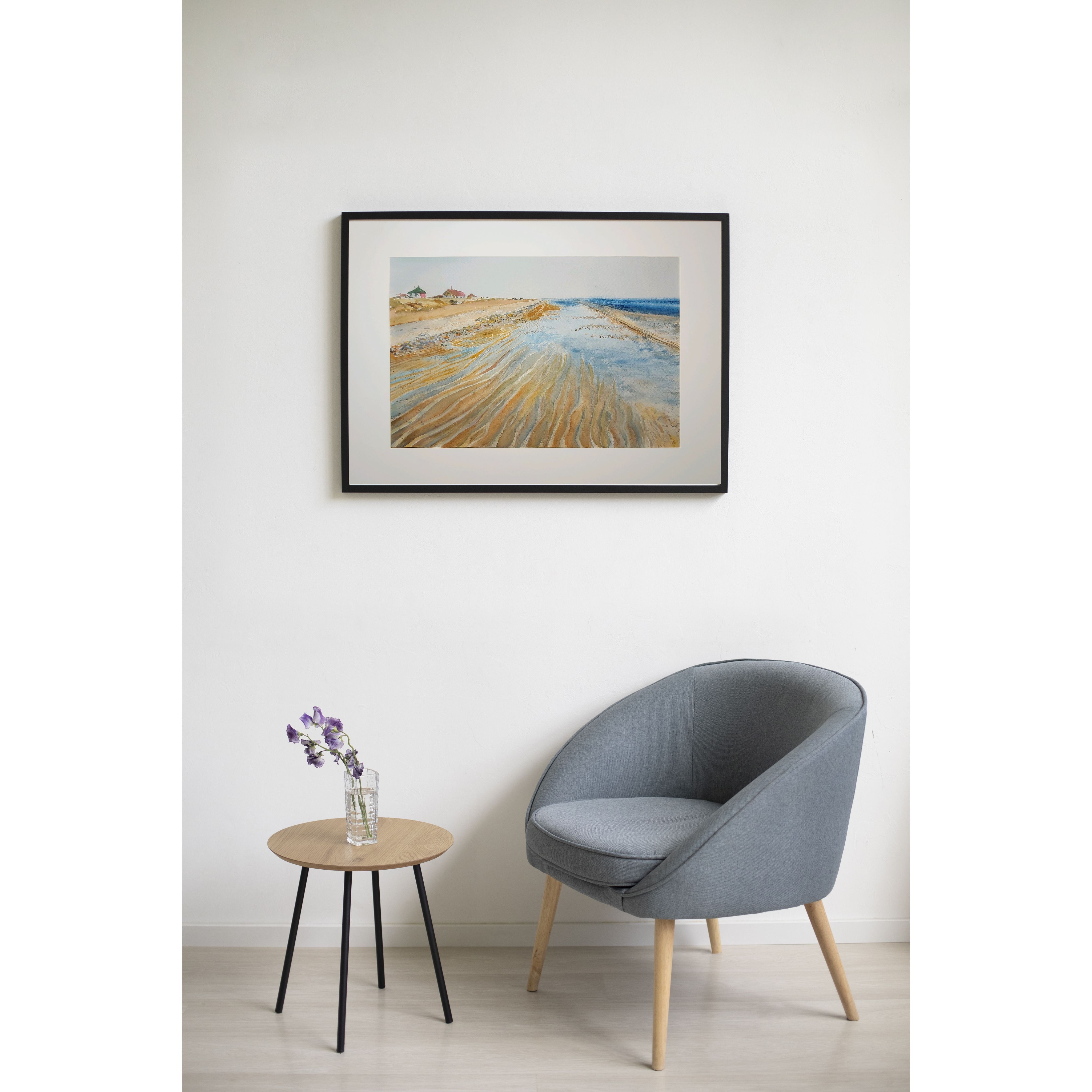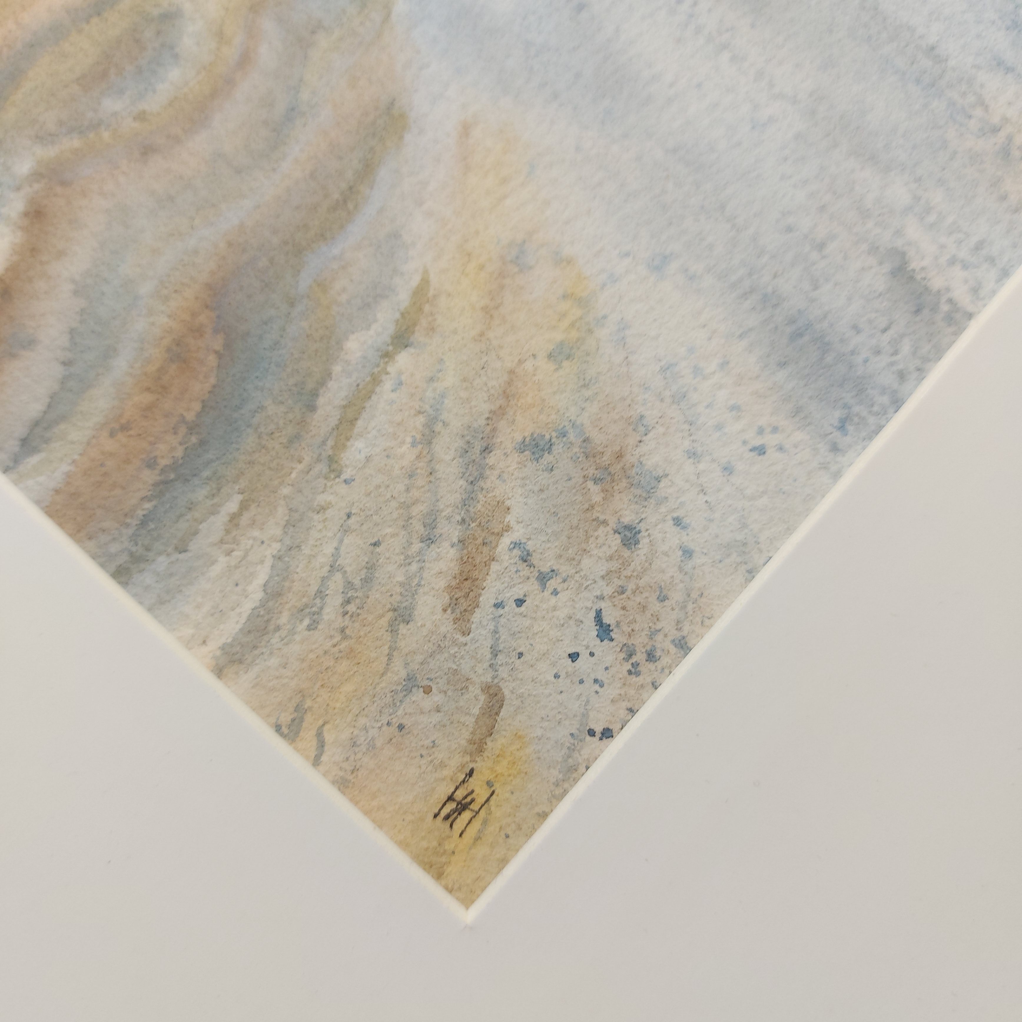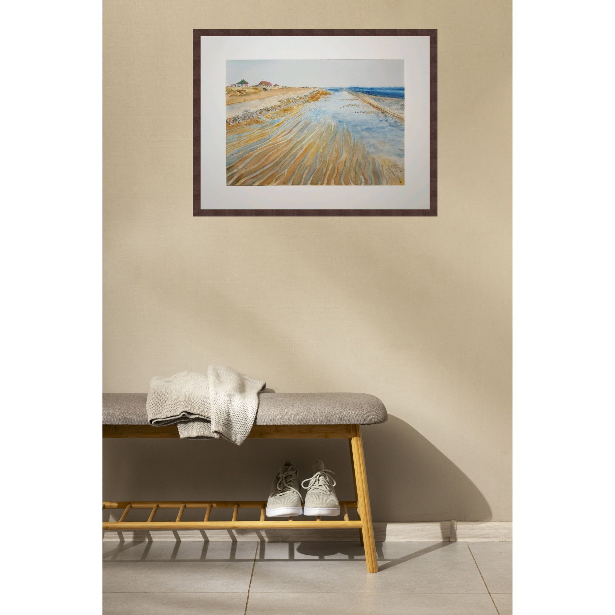 На этой акварельной картине изображен пейзаж прибрежной зоны. На переднем плане видны песчаные волны и отмели, пересеченные водой. На заднем плане расположены несколько небольших домов с разноцветными крышами. Береговая линия галечная, а справа простирается море. Картина выполнена в светлых тонах, и передает спокойствие и умиротворение прибрежного пейзажа.