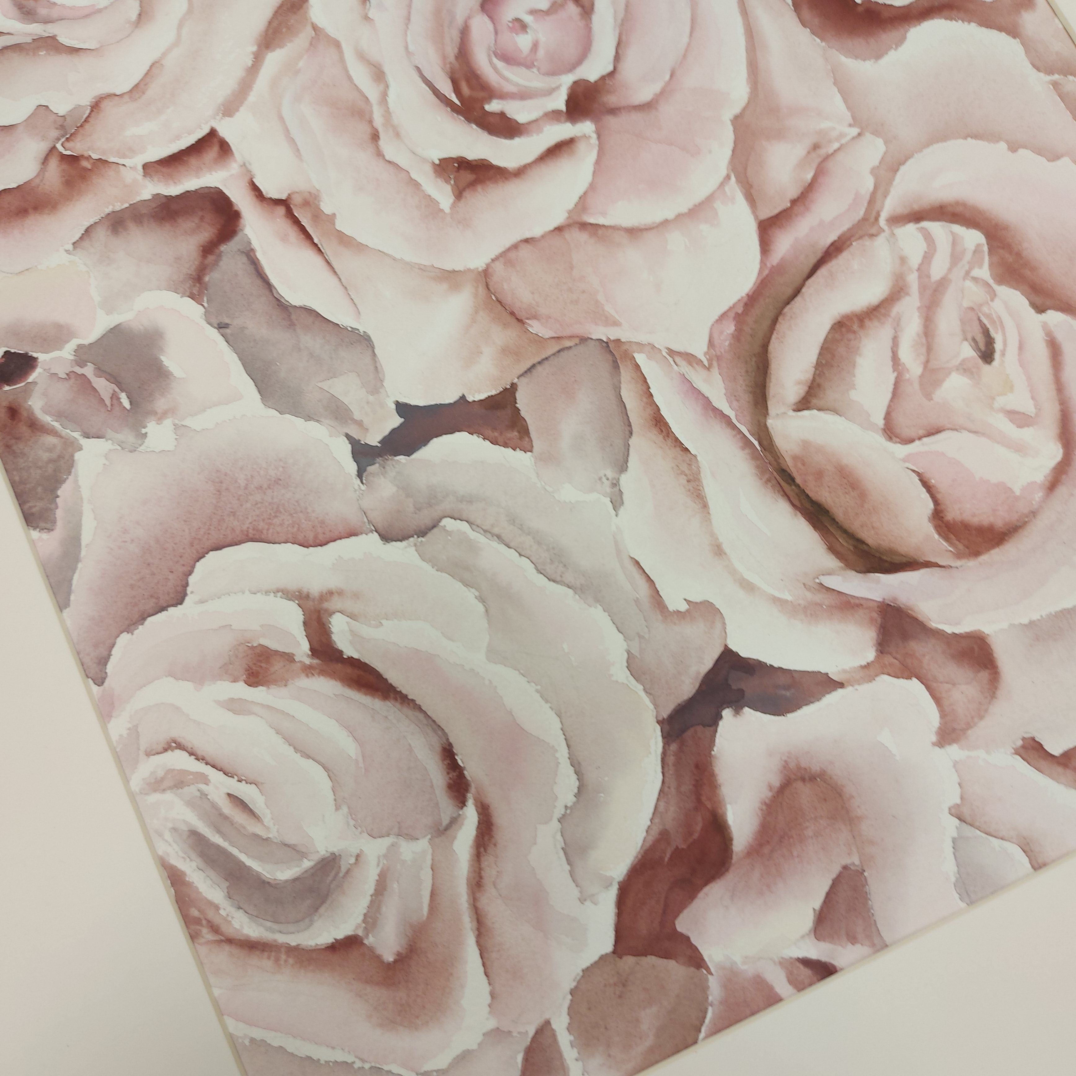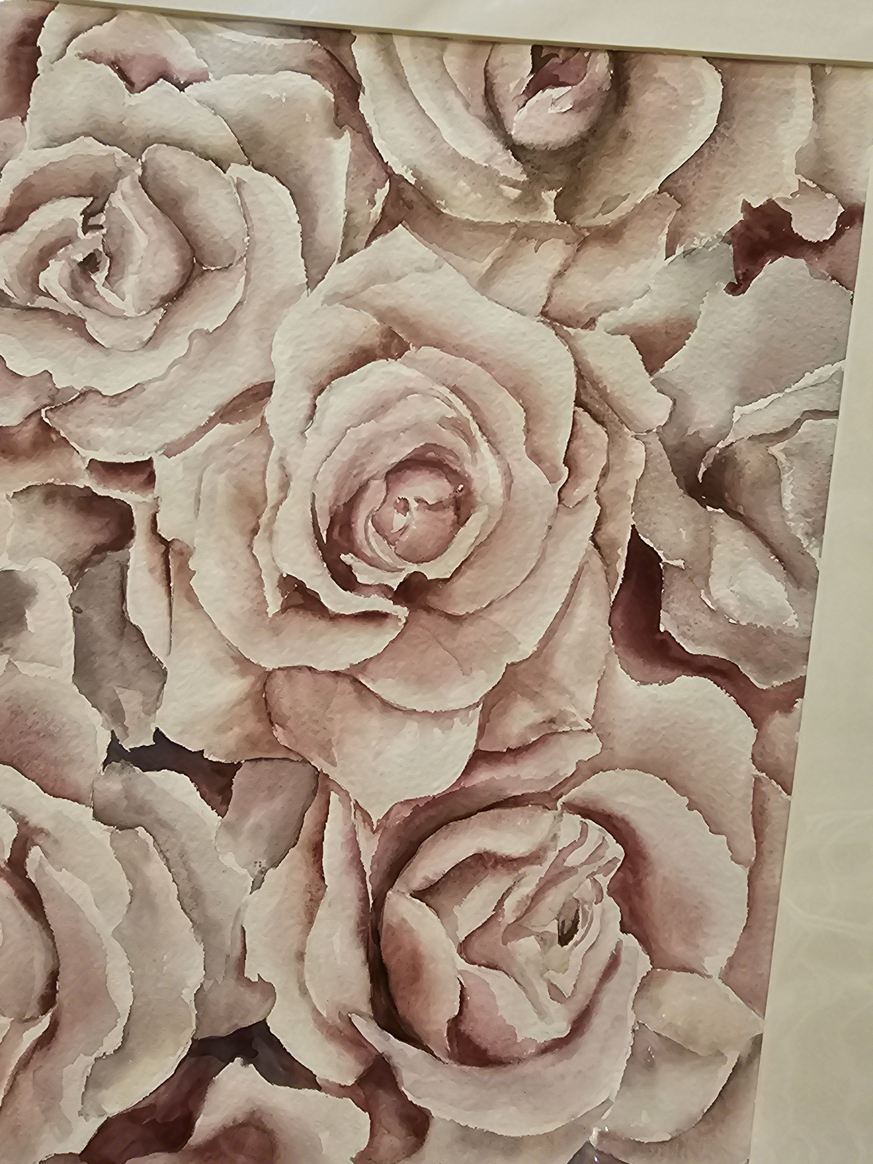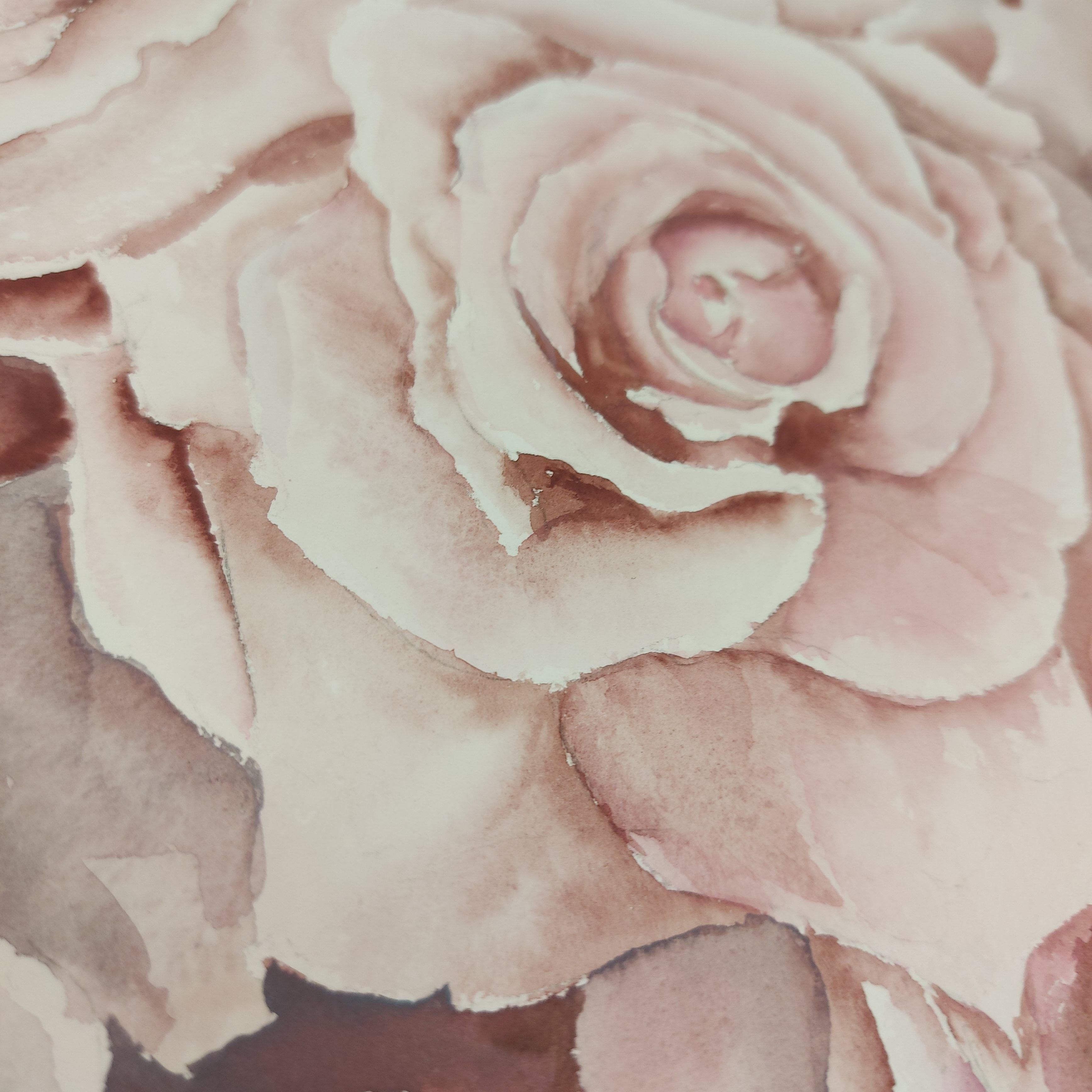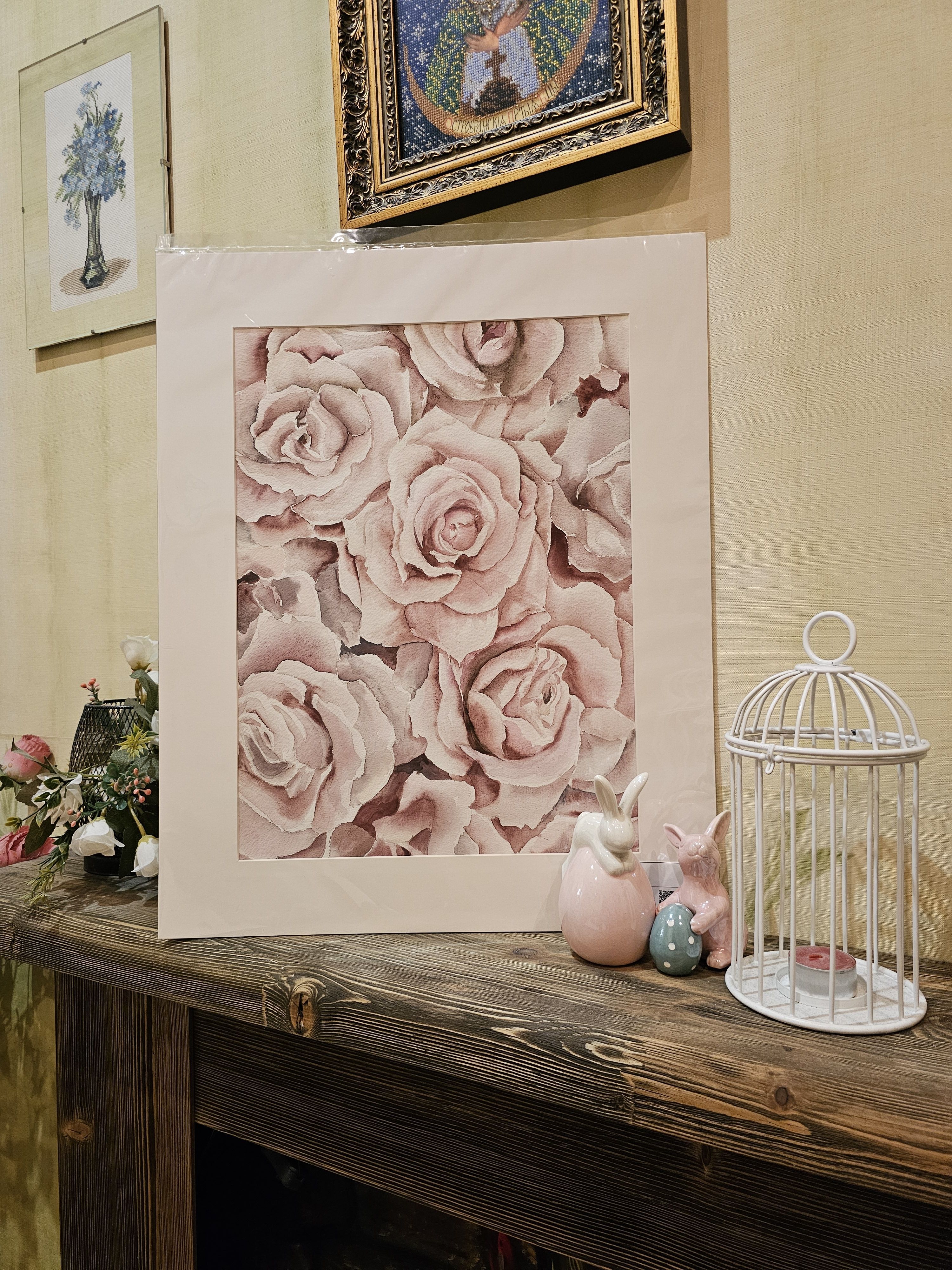 Изящное художественное полотно с изображением роз. Картина включает несколько крупных цветков в нежных розовато-бежевых тонах с различными оттенками и нюансами от светлых до более темных. Лепестки у цветов мягко переходят друг в друга, создавая естественные завитки и складки, типичные для розы.
