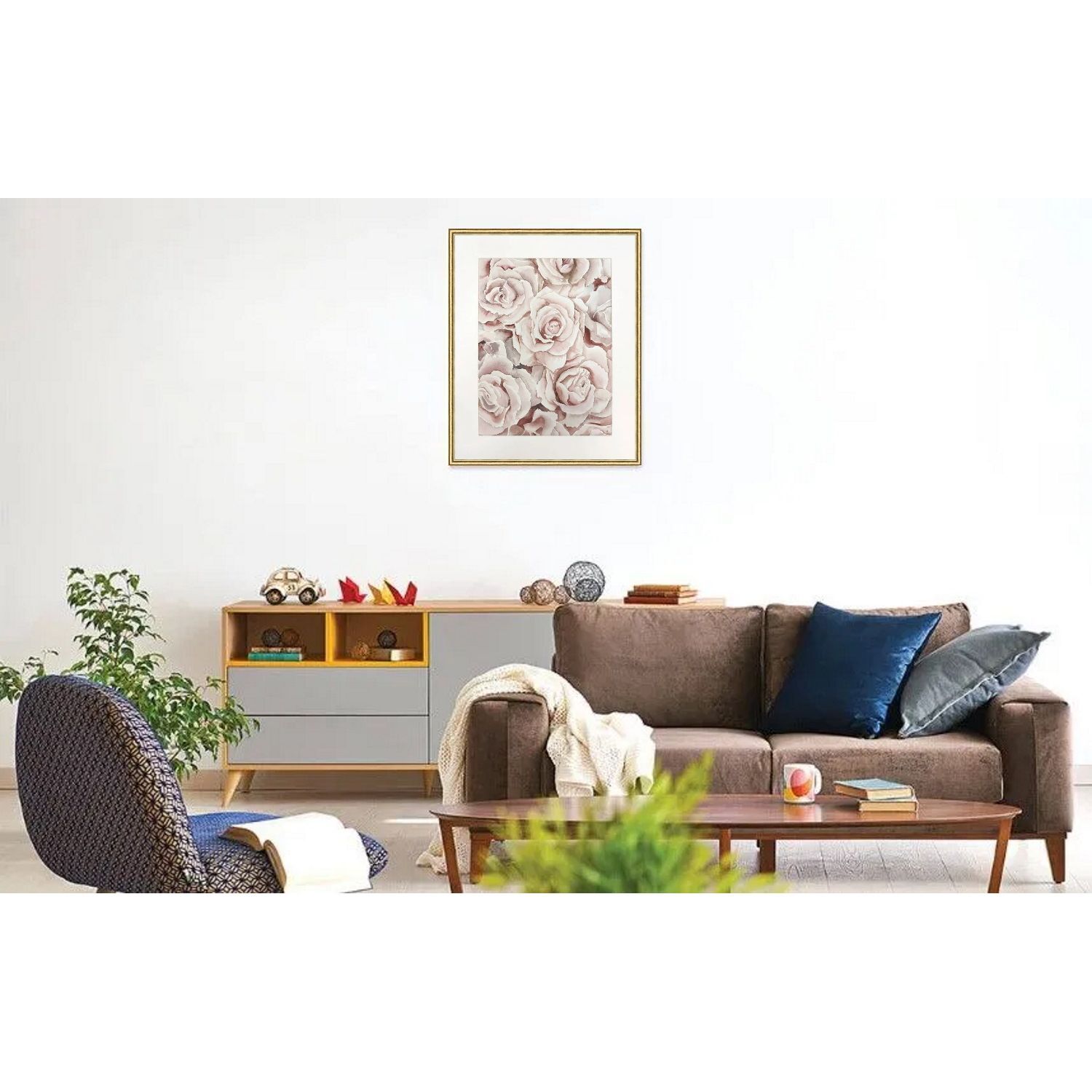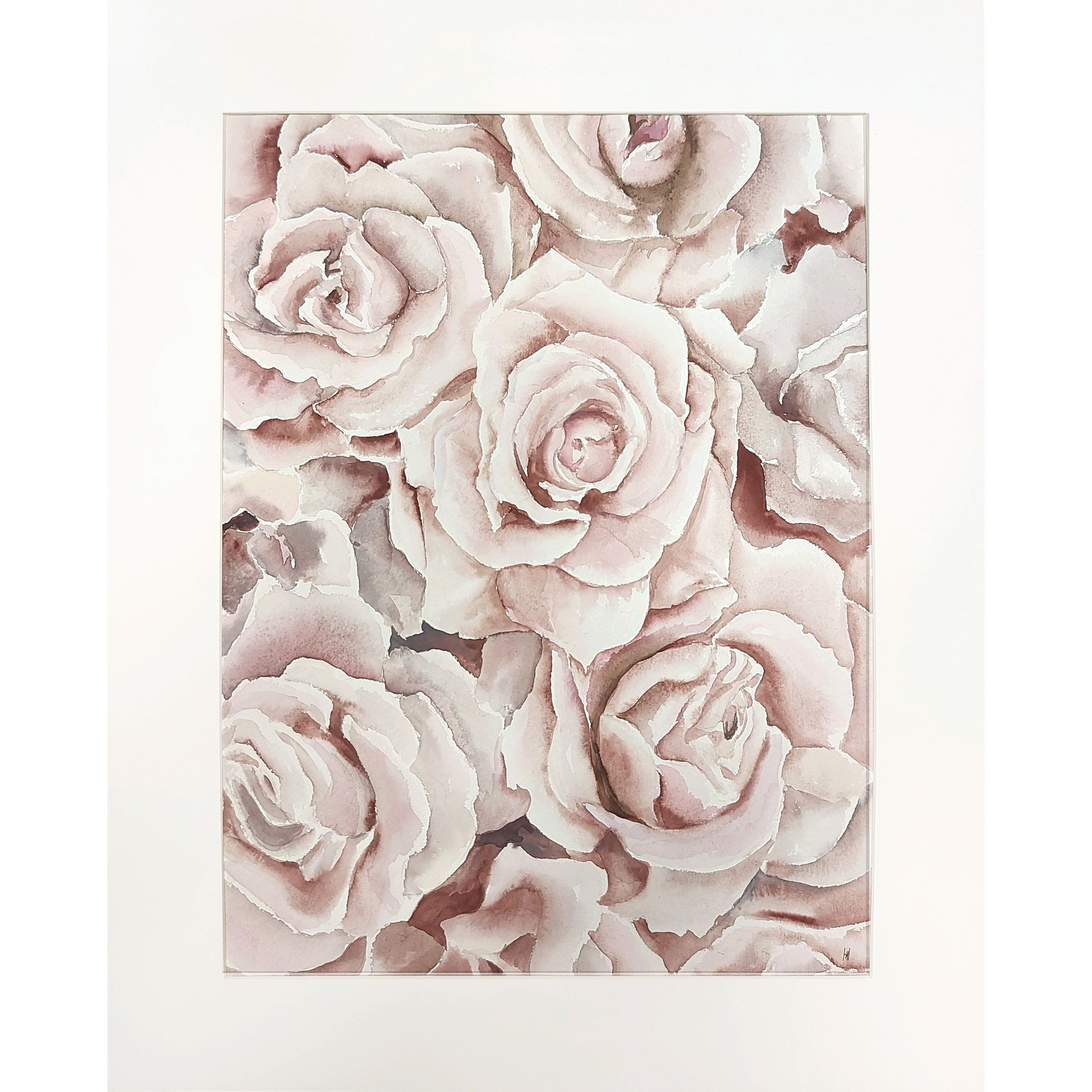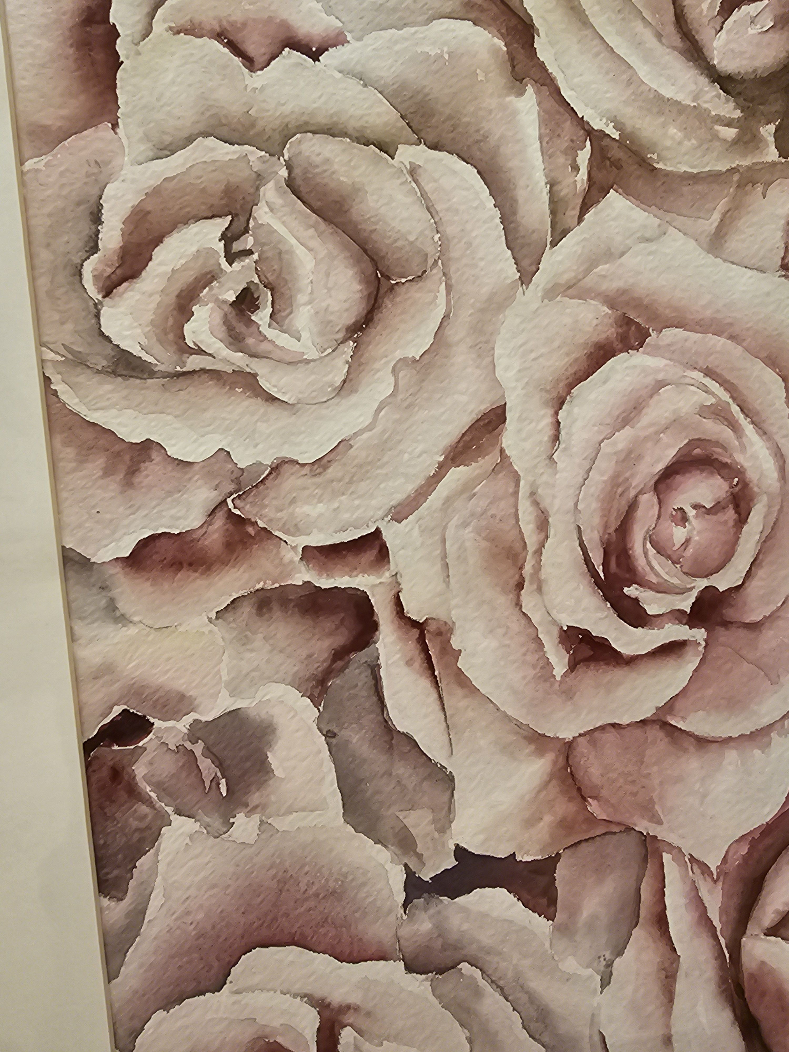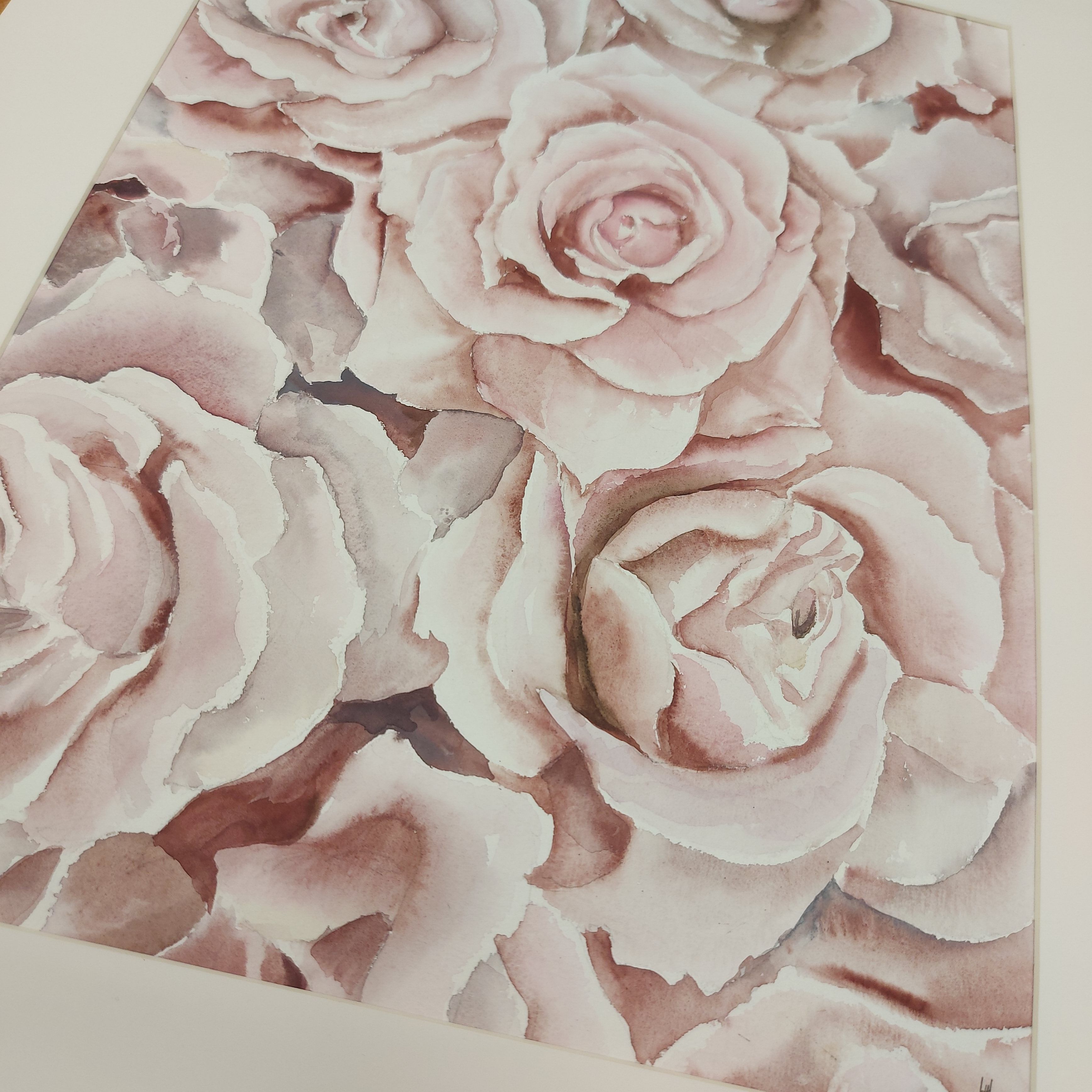 Изящное художественное полотно с изображением роз. Картина включает несколько крупных цветков в нежных розовато-бежевых тонах с различными оттенками и нюансами от светлых до более темных. Лепестки у цветов мягко переходят друг в друга, создавая естественные завитки и складки, типичные для розы.